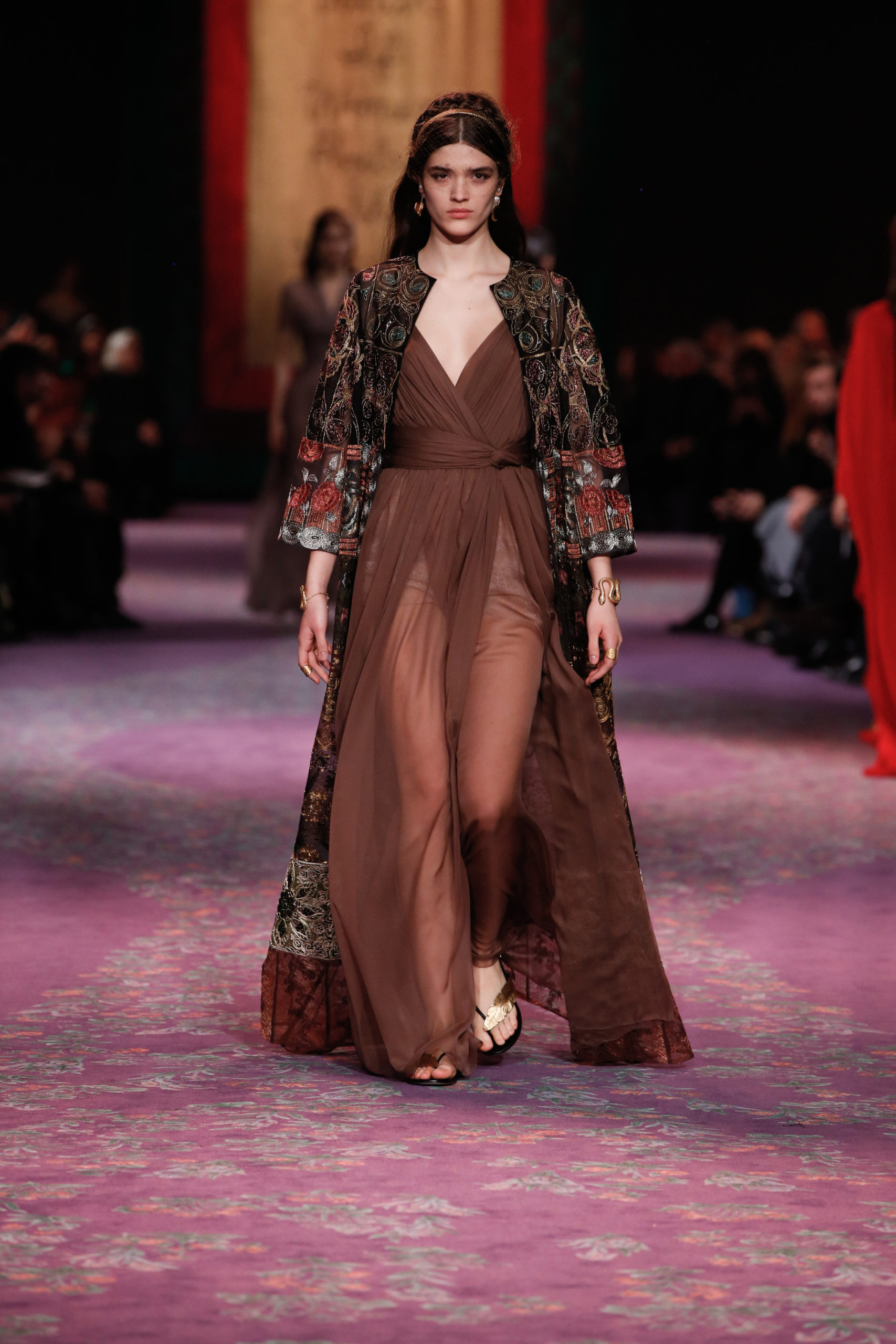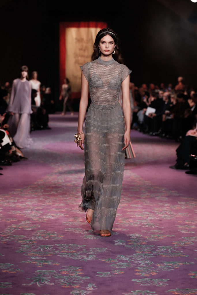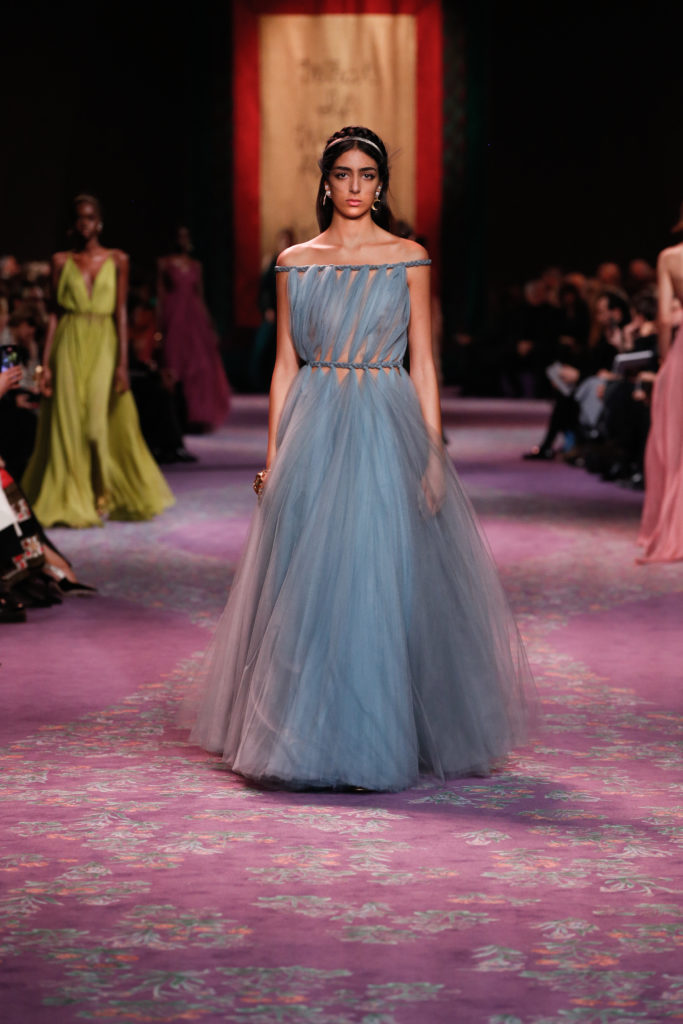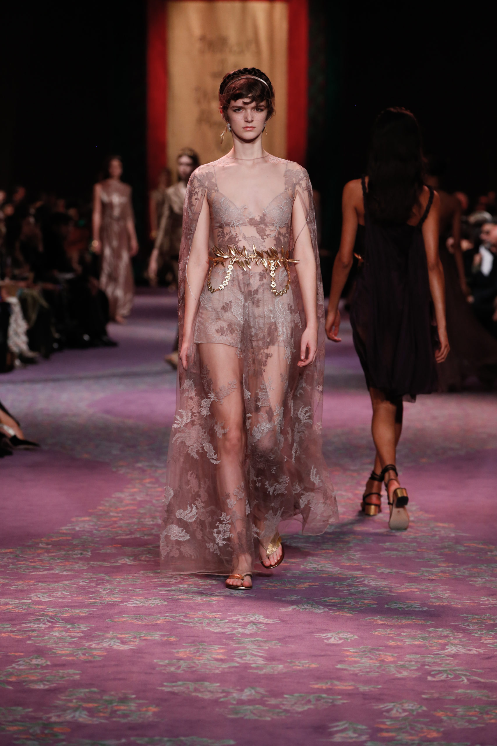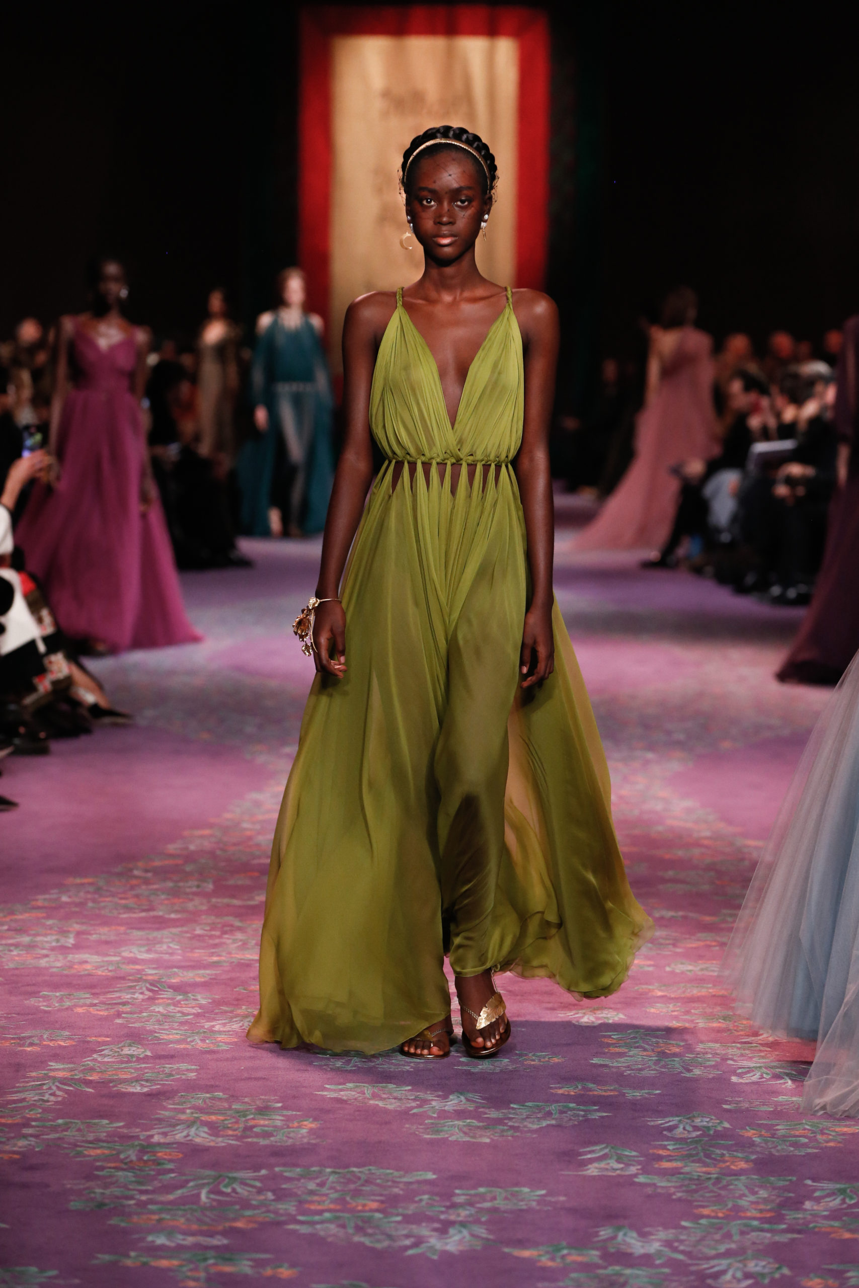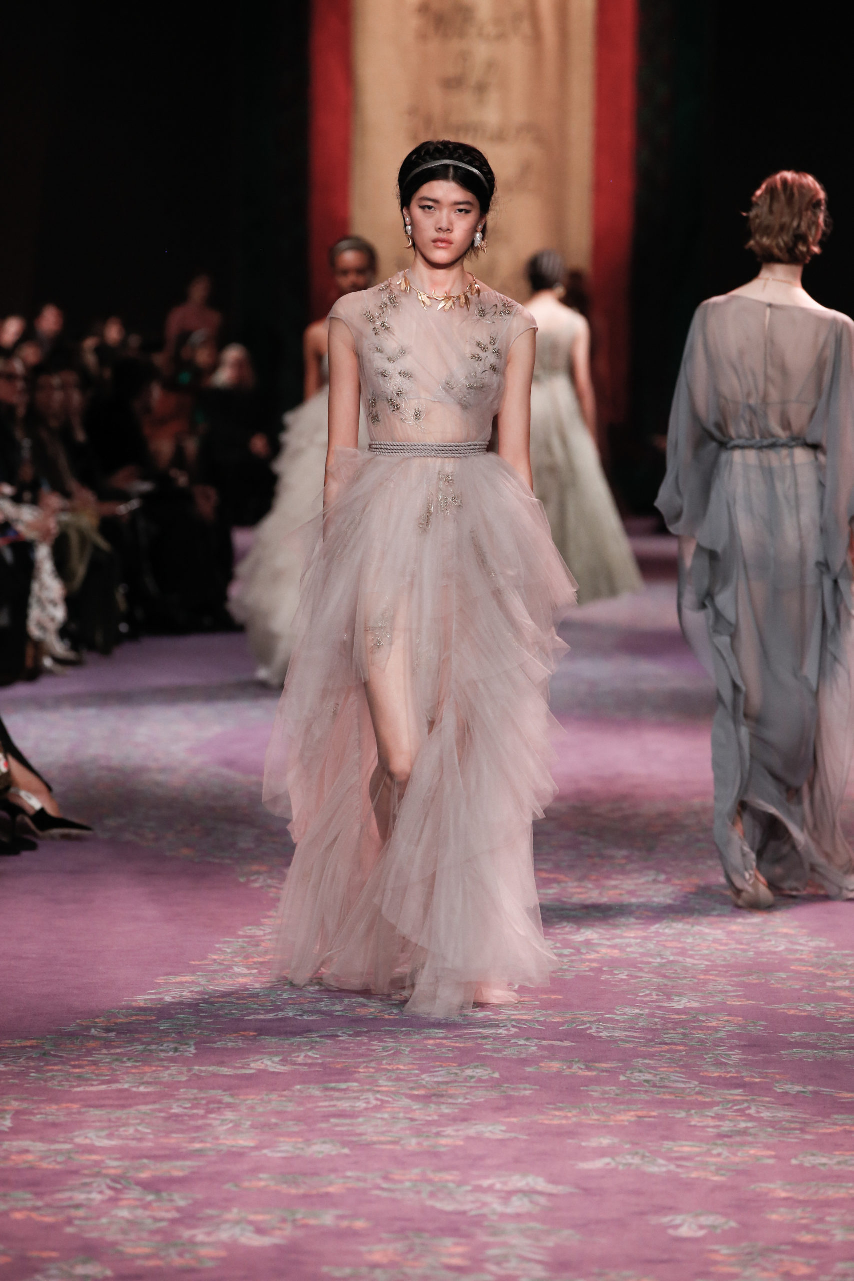 A l’occasion de la collection haute couture printemps-été 2020, Maria Grazia Chiuri poursuit sa réflexion engagée sur la complexité des rapports entre féminisme et féminité. Écrin du défilé, l’œuvre monumentale The Female Divine, spécialement conçue par l’artiste américaine Judy Chicago et figurant le corps d’une déesse, illumine les silhouettes à la beauté triomphante. Reflet de cette puissance créative, le péplum, au caractère essentiel et atemporel, est sublimé par le savoir-faire virtuose de Dior. Une palette de couleurs douces et des tissus plus masculins, magnifiés par l’or, ponctuent ces modèles d’exception empreints de spiritualité.