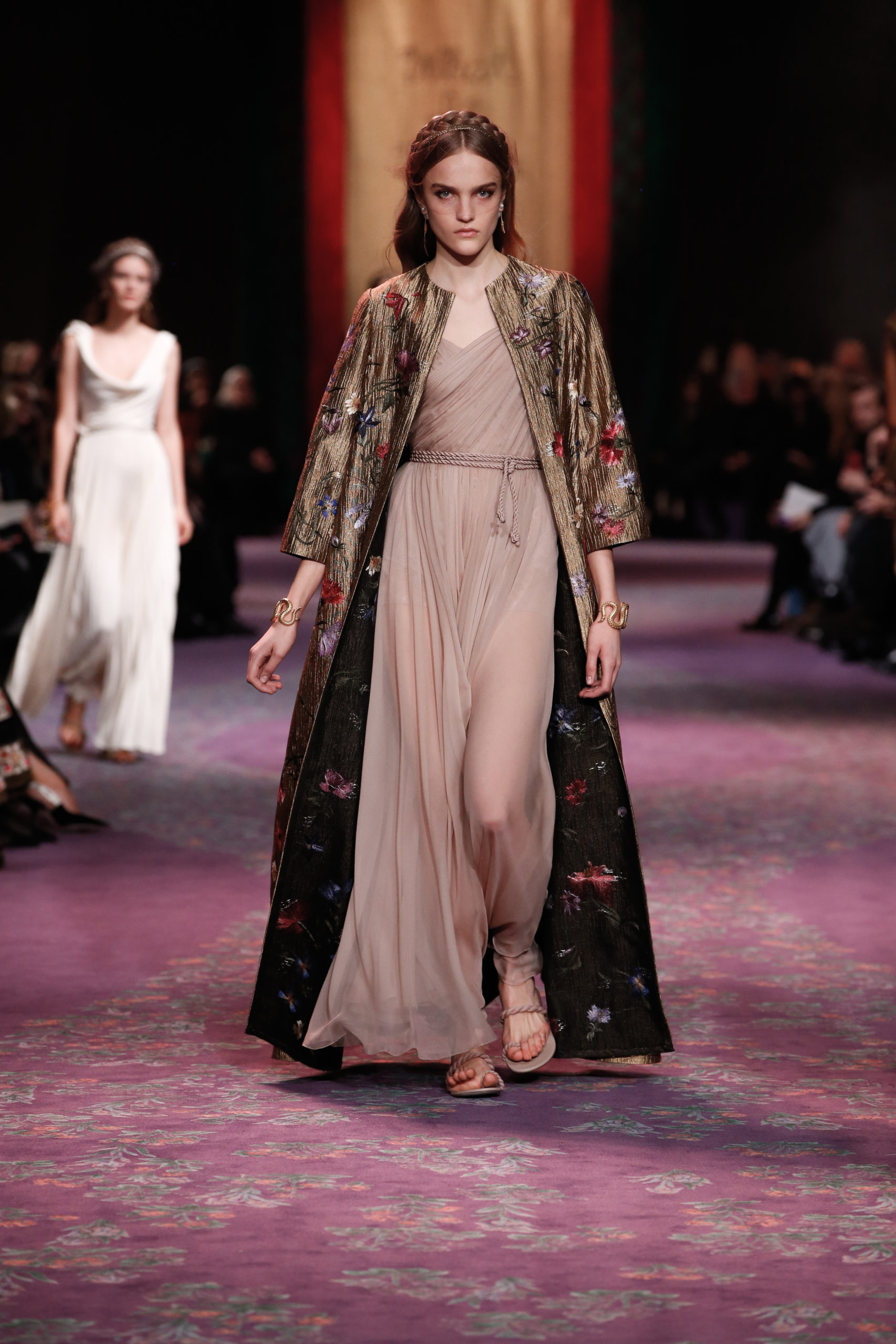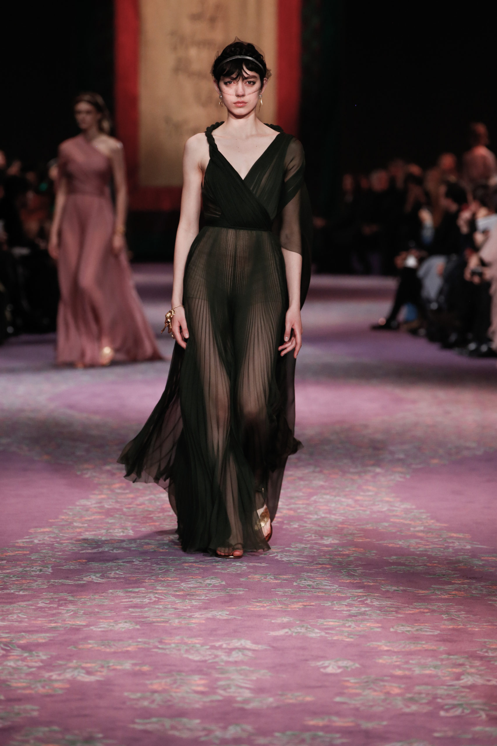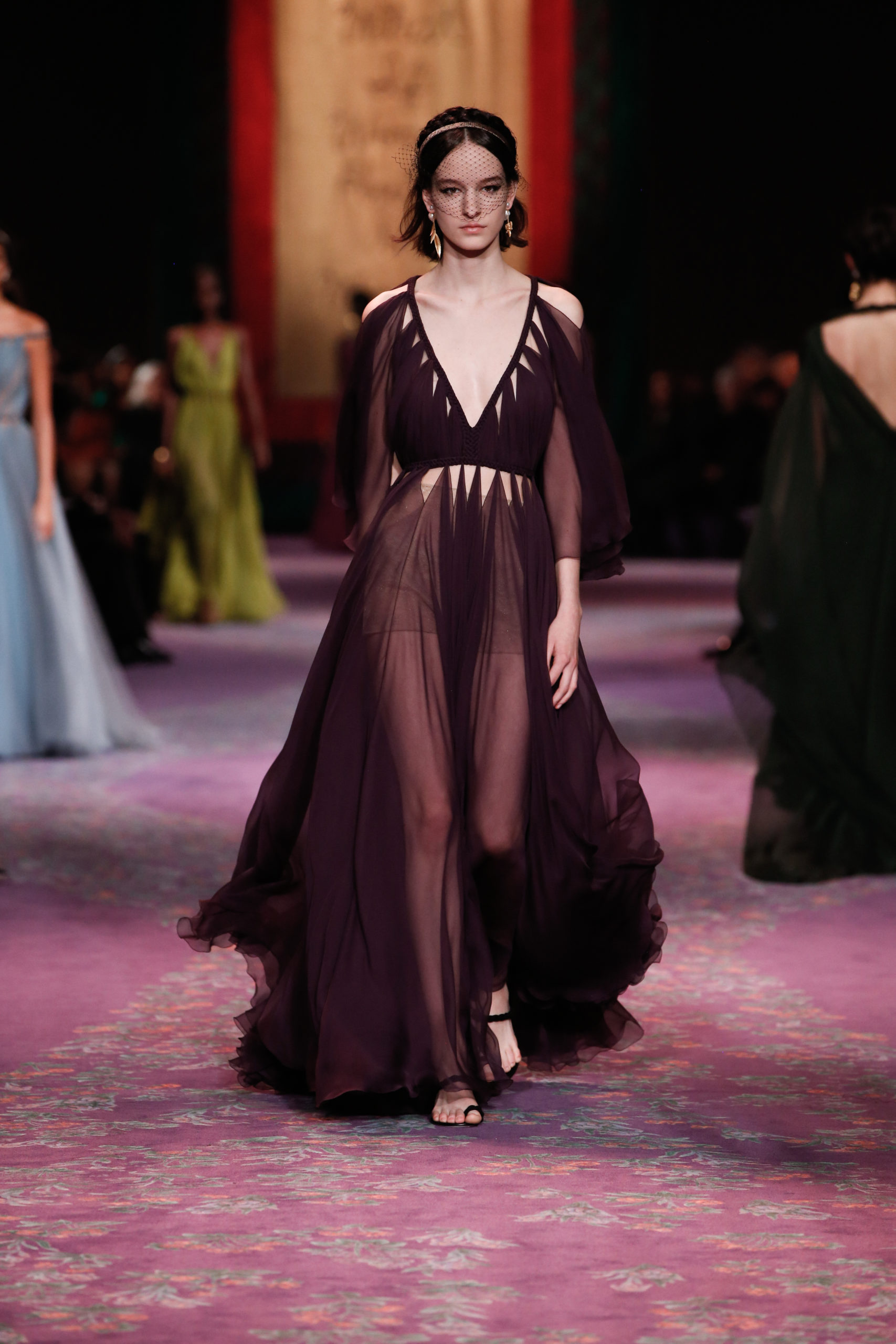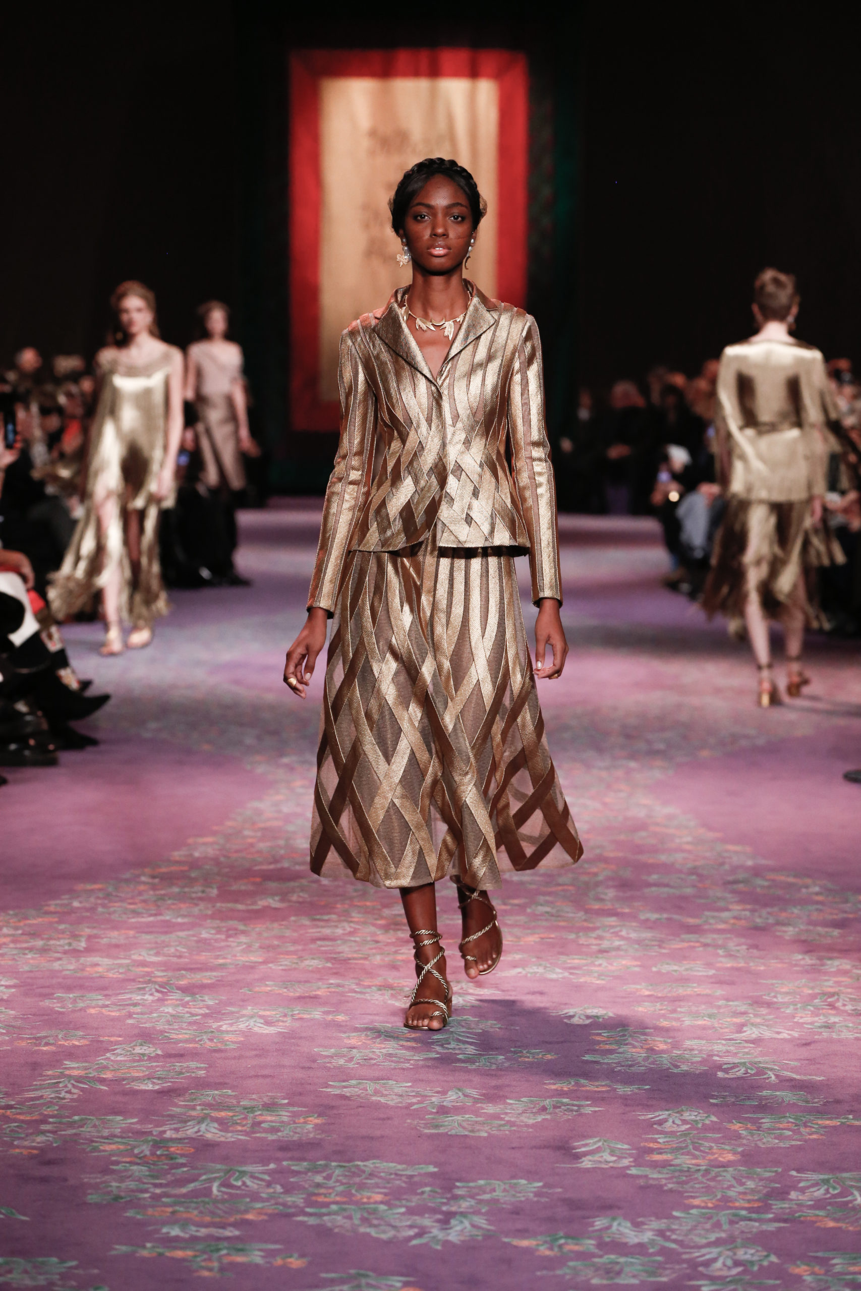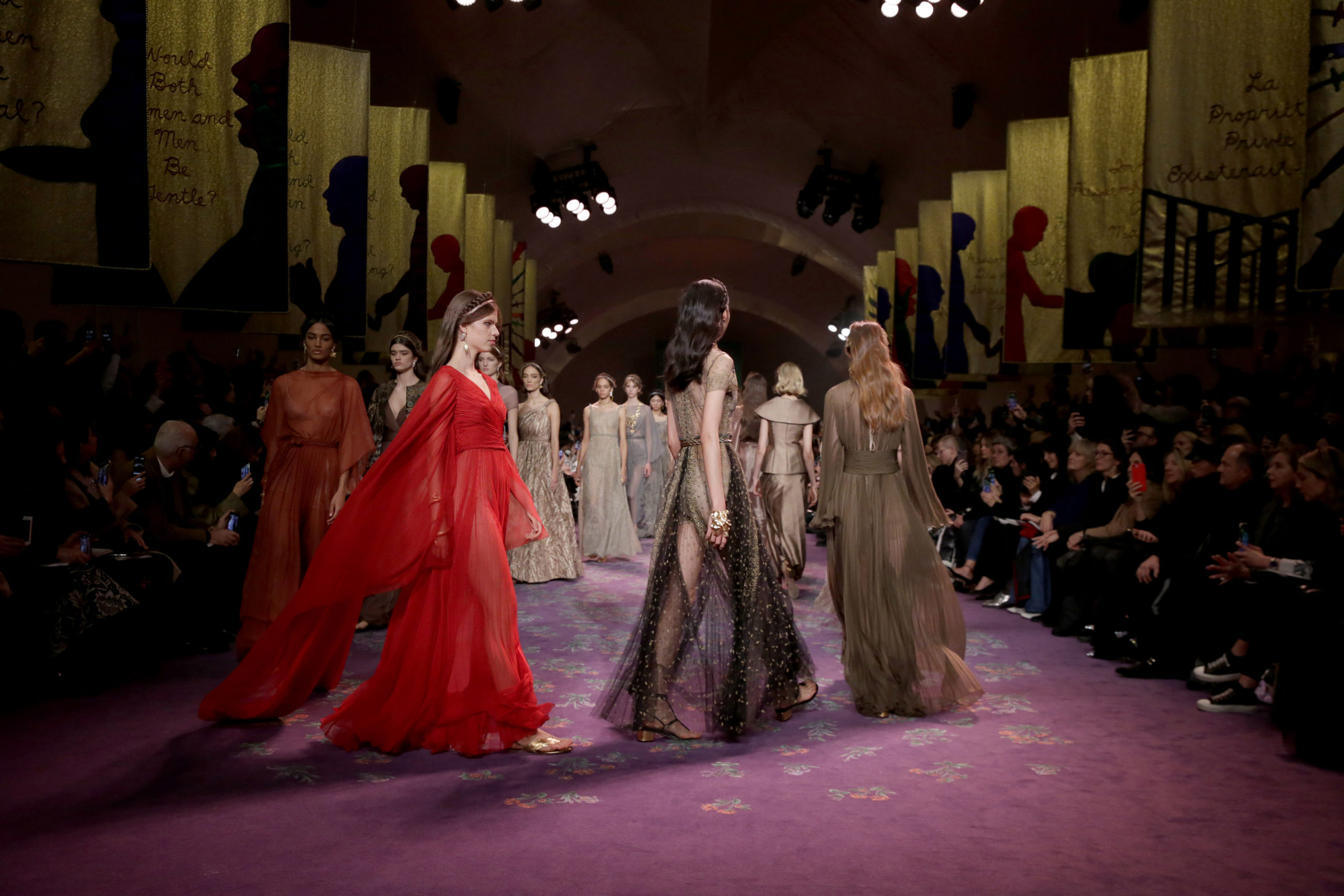 A l’occasion de la collection haute couture printemps-été 2020, Maria Grazia Chiuri poursuit sa réflexion engagée sur la complexité des rapports entre féminisme et féminité. Écrin du défilé, l’œuvre monumentale The Female Divine, spécialement conçue par l’artiste américaine Judy Chicago et figurant le corps d’une déesse, illumine les silhouettes à la beauté triomphante. Reflet de cette puissance créative, le péplum, au caractère essentiel et atemporel, est sublimé par le savoir-faire virtuose de Dior. Une palette de couleurs douces et des tissus plus masculins, magnifiés par l’or, ponctuent ces modèles d’exception empreints de spiritualité.