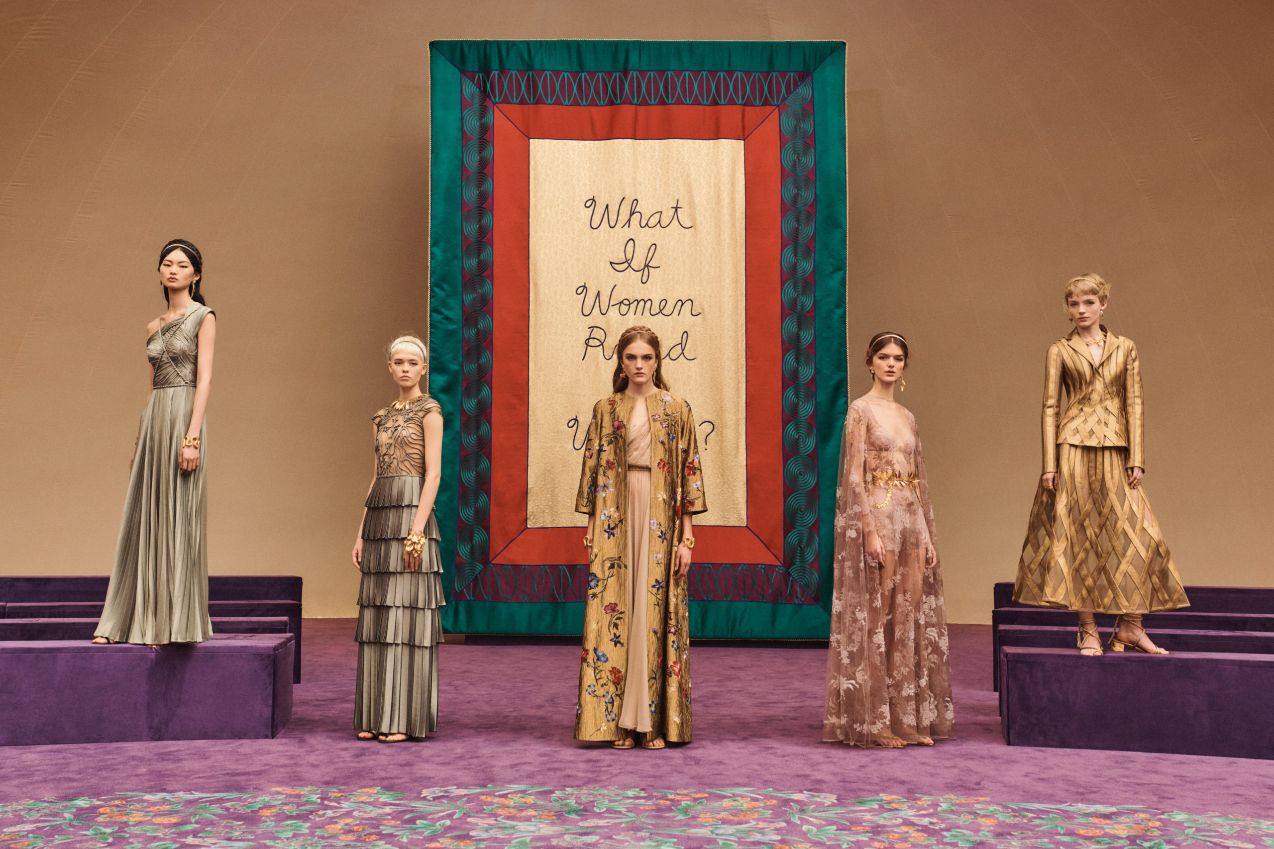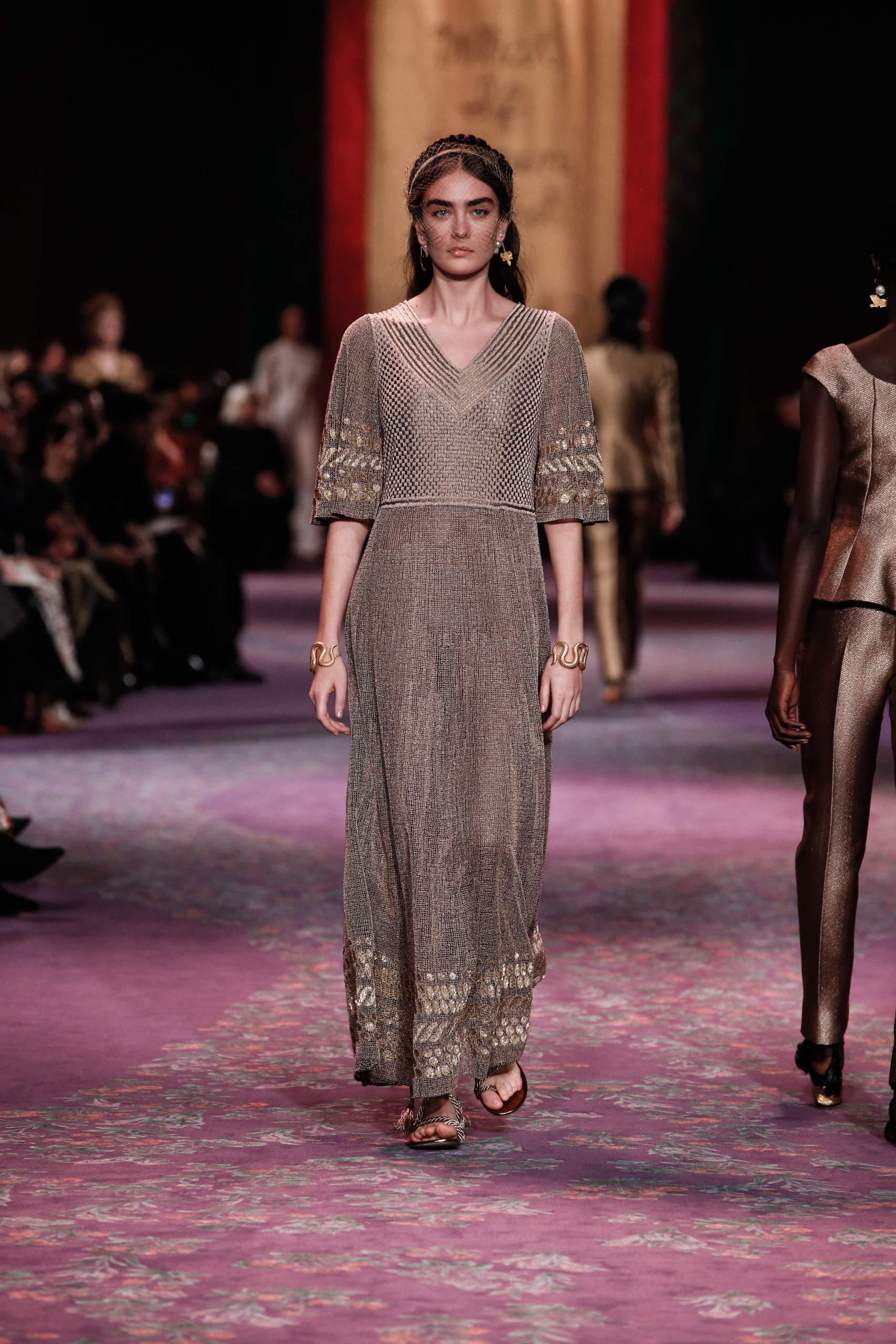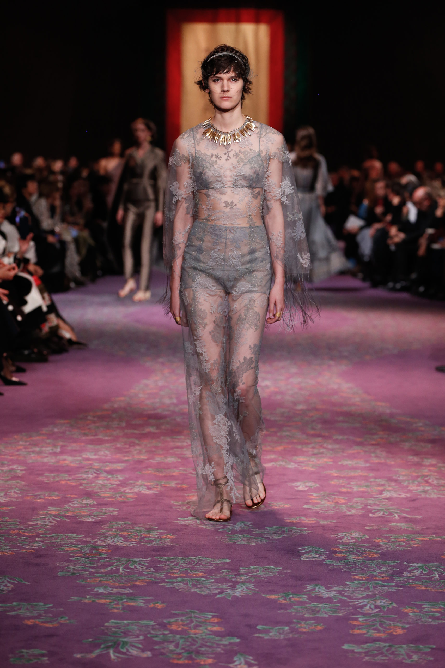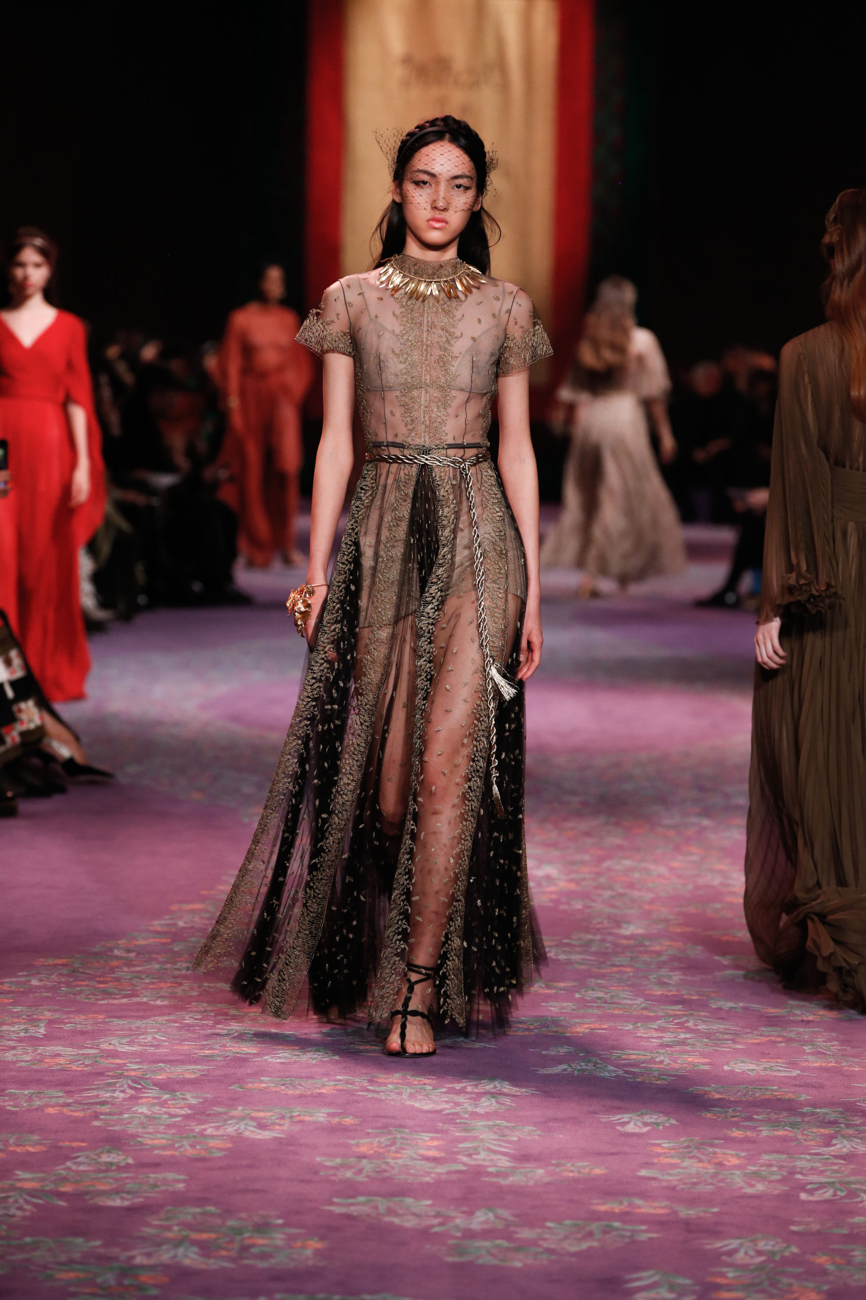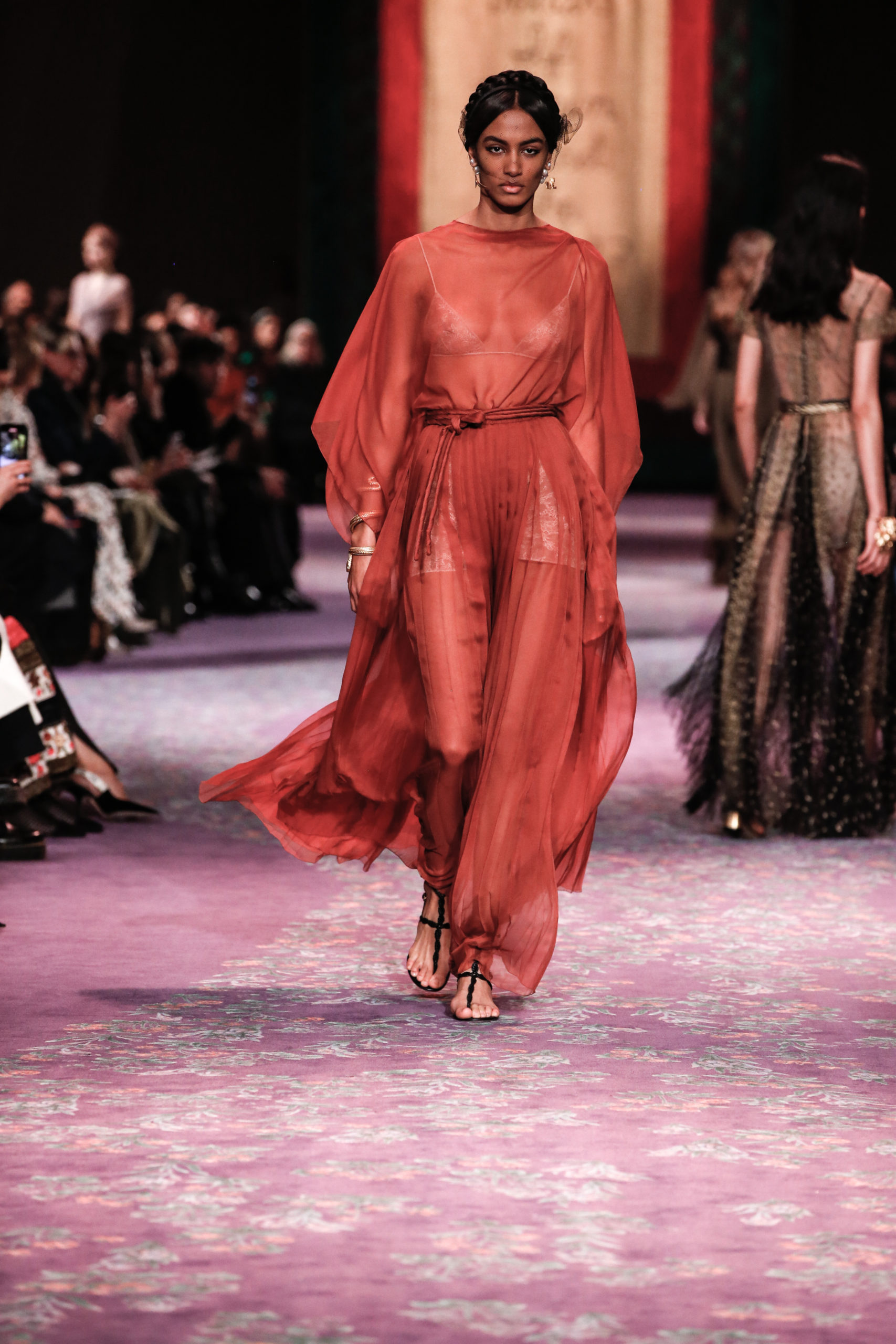 A l’occasion de la collection haute couture printemps-été 2020, Maria Grazia Chiuri poursuit sa réflexion engagée sur la complexité des rapports entre féminisme et féminité. Écrin du défilé, l’œuvre monumentale The Female Divine, spécialement conçue par l’artiste américaine Judy Chicago et figurant le corps d’une déesse, illumine les silhouettes à la beauté triomphante. Reflet de cette puissance créative, le péplum, au caractère essentiel et atemporel, est sublimé par le savoir-faire virtuose de Dior. Une palette de couleurs douces et des tissus plus masculins, magnifiés par l’or, ponctuent ces modèles d’exception empreints de spiritualité.