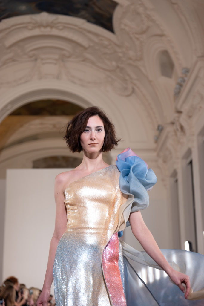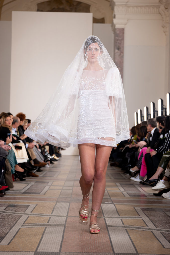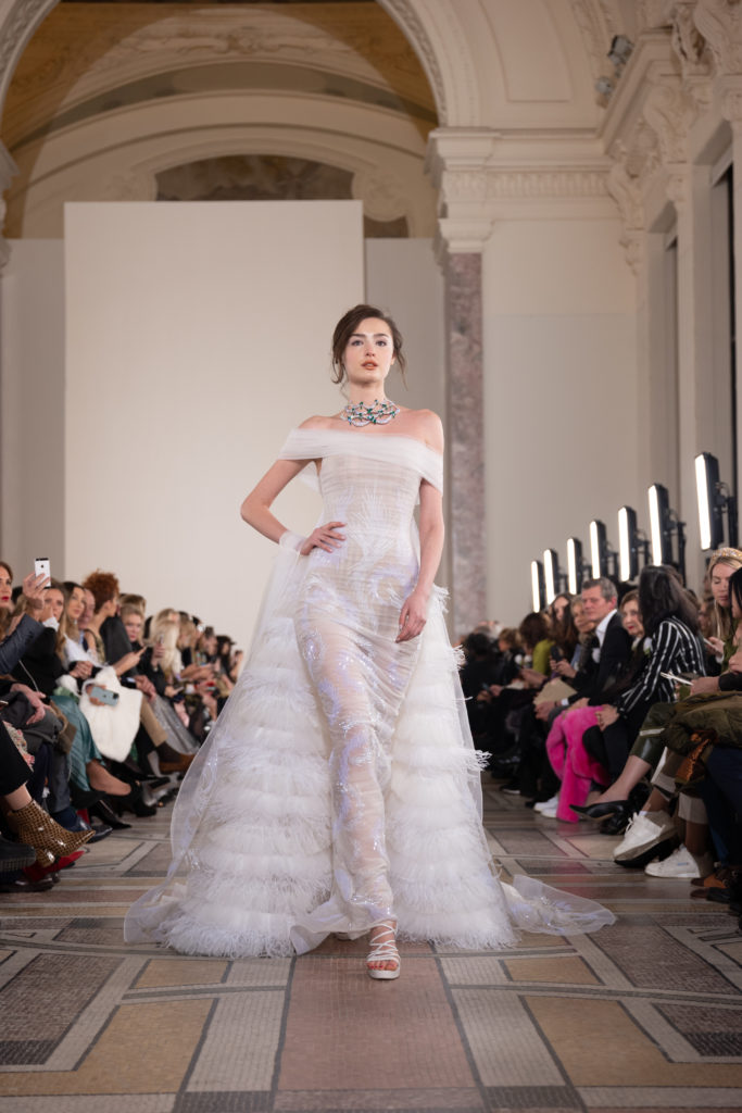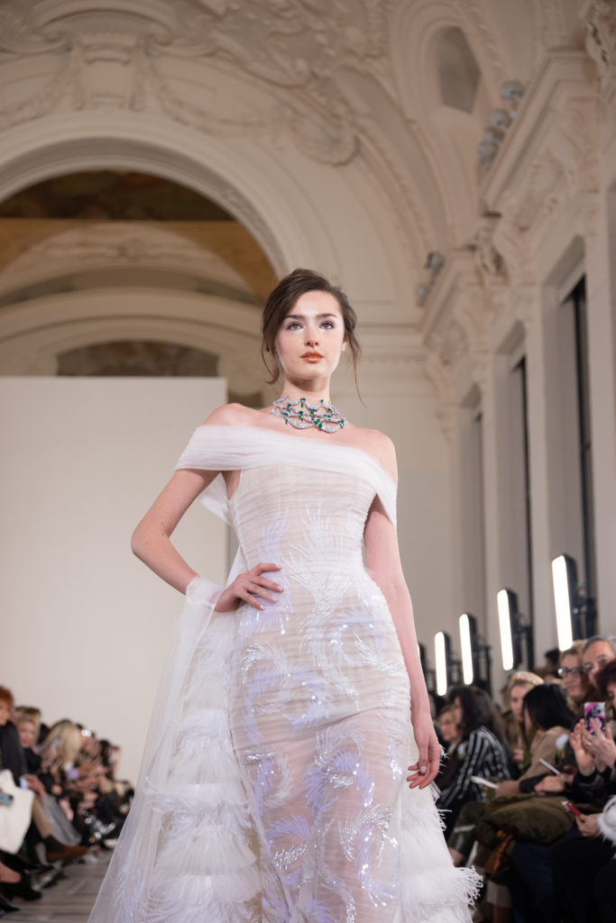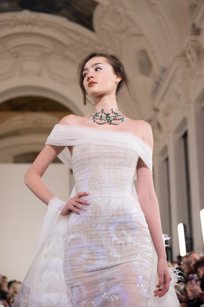 Celui-ci touche autant sa propre famille que toutes celles des membres de sa Maison et de ses ateliers, qui pour la première fois seront présents sur le podium à la fin du défilé. La rose blanche remise à chaque invité incarne ce soutien à un changement pacifique au Pays du Cèdre. Le motif floral cher à Georges Chakra est une trame qui parcourt également l’ensemble de la collection. Aux nombreuses silhouettes immaculées comme autant de pages vierges sur lesquelles écrire une nouvelle histoire répondent une petite robe entièrement réalisée en pétales ivoire, une tenue en tulle entièrement rebrodée de roses, une fleur généreuse posée sur une mini robe en satin duchesse rose fluorescent, comme ces roses peintes une à une à la main sur le gazar d’une longue robe fendue. Les voiles et les transparences nimbent la collection d’un raffinement vaporeux, contrastant avec un travail sophistiqué de volumes. D’un côté, la géométrie épurée d’une robe-boule, les broderies origami et des plissés mouchoirs quasi algorithmiques. De l’autre, les bustiers qui embrassent le corps, les dos qui se dévoilent, la fluidité des capes et des traînes, les volutes des étoffes éclaboussées de plumes, rebrodées à la main de paillettes et de sequins, la sensualité du crêpe et de l’organza plissé. Ce jeu de contraires dégage une énergie particulière, dopée par un jeu de tailles tour à tour ultra longues et extra courtes, convoquant un imaginaire de tapis rouge autant que les podiums disco des années 1970. Blanc, mais aussi rose éclatant ou poudré, aigue-marine, menthe à l’eau, bleu lagon, ciel ou glacier, iridescentes nacrées sur fond d’imprimé végétal… La palette de couleurs évoque une nature fantastique, entre forêt luxuriante et fantasme d’une île tropicale où le temps serait toujours au grand beau et où l’on récolterait des perles aux teintes indéfinissables. Les éclats d’or et d’argent viennent exalter la moire d’un tissu ou réveiller le mat précieux d’une étoffe. Mais cet Éden couture est pugnace, comme le rappellent les flammes dévorant une robe longue à encolure bateau et les souliers plus plats qu’à l’accoutumée, dont ces spartiates à la féminité combattive. Georges Chakra a souhaité aussi s’engager de manière concrète auprès des organisations qui lui tiennent à cœur. Scintillant au cou de la mariée, l’imposant collier en émeraudes et diamants spécialement réalisé par le joaillier Fawaz Gruosi sera mis en vente et une partie de cette vente sera reversée au profit du Children Cancer Hospital de Beyrouth et des bourses d’études de l’école Saint Vincent de Paul.
