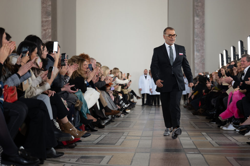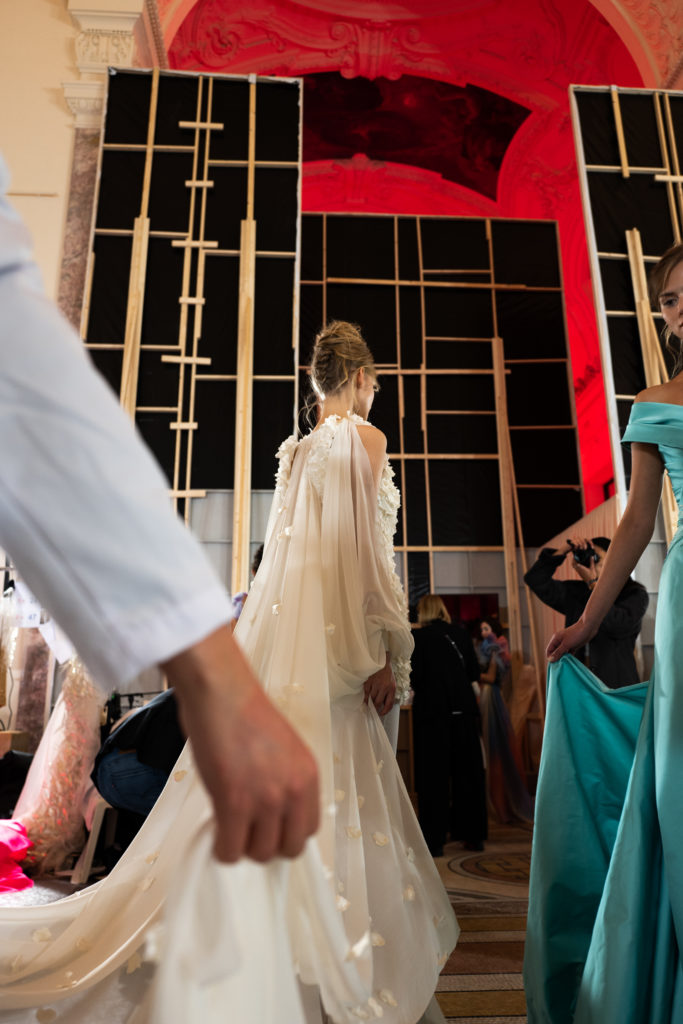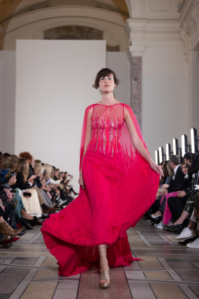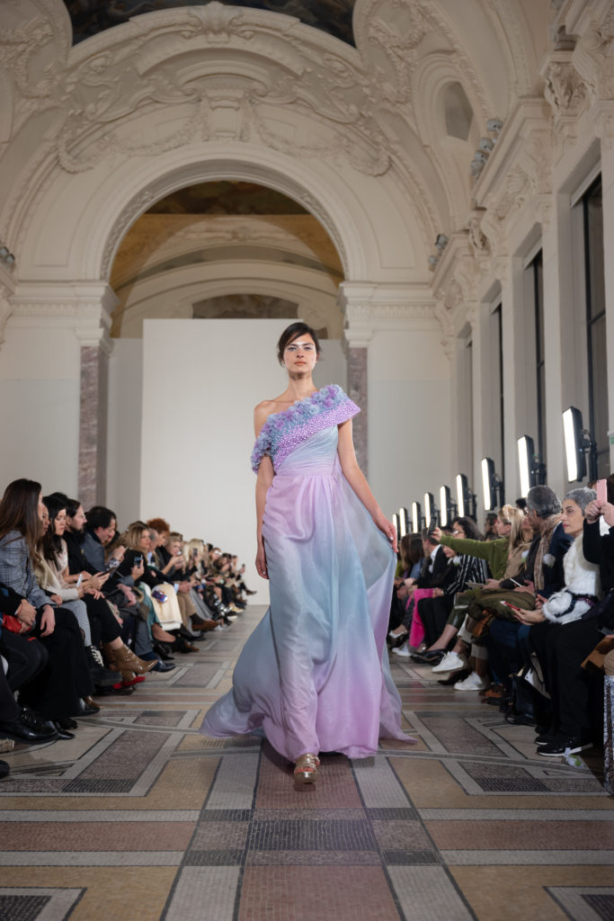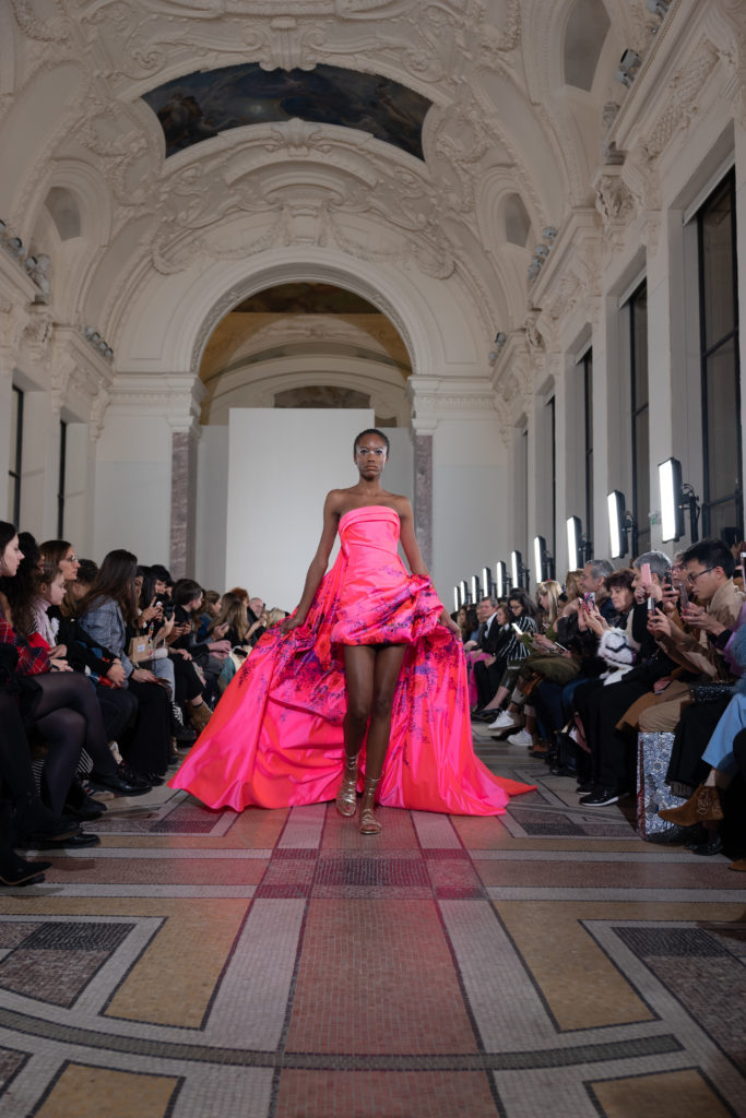 Celui-ci touche autant sa propre famille que toutes celles des membres de sa Maison et de ses ateliers, qui pour la première fois seront présents sur le podium à la fin du défilé. La rose blanche remise à chaque invité incarne ce soutien à un changement pacifique au Pays du Cèdre. Le motif floral cher à Georges Chakra est une trame qui parcourt également l’ensemble de la collection. Aux nombreuses silhouettes immaculées comme autant de pages vierges sur lesquelles écrire une nouvelle histoire répondent une petite robe entièrement réalisée en pétales ivoire, une tenue en tulle entièrement rebrodée de roses, une fleur généreuse posée sur une mini robe en satin duchesse rose fluorescent, comme ces roses peintes une à une à la main sur le gazar d’une longue robe fendue. Les voiles et les transparences nimbent la collection d’un raffinement vaporeux, contrastant avec un travail sophistiqué de volumes. D’un côté, la géométrie épurée d’une robe-boule, les broderies origami et des plissés mouchoirs quasi algorithmiques. De l’autre, les bustiers qui embrassent le corps, les dos qui se dévoilent, la fluidité des capes et des traînes, les volutes des étoffes éclaboussées de plumes, rebrodées à la main de paillettes et de sequins, la sensualité du crêpe et de l’organza plissé. Ce jeu de contraires dégage une énergie particulière, dopée par un jeu de tailles tour à tour ultra longues et extra courtes, convoquant un imaginaire de tapis rouge autant que les podiums disco des années 1970. Blanc, mais aussi rose éclatant ou poudré, aigue-marine, menthe à l’eau, bleu lagon, ciel ou glacier, iridescentes nacrées sur fond d’imprimé végétal… La palette de couleurs évoque une nature fantastique, entre forêt luxuriante et fantasme d’une île tropicale où le temps serait toujours au grand beau et où l’on récolterait des perles aux teintes indéfinissables. Les éclats d’or et d’argent viennent exalter la moire d’un tissu ou réveiller le mat précieux d’une étoffe. Mais cet Éden couture est pugnace, comme le rappellent les flammes dévorant une robe longue à encolure bateau et les souliers plus plats qu’à l’accoutumée, dont ces spartiates à la féminité combattive. Georges Chakra a souhaité aussi s’engager de manière concrète auprès des organisations qui lui tiennent à cœur. Scintillant au cou de la mariée, l’imposant collier en émeraudes et diamants spécialement réalisé par le joaillier Fawaz Gruosi sera mis en vente et une partie de cette vente sera reversée au profit du Children Cancer Hospital de Beyrouth et des bourses d’études de l’école Saint Vincent de Paul.