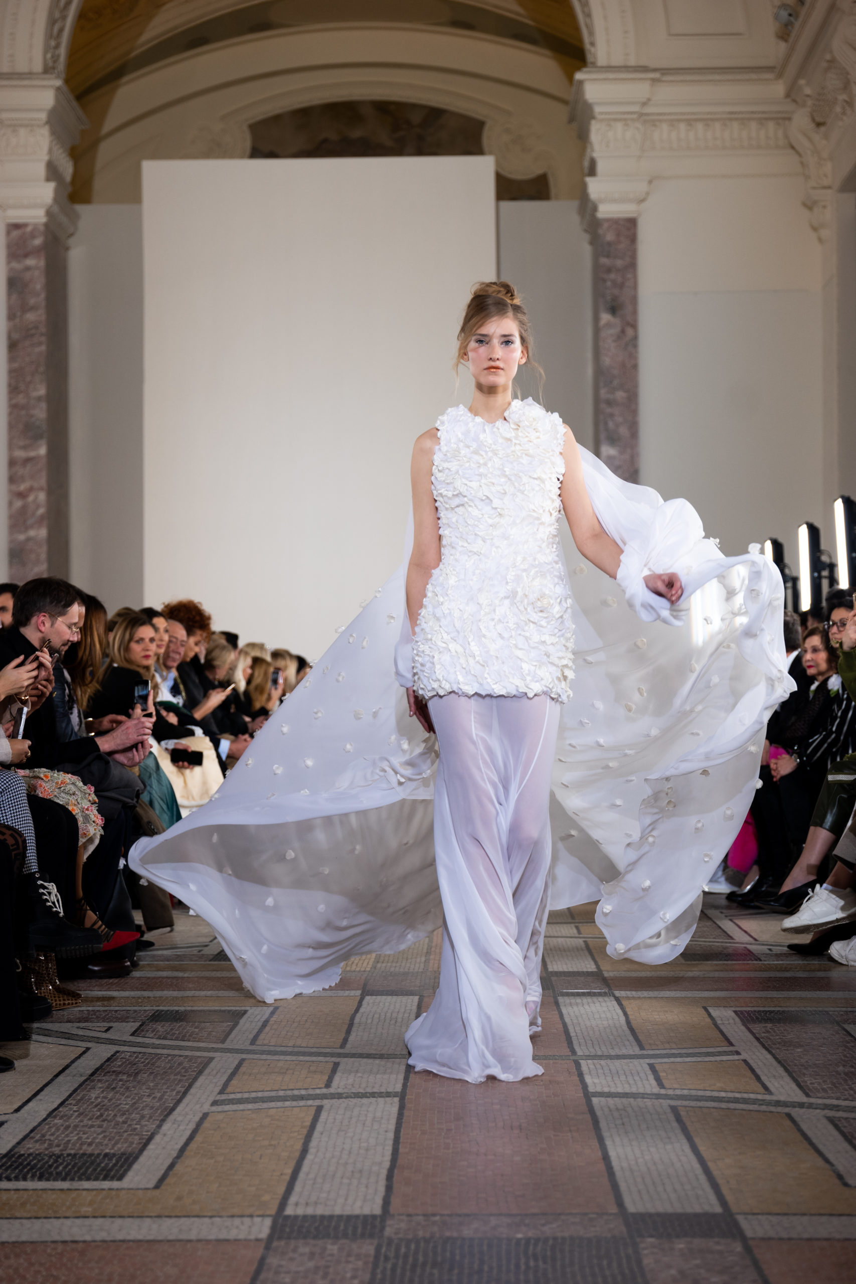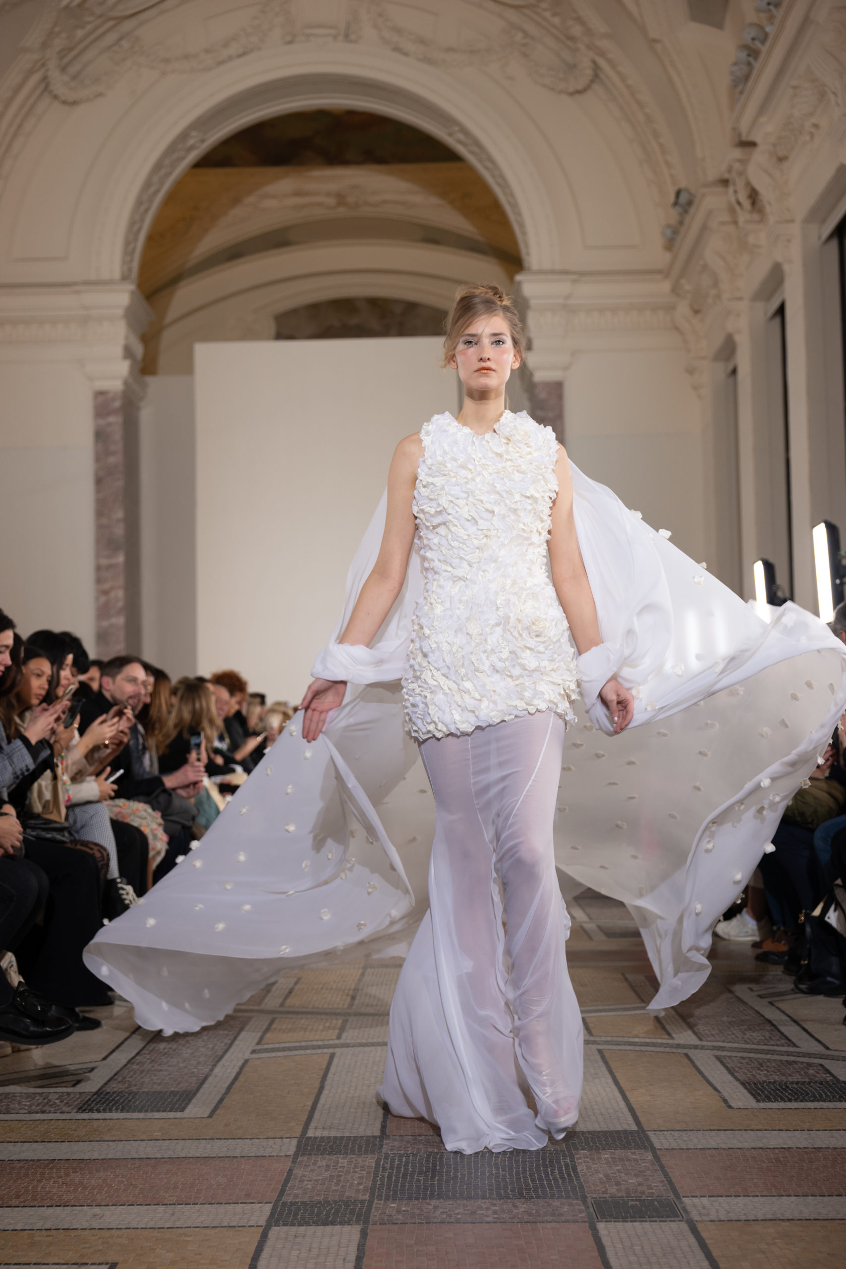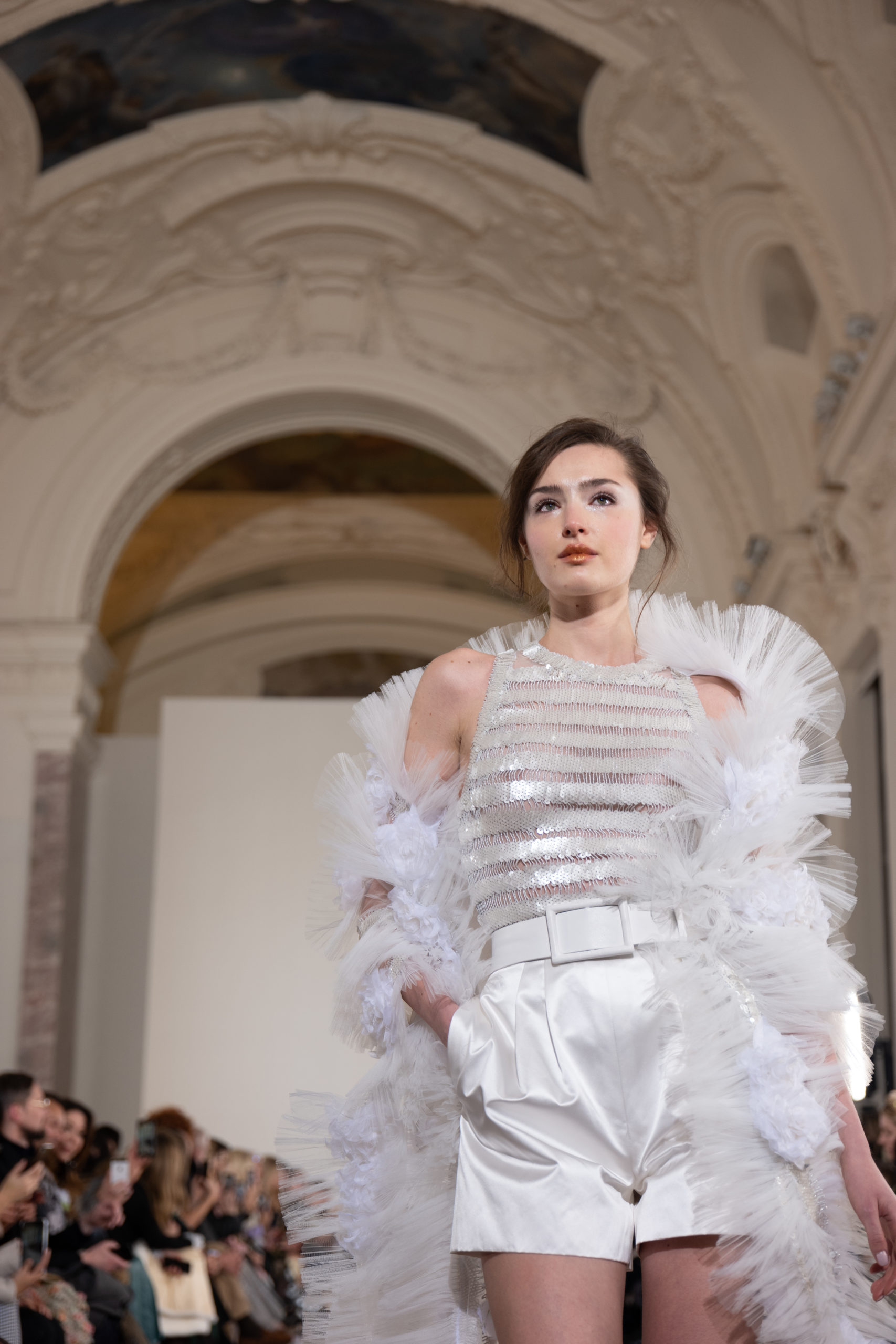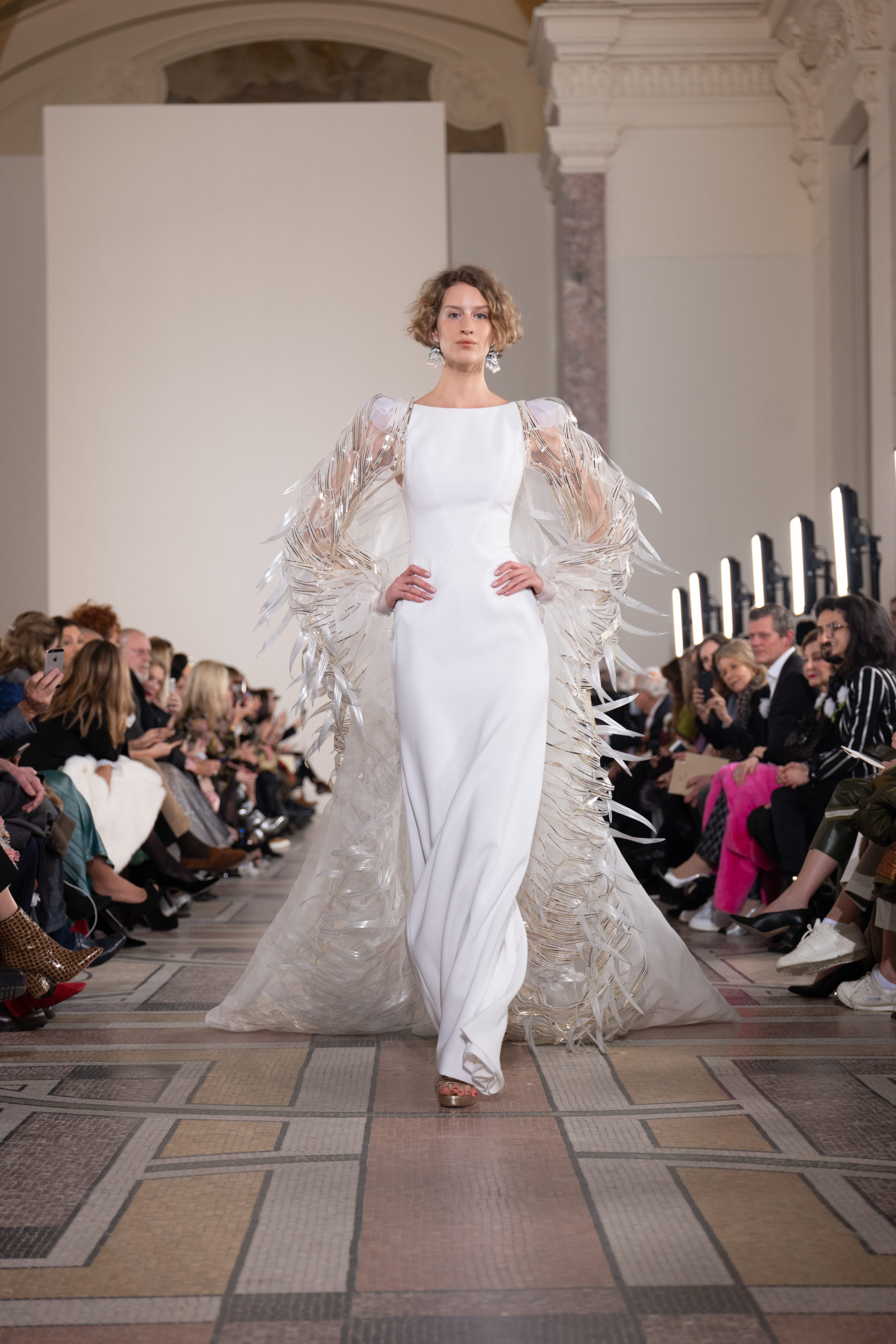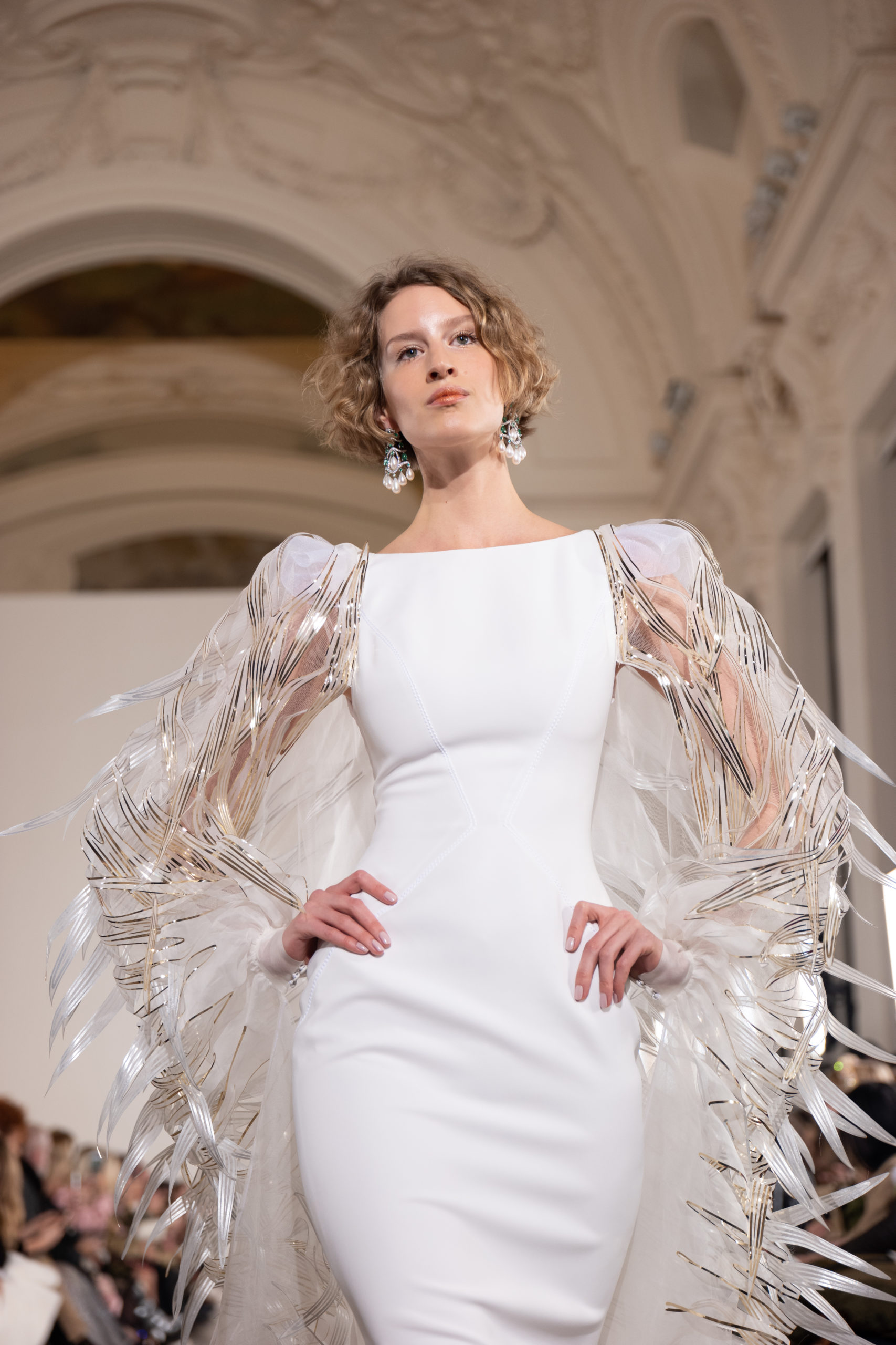 Celui-ci touche autant sa propre famille que toutes celles des membres de sa Maison et de ses ateliers, qui pour la première fois seront présents sur le podium à la fin du défilé. La rose blanche remise à chaque invité incarne ce soutien à un changement pacifique au Pays du Cèdre. Le motif floral cher à Georges Chakra est une trame qui parcourt également l’ensemble de la collection. Aux nombreuses silhouettes immaculées comme autant de pages vierges sur lesquelles écrire une nouvelle histoire répondent une petite robe entièrement réalisée en pétales ivoire, une tenue en tulle entièrement rebrodée de roses, une fleur généreuse posée sur une mini robe en satin duchesse rose fluorescent, comme ces roses peintes une à une à la main sur le gazar d’une longue robe fendue. Les voiles et les transparences nimbent la collection d’un raffinement vaporeux, contrastant avec un travail sophistiqué de volumes. D’un côté, la géométrie épurée d’une robe-boule, les broderies origami et des plissés mouchoirs quasi algorithmiques. De l’autre, les bustiers qui embrassent le corps, les dos qui se dévoilent, la fluidité des capes et des traînes, les volutes des étoffes éclaboussées de plumes, rebrodées à la main de paillettes et de sequins, la sensualité du crêpe et de l’organza plissé. Ce jeu de contraires dégage une énergie particulière, dopée par un jeu de tailles tour à tour ultra longues et extra courtes, convoquant un imaginaire de tapis rouge autant que les podiums disco des années 1970. Blanc, mais aussi rose éclatant ou poudré, aigue-marine, menthe à l’eau, bleu lagon, ciel ou glacier, iridescentes nacrées sur fond d’imprimé végétal… La palette de couleurs évoque une nature fantastique, entre forêt luxuriante et fantasme d’une île tropicale où le temps serait toujours au grand beau et où l’on récolterait des perles aux teintes indéfinissables. Les éclats d’or et d’argent viennent exalter la moire d’un tissu ou réveiller le mat précieux d’une étoffe. Mais cet Éden couture est pugnace, comme le rappellent les flammes dévorant une robe longue à encolure bateau et les souliers plus plats qu’à l’accoutumée, dont ces spartiates à la féminité combattive. Georges Chakra a souhaité aussi s’engager de manière concrète auprès des organisations qui lui tiennent à cœur. Scintillant au cou de la mariée, l’imposant collier en émeraudes et diamants spécialement réalisé par le joaillier Fawaz Gruosi sera mis en vente et une partie de cette vente sera reversée au profit du Children Cancer Hospital de Beyrouth et des bourses d’études de l’école Saint Vincent de Paul.