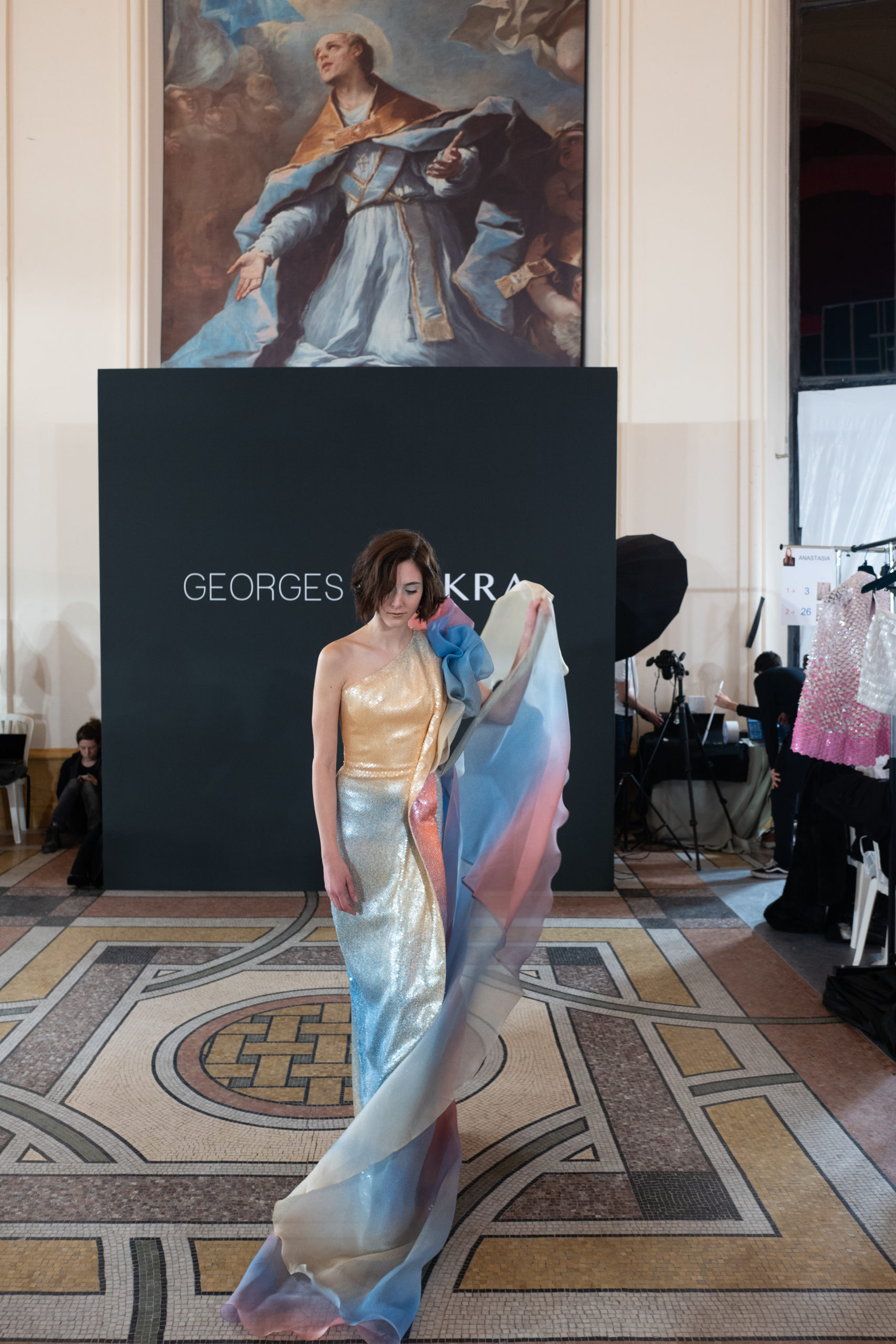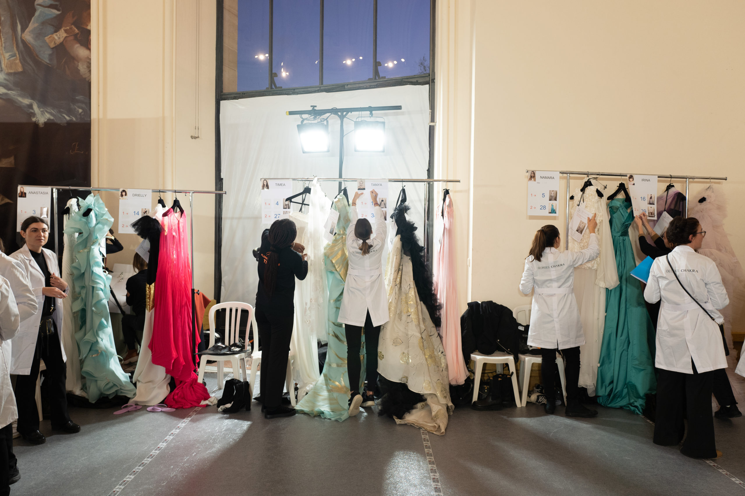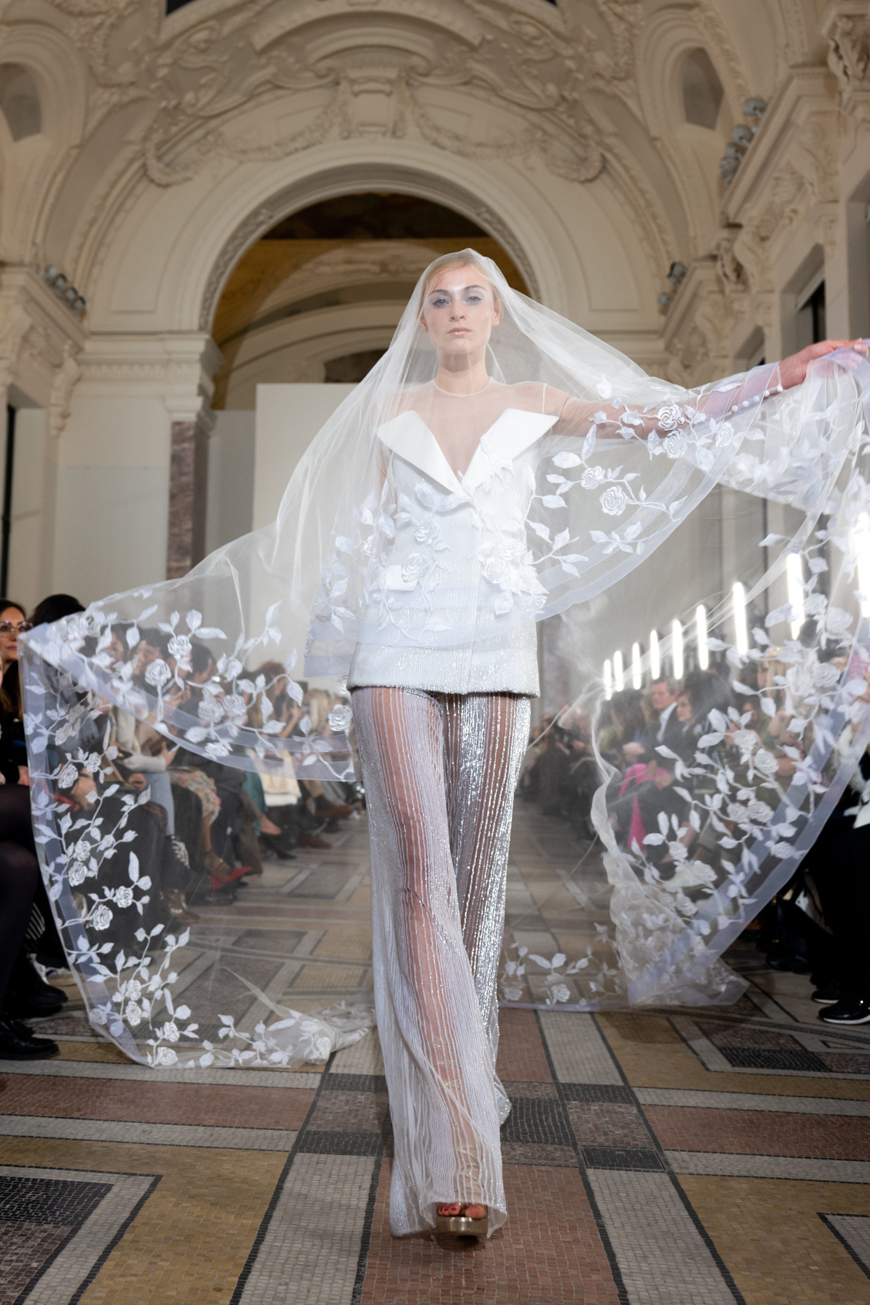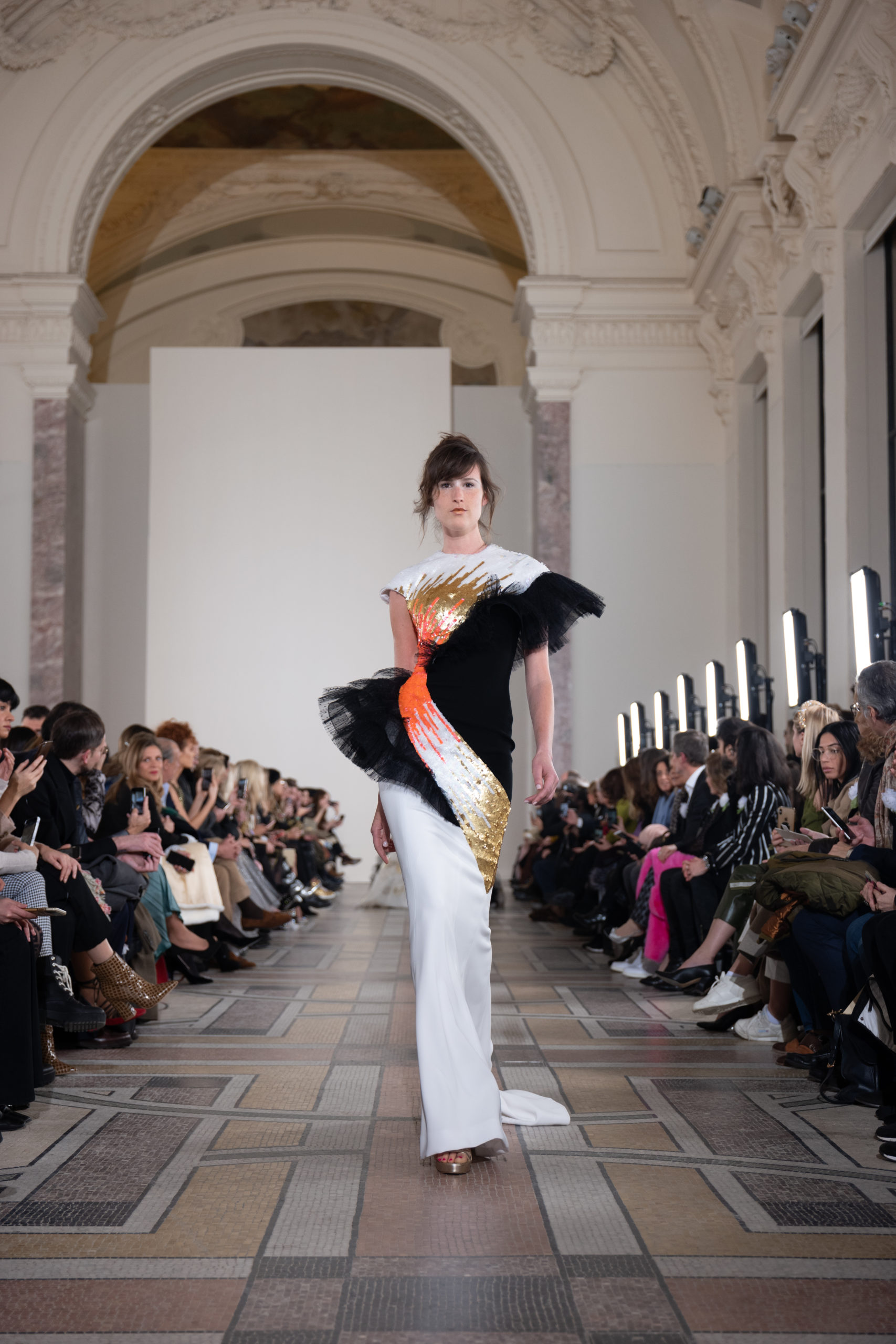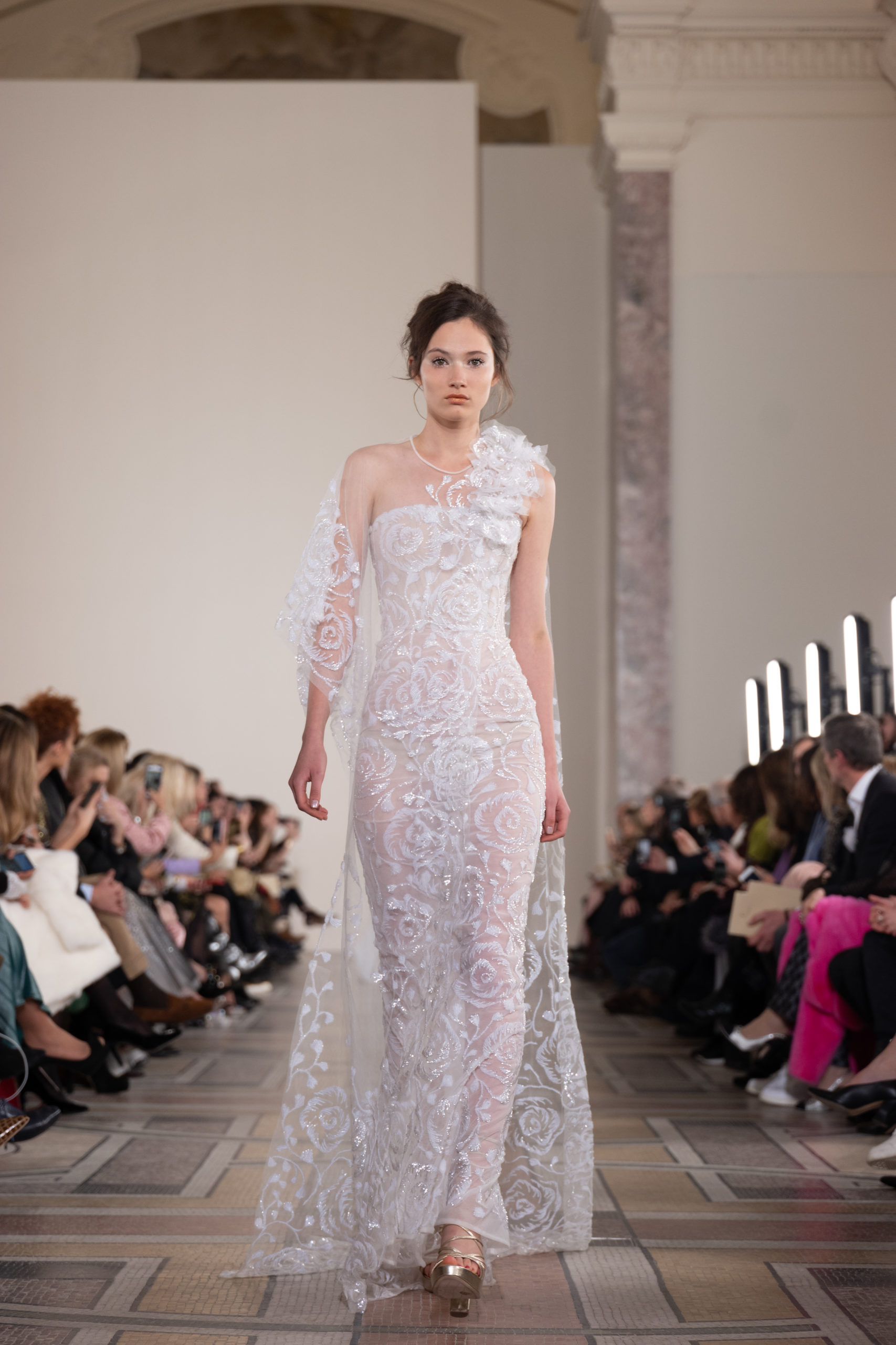 Celui-ci touche autant sa propre famille que toutes celles des membres de sa Maison et de ses ateliers, qui pour la première fois seront présents sur le podium à la fin du défilé. La rose blanche remise à chaque invité incarne ce soutien à un changement pacifique au Pays du Cèdre. Le motif floral cher à Georges Chakra est une trame qui parcourt également l’ensemble de la collection. Aux nombreuses silhouettes immaculées comme autant de pages vierges sur lesquelles écrire une nouvelle histoire répondent une petite robe entièrement réalisée en pétales ivoire, une tenue en tulle entièrement rebrodée de roses, une fleur généreuse posée sur une mini robe en satin duchesse rose fluorescent, comme ces roses peintes une à une à la main sur le gazar d’une longue robe fendue. Les voiles et les transparences nimbent la collection d’un raffinement vaporeux, contrastant avec un travail sophistiqué de volumes. D’un côté, la géométrie épurée d’une robe-boule, les broderies origami et des plissés mouchoirs quasi algorithmiques. De l’autre, les bustiers qui embrassent le corps, les dos qui se dévoilent, la fluidité des capes et des traînes, les volutes des étoffes éclaboussées de plumes, rebrodées à la main de paillettes et de sequins, la sensualité du crêpe et de l’organza plissé. Ce jeu de contraires dégage une énergie particulière, dopée par un jeu de tailles tour à tour ultra longues et extra courtes, convoquant un imaginaire de tapis rouge autant que les podiums disco des années 1970. Blanc, mais aussi rose éclatant ou poudré, aigue-marine, menthe à l’eau, bleu lagon, ciel ou glacier, iridescentes nacrées sur fond d’imprimé végétal… La palette de couleurs évoque une nature fantastique, entre forêt luxuriante et fantasme d’une île tropicale où le temps serait toujours au grand beau et où l’on récolterait des perles aux teintes indéfinissables. Les éclats d’or et d’argent viennent exalter la moire d’un tissu ou réveiller le mat précieux d’une étoffe. Mais cet Éden couture est pugnace, comme le rappellent les flammes dévorant une robe longue à encolure bateau et les souliers plus plats qu’à l’accoutumée, dont ces spartiates à la féminité combattive. Georges Chakra a souhaité aussi s’engager de manière concrète auprès des organisations qui lui tiennent à cœur. Scintillant au cou de la mariée, l’imposant collier en émeraudes et diamants spécialement réalisé par le joaillier Fawaz Gruosi sera mis en vente et une partie de cette vente sera reversée au profit du Children Cancer Hospital de Beyrouth et des bourses d’études de l’école Saint Vincent de Paul.