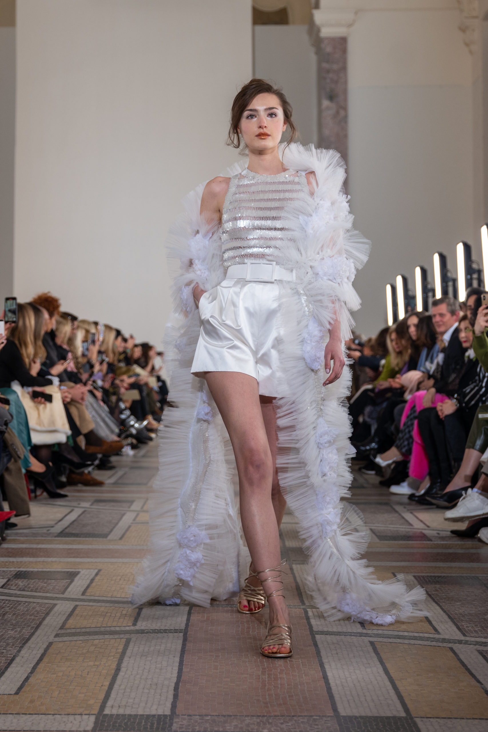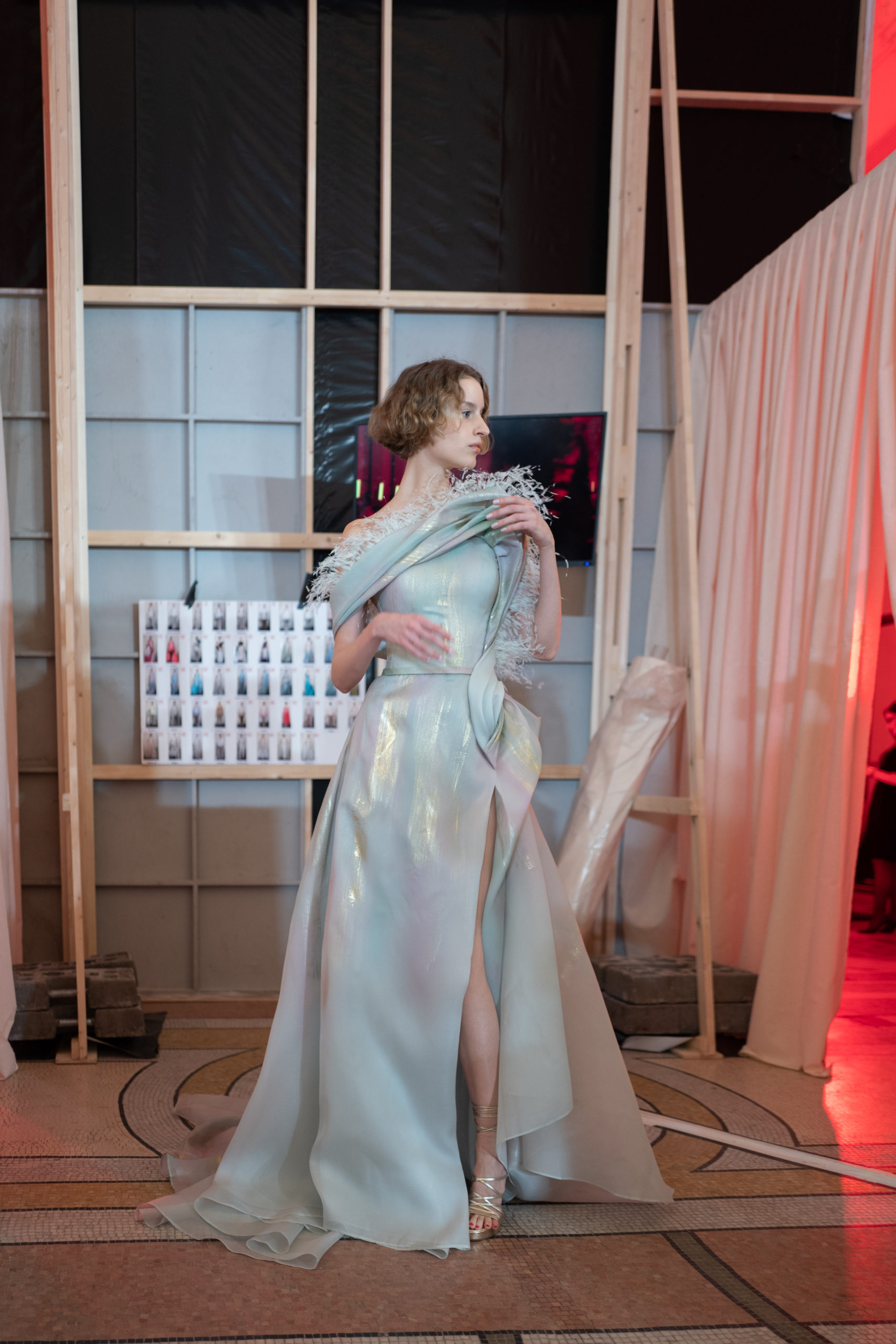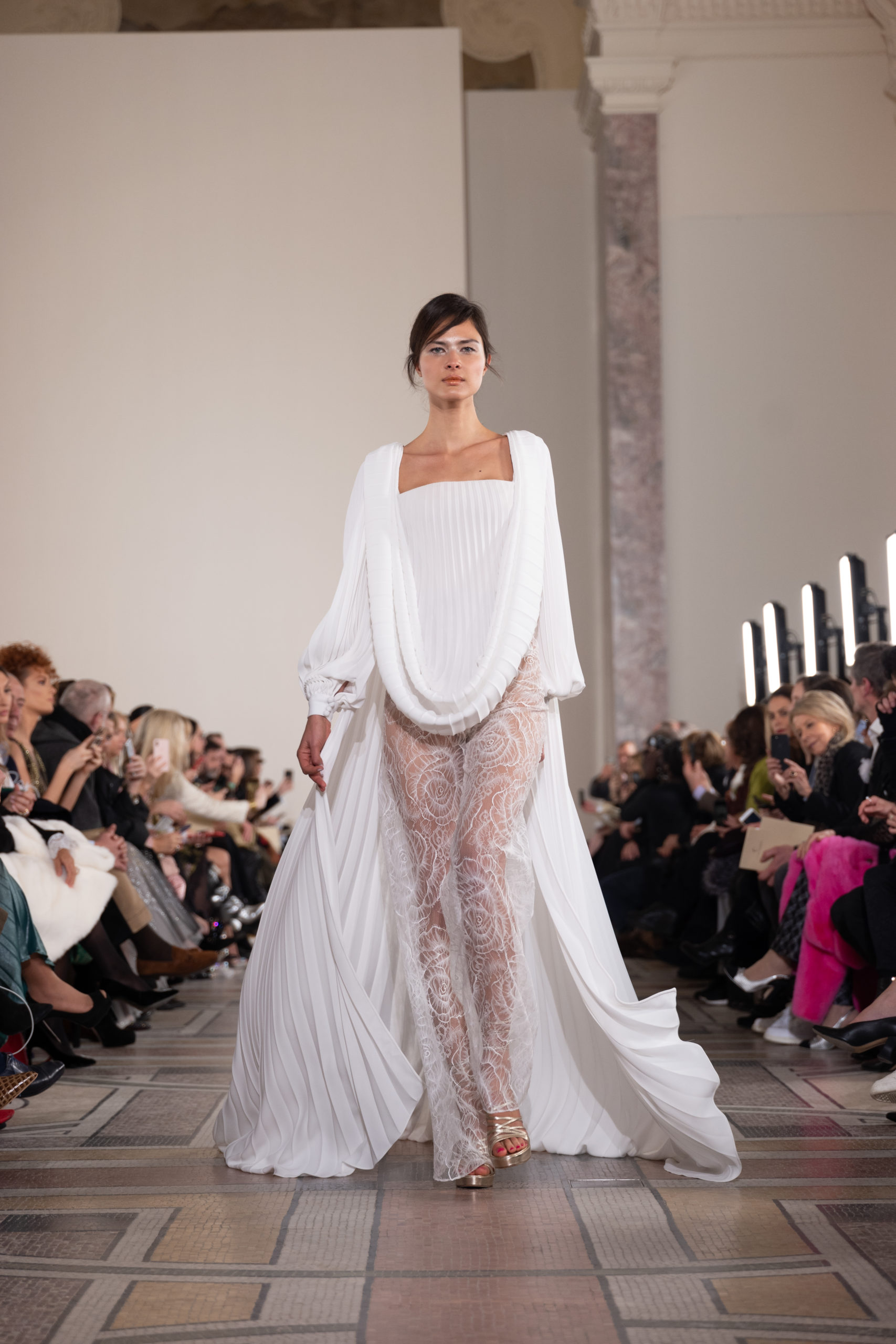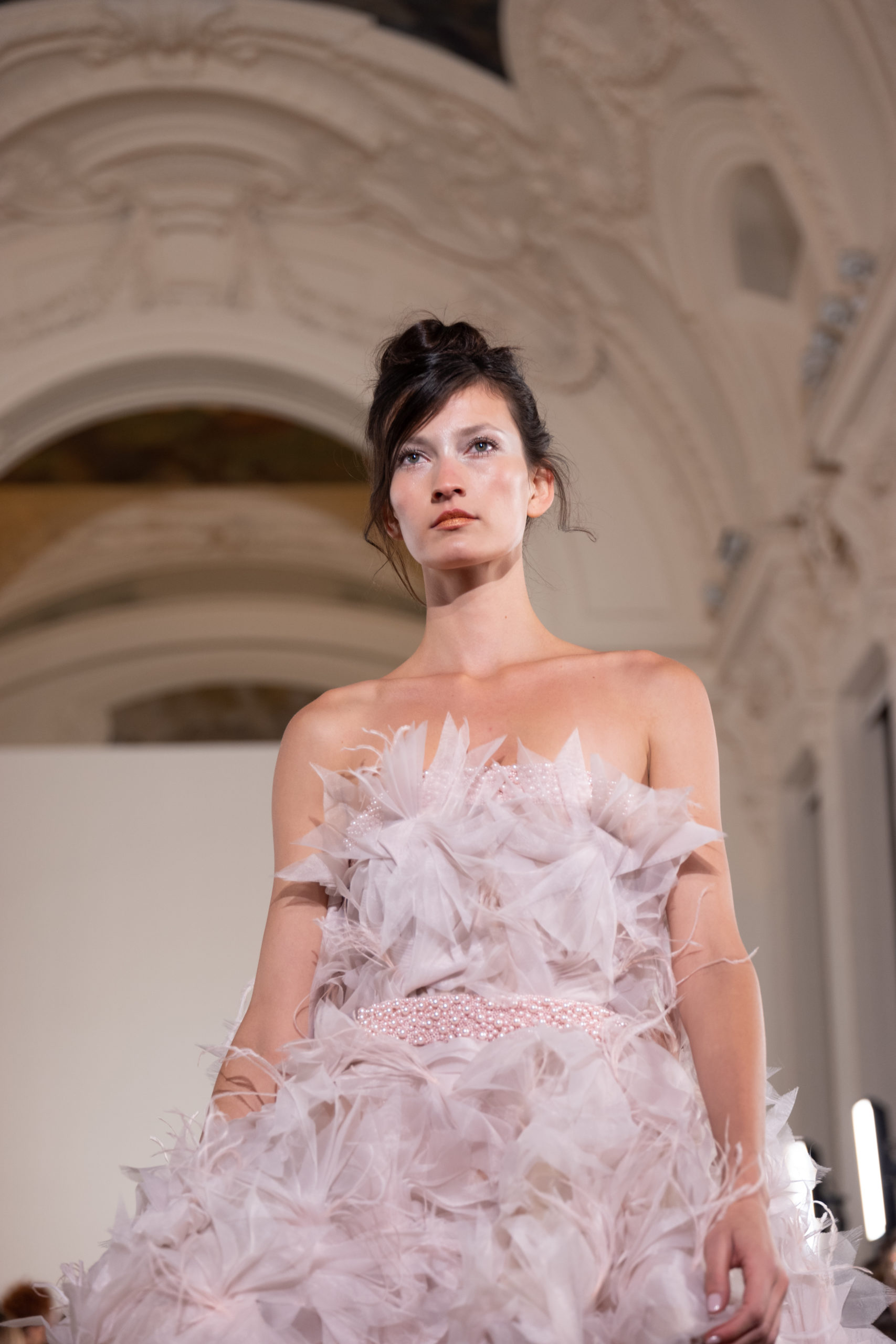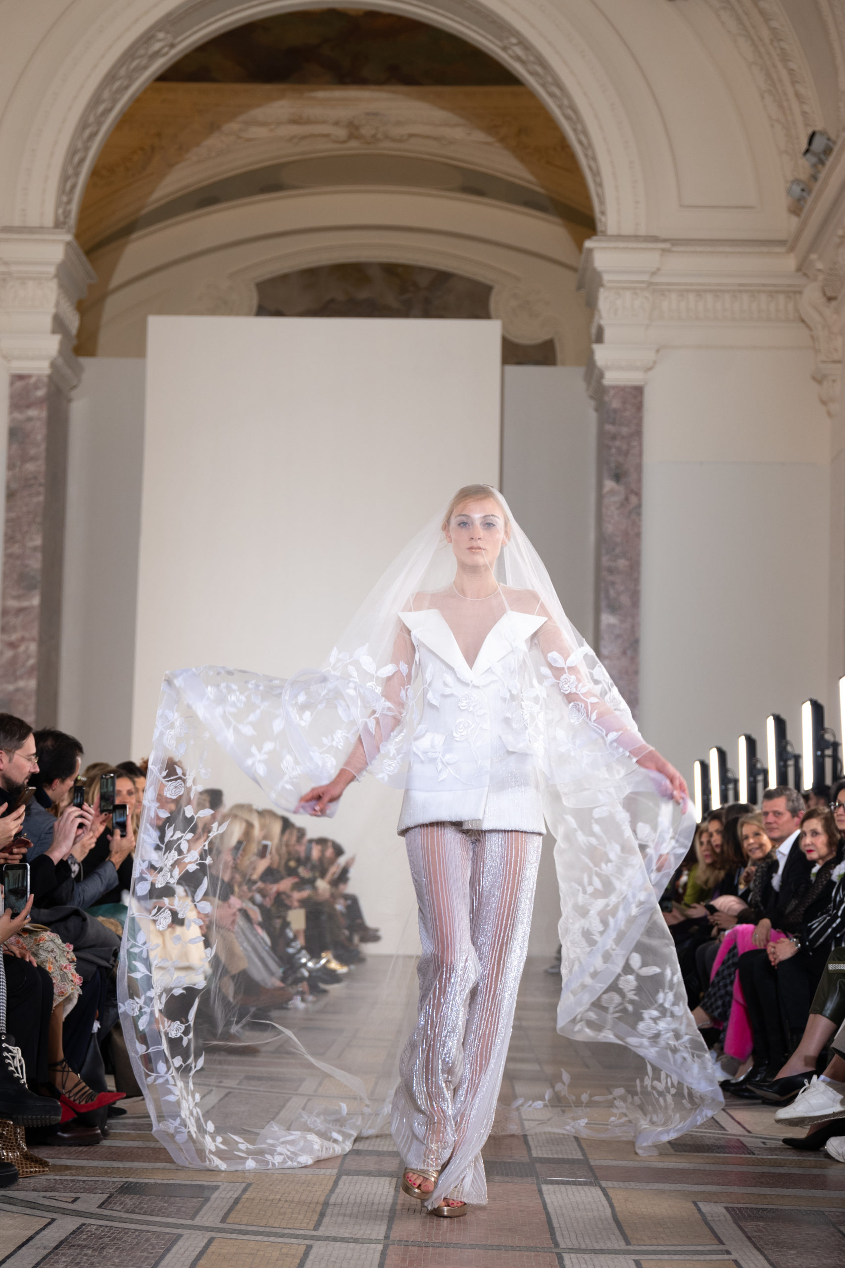 Celui-ci touche autant sa propre famille que toutes celles des membres de sa Maison et de ses ateliers, qui pour la première fois seront présents sur le podium à la fin du défilé. La rose blanche remise à chaque invité incarne ce soutien à un changement pacifique au Pays du Cèdre. Le motif floral cher à Georges Chakra est une trame qui parcourt également l’ensemble de la collection. Aux nombreuses silhouettes immaculées comme autant de pages vierges sur lesquelles écrire une nouvelle histoire répondent une petite robe entièrement réalisée en pétales ivoire, une tenue en tulle entièrement rebrodée de roses, une fleur généreuse posée sur une mini robe en satin duchesse rose fluorescent, comme ces roses peintes une à une à la main sur le gazar d’une longue robe fendue. Les voiles et les transparences nimbent la collection d’un raffinement vaporeux, contrastant avec un travail sophistiqué de volumes. D’un côté, la géométrie épurée d’une robe-boule, les broderies origami et des plissés mouchoirs quasi algorithmiques. De l’autre, les bustiers qui embrassent le corps, les dos qui se dévoilent, la fluidité des capes et des traînes, les volutes des étoffes éclaboussées de plumes, rebrodées à la main de paillettes et de sequins, la sensualité du crêpe et de l’organza plissé. Ce jeu de contraires dégage une énergie particulière, dopée par un jeu de tailles tour à tour ultra longues et extra courtes, convoquant un imaginaire de tapis rouge autant que les podiums disco des années 1970. Blanc, mais aussi rose éclatant ou poudré, aigue-marine, menthe à l’eau, bleu lagon, ciel ou glacier, iridescentes nacrées sur fond d’imprimé végétal… La palette de couleurs évoque une nature fantastique, entre forêt luxuriante et fantasme d’une île tropicale où le temps serait toujours au grand beau et où l’on récolterait des perles aux teintes indéfinissables. Les éclats d’or et d’argent viennent exalter la moire d’un tissu ou réveiller le mat précieux d’une étoffe. Mais cet Éden couture est pugnace, comme le rappellent les flammes dévorant une robe longue à encolure bateau et les souliers plus plats qu’à l’accoutumée, dont ces spartiates à la féminité combattive. Georges Chakra a souhaité aussi s’engager de manière concrète auprès des organisations qui lui tiennent à cœur. Scintillant au cou de la mariée, l’imposant collier en émeraudes et diamants spécialement réalisé par le joaillier Fawaz Gruosi sera mis en vente et une partie de cette vente sera reversée au profit du Children Cancer Hospital de Beyrouth et des bourses d’études de l’école Saint Vincent de Paul.