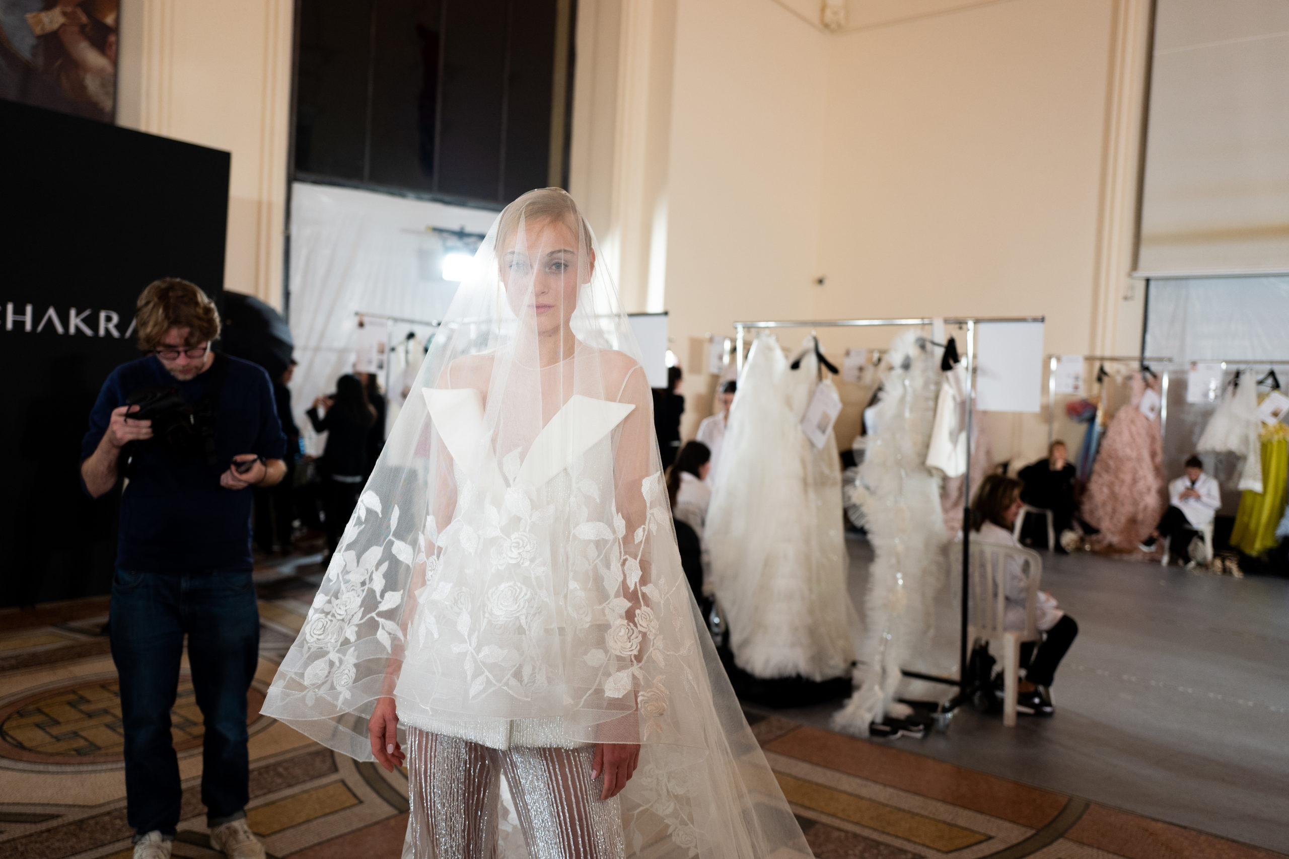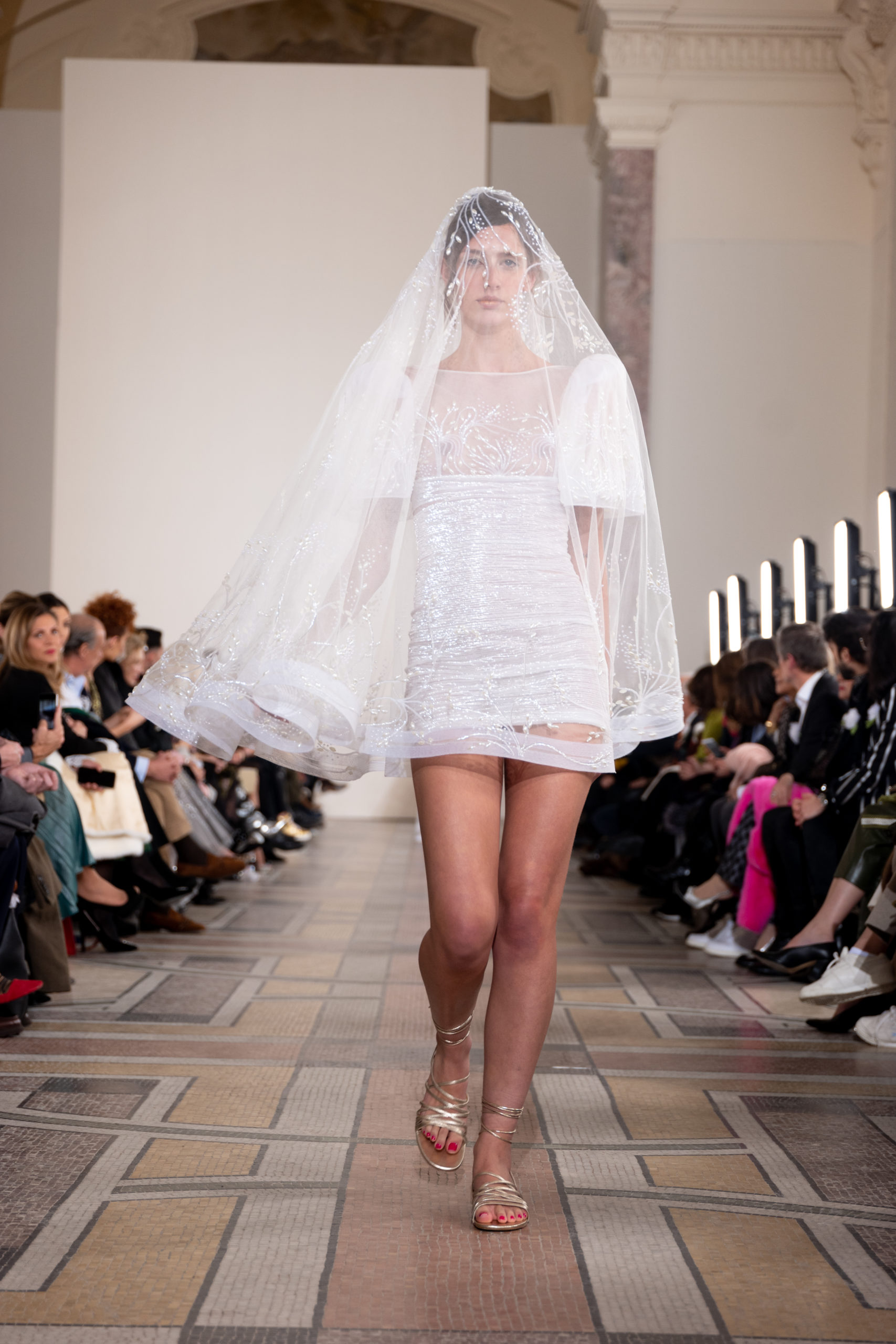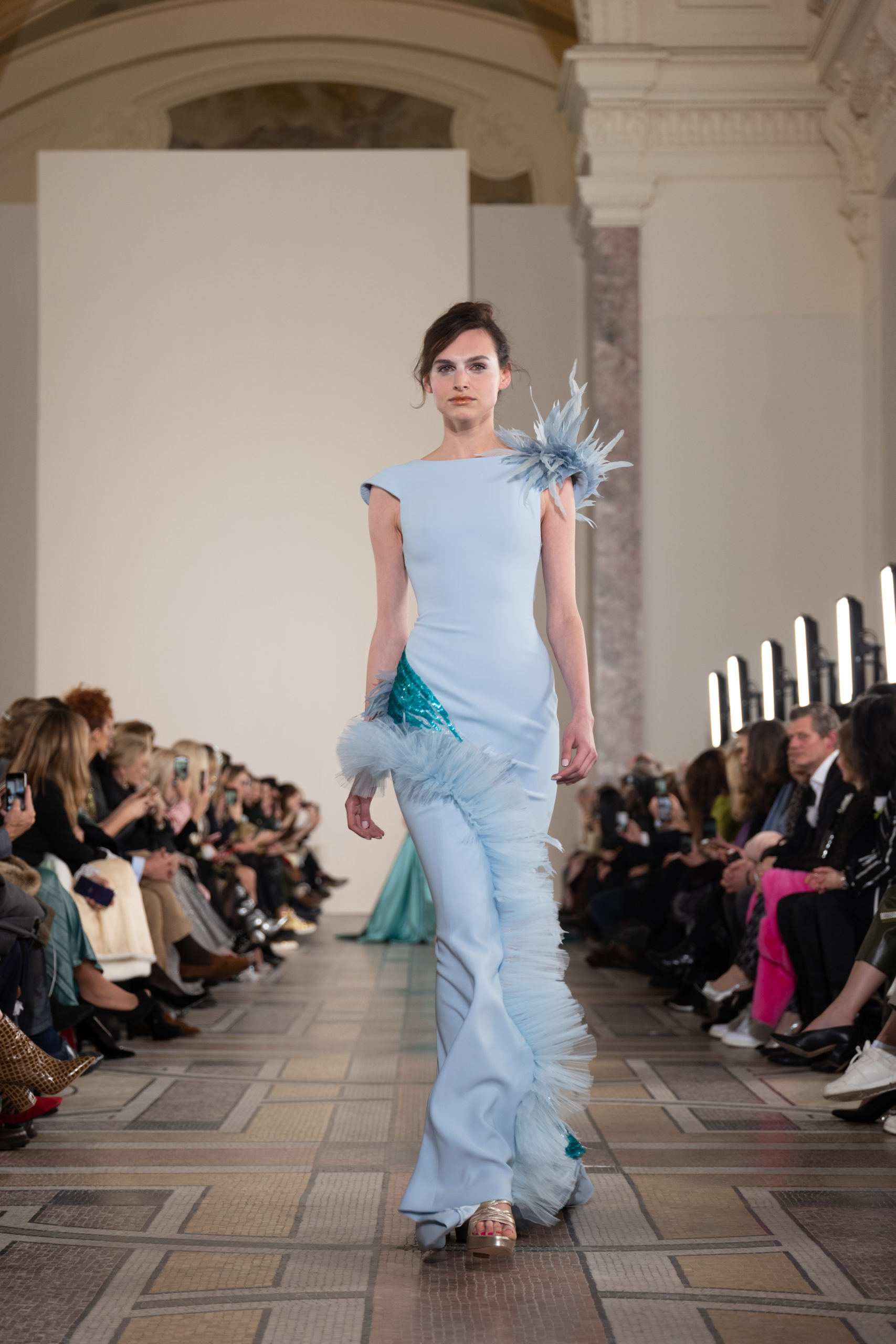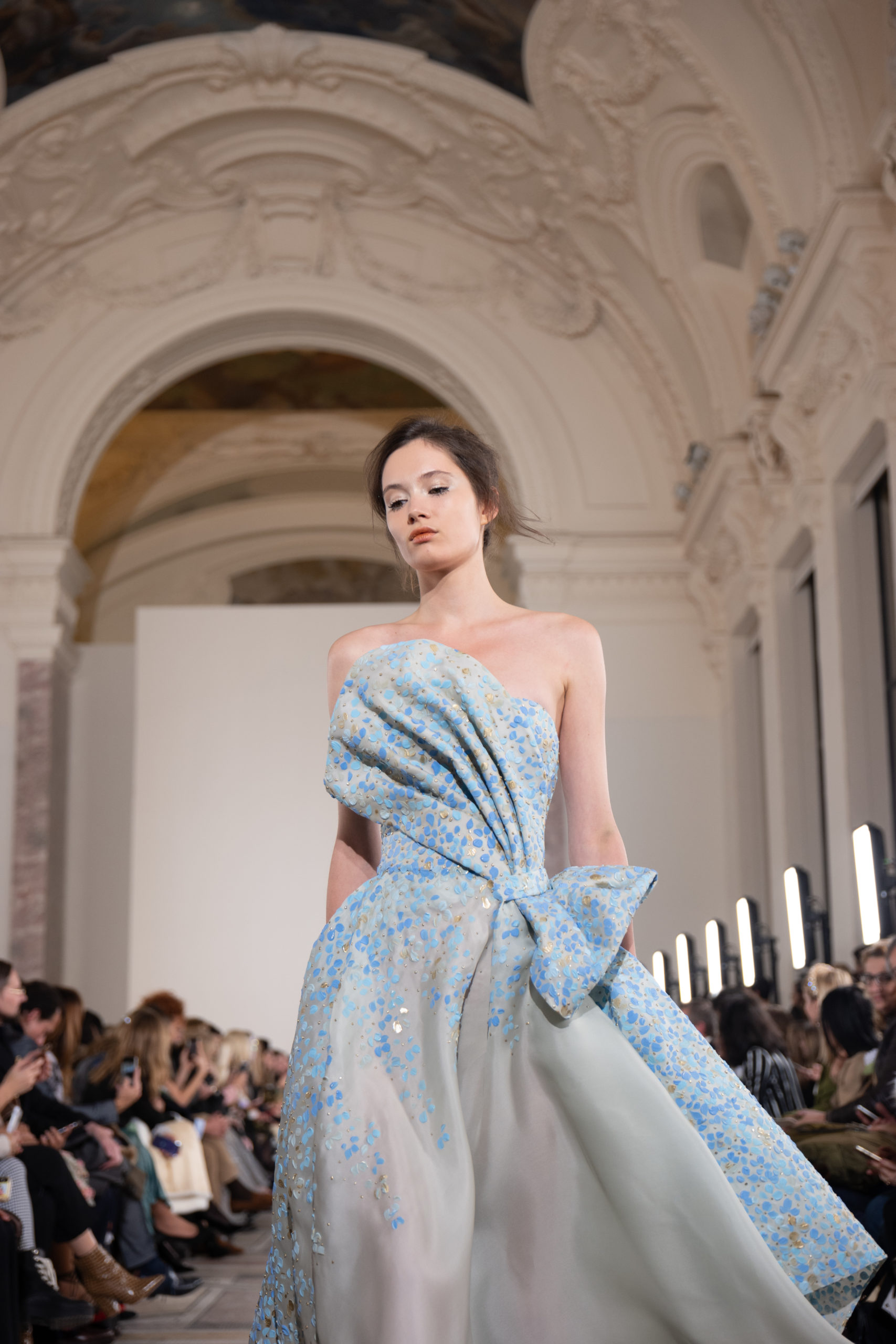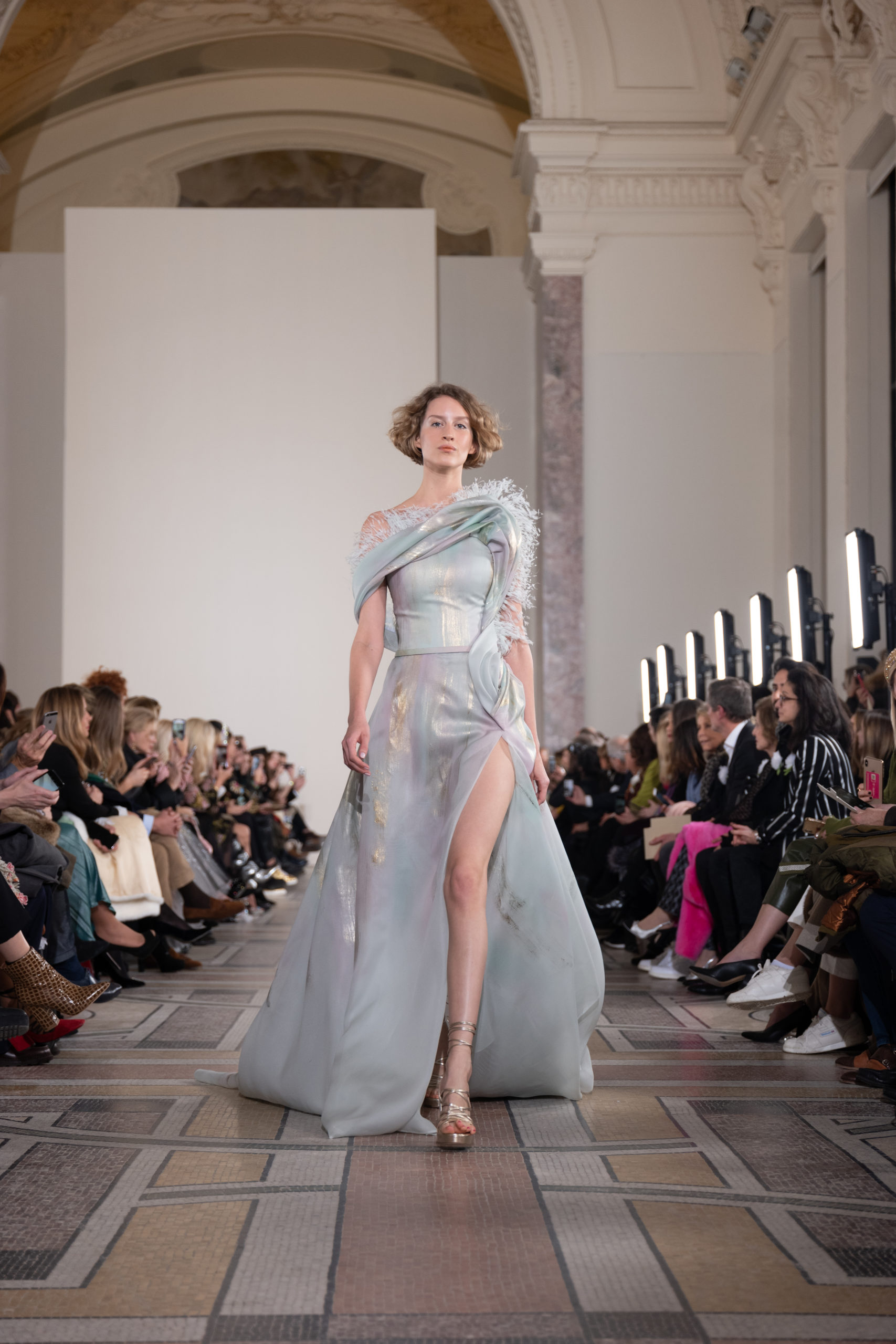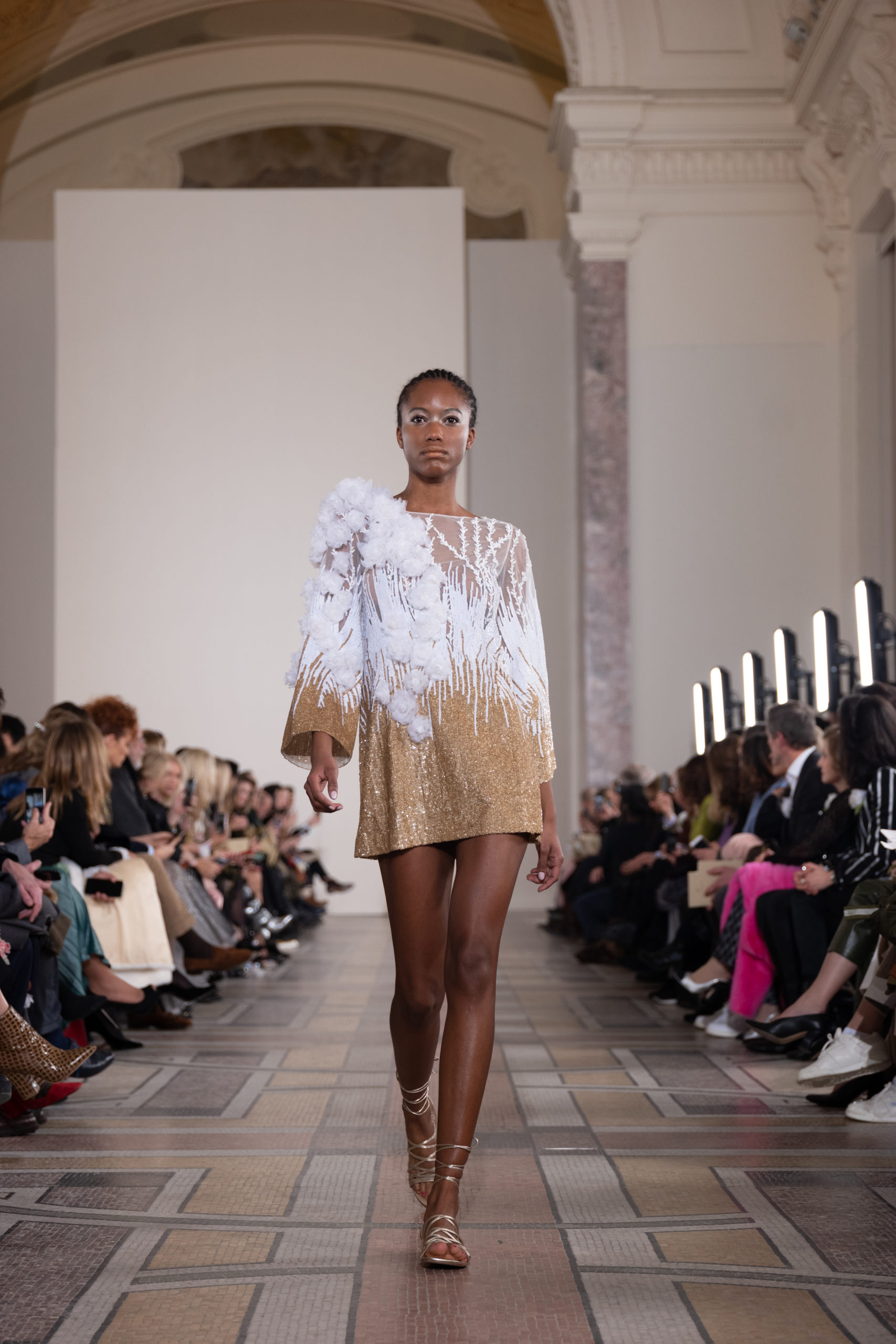 Celui-ci touche autant sa propre famille que toutes celles des membres de sa Maison et de ses ateliers, qui pour la première fois seront présents sur le podium à la fin du défilé. La rose blanche remise à chaque invité incarne ce soutien à un changement pacifique au Pays du Cèdre. Le motif floral cher à Georges Chakra est une trame qui parcourt également l’ensemble de la collection. Aux nombreuses silhouettes immaculées comme autant de pages vierges sur lesquelles écrire une nouvelle histoire répondent une petite robe entièrement réalisée en pétales ivoire, une tenue en tulle entièrement rebrodée de roses, une fleur généreuse posée sur une mini robe en satin duchesse rose fluorescent, comme ces roses peintes une à une à la main sur le gazar d’une longue robe fendue. Les voiles et les transparences nimbent la collection d’un raffinement vaporeux, contrastant avec un travail sophistiqué de volumes. D’un côté, la géométrie épurée d’une robe-boule, les broderies origami et des plissés mouchoirs quasi algorithmiques. De l’autre, les bustiers qui embrassent le corps, les dos qui se dévoilent, la fluidité des capes et des traînes, les volutes des étoffes éclaboussées de plumes, rebrodées à la main de paillettes et de sequins, la sensualité du crêpe et de l’organza plissé. Ce jeu de contraires dégage une énergie particulière, dopée par un jeu de tailles tour à tour ultra longues et extra courtes, convoquant un imaginaire de tapis rouge autant que les podiums disco des années 1970. Blanc, mais aussi rose éclatant ou poudré, aigue-marine, menthe à l’eau, bleu lagon, ciel ou glacier, iridescentes nacrées sur fond d’imprimé végétal… La palette de couleurs évoque une nature fantastique, entre forêt luxuriante et fantasme d’une île tropicale où le temps serait toujours au grand beau et où l’on récolterait des perles aux teintes indéfinissables. Les éclats d’or et d’argent viennent exalter la moire d’un tissu ou réveiller le mat précieux d’une étoffe. Mais cet Éden couture est pugnace, comme le rappellent les flammes dévorant une robe longue à encolure bateau et les souliers plus plats qu’à l’accoutumée, dont ces spartiates à la féminité combattive. Georges Chakra a souhaité aussi s’engager de manière concrète auprès des organisations qui lui tiennent à cœur. Scintillant au cou de la mariée, l’imposant collier en émeraudes et diamants spécialement réalisé par le joaillier Fawaz Gruosi sera mis en vente et une partie de cette vente sera reversée au profit du Children Cancer Hospital de Beyrouth et des bourses d’études de l’école Saint Vincent de Paul.