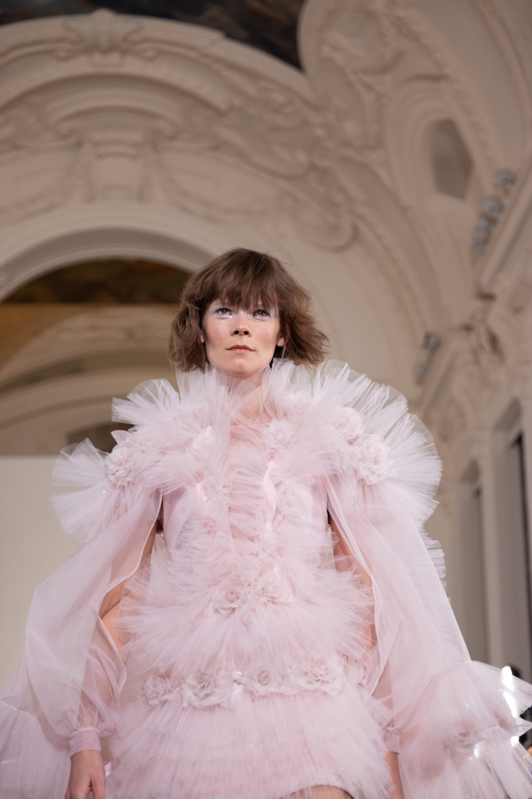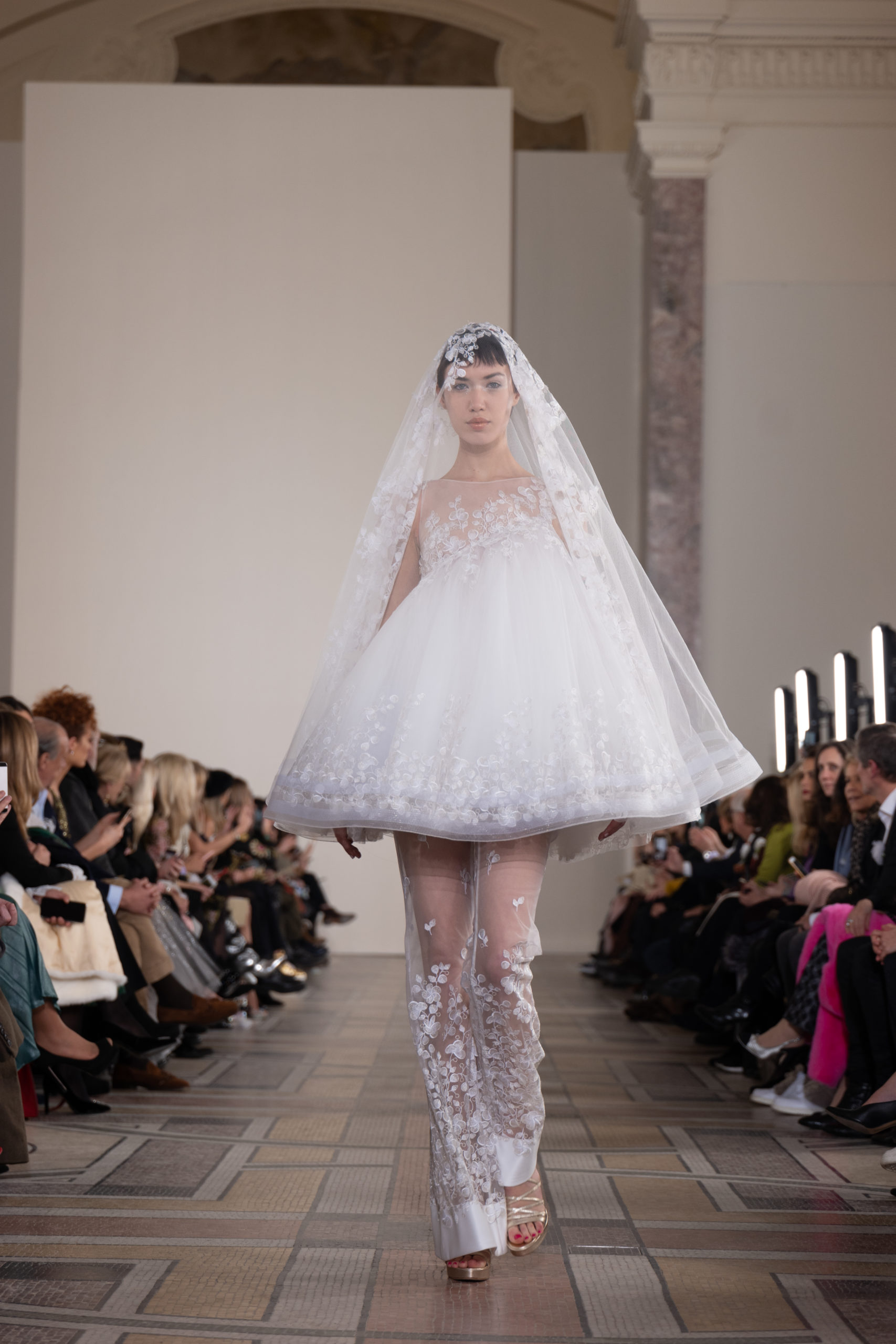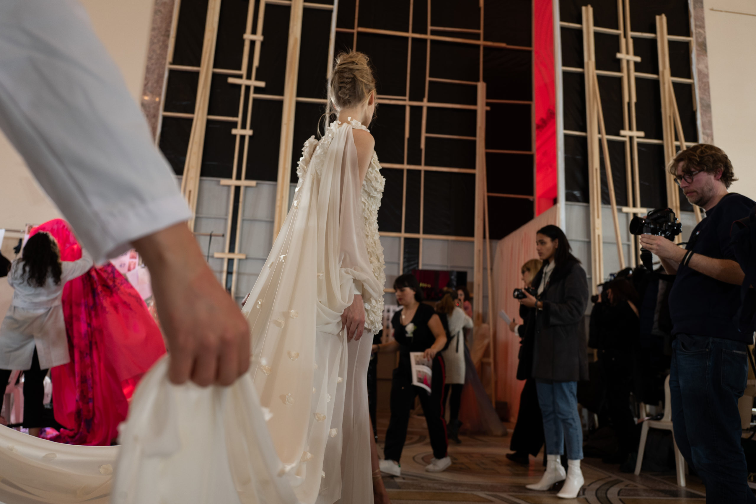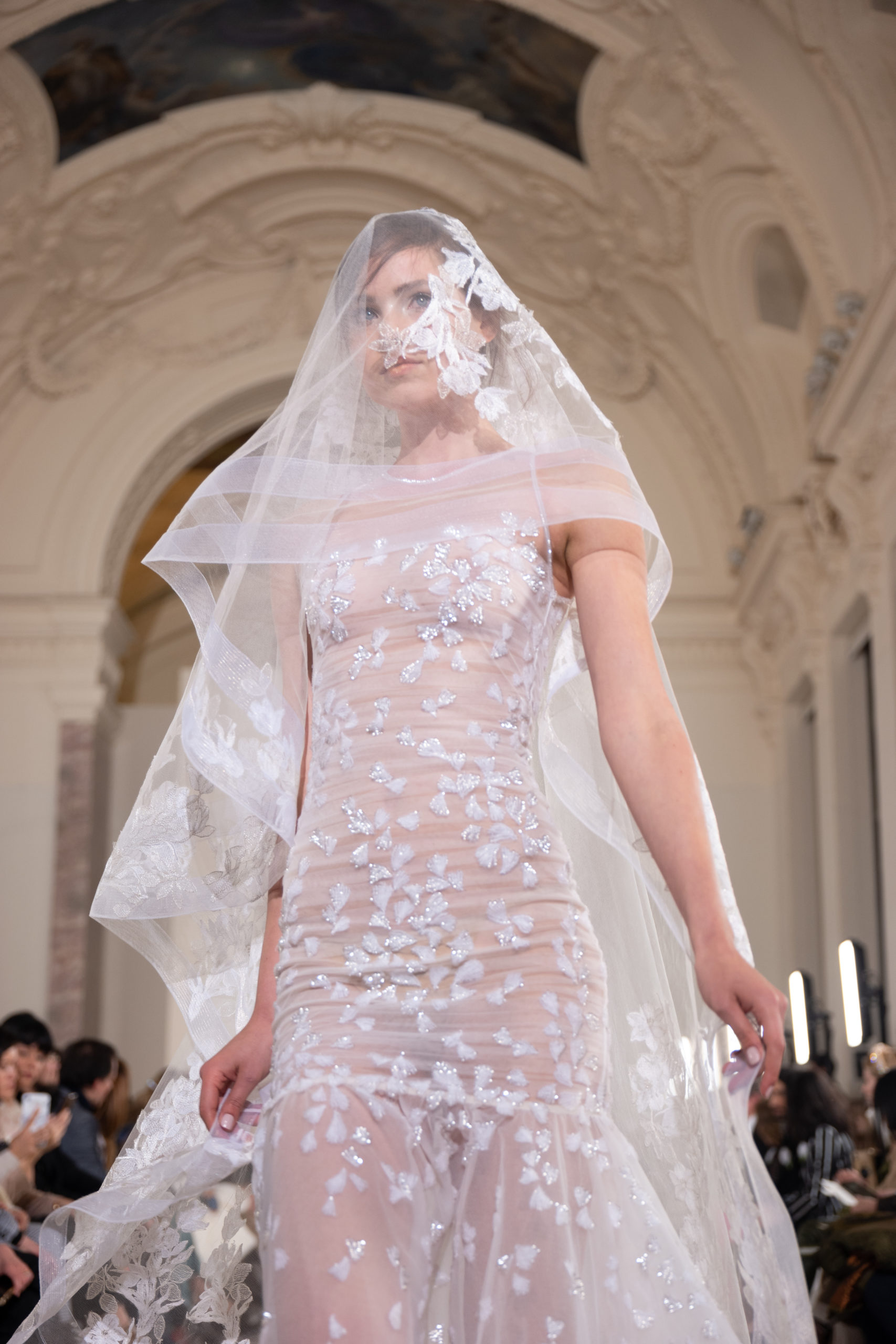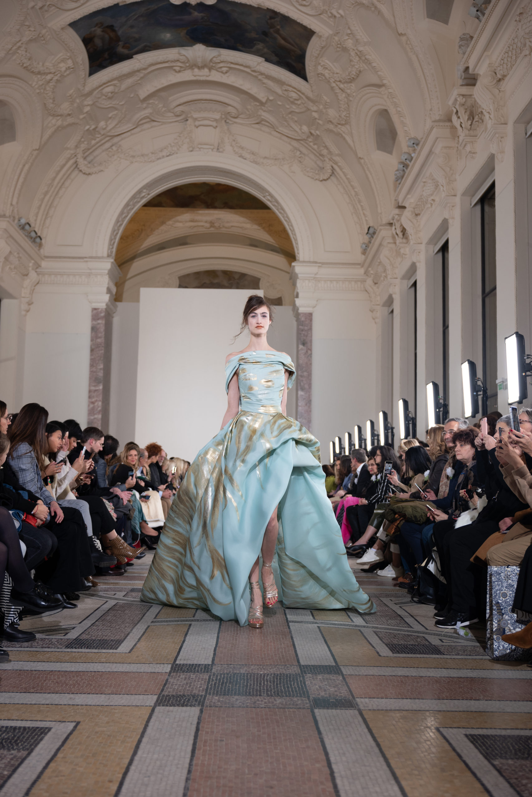 Celui-ci touche autant sa propre famille que toutes celles des membres de sa Maison et de ses ateliers, qui pour la première fois seront présents sur le podium à la fin du défilé. La rose blanche remise à chaque invité incarne ce soutien à un changement pacifique au Pays du Cèdre. Le motif floral cher à Georges Chakra est une trame qui parcourt également l’ensemble de la collection. Aux nombreuses silhouettes immaculées comme autant de pages vierges sur lesquelles écrire une nouvelle histoire répondent une petite robe entièrement réalisée en pétales ivoire, une tenue en tulle entièrement rebrodée de roses, une fleur généreuse posée sur une mini robe en satin duchesse rose fluorescent, comme ces roses peintes une à une à la main sur le gazar d’une longue robe fendue. Les voiles et les transparences nimbent la collection d’un raffinement vaporeux, contrastant avec un travail sophistiqué de volumes. D’un côté, la géométrie épurée d’une robe-boule, les broderies origami et des plissés mouchoirs quasi algorithmiques. De l’autre, les bustiers qui embrassent le corps, les dos qui se dévoilent, la fluidité des capes et des traînes, les volutes des étoffes éclaboussées de plumes, rebrodées à la main de paillettes et de sequins, la sensualité du crêpe et de l’organza plissé. Ce jeu de contraires dégage une énergie particulière, dopée par un jeu de tailles tour à tour ultra longues et extra courtes, convoquant un imaginaire de tapis rouge autant que les podiums disco des années 1970. Blanc, mais aussi rose éclatant ou poudré, aigue-marine, menthe à l’eau, bleu lagon, ciel ou glacier, iridescentes nacrées sur fond d’imprimé végétal… La palette de couleurs évoque une nature fantastique, entre forêt luxuriante et fantasme d’une île tropicale où le temps serait toujours au grand beau et où l’on récolterait des perles aux teintes indéfinissables. Les éclats d’or et d’argent viennent exalter la moire d’un tissu ou réveiller le mat précieux d’une étoffe. Mais cet Éden couture est pugnace, comme le rappellent les flammes dévorant une robe longue à encolure bateau et les souliers plus plats qu’à l’accoutumée, dont ces spartiates à la féminité combattive. Georges Chakra a souhaité aussi s’engager de manière concrète auprès des organisations qui lui tiennent à cœur. Scintillant au cou de la mariée, l’imposant collier en émeraudes et diamants spécialement réalisé par le joaillier Fawaz Gruosi sera mis en vente et une partie de cette vente sera reversée au profit du Children Cancer Hospital de Beyrouth et des bourses d’études de l’école Saint Vincent de Paul.