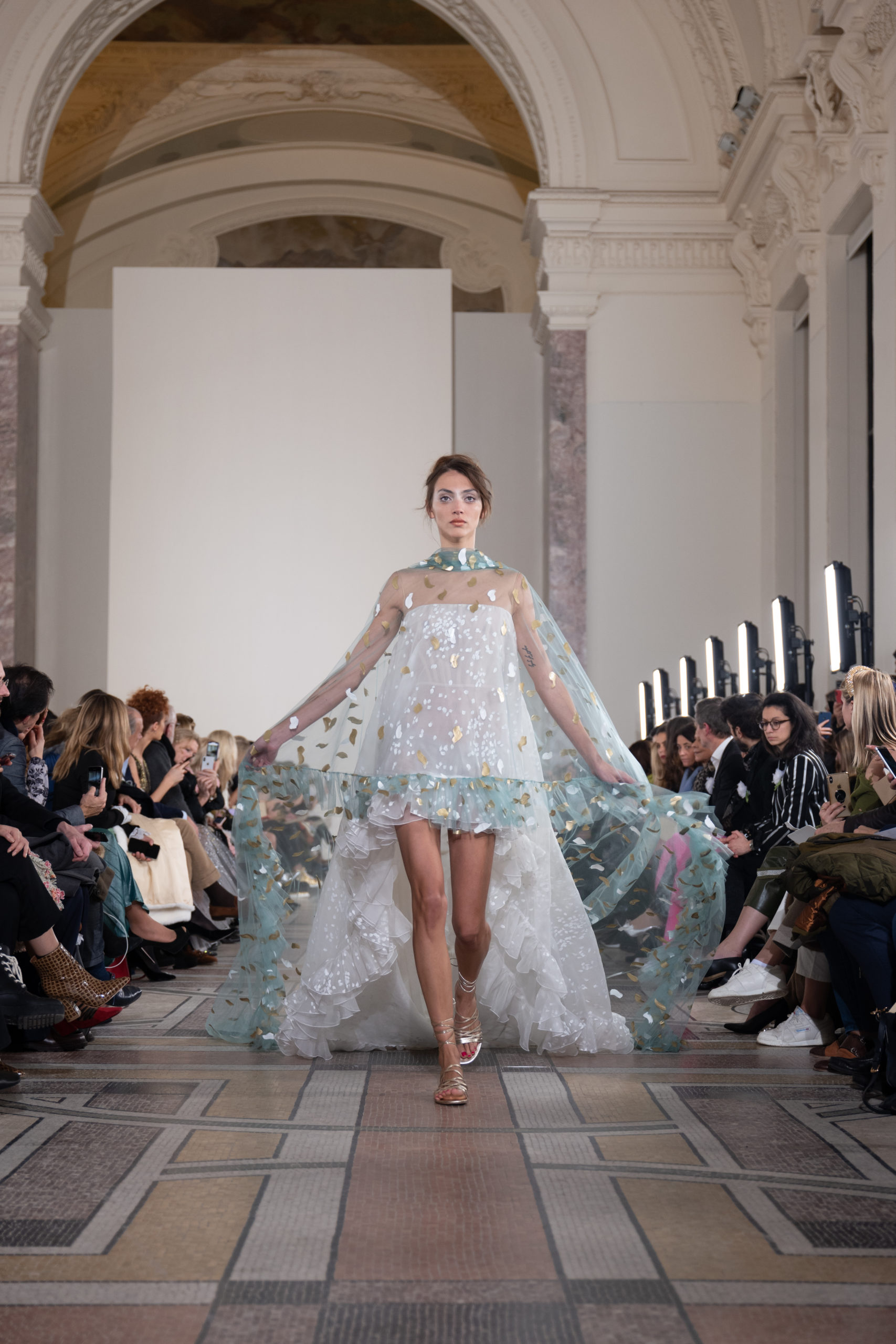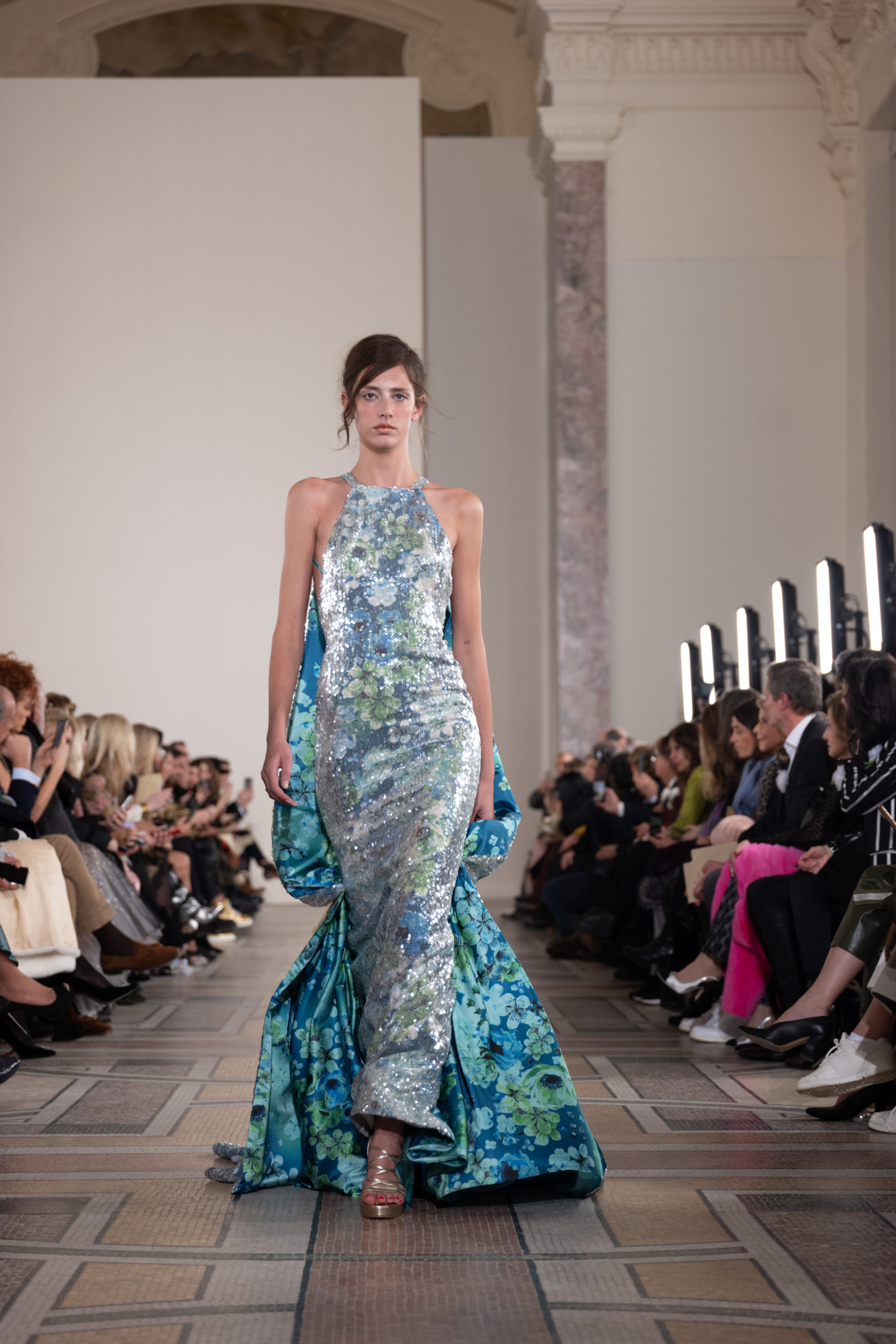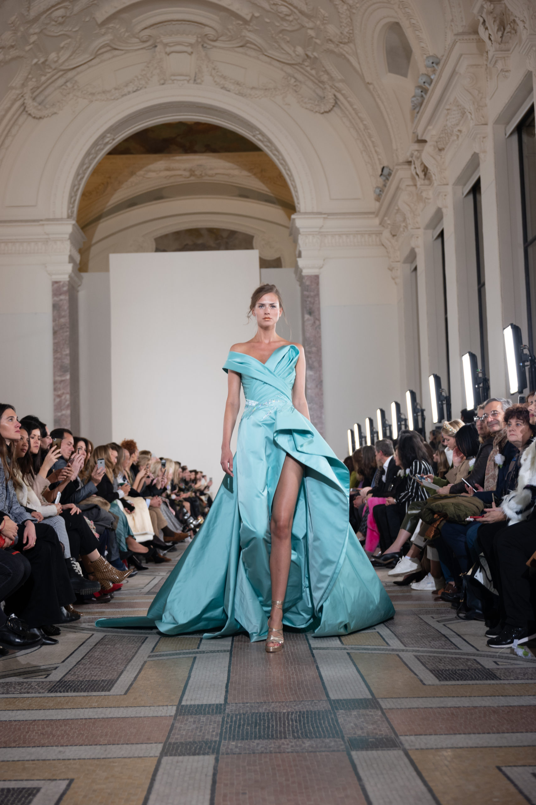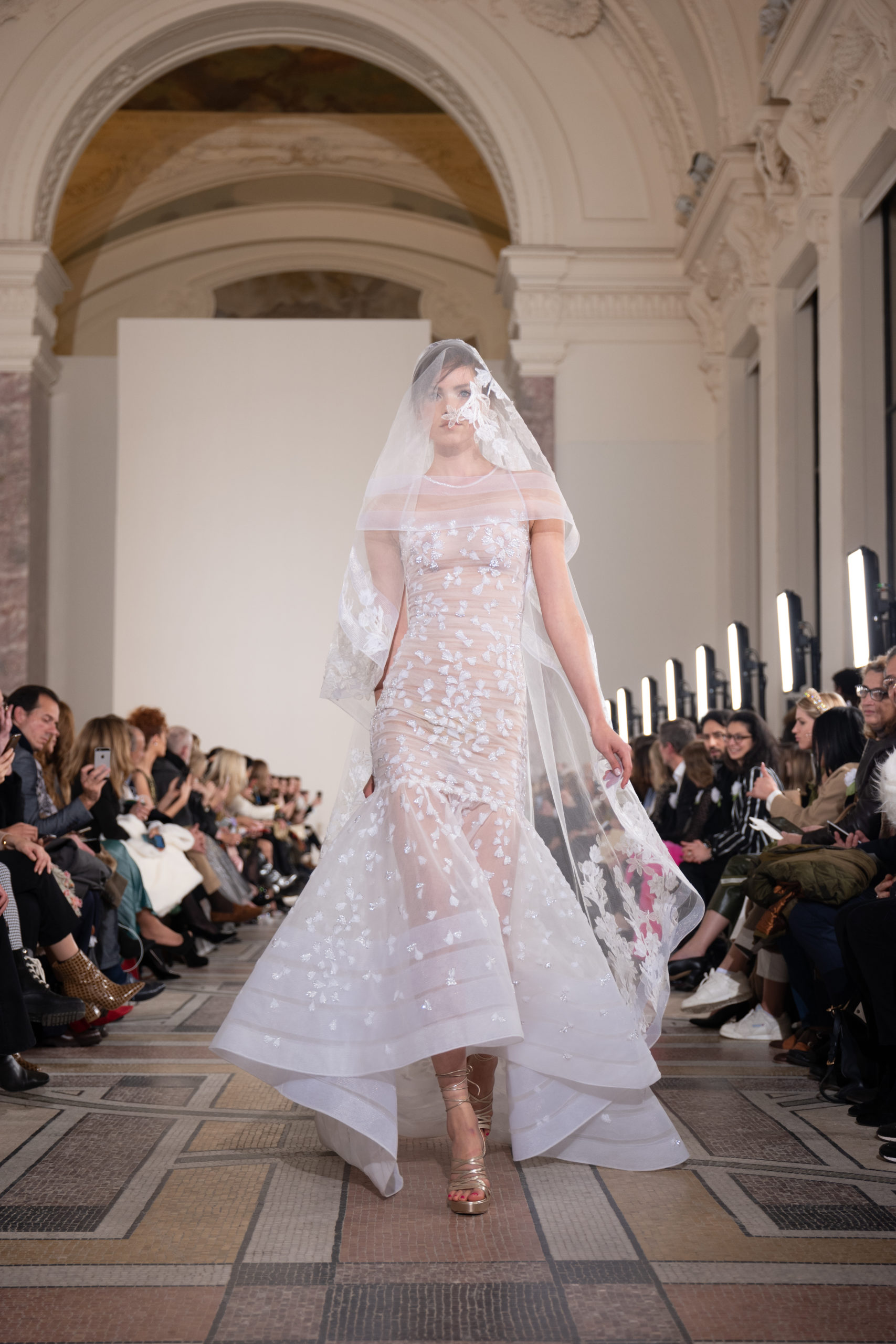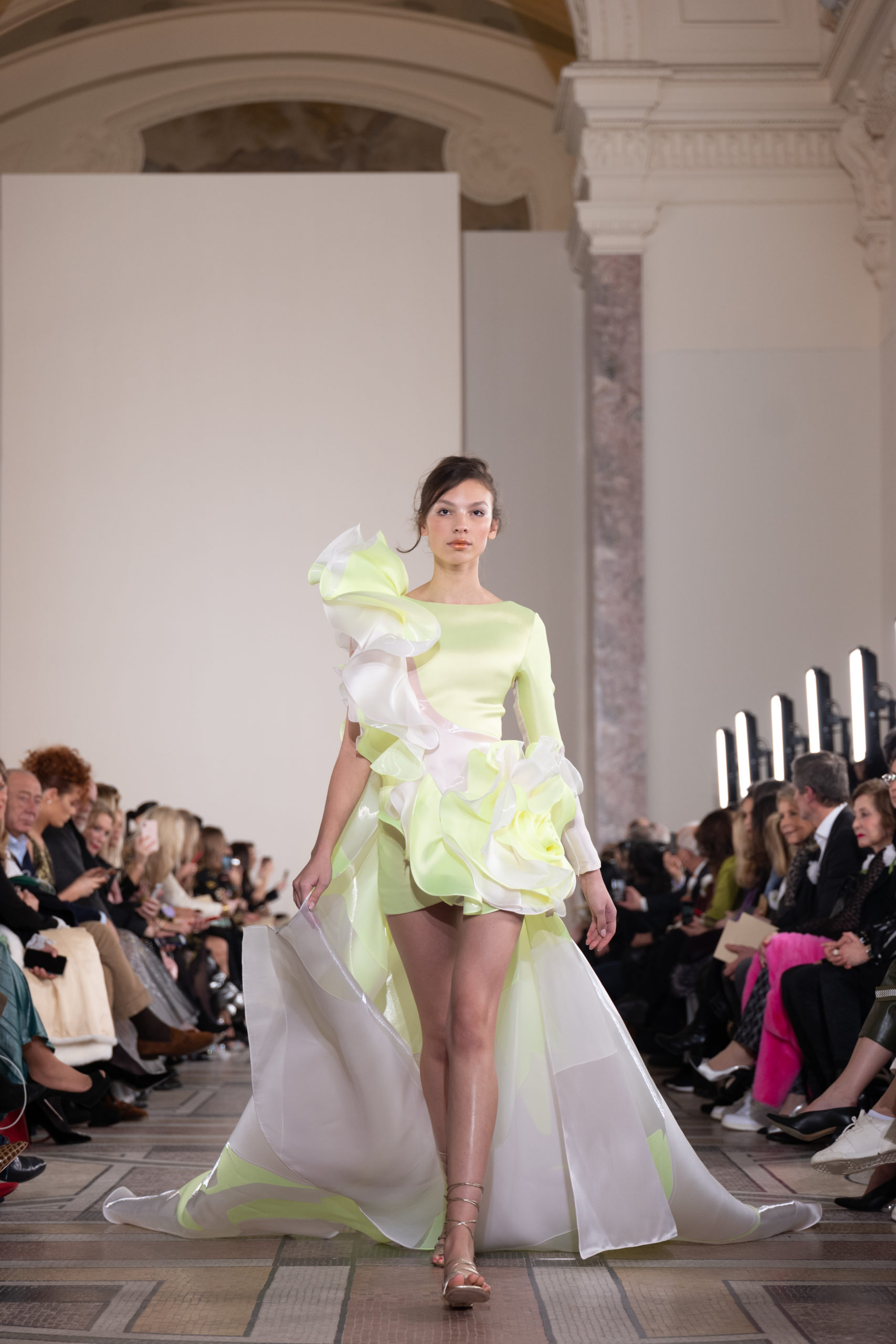 Celui-ci touche autant sa propre famille que toutes celles des membres de sa Maison et de ses ateliers, qui pour la première fois seront présents sur le podium à la fin du défilé. La rose blanche remise à chaque invité incarne ce soutien à un changement pacifique au Pays du Cèdre. Le motif floral cher à Georges Chakra est une trame qui parcourt également l’ensemble de la collection. Aux nombreuses silhouettes immaculées comme autant de pages vierges sur lesquelles écrire une nouvelle histoire répondent une petite robe entièrement réalisée en pétales ivoire, une tenue en tulle entièrement rebrodée de roses, une fleur généreuse posée sur une mini robe en satin duchesse rose fluorescent, comme ces roses peintes une à une à la main sur le gazar d’une longue robe fendue. Les voiles et les transparences nimbent la collection d’un raffinement vaporeux, contrastant avec un travail sophistiqué de volumes. D’un côté, la géométrie épurée d’une robe-boule, les broderies origami et des plissés mouchoirs quasi algorithmiques. De l’autre, les bustiers qui embrassent le corps, les dos qui se dévoilent, la fluidité des capes et des traînes, les volutes des étoffes éclaboussées de plumes, rebrodées à la main de paillettes et de sequins, la sensualité du crêpe et de l’organza plissé. Ce jeu de contraires dégage une énergie particulière, dopée par un jeu de tailles tour à tour ultra longues et extra courtes, convoquant un imaginaire de tapis rouge autant que les podiums disco des années 1970. Blanc, mais aussi rose éclatant ou poudré, aigue-marine, menthe à l’eau, bleu lagon, ciel ou glacier, iridescentes nacrées sur fond d’imprimé végétal… La palette de couleurs évoque une nature fantastique, entre forêt luxuriante et fantasme d’une île tropicale où le temps serait toujours au grand beau et où l’on récolterait des perles aux teintes indéfinissables. Les éclats d’or et d’argent viennent exalter la moire d’un tissu ou réveiller le mat précieux d’une étoffe. Mais cet Éden couture est pugnace, comme le rappellent les flammes dévorant une robe longue à encolure bateau et les souliers plus plats qu’à l’accoutumée, dont ces spartiates à la féminité combattive. Georges Chakra a souhaité aussi s’engager de manière concrète auprès des organisations qui lui tiennent à cœur. Scintillant au cou de la mariée, l’imposant collier en émeraudes et diamants spécialement réalisé par le joaillier Fawaz Gruosi sera mis en vente et une partie de cette vente sera reversée au profit du Children Cancer Hospital de Beyrouth et des bourses d’études de l’école Saint Vincent de Paul.