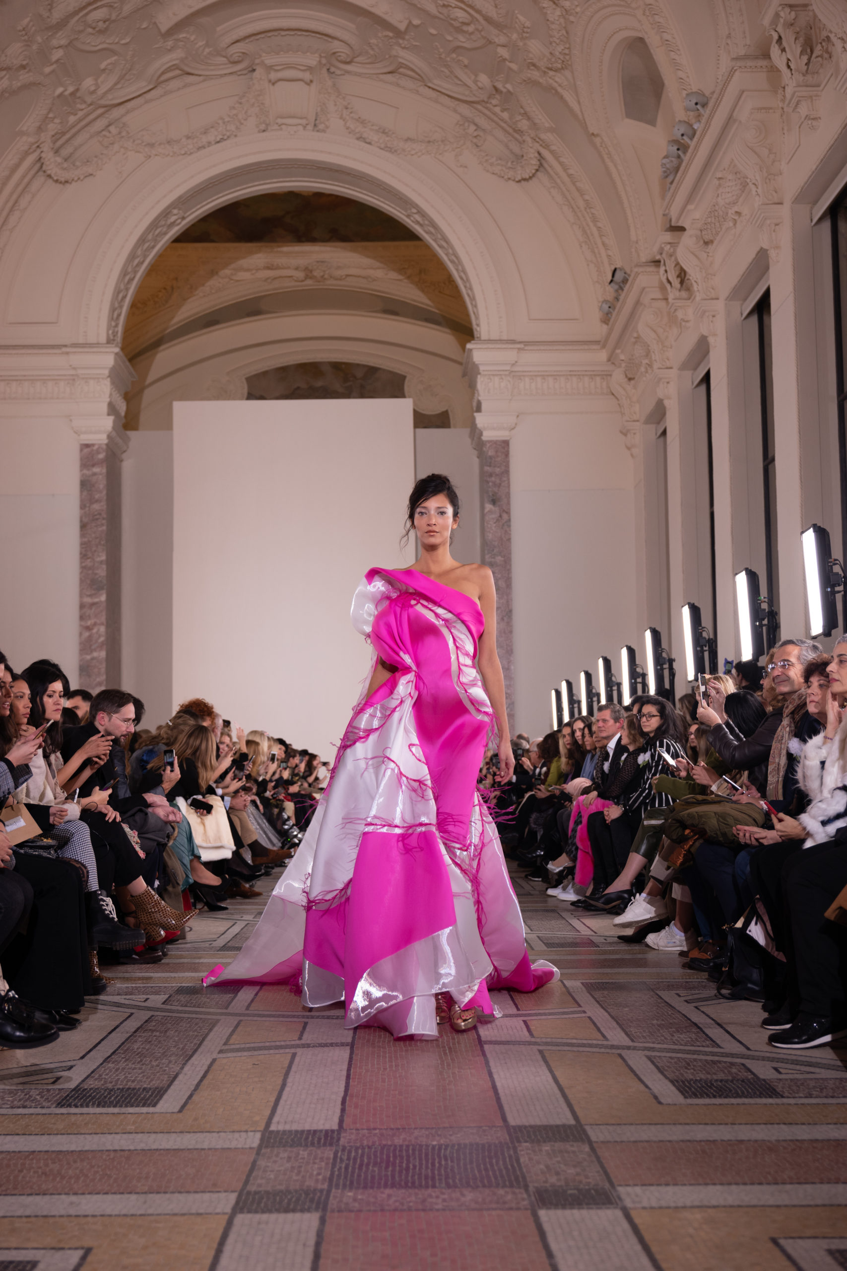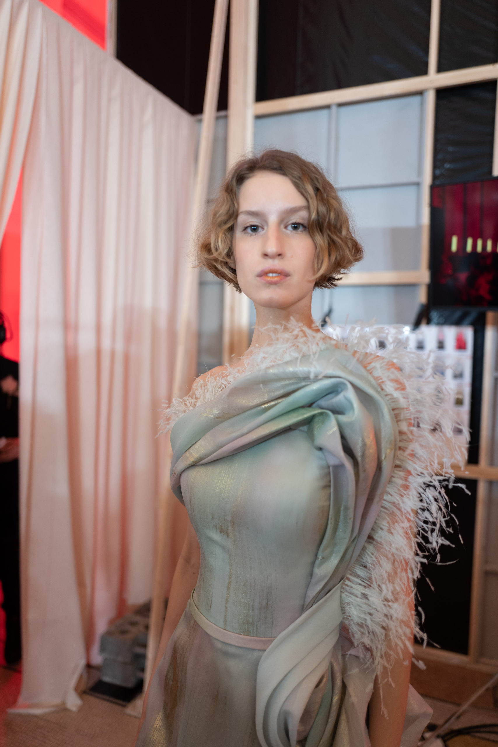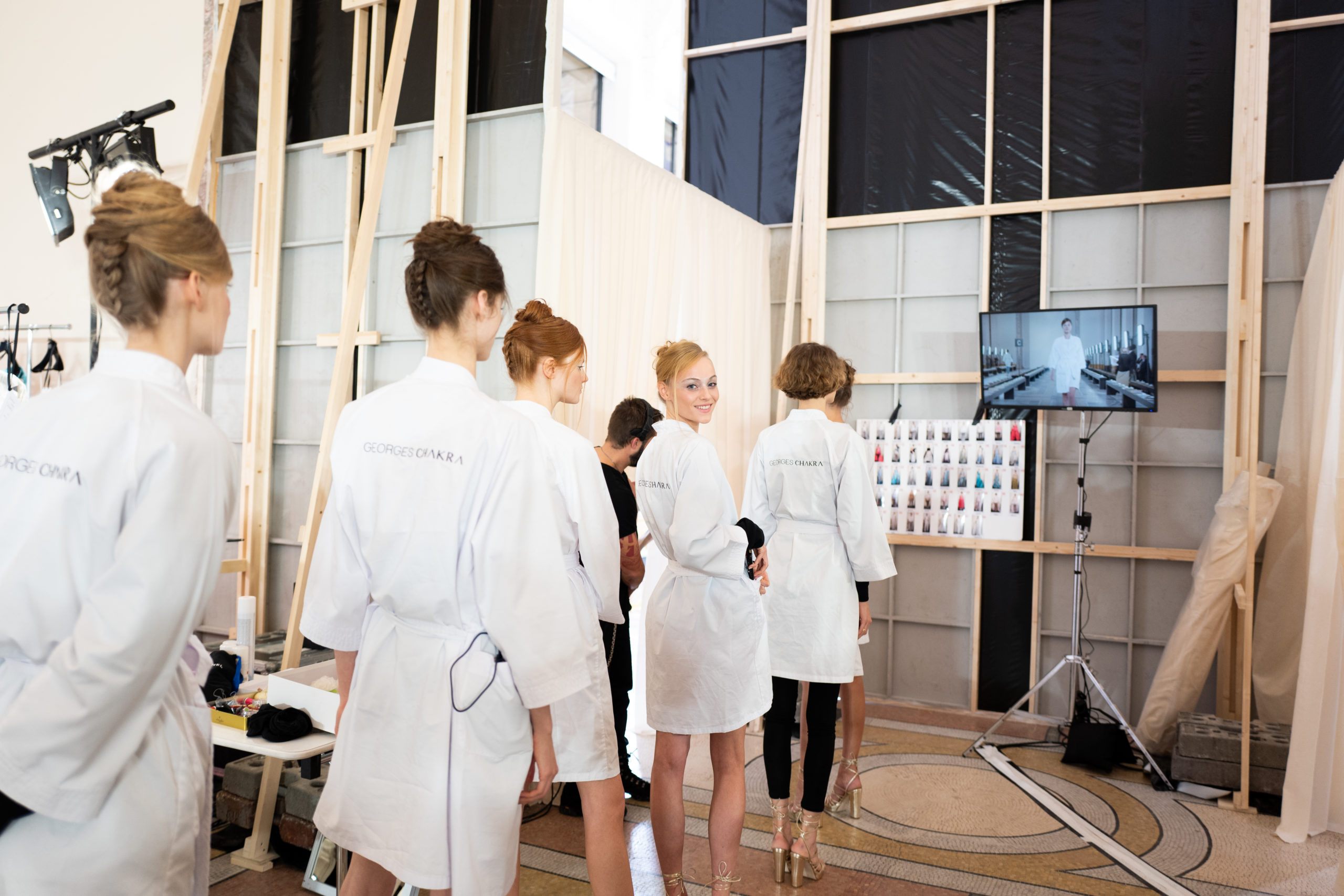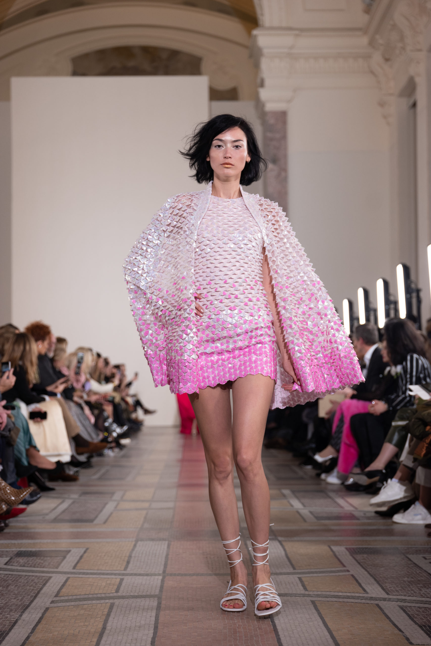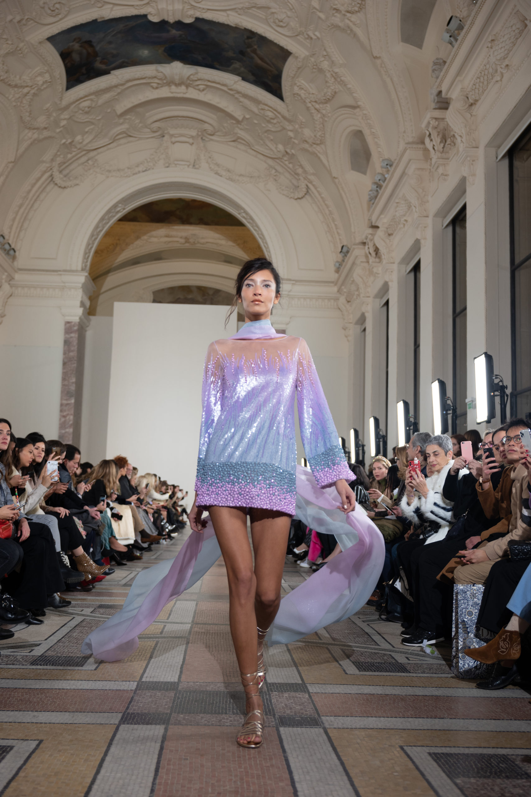 Celui-ci touche autant sa propre famille que toutes celles des membres de sa Maison et de ses ateliers, qui pour la première fois seront présents sur le podium à la fin du défilé. La rose blanche remise à chaque invité incarne ce soutien à un changement pacifique au Pays du Cèdre. Le motif floral cher à Georges Chakra est une trame qui parcourt également l’ensemble de la collection. Aux nombreuses silhouettes immaculées comme autant de pages vierges sur lesquelles écrire une nouvelle histoire répondent une petite robe entièrement réalisée en pétales ivoire, une tenue en tulle entièrement rebrodée de roses, une fleur généreuse posée sur une mini robe en satin duchesse rose fluorescent, comme ces roses peintes une à une à la main sur le gazar d’une longue robe fendue. Les voiles et les transparences nimbent la collection d’un raffinement vaporeux, contrastant avec un travail sophistiqué de volumes. D’un côté, la géométrie épurée d’une robe-boule, les broderies origami et des plissés mouchoirs quasi algorithmiques. De l’autre, les bustiers qui embrassent le corps, les dos qui se dévoilent, la fluidité des capes et des traînes, les volutes des étoffes éclaboussées de plumes, rebrodées à la main de paillettes et de sequins, la sensualité du crêpe et de l’organza plissé. Ce jeu de contraires dégage une énergie particulière, dopée par un jeu de tailles tour à tour ultra longues et extra courtes, convoquant un imaginaire de tapis rouge autant que les podiums disco des années 1970. Blanc, mais aussi rose éclatant ou poudré, aigue-marine, menthe à l’eau, bleu lagon, ciel ou glacier, iridescentes nacrées sur fond d’imprimé végétal… La palette de couleurs évoque une nature fantastique, entre forêt luxuriante et fantasme d’une île tropicale où le temps serait toujours au grand beau et où l’on récolterait des perles aux teintes indéfinissables. Les éclats d’or et d’argent viennent exalter la moire d’un tissu ou réveiller le mat précieux d’une étoffe. Mais cet Éden couture est pugnace, comme le rappellent les flammes dévorant une robe longue à encolure bateau et les souliers plus plats qu’à l’accoutumée, dont ces spartiates à la féminité combattive. Georges Chakra a souhaité aussi s’engager de manière concrète auprès des organisations qui lui tiennent à cœur. Scintillant au cou de la mariée, l’imposant collier en émeraudes et diamants spécialement réalisé par le joaillier Fawaz Gruosi sera mis en vente et une partie de cette vente sera reversée au profit du Children Cancer Hospital de Beyrouth et des bourses d’études de l’école Saint Vincent de Paul.
