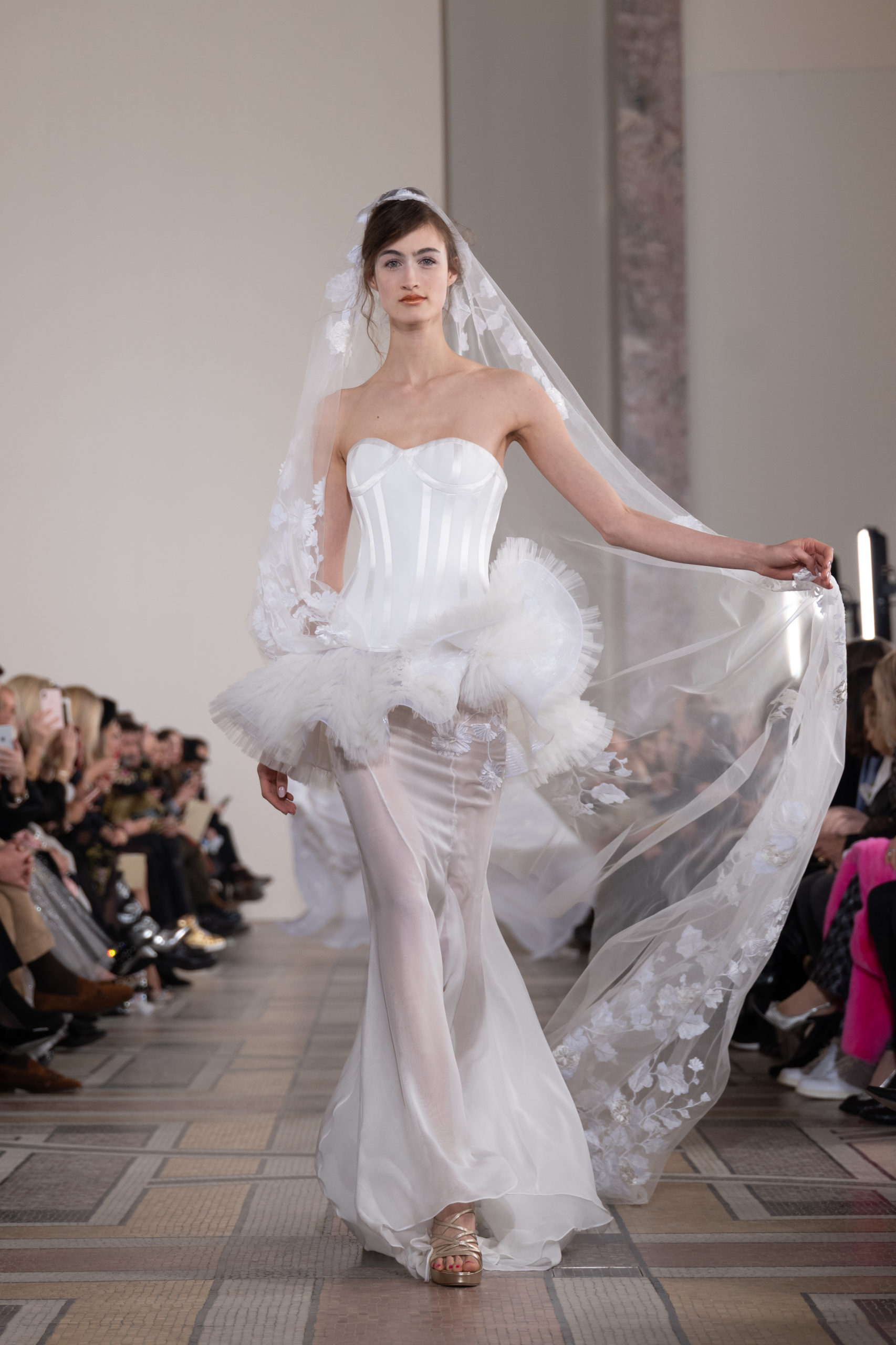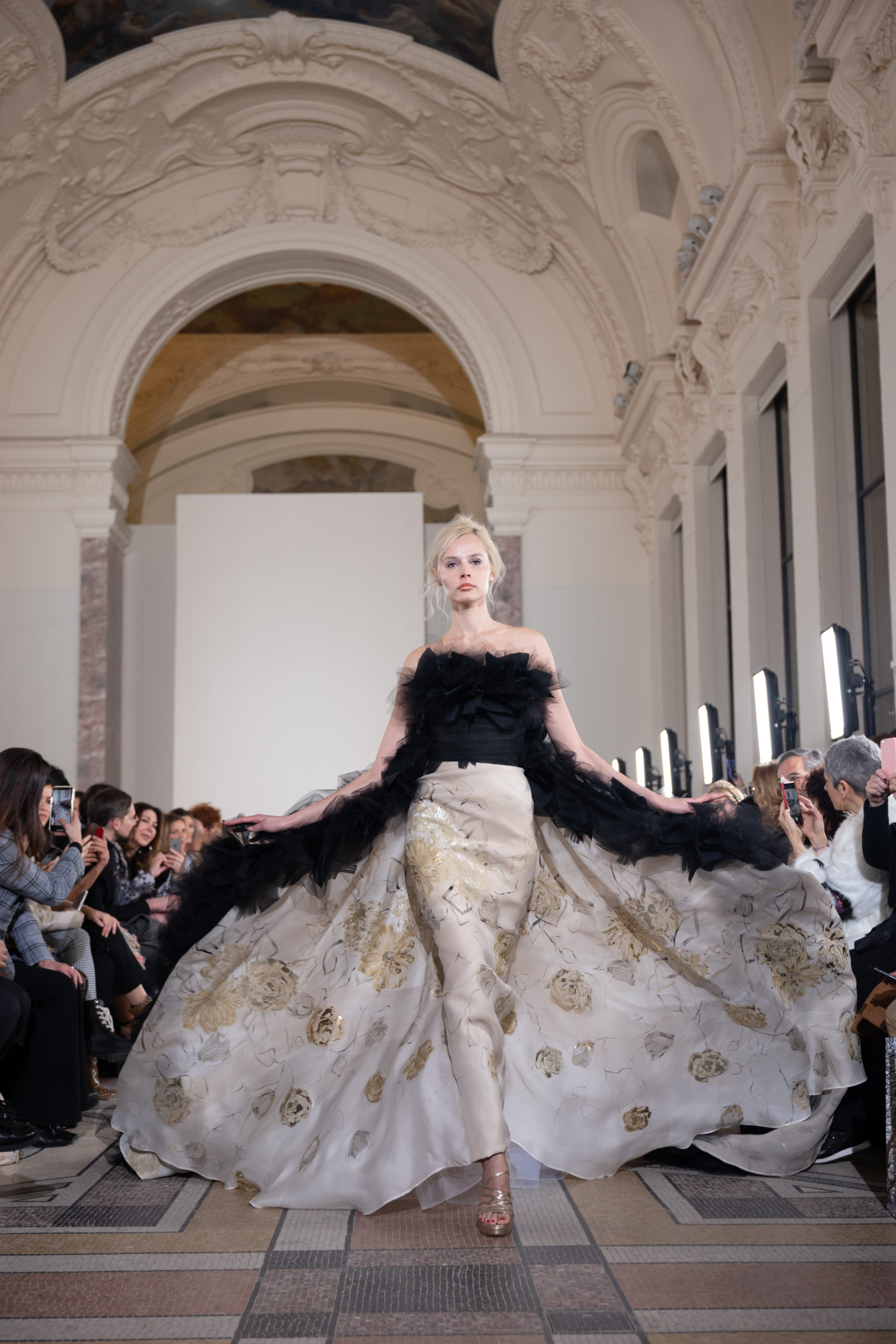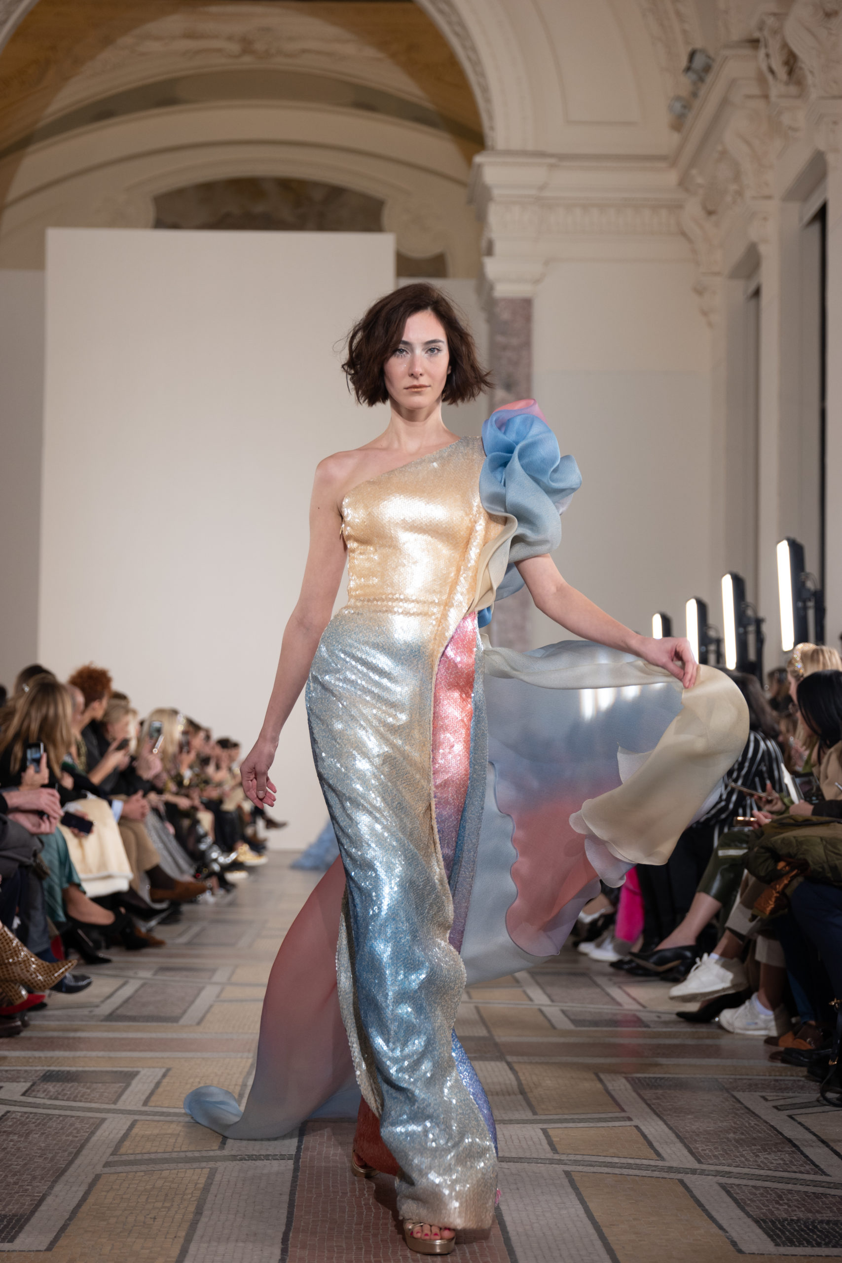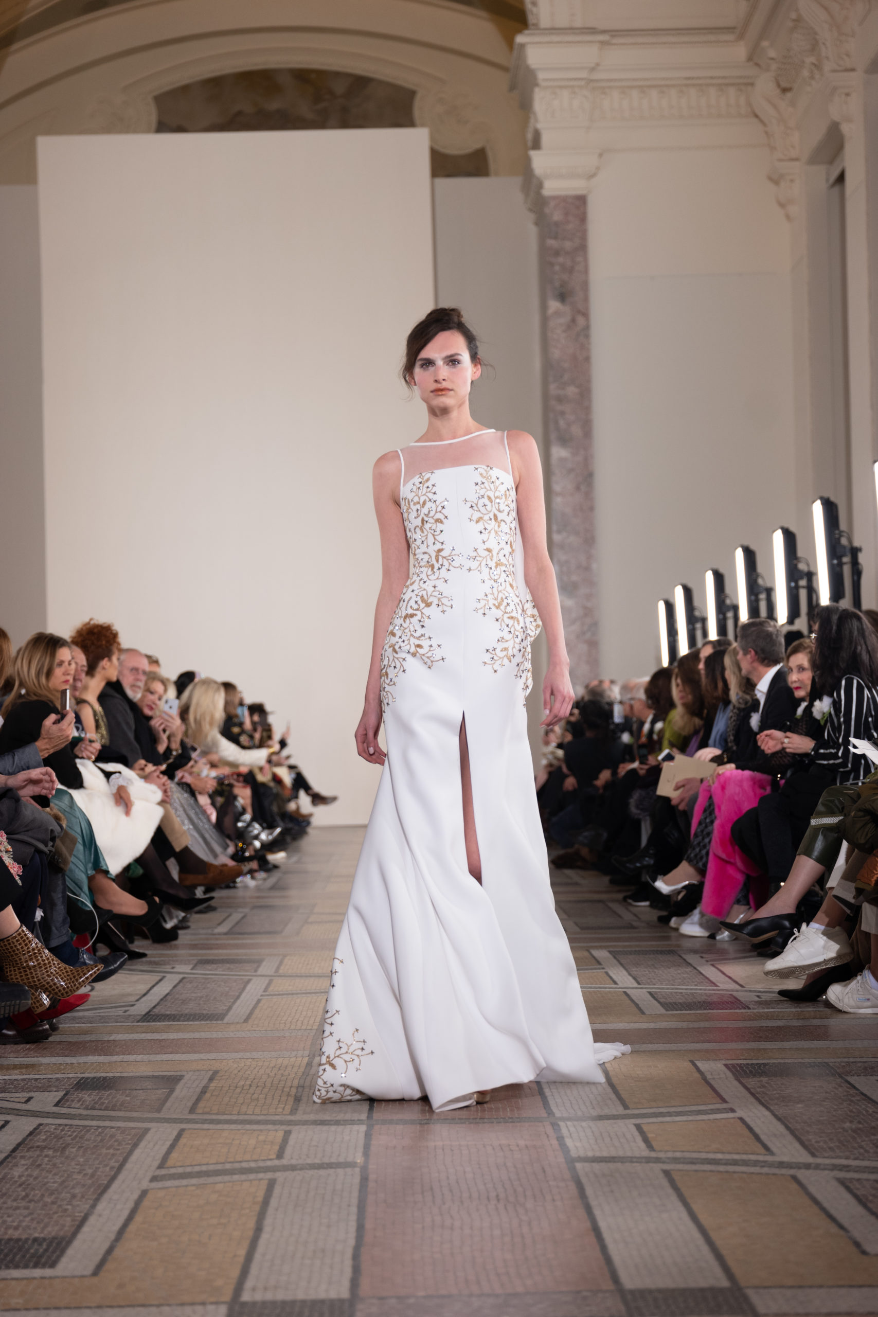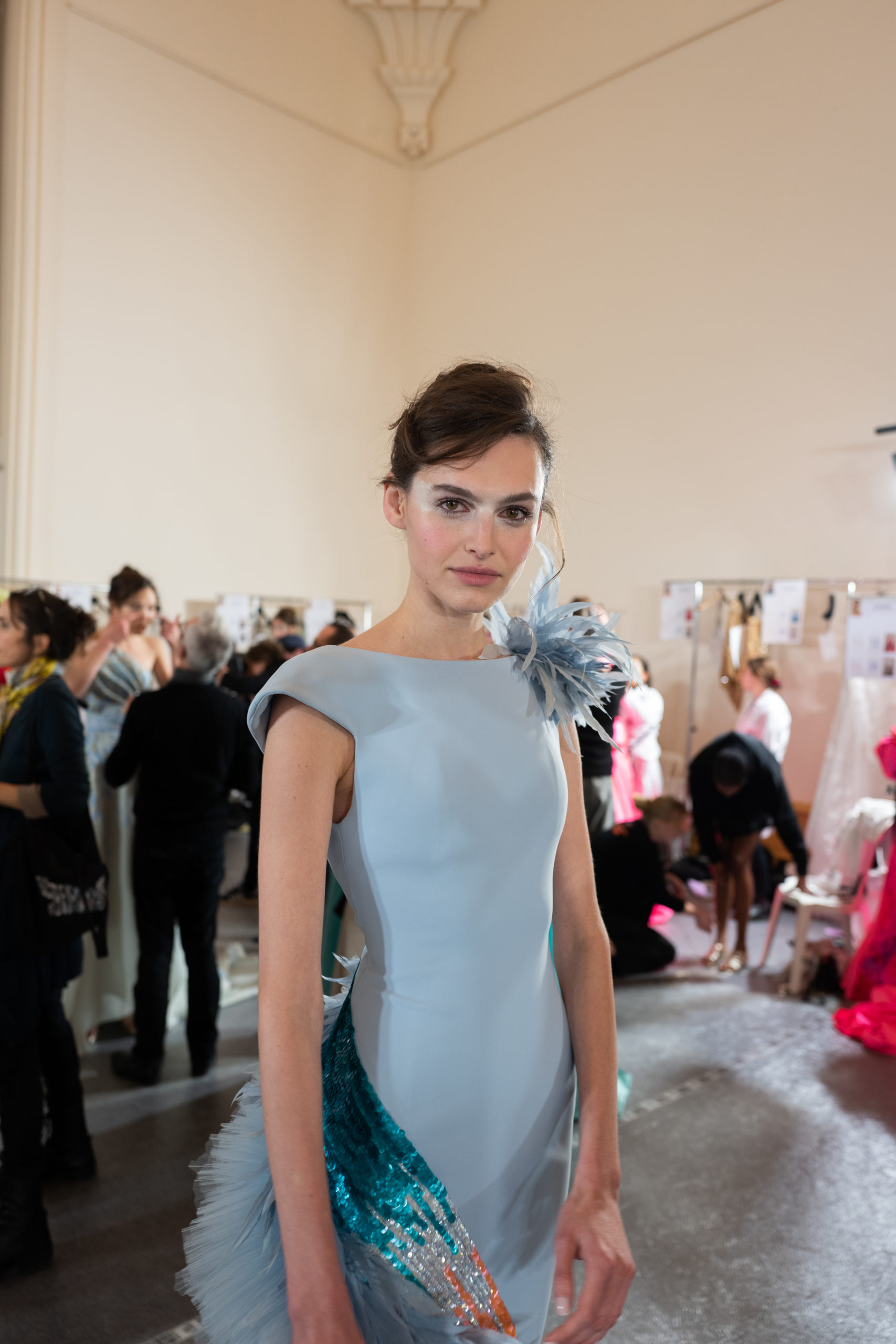 Celui-ci touche autant sa propre famille que toutes celles des membres de sa Maison et de ses ateliers, qui pour la première fois seront présents sur le podium à la fin du défilé. La rose blanche remise à chaque invité incarne ce soutien à un changement pacifique au Pays du Cèdre. Le motif floral cher à Georges Chakra est une trame qui parcourt également l’ensemble de la collection. Aux nombreuses silhouettes immaculées comme autant de pages vierges sur lesquelles écrire une nouvelle histoire répondent une petite robe entièrement réalisée en pétales ivoire, une tenue en tulle entièrement rebrodée de roses, une fleur généreuse posée sur une mini robe en satin duchesse rose fluorescent, comme ces roses peintes une à une à la main sur le gazar d’une longue robe fendue. Les voiles et les transparences nimbent la collection d’un raffinement vaporeux, contrastant avec un travail sophistiqué de volumes. D’un côté, la géométrie épurée d’une robe-boule, les broderies origami et des plissés mouchoirs quasi algorithmiques. De l’autre, les bustiers qui embrassent le corps, les dos qui se dévoilent, la fluidité des capes et des traînes, les volutes des étoffes éclaboussées de plumes, rebrodées à la main de paillettes et de sequins, la sensualité du crêpe et de l’organza plissé. Ce jeu de contraires dégage une énergie particulière, dopée par un jeu de tailles tour à tour ultra longues et extra courtes, convoquant un imaginaire de tapis rouge autant que les podiums disco des années 1970. Blanc, mais aussi rose éclatant ou poudré, aigue-marine, menthe à l’eau, bleu lagon, ciel ou glacier, iridescentes nacrées sur fond d’imprimé végétal… La palette de couleurs évoque une nature fantastique, entre forêt luxuriante et fantasme d’une île tropicale où le temps serait toujours au grand beau et où l’on récolterait des perles aux teintes indéfinissables. Les éclats d’or et d’argent viennent exalter la moire d’un tissu ou réveiller le mat précieux d’une étoffe. Mais cet Éden couture est pugnace, comme le rappellent les flammes dévorant une robe longue à encolure bateau et les souliers plus plats qu’à l’accoutumée, dont ces spartiates à la féminité combattive. Georges Chakra a souhaité aussi s’engager de manière concrète auprès des organisations qui lui tiennent à cœur. Scintillant au cou de la mariée, l’imposant collier en émeraudes et diamants spécialement réalisé par le joaillier Fawaz Gruosi sera mis en vente et une partie de cette vente sera reversée au profit du Children Cancer Hospital de Beyrouth et des bourses d’études de l’école Saint Vincent de Paul.