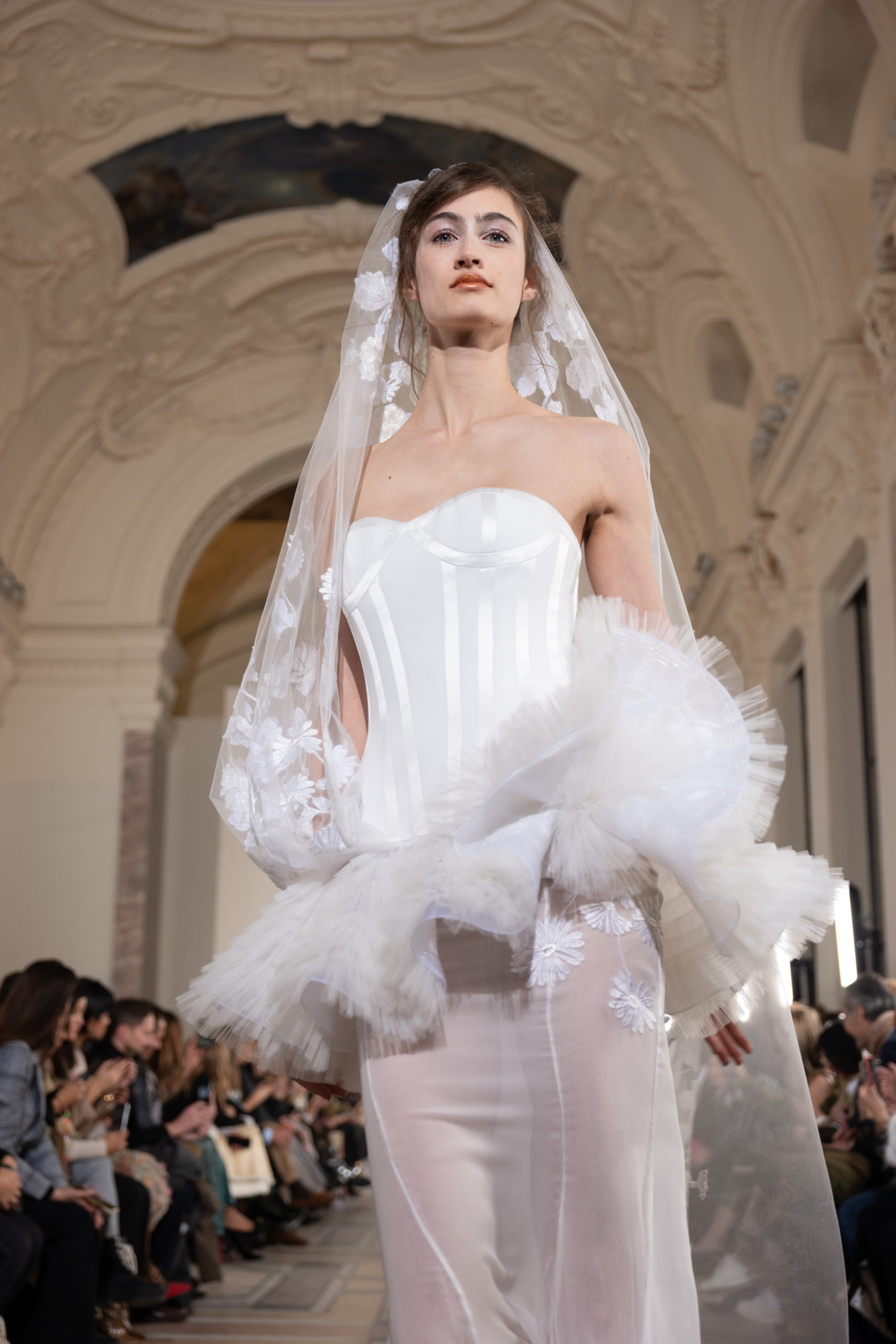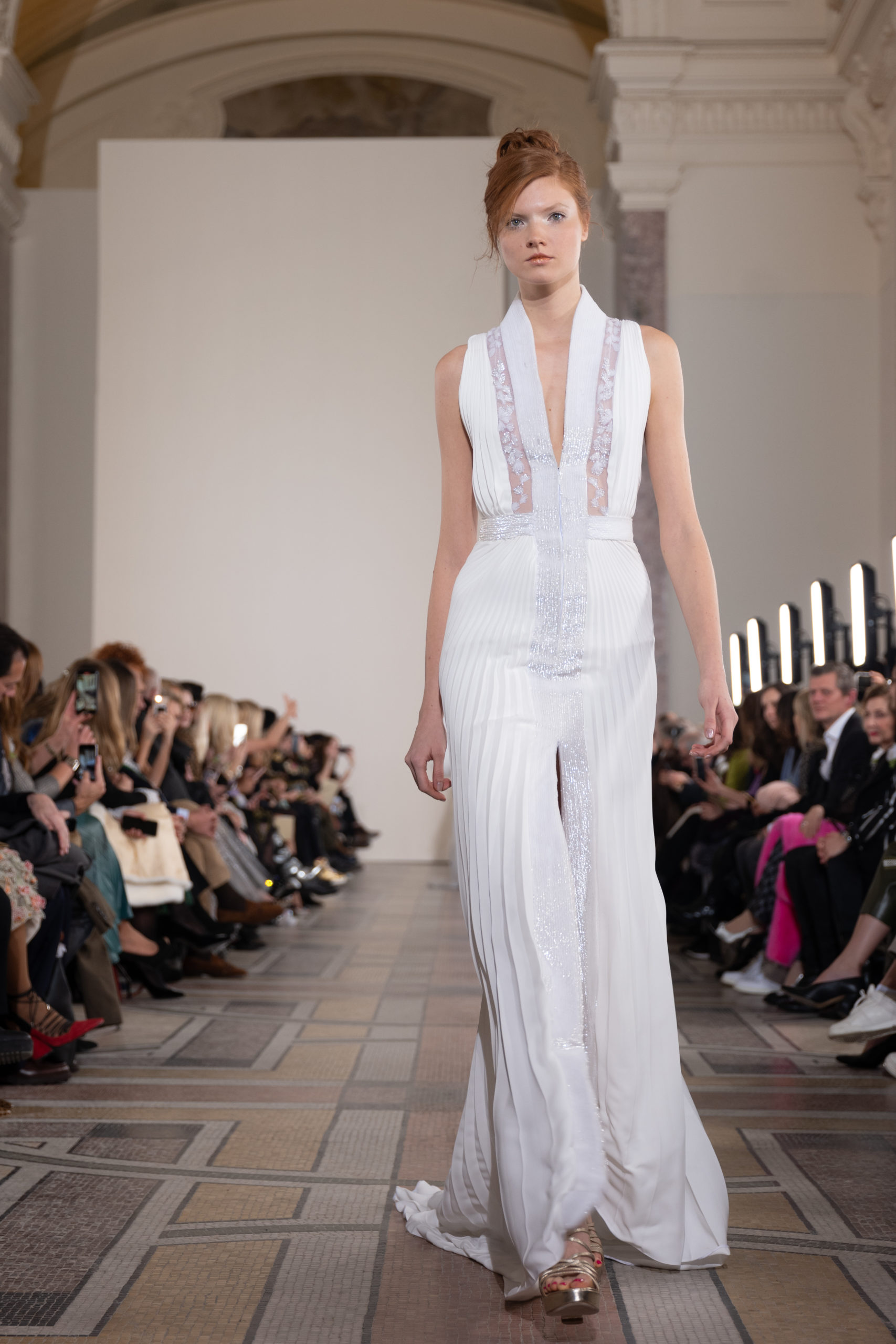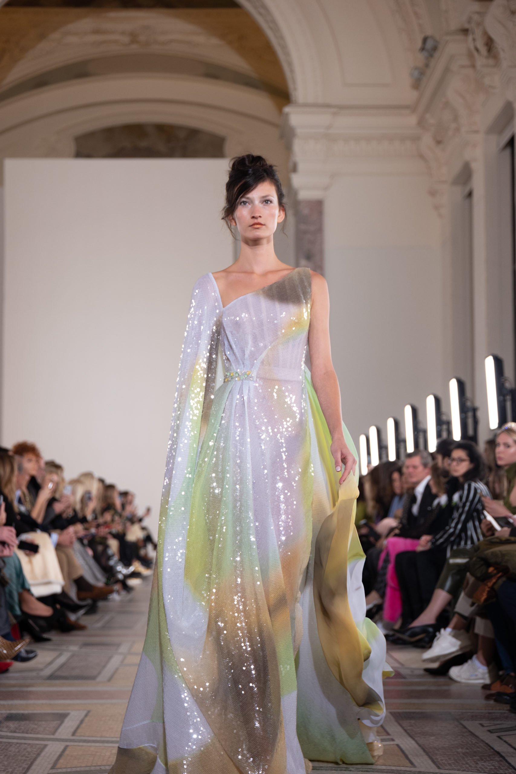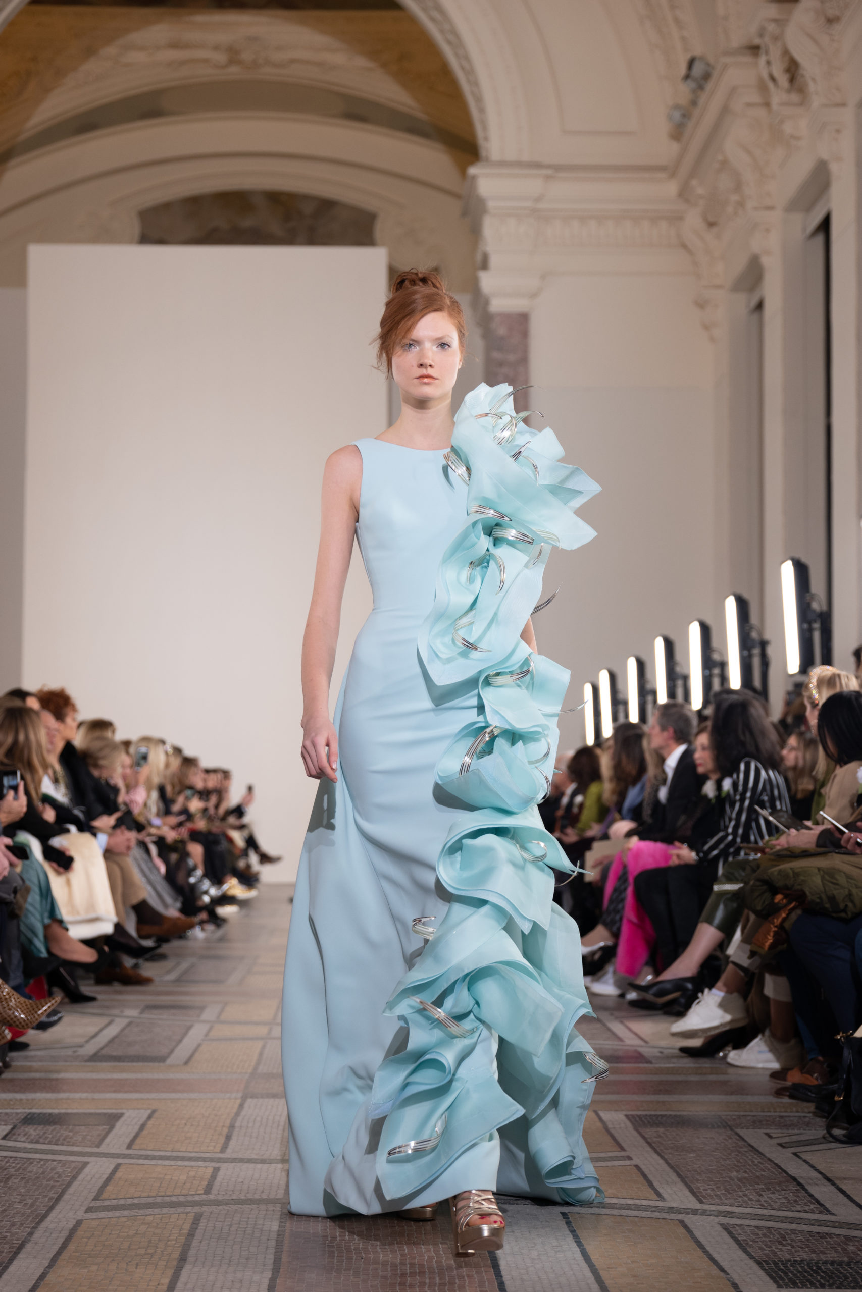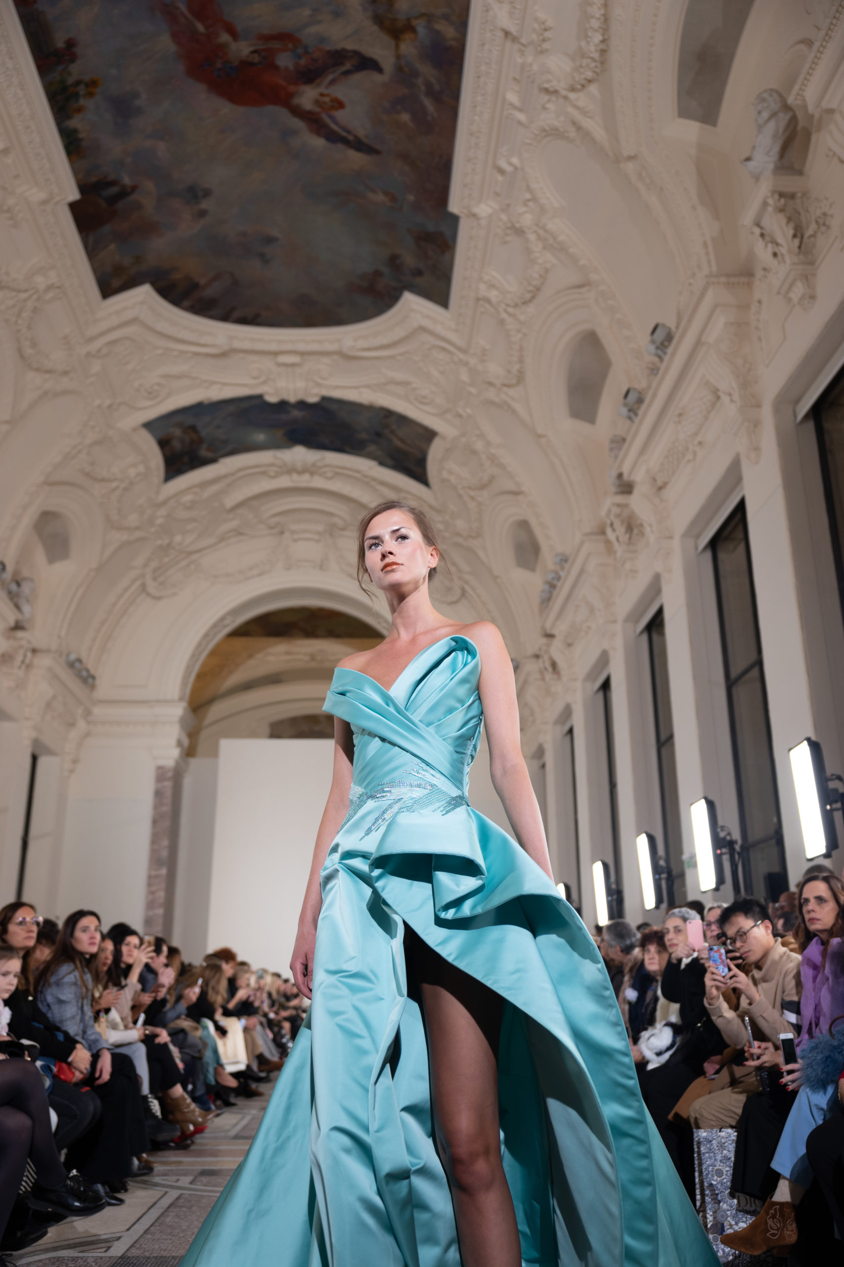 Celui-ci touche autant sa propre famille que toutes celles des membres de sa Maison et de ses ateliers, qui pour la première fois seront présents sur le podium à la fin du défilé. La rose blanche remise à chaque invité incarne ce soutien à un changement pacifique au Pays du Cèdre. Le motif floral cher à Georges Chakra est une trame qui parcourt également l’ensemble de la collection. Aux nombreuses silhouettes immaculées comme autant de pages vierges sur lesquelles écrire une nouvelle histoire répondent une petite robe entièrement réalisée en pétales ivoire, une tenue en tulle entièrement rebrodée de roses, une fleur généreuse posée sur une mini robe en satin duchesse rose fluorescent, comme ces roses peintes une à une à la main sur le gazar d’une longue robe fendue. Les voiles et les transparences nimbent la collection d’un raffinement vaporeux, contrastant avec un travail sophistiqué de volumes. D’un côté, la géométrie épurée d’une robe-boule, les broderies origami et des plissés mouchoirs quasi algorithmiques. De l’autre, les bustiers qui embrassent le corps, les dos qui se dévoilent, la fluidité des capes et des traînes, les volutes des étoffes éclaboussées de plumes, rebrodées à la main de paillettes et de sequins, la sensualité du crêpe et de l’organza plissé. Ce jeu de contraires dégage une énergie particulière, dopée par un jeu de tailles tour à tour ultra longues et extra courtes, convoquant un imaginaire de tapis rouge autant que les podiums disco des années 1970. Blanc, mais aussi rose éclatant ou poudré, aigue-marine, menthe à l’eau, bleu lagon, ciel ou glacier, iridescentes nacrées sur fond d’imprimé végétal… La palette de couleurs évoque une nature fantastique, entre forêt luxuriante et fantasme d’une île tropicale où le temps serait toujours au grand beau et où l’on récolterait des perles aux teintes indéfinissables. Les éclats d’or et d’argent viennent exalter la moire d’un tissu ou réveiller le mat précieux d’une étoffe. Mais cet Éden couture est pugnace, comme le rappellent les flammes dévorant une robe longue à encolure bateau et les souliers plus plats qu’à l’accoutumée, dont ces spartiates à la féminité combattive. Georges Chakra a souhaité aussi s’engager de manière concrète auprès des organisations qui lui tiennent à cœur. Scintillant au cou de la mariée, l’imposant collier en émeraudes et diamants spécialement réalisé par le joaillier Fawaz Gruosi sera mis en vente et une partie de cette vente sera reversée au profit du Children Cancer Hospital de Beyrouth et des bourses d’études de l’école Saint Vincent de Paul.