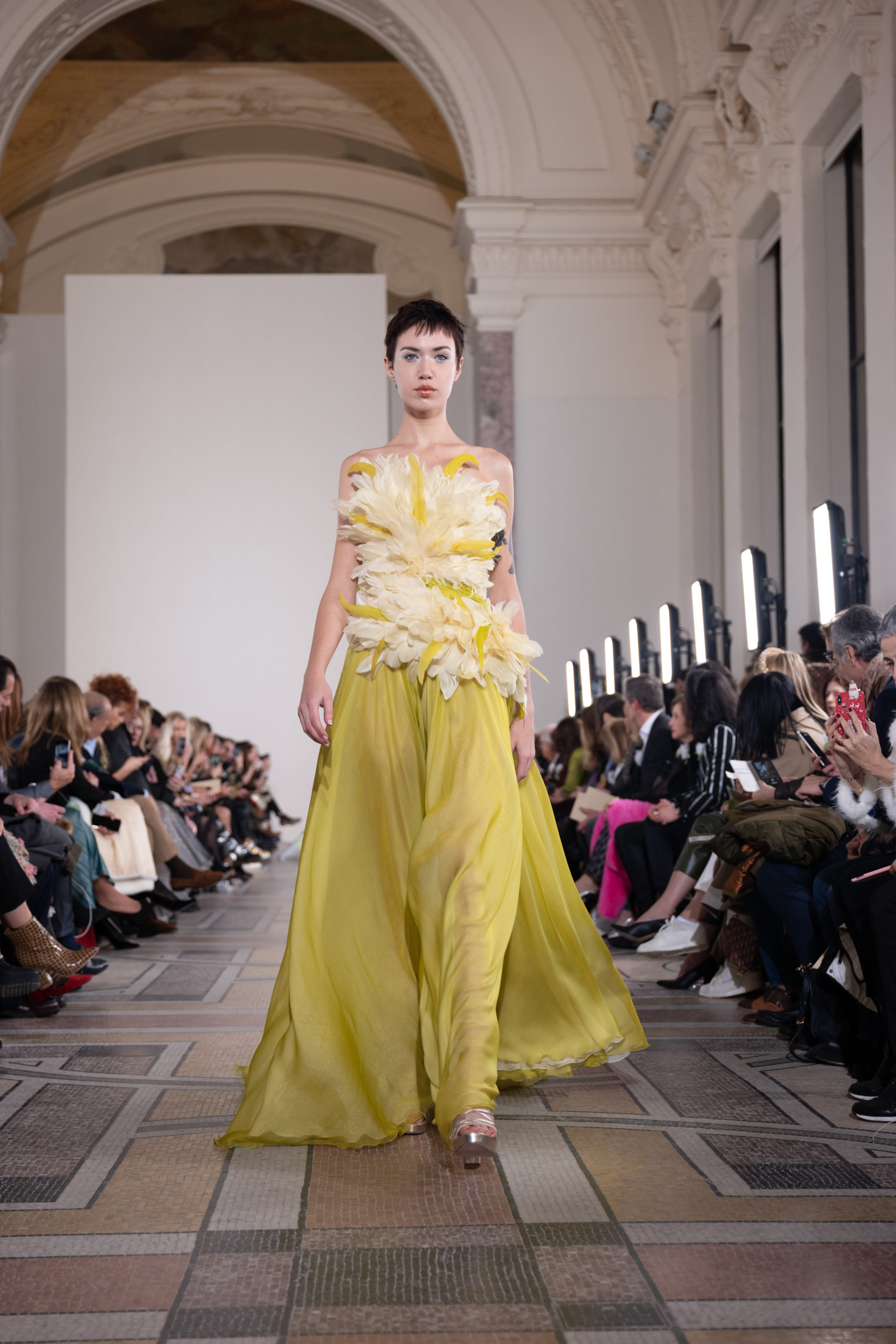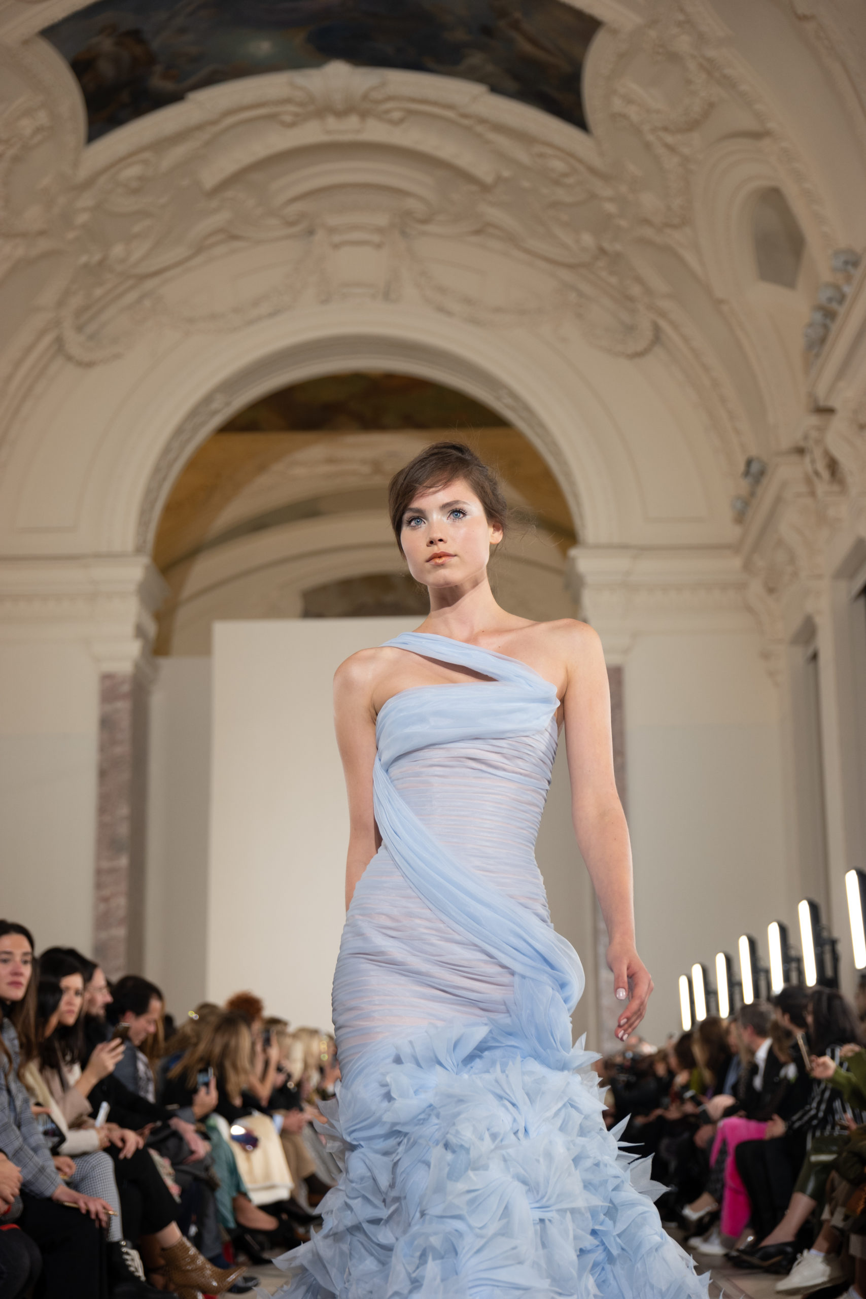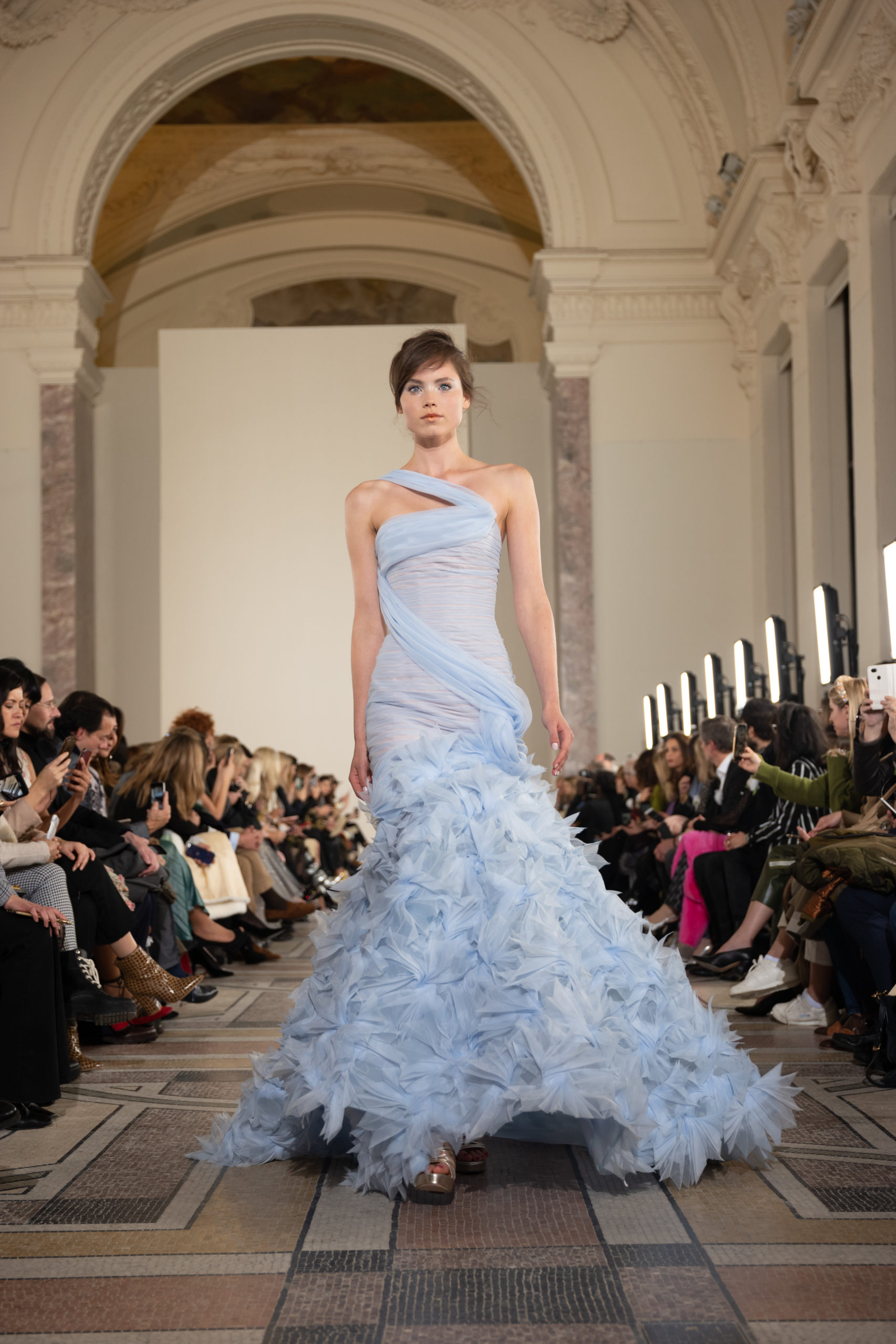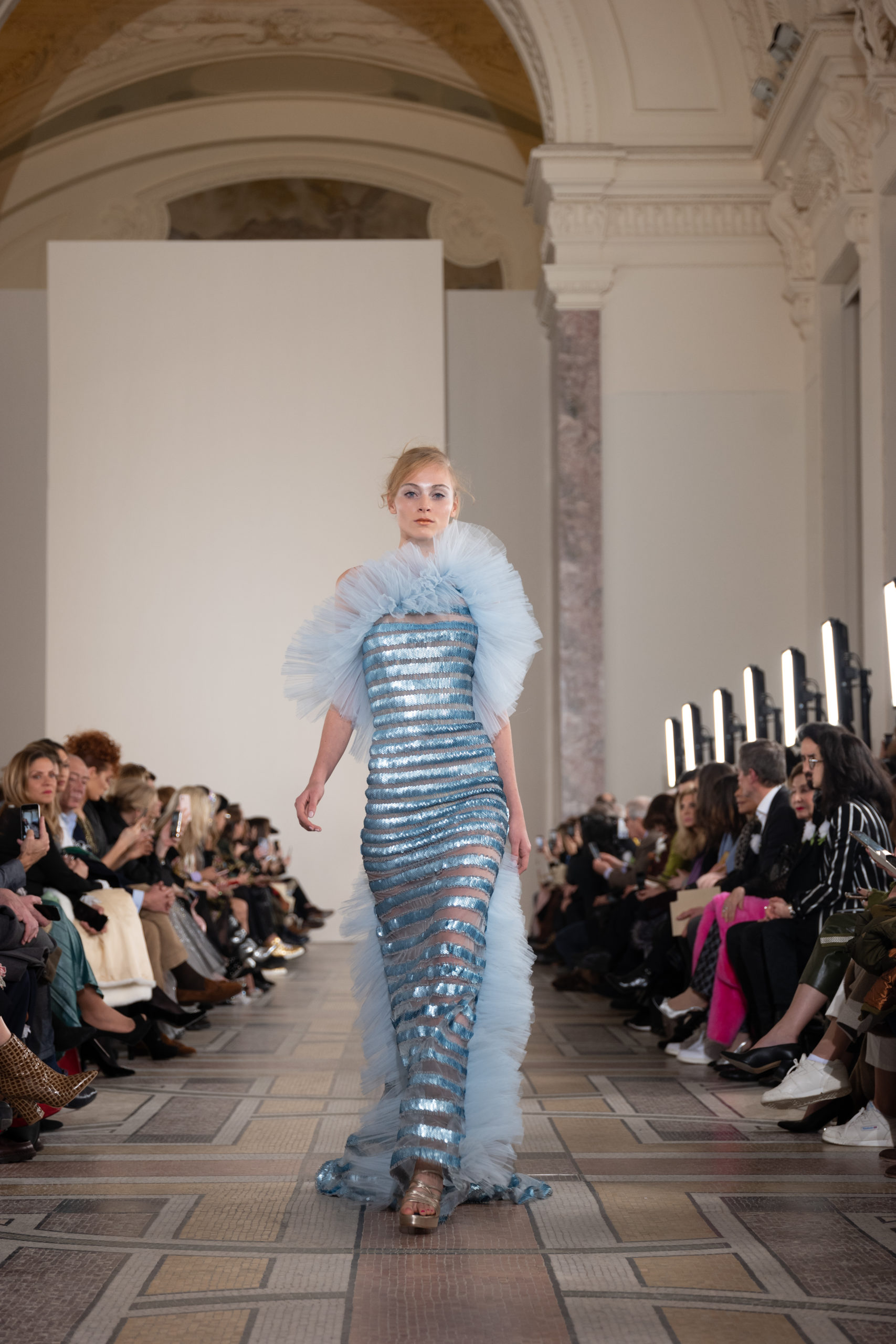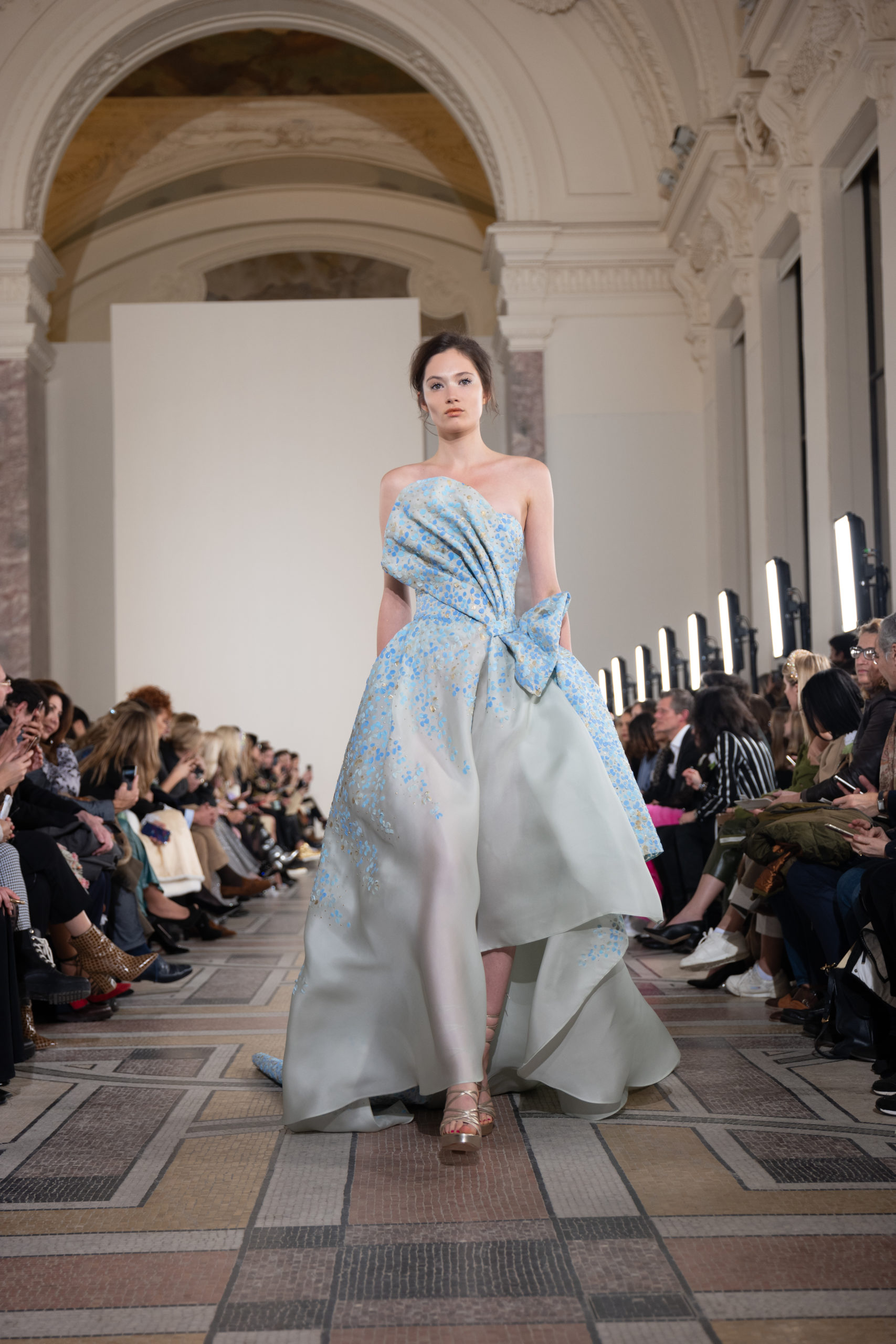 Celui-ci touche autant sa propre famille que toutes celles des membres de sa Maison et de ses ateliers, qui pour la première fois seront présents sur le podium à la fin du défilé. La rose blanche remise à chaque invité incarne ce soutien à un changement pacifique au Pays du Cèdre. Le motif floral cher à Georges Chakra est une trame qui parcourt également l’ensemble de la collection. Aux nombreuses silhouettes immaculées comme autant de pages vierges sur lesquelles écrire une nouvelle histoire répondent une petite robe entièrement réalisée en pétales ivoire, une tenue en tulle entièrement rebrodée de roses, une fleur généreuse posée sur une mini robe en satin duchesse rose fluorescent, comme ces roses peintes une à une à la main sur le gazar d’une longue robe fendue. Les voiles et les transparences nimbent la collection d’un raffinement vaporeux, contrastant avec un travail sophistiqué de volumes. D’un côté, la géométrie épurée d’une robe-boule, les broderies origami et des plissés mouchoirs quasi algorithmiques. De l’autre, les bustiers qui embrassent le corps, les dos qui se dévoilent, la fluidité des capes et des traînes, les volutes des étoffes éclaboussées de plumes, rebrodées à la main de paillettes et de sequins, la sensualité du crêpe et de l’organza plissé. Ce jeu de contraires dégage une énergie particulière, dopée par un jeu de tailles tour à tour ultra longues et extra courtes, convoquant un imaginaire de tapis rouge autant que les podiums disco des années 1970. Blanc, mais aussi rose éclatant ou poudré, aigue-marine, menthe à l’eau, bleu lagon, ciel ou glacier, iridescentes nacrées sur fond d’imprimé végétal… La palette de couleurs évoque une nature fantastique, entre forêt luxuriante et fantasme d’une île tropicale où le temps serait toujours au grand beau et où l’on récolterait des perles aux teintes indéfinissables. Les éclats d’or et d’argent viennent exalter la moire d’un tissu ou réveiller le mat précieux d’une étoffe. Mais cet Éden couture est pugnace, comme le rappellent les flammes dévorant une robe longue à encolure bateau et les souliers plus plats qu’à l’accoutumée, dont ces spartiates à la féminité combattive. Georges Chakra a souhaité aussi s’engager de manière concrète auprès des organisations qui lui tiennent à cœur. Scintillant au cou de la mariée, l’imposant collier en émeraudes et diamants spécialement réalisé par le joaillier Fawaz Gruosi sera mis en vente et une partie de cette vente sera reversée au profit du Children Cancer Hospital de Beyrouth et des bourses d’études de l’école Saint Vincent de Paul.