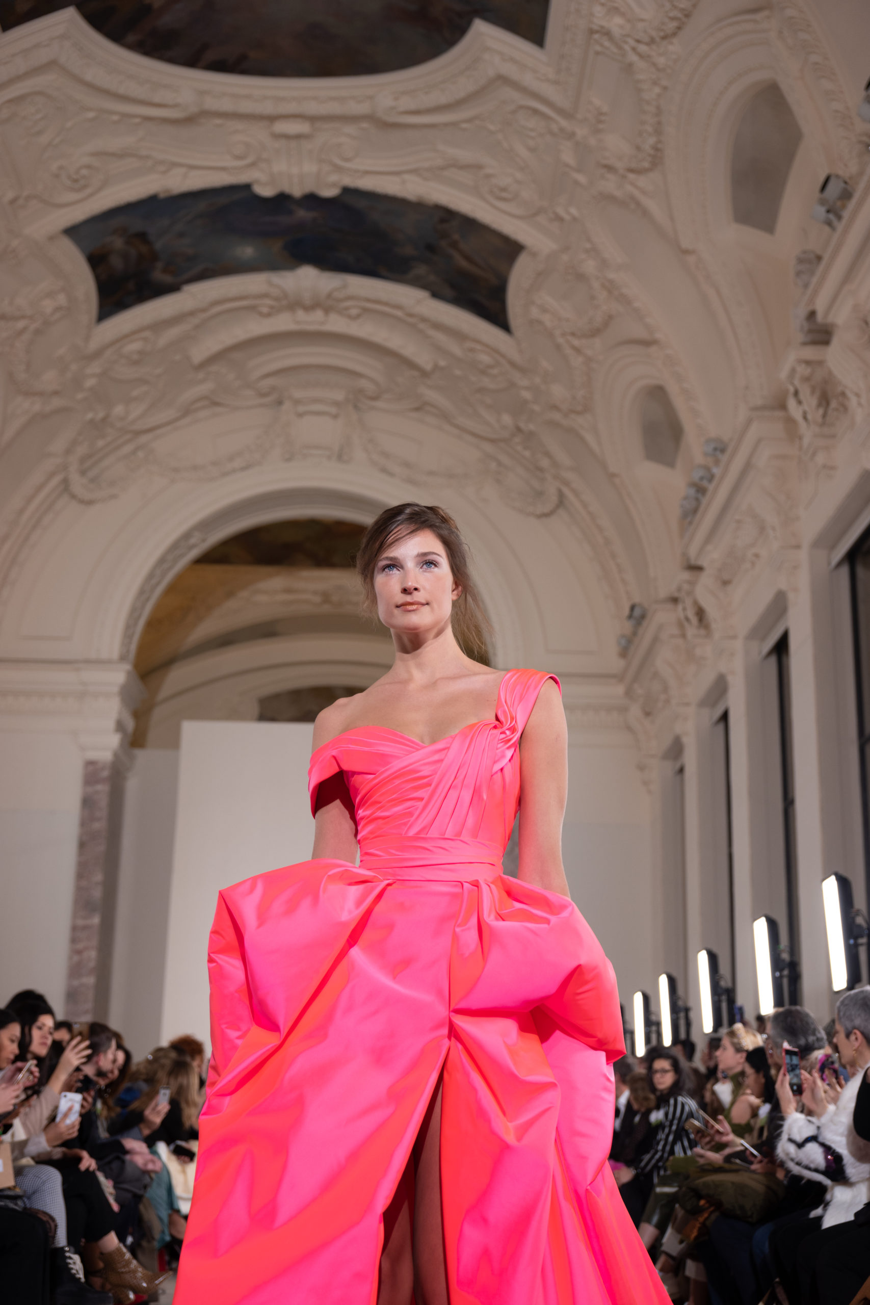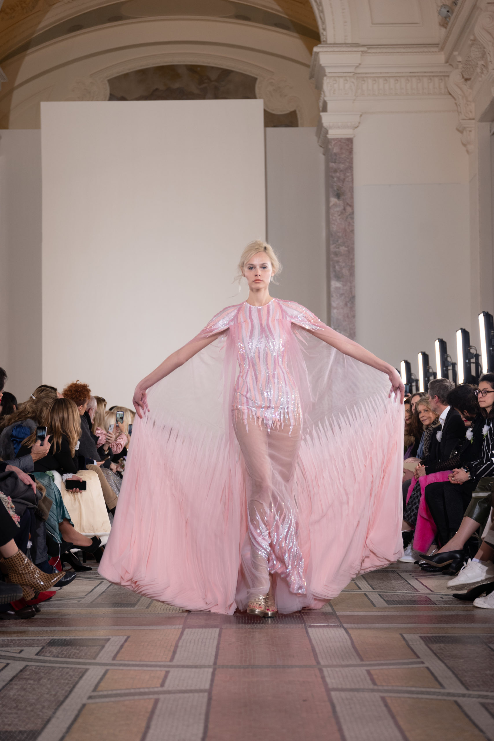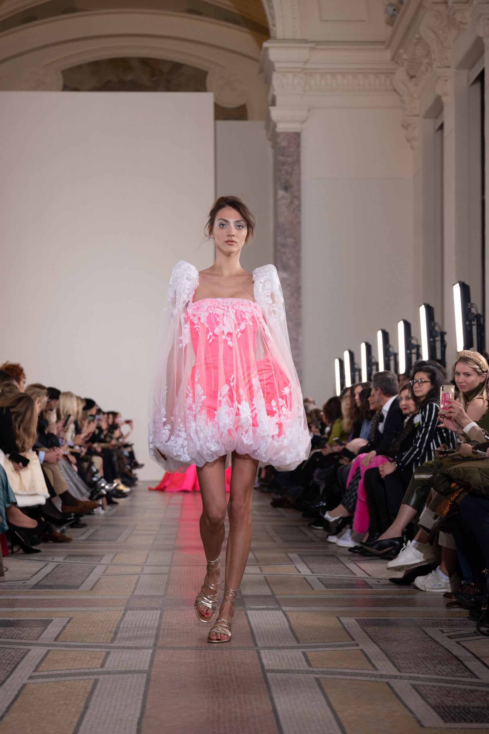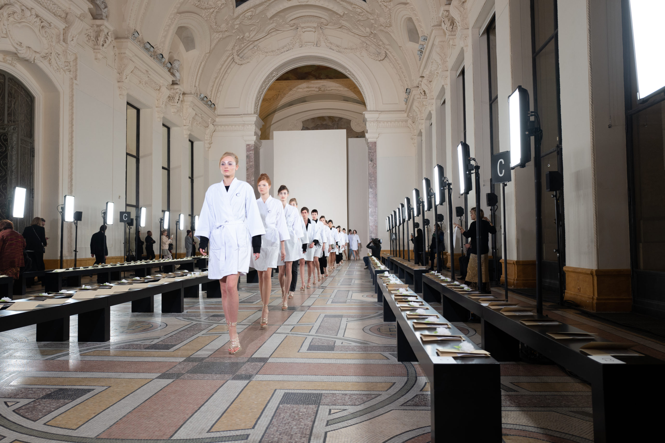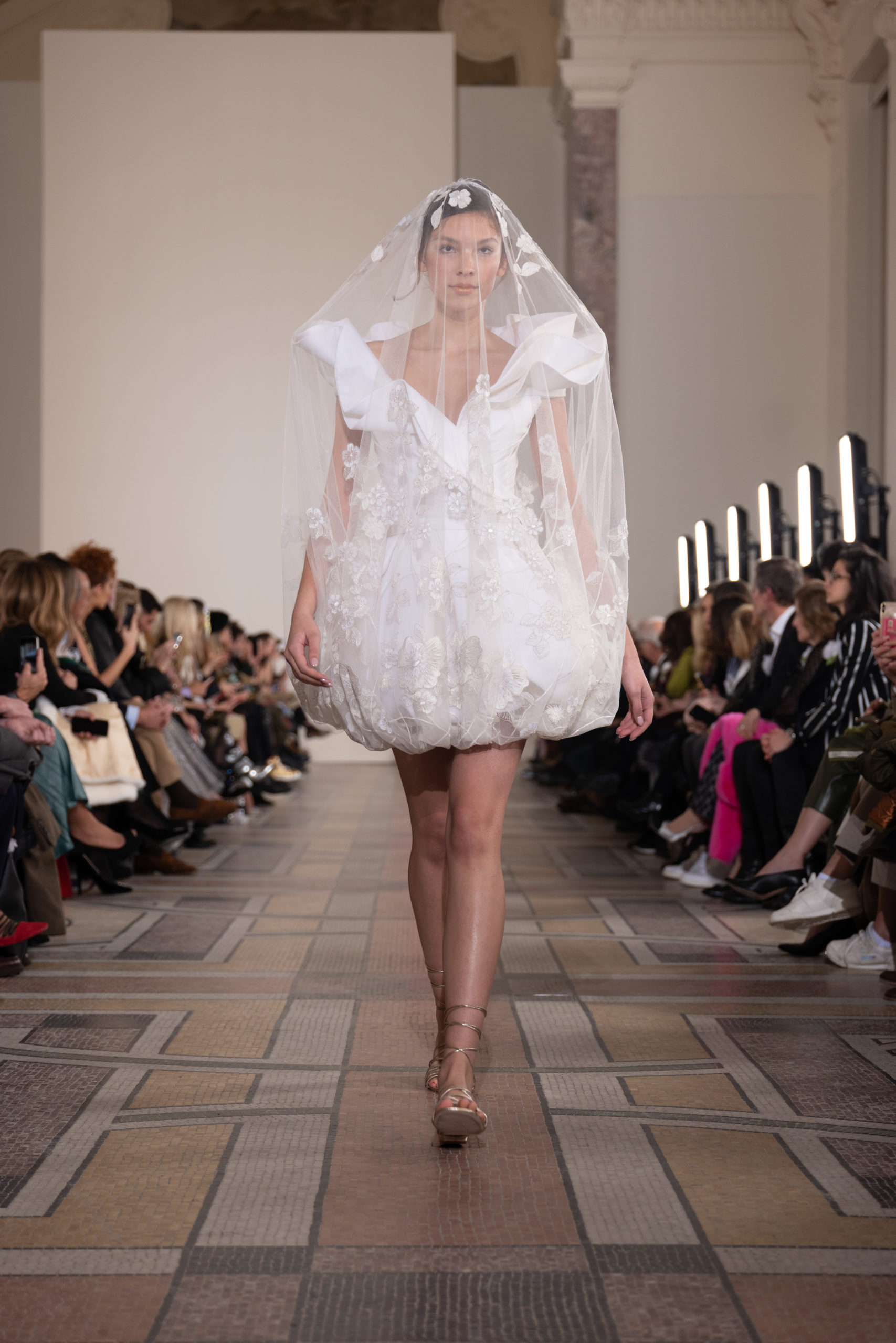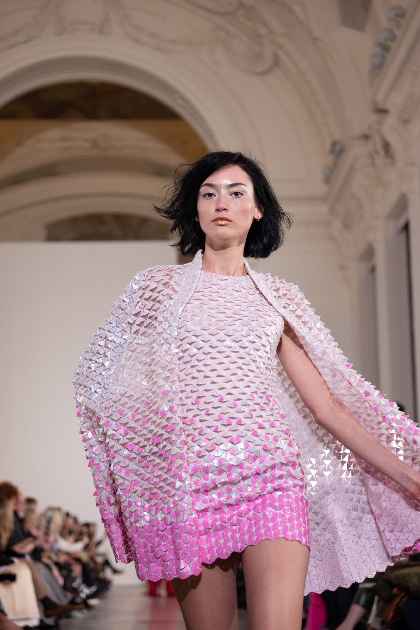 Celui-ci touche autant sa propre famille que toutes celles des membres de sa Maison et de ses ateliers, qui pour la première fois seront présents sur le podium à la fin du défilé. La rose blanche remise à chaque invité incarne ce soutien à un changement pacifique au Pays du Cèdre. Le motif floral cher à Georges Chakra est une trame qui parcourt également l’ensemble de la collection. Aux nombreuses silhouettes immaculées comme autant de pages vierges sur lesquelles écrire une nouvelle histoire répondent une petite robe entièrement réalisée en pétales ivoire, une tenue en tulle entièrement rebrodée de roses, une fleur généreuse posée sur une mini robe en satin duchesse rose fluorescent, comme ces roses peintes une à une à la main sur le gazar d’une longue robe fendue. Les voiles et les transparences nimbent la collection d’un raffinement vaporeux, contrastant avec un travail sophistiqué de volumes. D’un côté, la géométrie épurée d’une robe-boule, les broderies origami et des plissés mouchoirs quasi algorithmiques. De l’autre, les bustiers qui embrassent le corps, les dos qui se dévoilent, la fluidité des capes et des traînes, les volutes des étoffes éclaboussées de plumes, rebrodées à la main de paillettes et de sequins, la sensualité du crêpe et de l’organza plissé. Ce jeu de contraires dégage une énergie particulière, dopée par un jeu de tailles tour à tour ultra longues et extra courtes, convoquant un imaginaire de tapis rouge autant que les podiums disco des années 1970. Blanc, mais aussi rose éclatant ou poudré, aigue-marine, menthe à l’eau, bleu lagon, ciel ou glacier, iridescentes nacrées sur fond d’imprimé végétal… La palette de couleurs évoque une nature fantastique, entre forêt luxuriante et fantasme d’une île tropicale où le temps serait toujours au grand beau et où l’on récolterait des perles aux teintes indéfinissables. Les éclats d’or et d’argent viennent exalter la moire d’un tissu ou réveiller le mat précieux d’une étoffe. Mais cet Éden couture est pugnace, comme le rappellent les flammes dévorant une robe longue à encolure bateau et les souliers plus plats qu’à l’accoutumée, dont ces spartiates à la féminité combattive. Georges Chakra a souhaité aussi s’engager de manière concrète auprès des organisations qui lui tiennent à cœur. Scintillant au cou de la mariée, l’imposant collier en émeraudes et diamants spécialement réalisé par le joaillier Fawaz Gruosi sera mis en vente et une partie de cette vente sera reversée au profit du Children Cancer Hospital de Beyrouth et des bourses d’études de l’école Saint Vincent de Paul.