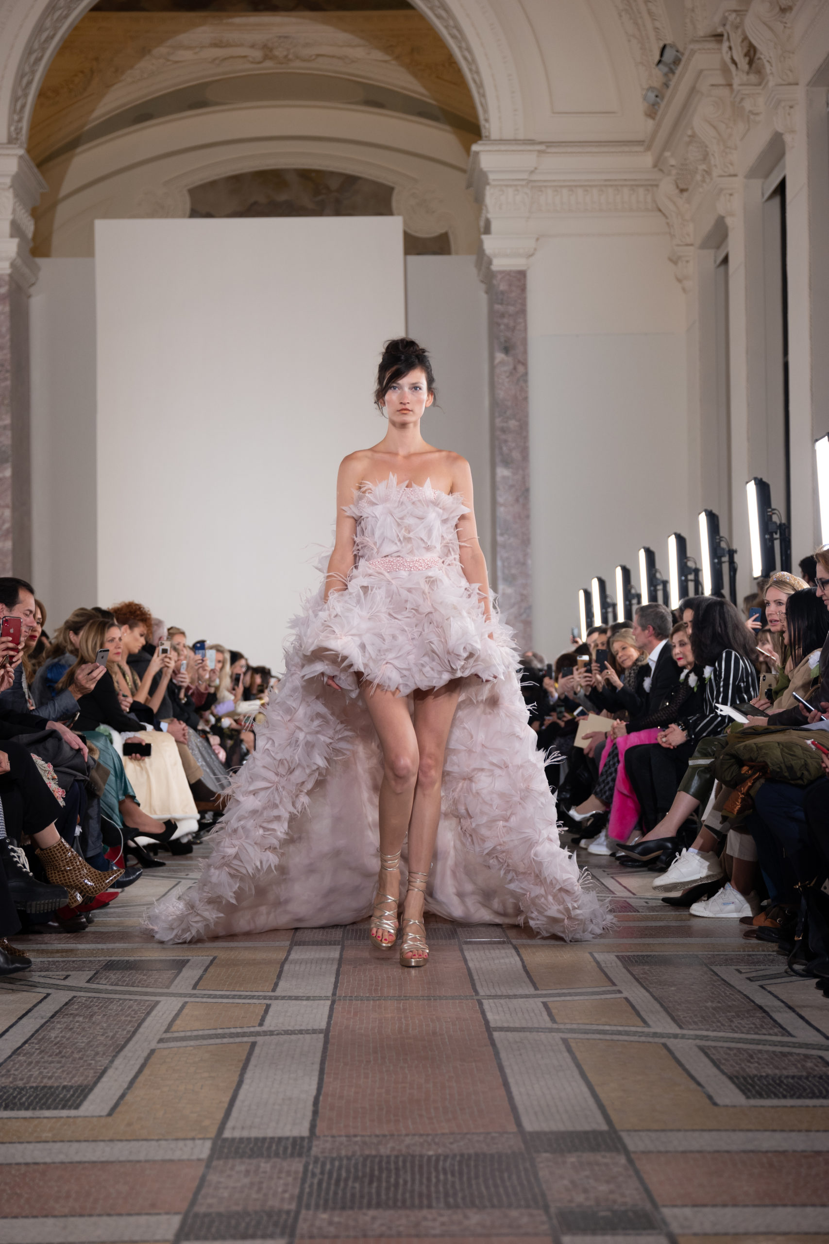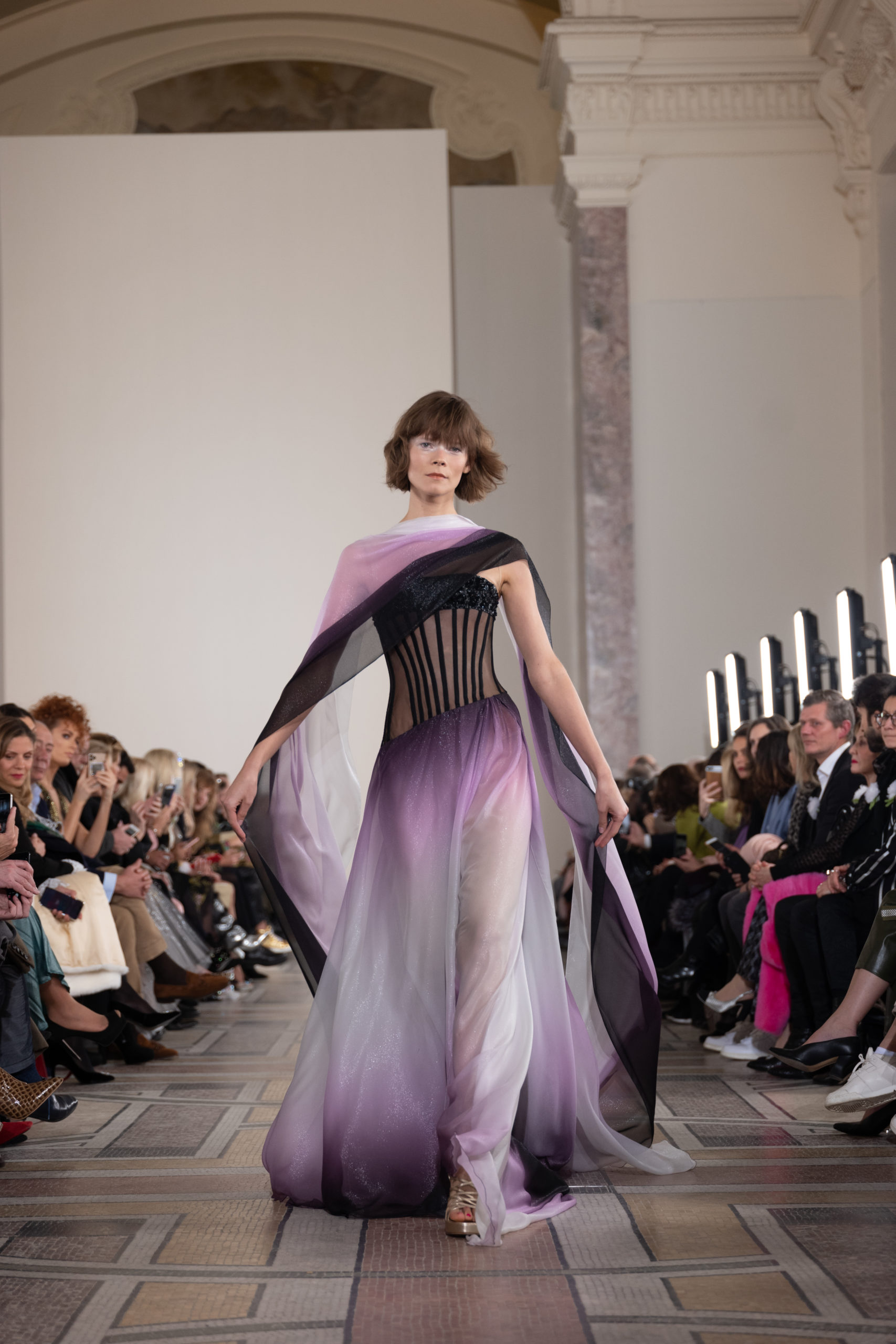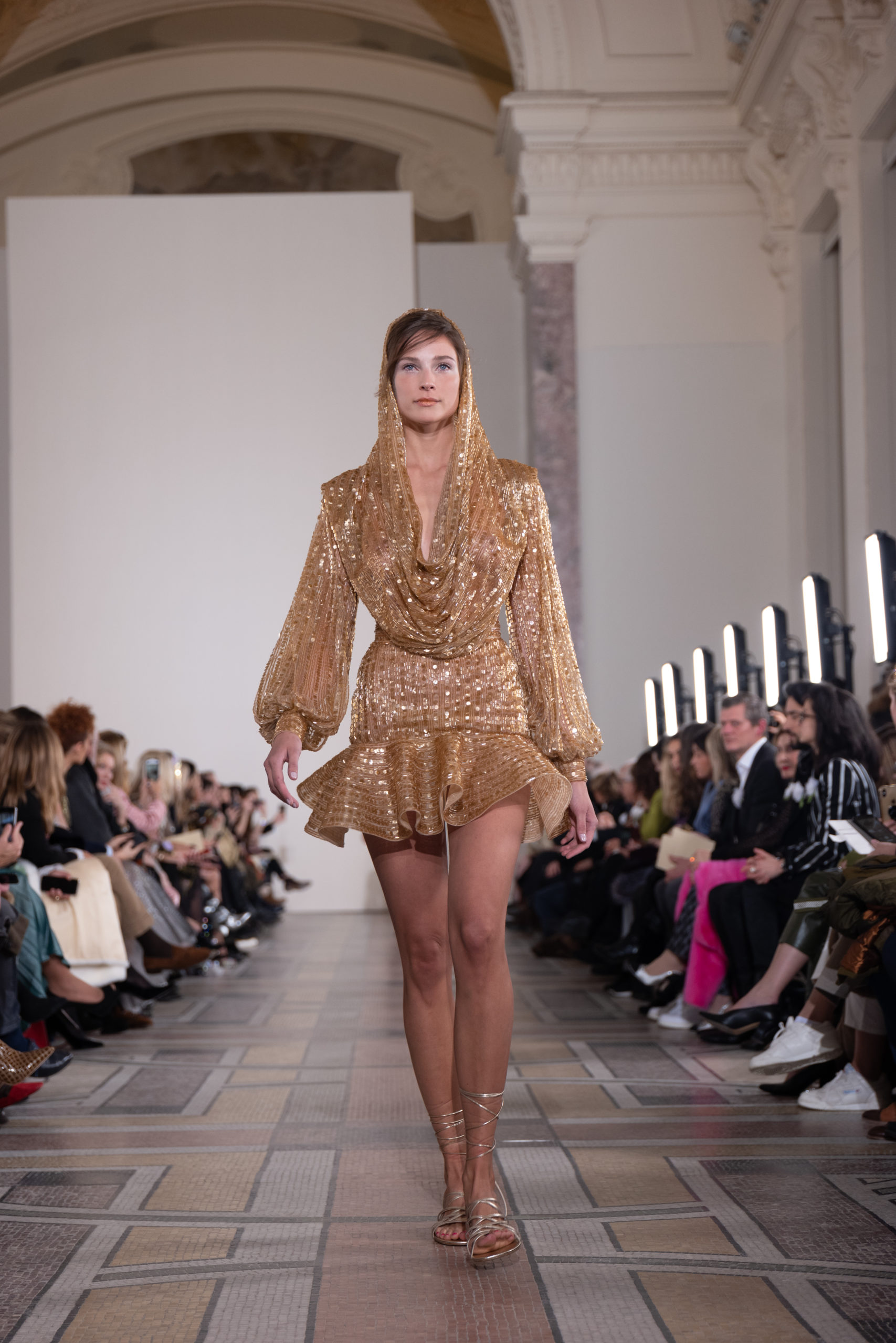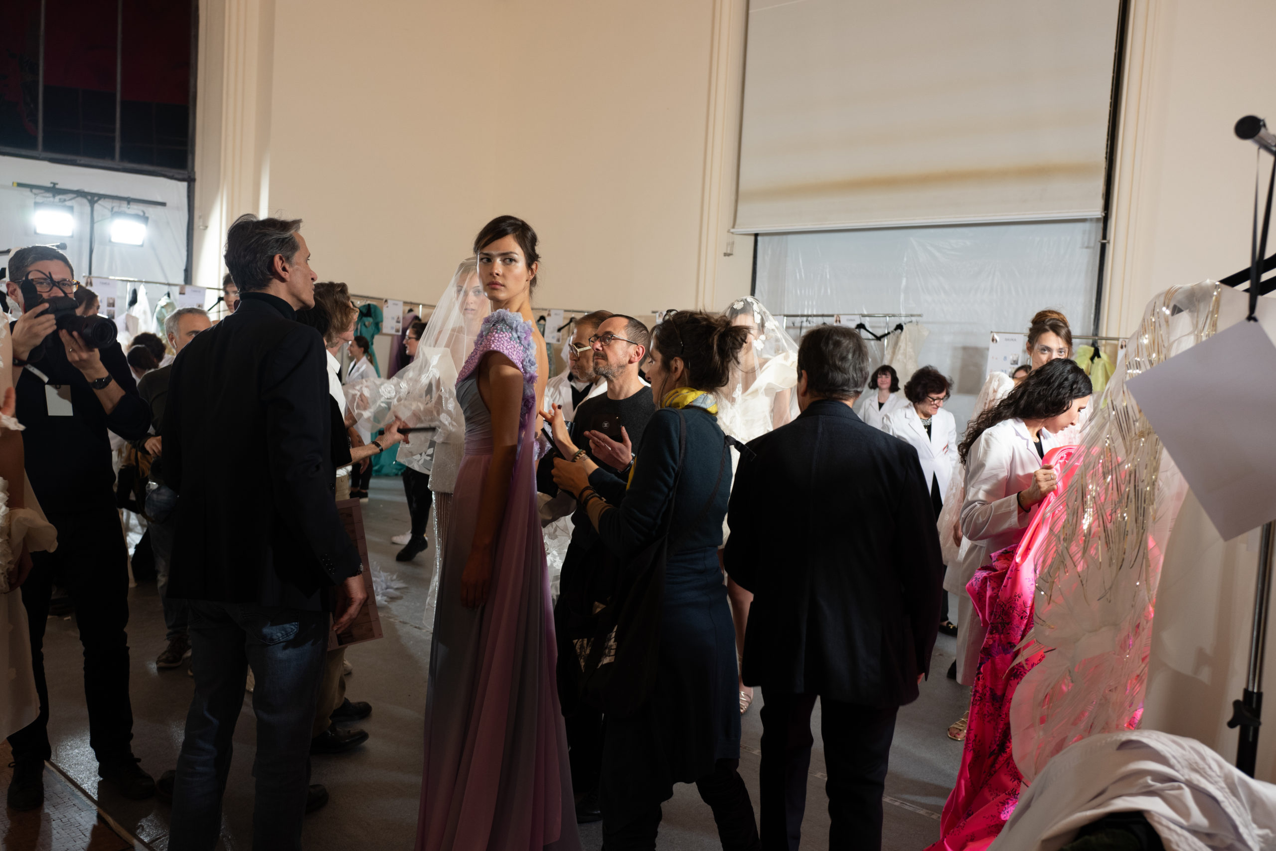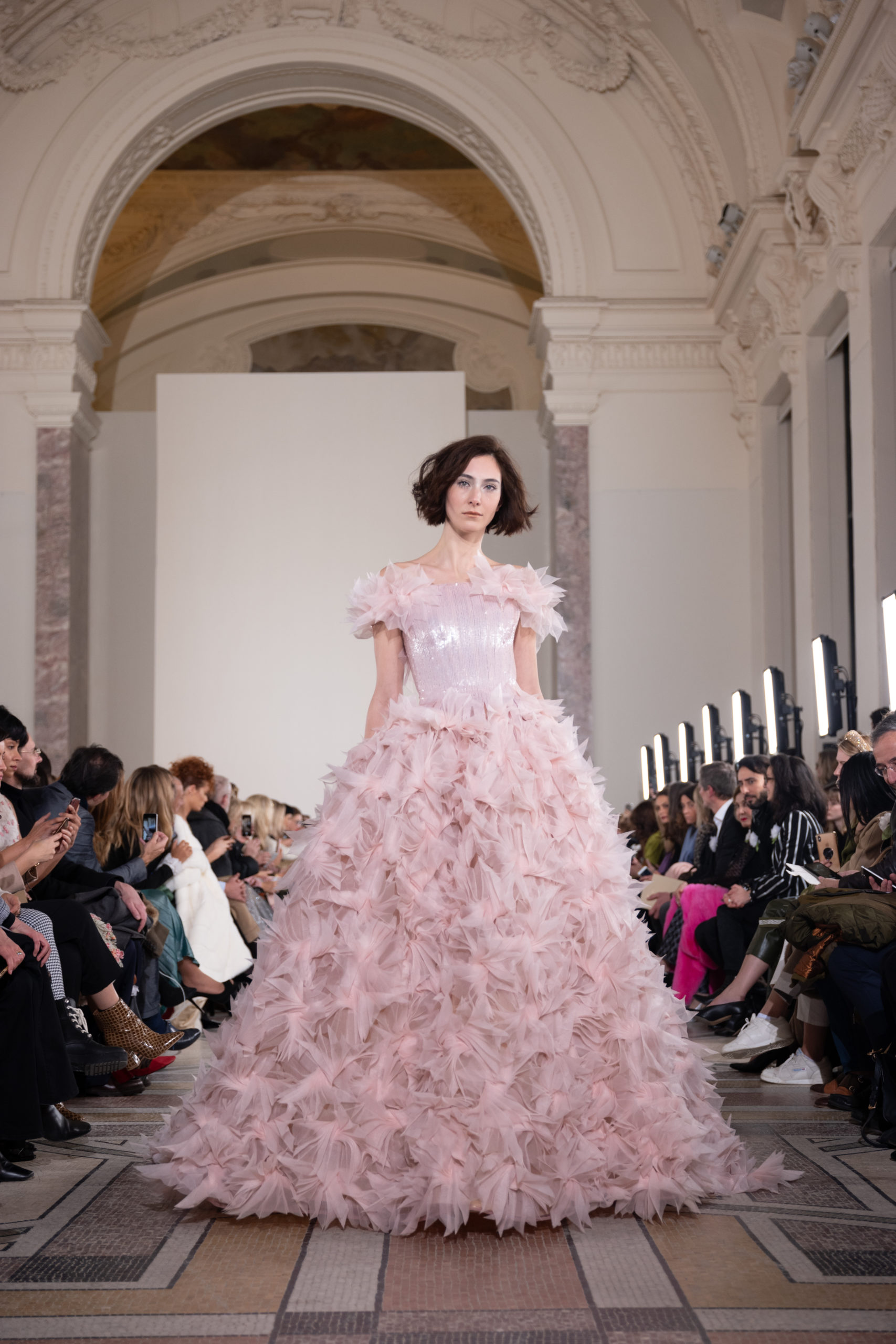 Celui-ci touche autant sa propre famille que toutes celles des membres de sa Maison et de ses ateliers, qui pour la première fois seront présents sur le podium à la fin du défilé. La rose blanche remise à chaque invité incarne ce soutien à un changement pacifique au Pays du Cèdre. Le motif floral cher à Georges Chakra est une trame qui parcourt également l’ensemble de la collection. Aux nombreuses silhouettes immaculées comme autant de pages vierges sur lesquelles écrire une nouvelle histoire répondent une petite robe entièrement réalisée en pétales ivoire, une tenue en tulle entièrement rebrodée de roses, une fleur généreuse posée sur une mini robe en satin duchesse rose fluorescent, comme ces roses peintes une à une à la main sur le gazar d’une longue robe fendue. Les voiles et les transparences nimbent la collection d’un raffinement vaporeux, contrastant avec un travail sophistiqué de volumes. D’un côté, la géométrie épurée d’une robe-boule, les broderies origami et des plissés mouchoirs quasi algorithmiques. De l’autre, les bustiers qui embrassent le corps, les dos qui se dévoilent, la fluidité des capes et des traînes, les volutes des étoffes éclaboussées de plumes, rebrodées à la main de paillettes et de sequins, la sensualité du crêpe et de l’organza plissé. Ce jeu de contraires dégage une énergie particulière, dopée par un jeu de tailles tour à tour ultra longues et extra courtes, convoquant un imaginaire de tapis rouge autant que les podiums disco des années 1970. Blanc, mais aussi rose éclatant ou poudré, aigue-marine, menthe à l’eau, bleu lagon, ciel ou glacier, iridescentes nacrées sur fond d’imprimé végétal… La palette de couleurs évoque une nature fantastique, entre forêt luxuriante et fantasme d’une île tropicale où le temps serait toujours au grand beau et où l’on récolterait des perles aux teintes indéfinissables. Les éclats d’or et d’argent viennent exalter la moire d’un tissu ou réveiller le mat précieux d’une étoffe. Mais cet Éden couture est pugnace, comme le rappellent les flammes dévorant une robe longue à encolure bateau et les souliers plus plats qu’à l’accoutumée, dont ces spartiates à la féminité combattive. Georges Chakra a souhaité aussi s’engager de manière concrète auprès des organisations qui lui tiennent à cœur. Scintillant au cou de la mariée, l’imposant collier en émeraudes et diamants spécialement réalisé par le joaillier Fawaz Gruosi sera mis en vente et une partie de cette vente sera reversée au profit du Children Cancer Hospital de Beyrouth et des bourses d’études de l’école Saint Vincent de Paul.