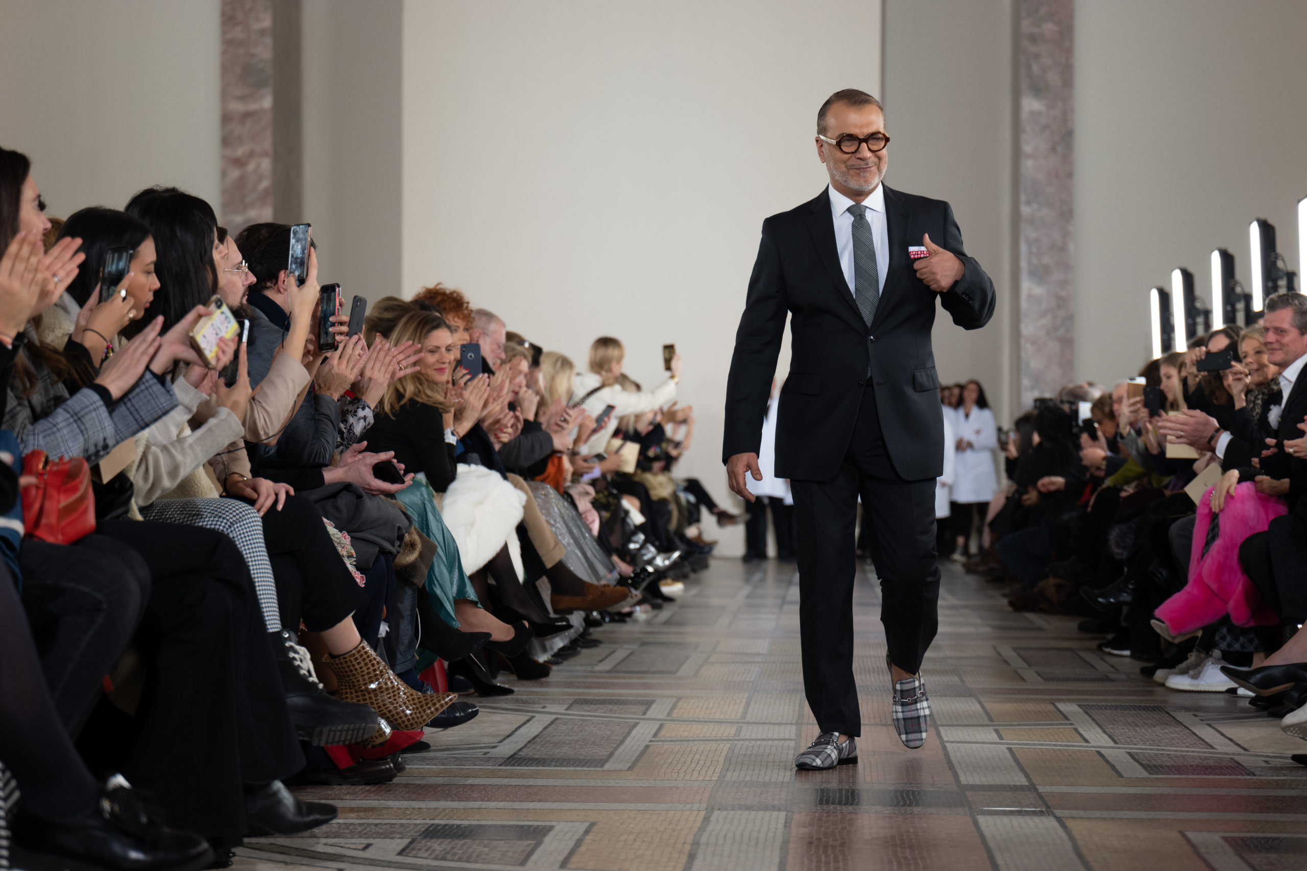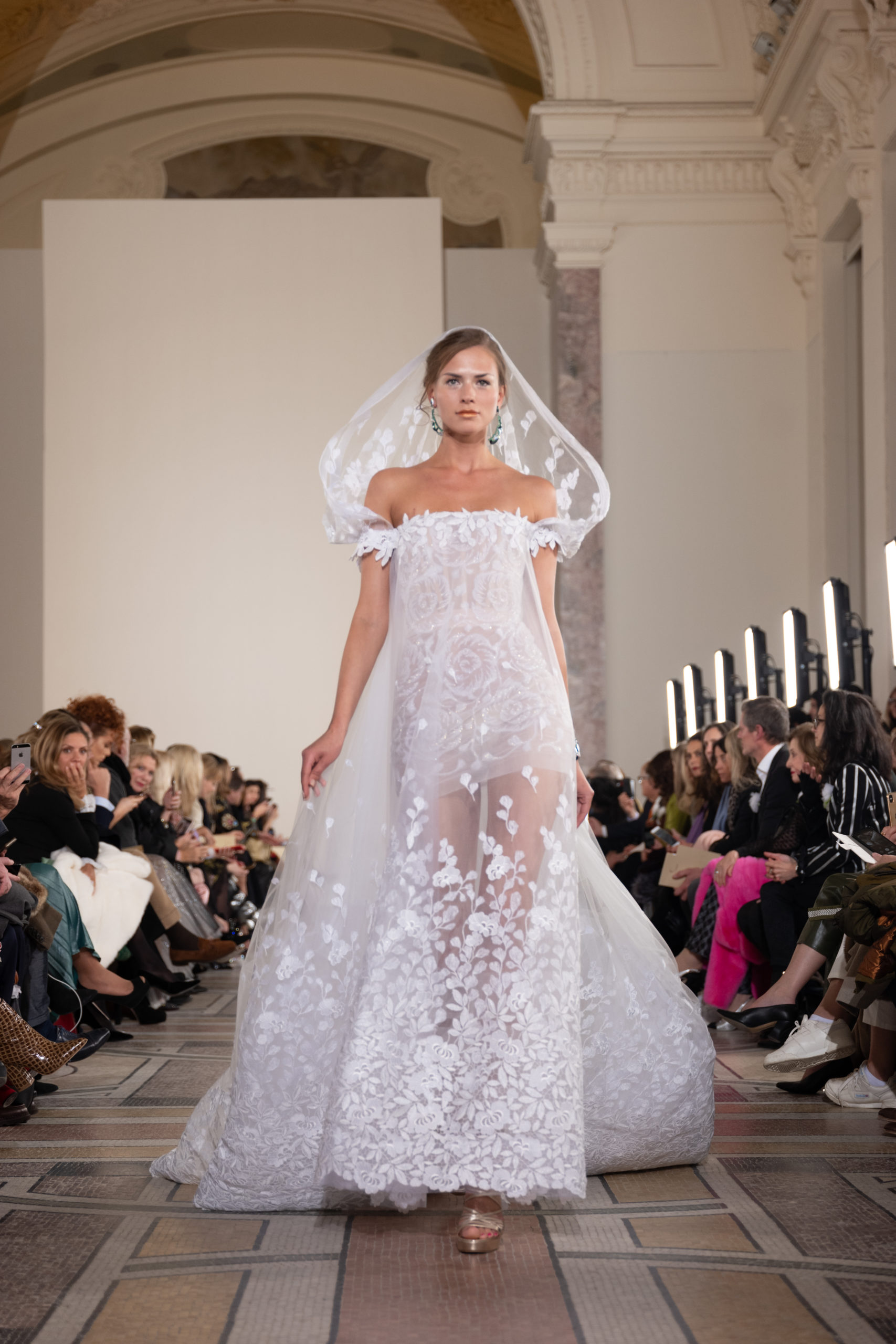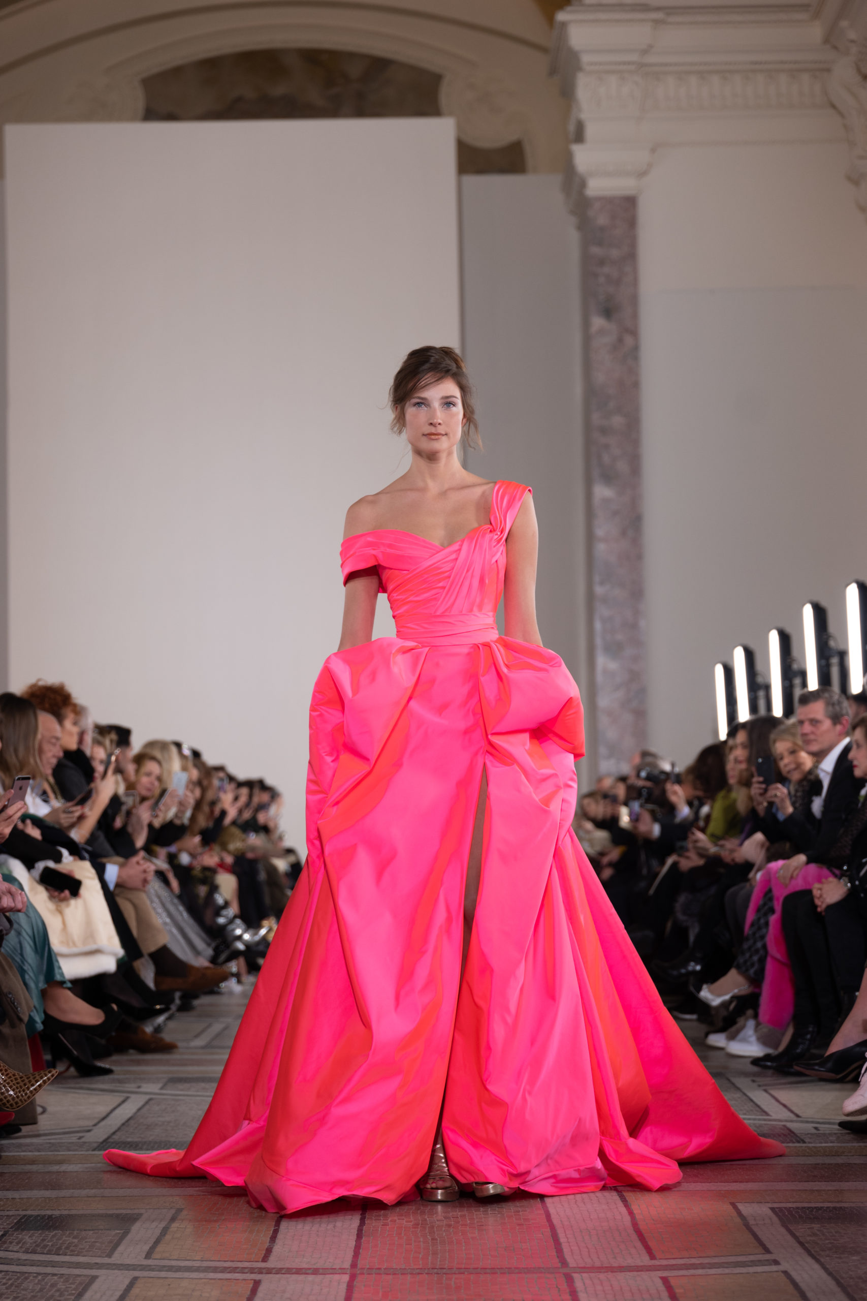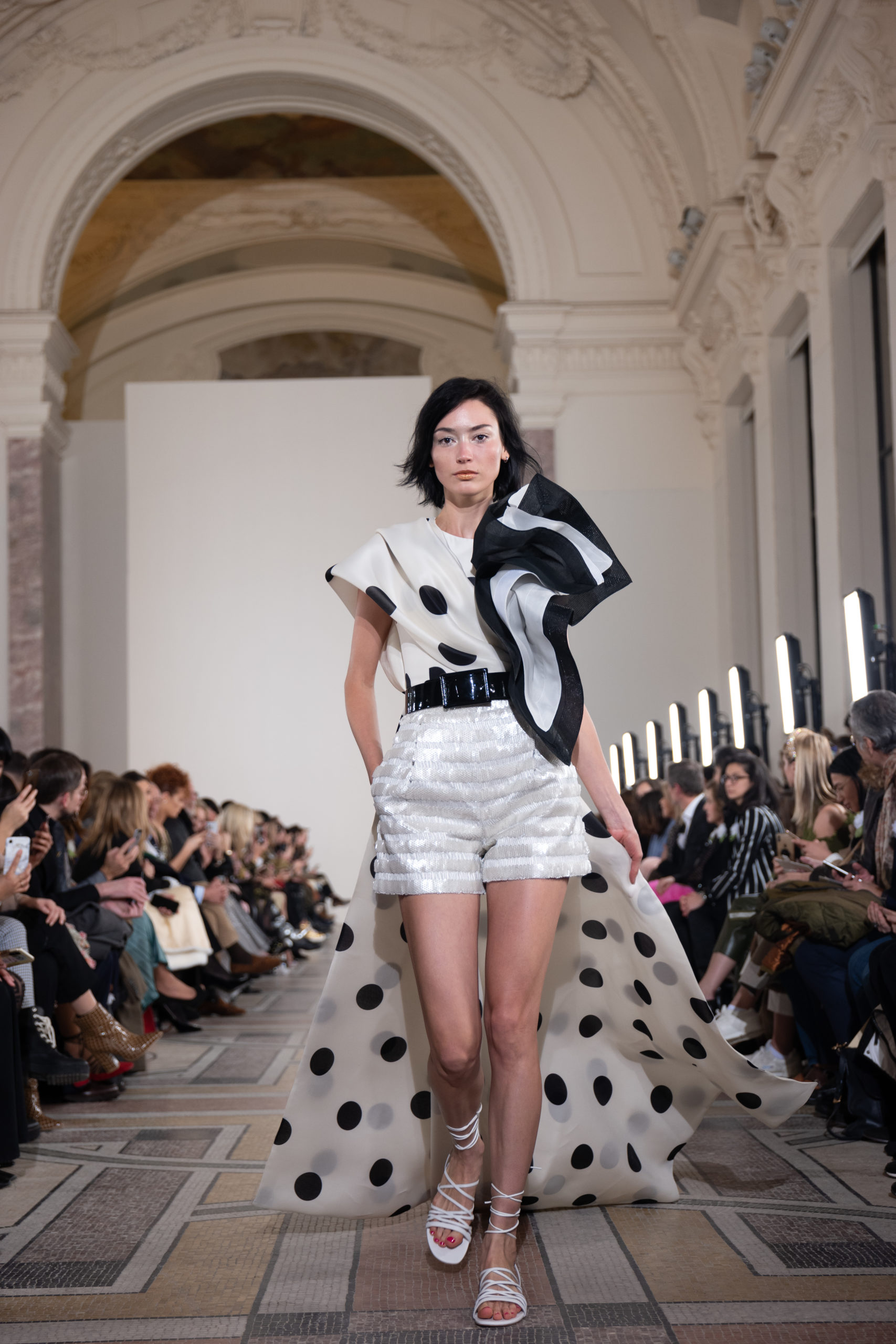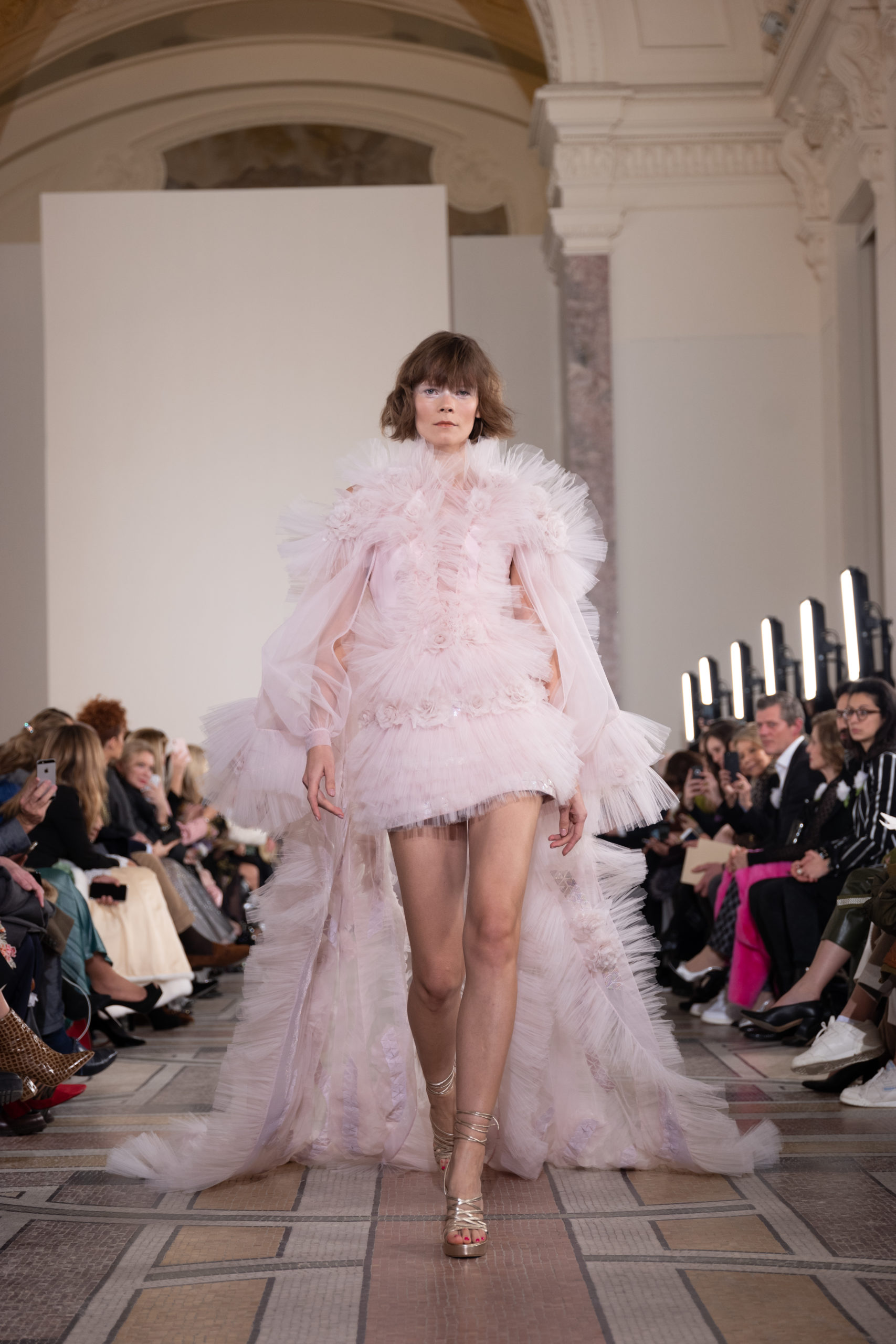 Celui-ci touche autant sa propre famille que toutes celles des membres de sa Maison et de ses ateliers, qui pour la première fois seront présents sur le podium à la fin du défilé. La rose blanche remise à chaque invité incarne ce soutien à un changement pacifique au Pays du Cèdre. Le motif floral cher à Georges Chakra est une trame qui parcourt également l’ensemble de la collection. Aux nombreuses silhouettes immaculées comme autant de pages vierges sur lesquelles écrire une nouvelle histoire répondent une petite robe entièrement réalisée en pétales ivoire, une tenue en tulle entièrement rebrodée de roses, une fleur généreuse posée sur une mini robe en satin duchesse rose fluorescent, comme ces roses peintes une à une à la main sur le gazar d’une longue robe fendue. Les voiles et les transparences nimbent la collection d’un raffinement vaporeux, contrastant avec un travail sophistiqué de volumes. D’un côté, la géométrie épurée d’une robe-boule, les broderies origami et des plissés mouchoirs quasi algorithmiques. De l’autre, les bustiers qui embrassent le corps, les dos qui se dévoilent, la fluidité des capes et des traînes, les volutes des étoffes éclaboussées de plumes, rebrodées à la main de paillettes et de sequins, la sensualité du crêpe et de l’organza plissé. Ce jeu de contraires dégage une énergie particulière, dopée par un jeu de tailles tour à tour ultra longues et extra courtes, convoquant un imaginaire de tapis rouge autant que les podiums disco des années 1970. Blanc, mais aussi rose éclatant ou poudré, aigue-marine, menthe à l’eau, bleu lagon, ciel ou glacier, iridescentes nacrées sur fond d’imprimé végétal… La palette de couleurs évoque une nature fantastique, entre forêt luxuriante et fantasme d’une île tropicale où le temps serait toujours au grand beau et où l’on récolterait des perles aux teintes indéfinissables. Les éclats d’or et d’argent viennent exalter la moire d’un tissu ou réveiller le mat précieux d’une étoffe. Mais cet Éden couture est pugnace, comme le rappellent les flammes dévorant une robe longue à encolure bateau et les souliers plus plats qu’à l’accoutumée, dont ces spartiates à la féminité combattive. Georges Chakra a souhaité aussi s’engager de manière concrète auprès des organisations qui lui tiennent à cœur. Scintillant au cou de la mariée, l’imposant collier en émeraudes et diamants spécialement réalisé par le joaillier Fawaz Gruosi sera mis en vente et une partie de cette vente sera reversée au profit du Children Cancer Hospital de Beyrouth et des bourses d’études de l’école Saint Vincent de Paul.