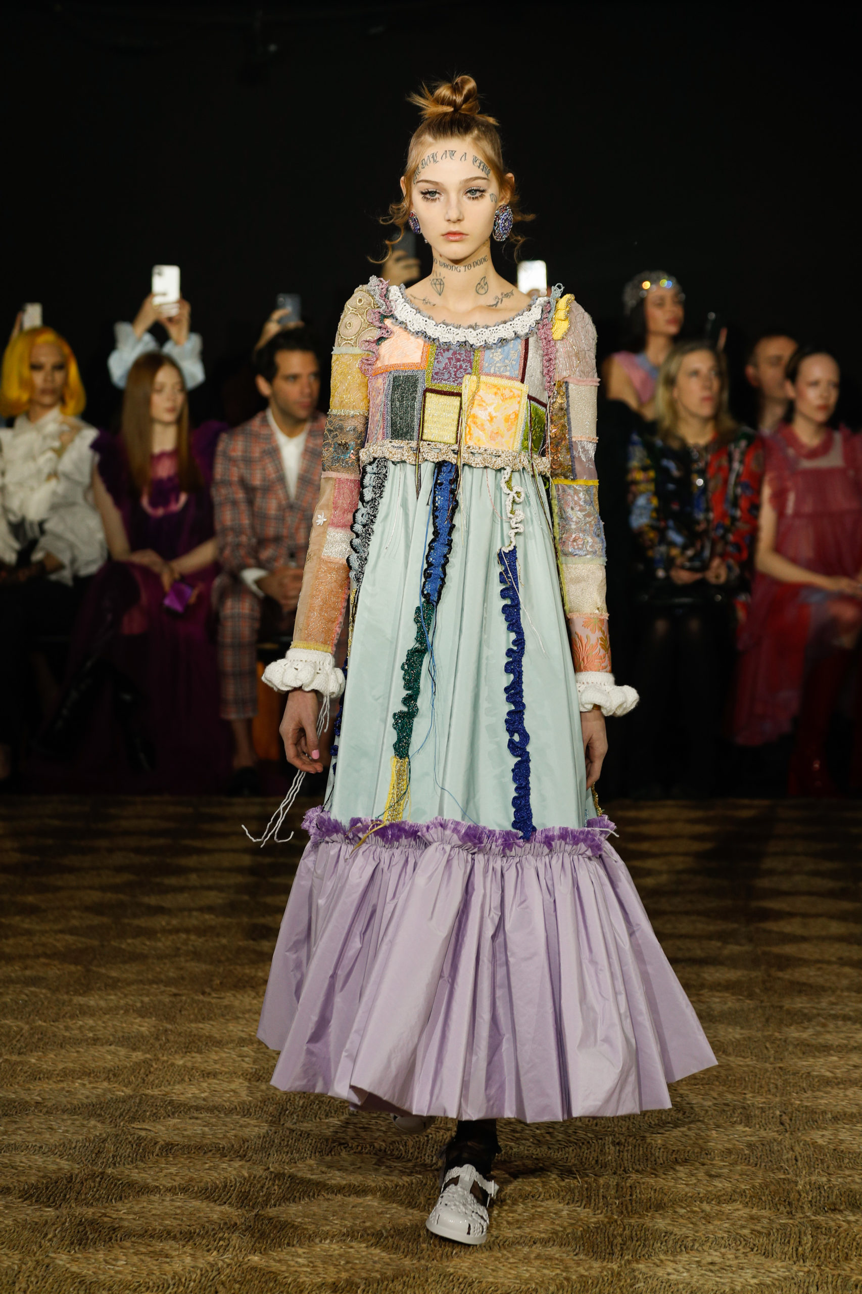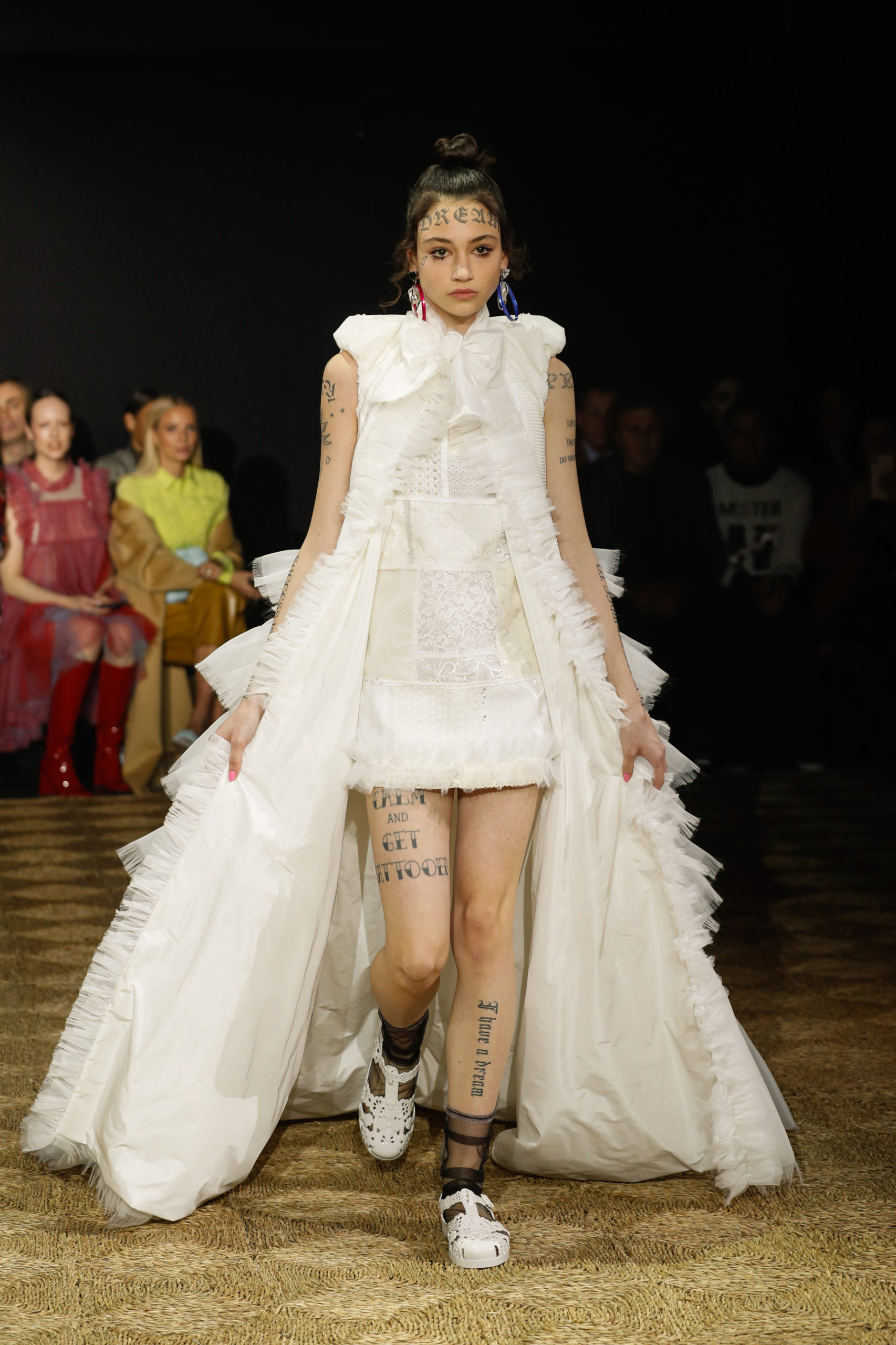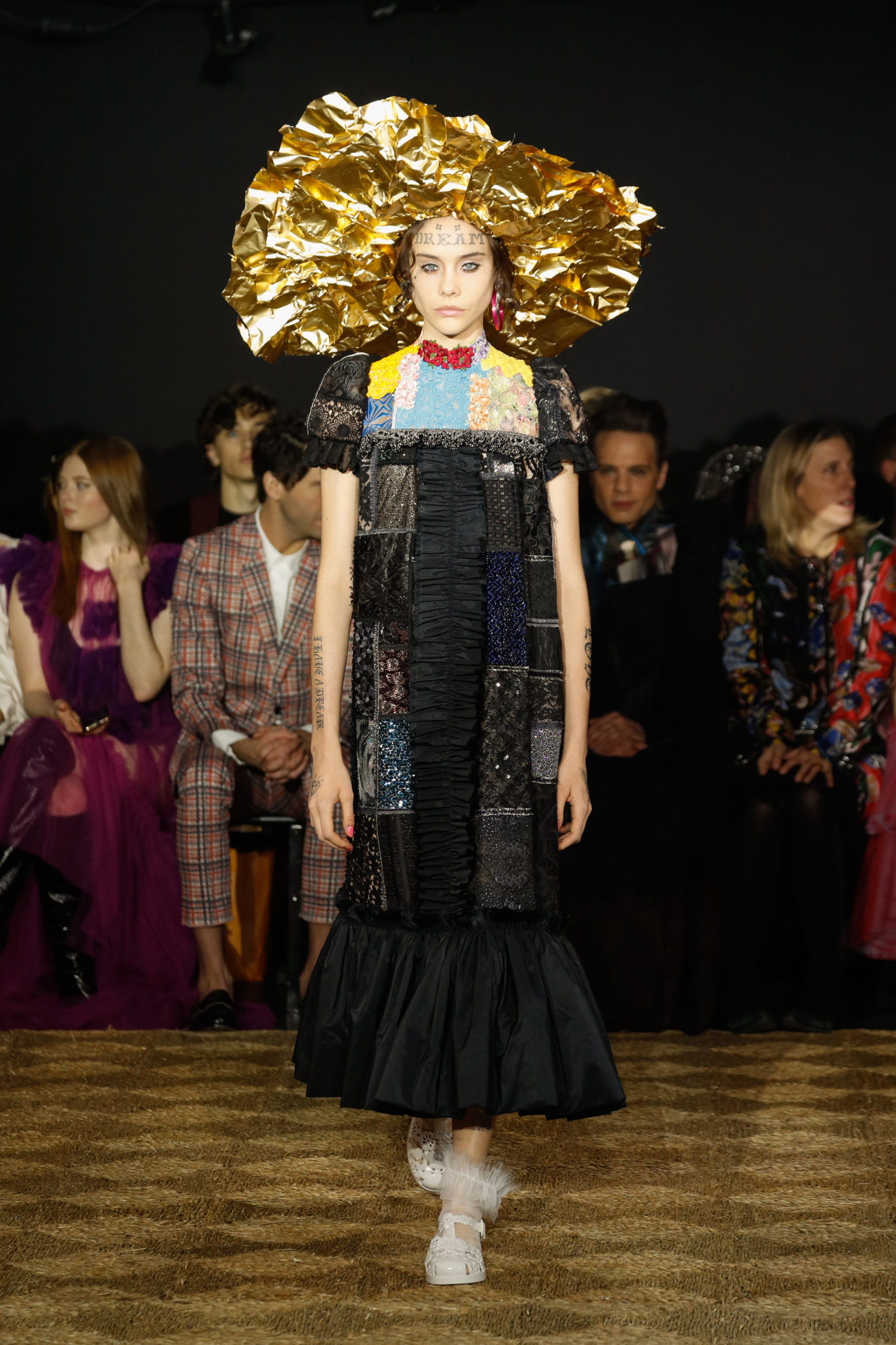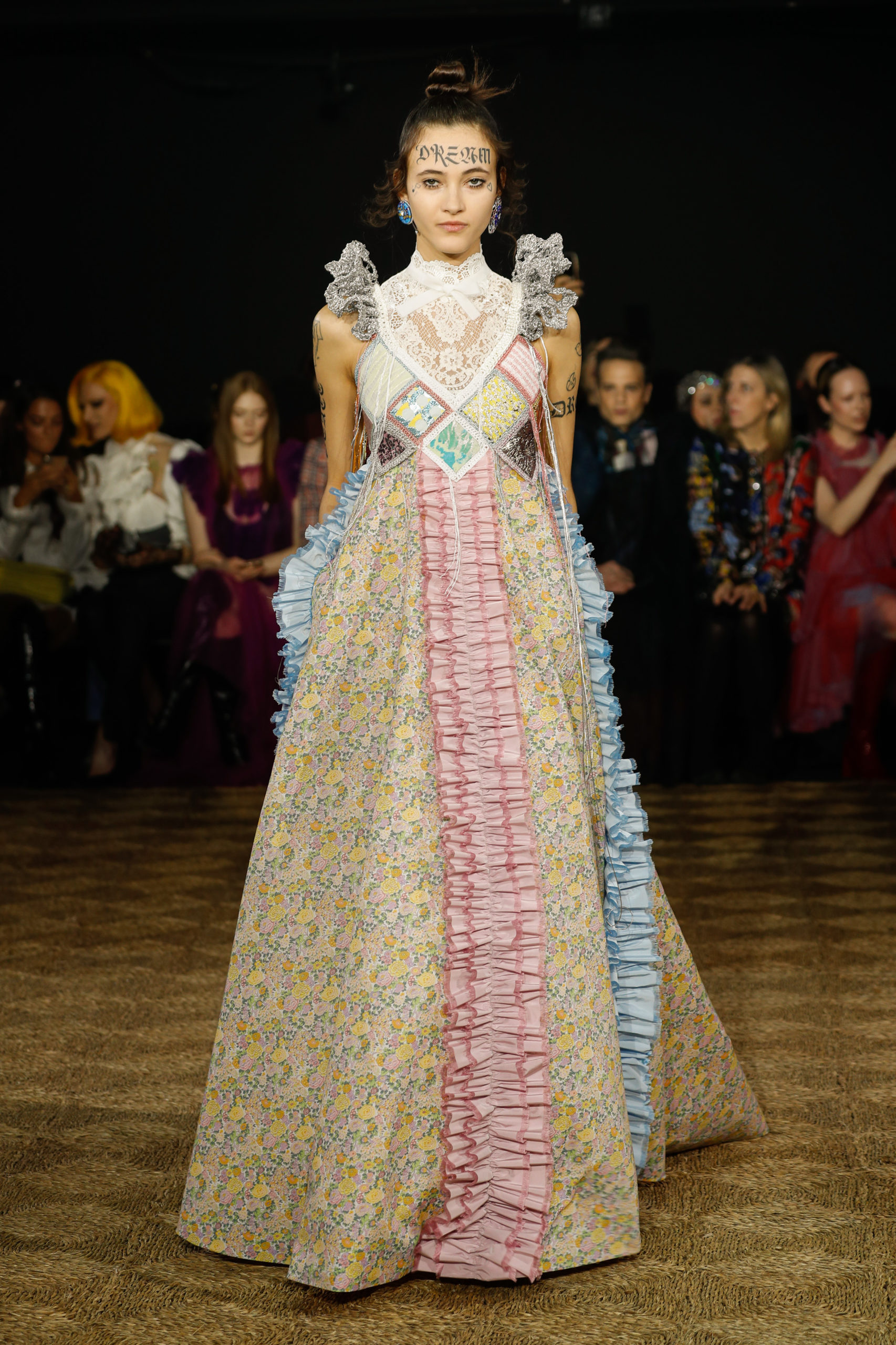 The collection shows a series of voluminous, free-flowing dresses and capes, embellished with tiers, ruffles, and crochet galloons. Ranging from floor-length to calf to ultra-mini, several outfits are complemented with wide-brimmed, spontaneously shaped surreal hats. Elaborate glamorous make- up is juxtaposed with faux tattoos, proclaiming messages of love and happiness.