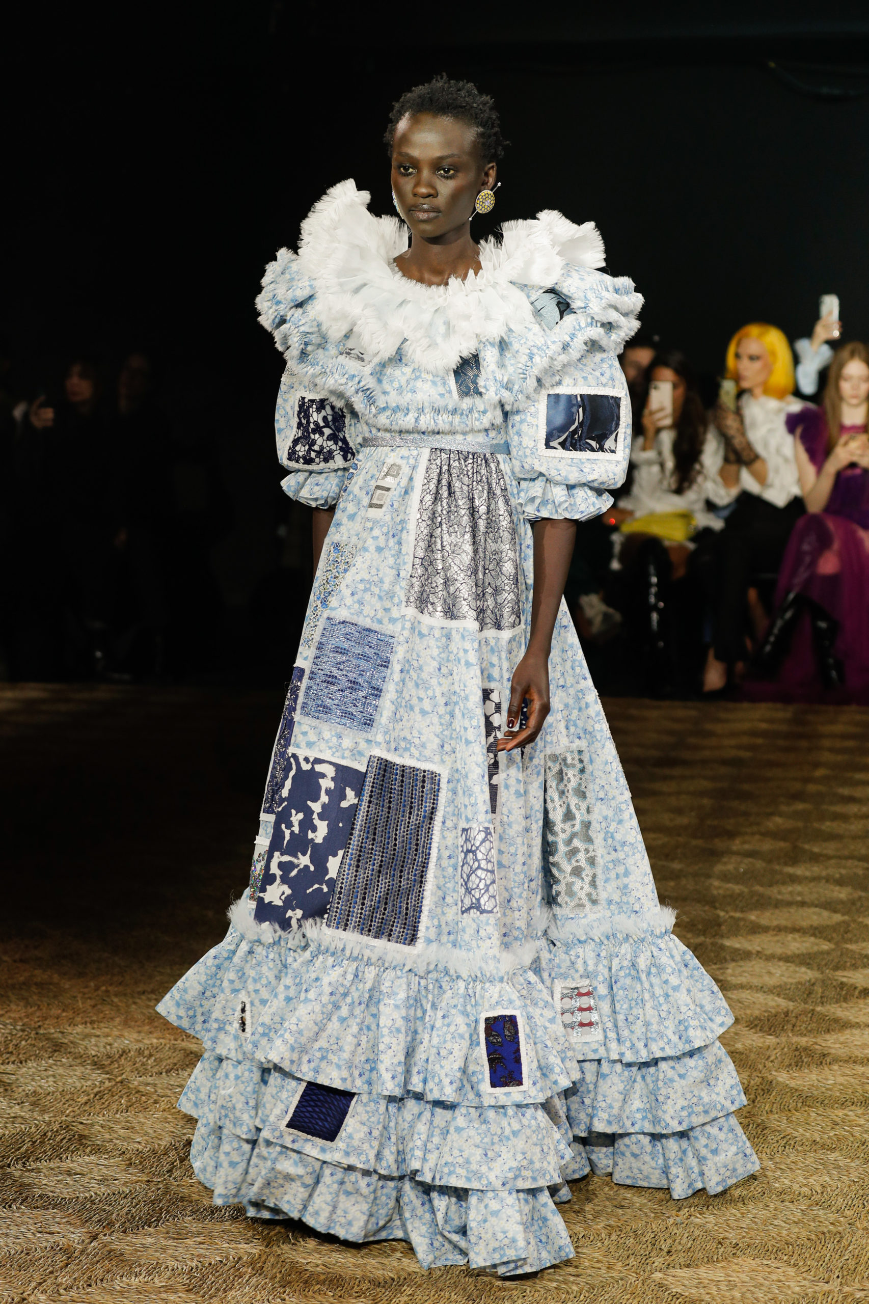 Having nearly exhausted their stock on their previous upcycling couture shows, Viktor&Rolf turned to their archive of fabric samples: tiny pieces of fabric, sent to the House throughout the years for consideration during the development process of their collections. From this archive, Viktor&Rolf selected some of the most luxurious fabric samples that, patched together, make up this collection.
