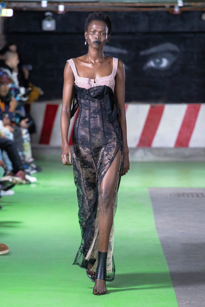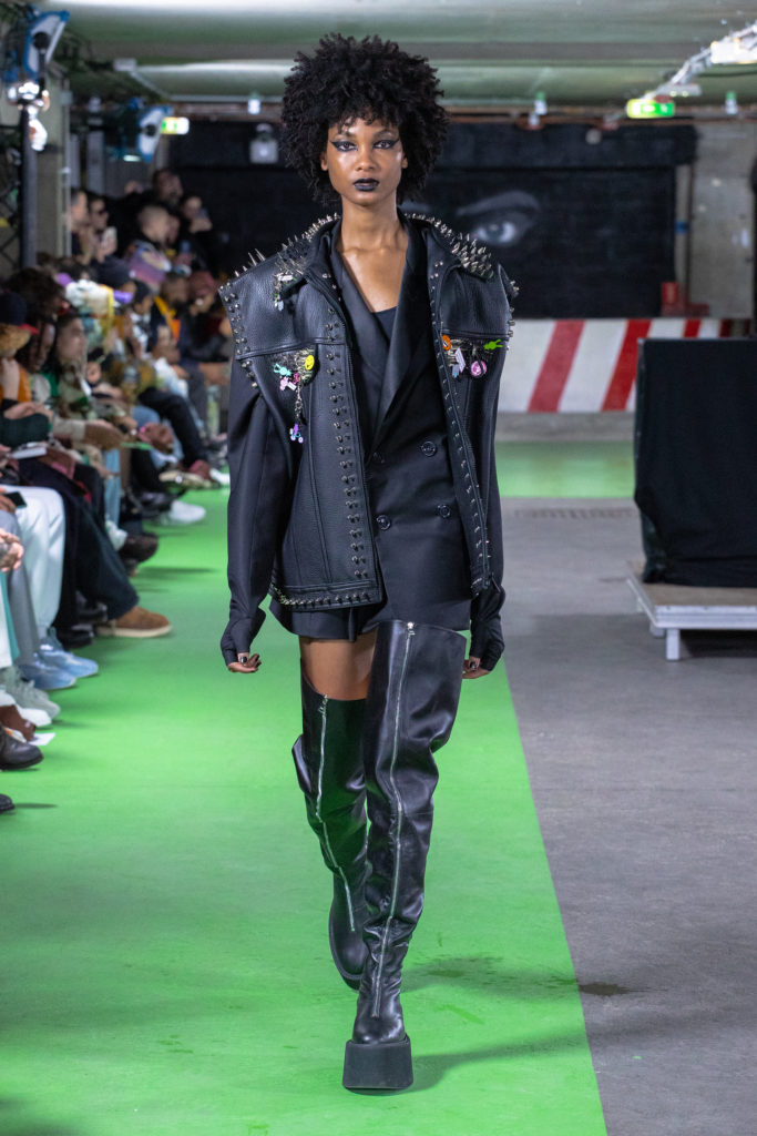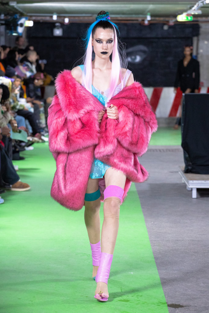 Violet/Orange and Green/Black Mohair Checks, Cotton Tie-dye, Leather, Faux Leather, Black/White Wool Houndstooth create a kaleidoscope of unexpected combinations, Blue and Beige Corduroy add a nod towards the beauty of the working person. Brocades are recrafted in untraditional silhouettes making them more street less posh. Handknit roll-neck shredded hem jumpers. Faux leopard 100% recycled polyester fleece jacket with matching oversized shorts. Strips of multiple fabrications from the past 6 years hand knitted to create a jumper effect. Pink/Black Silk Hounds- Tooth is given new life encased with transparent sequins. Maxi oversized draped pink faux fur jacket. Menswear influences redesigned into an ultra-feminine from wool check windowpane plaid into a cut-out dress. Each item is slightly twisted and counterbalanced. Another childhood reference attaching gloves on to the sleeves of the jackets. The cotton lightning bolt shirt is seen several times. Ties worn unexpectedly in a revolt to tradition. The real strength of this collection lies in the individual pieces that separated fit seamlessly into our real wardrobe.