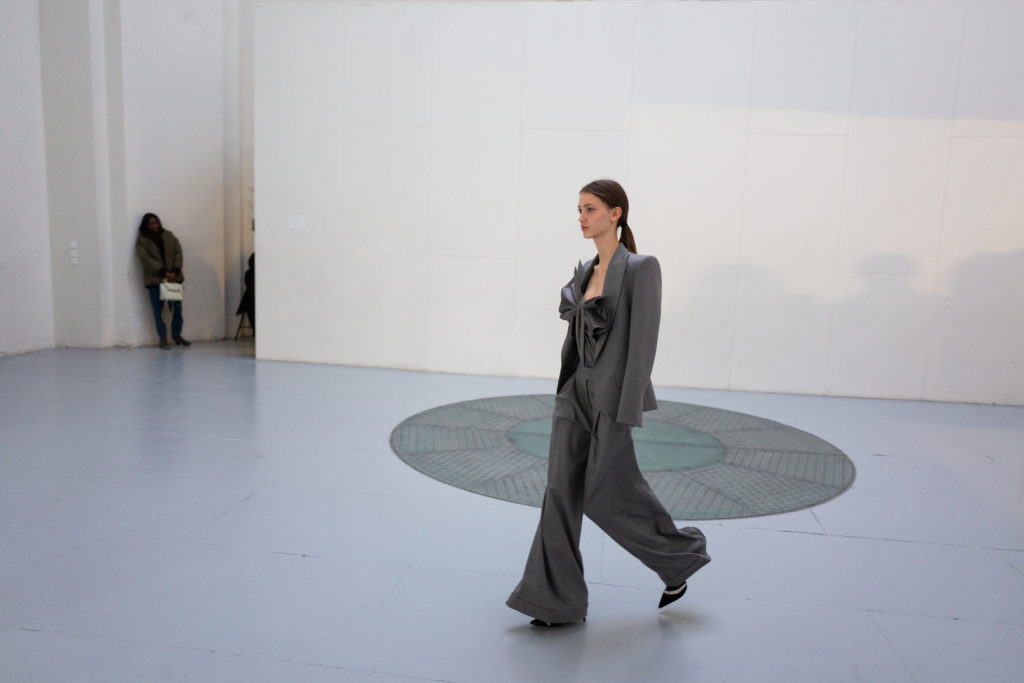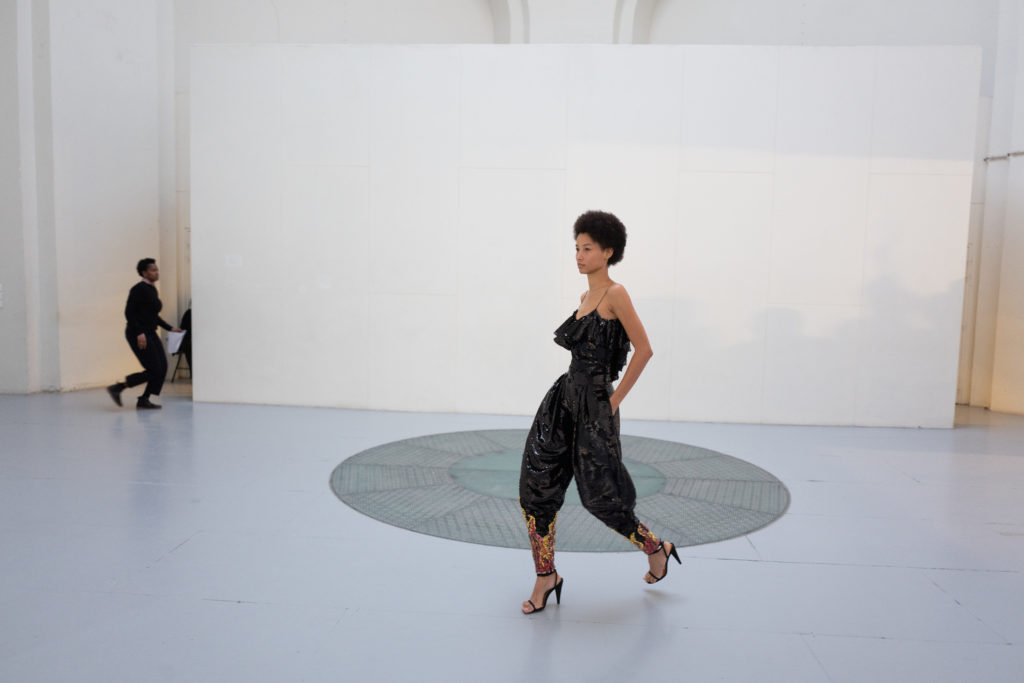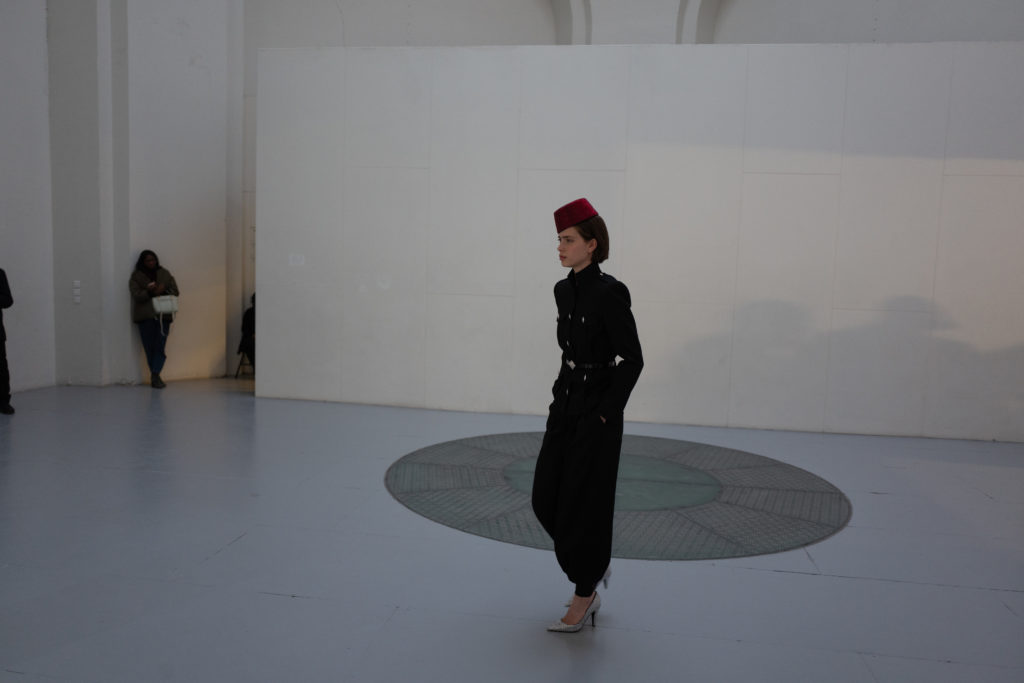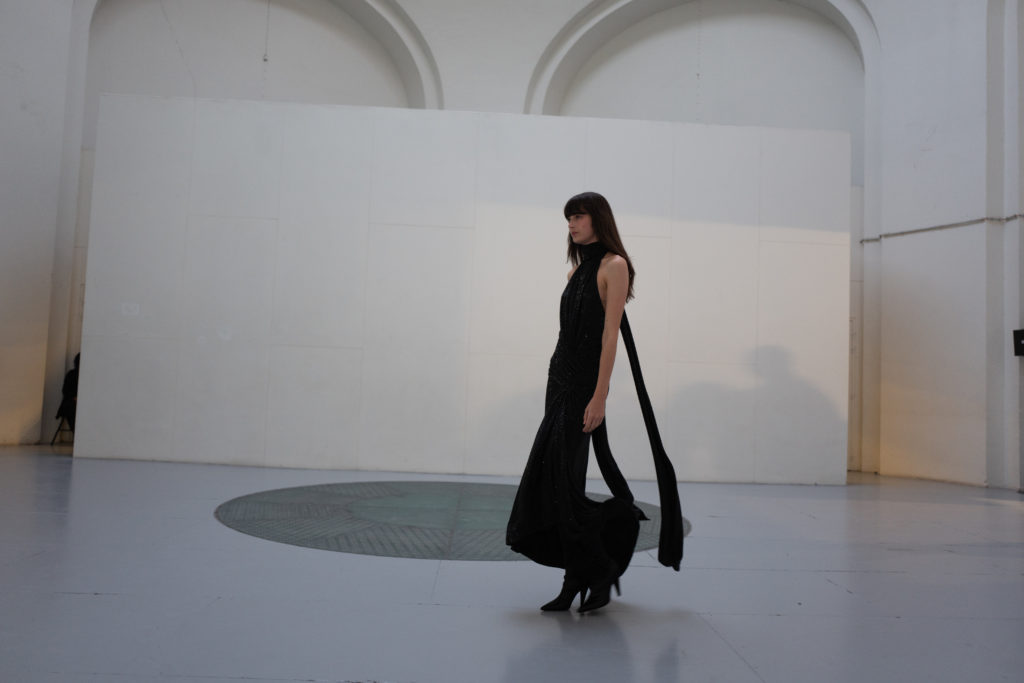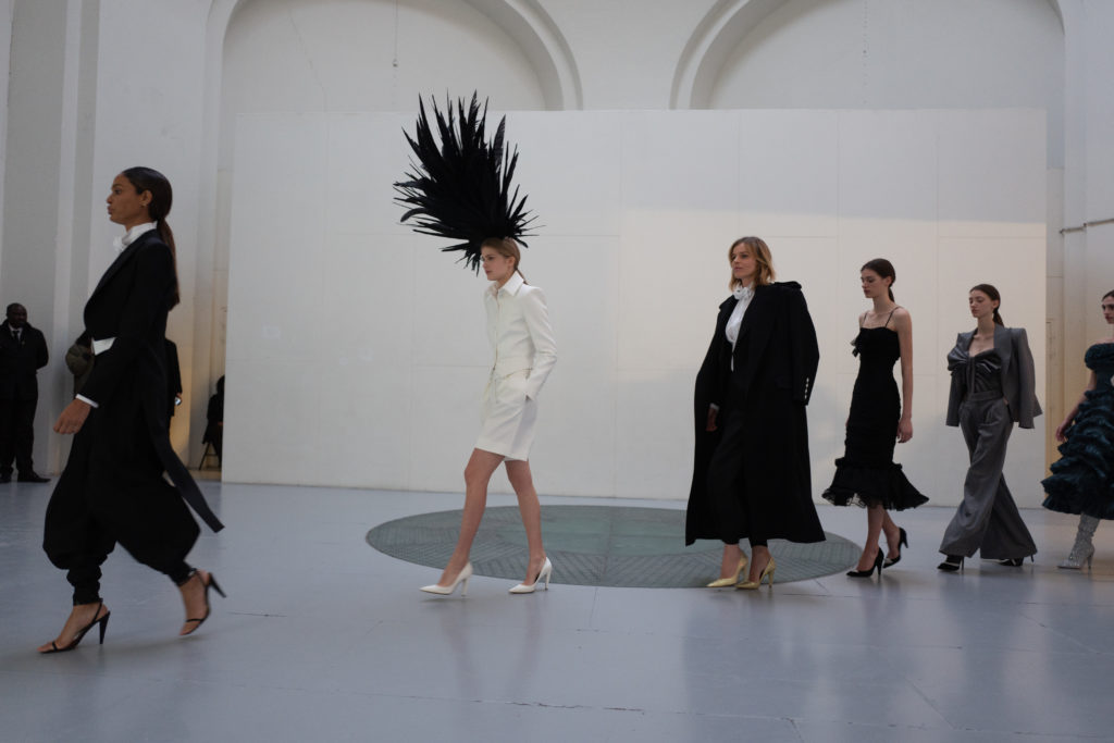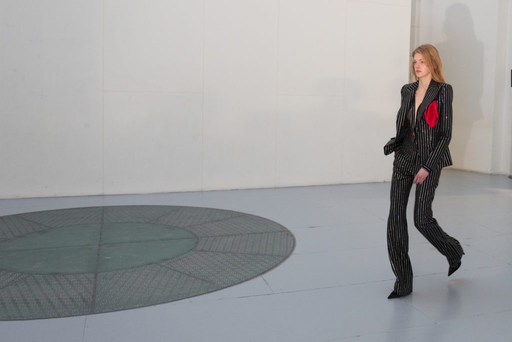Jet, Black Diamond, Vintage Rose and Erenite. Key pieces included extraordinary crystal transfer tailoring and signature dresses, embroidered flames on two looks and a closing look crystal pinstriped suit worn by Bella Hadid.