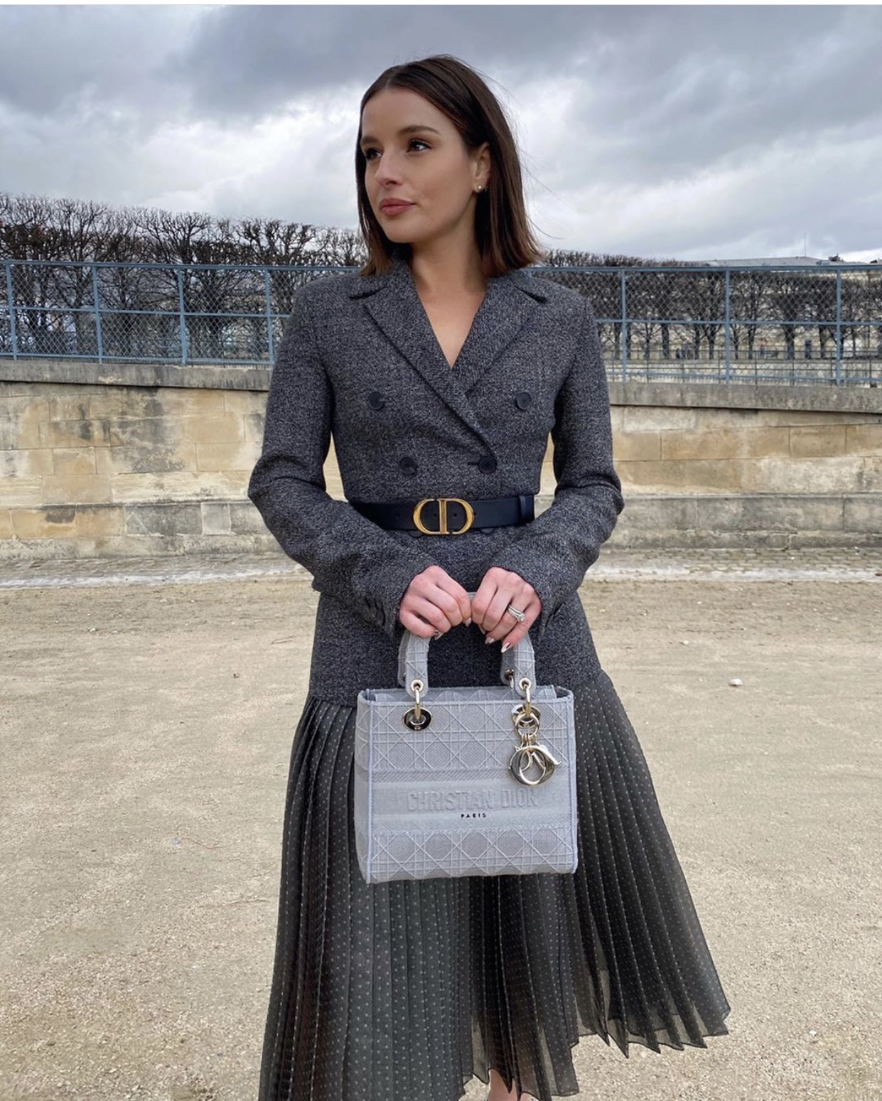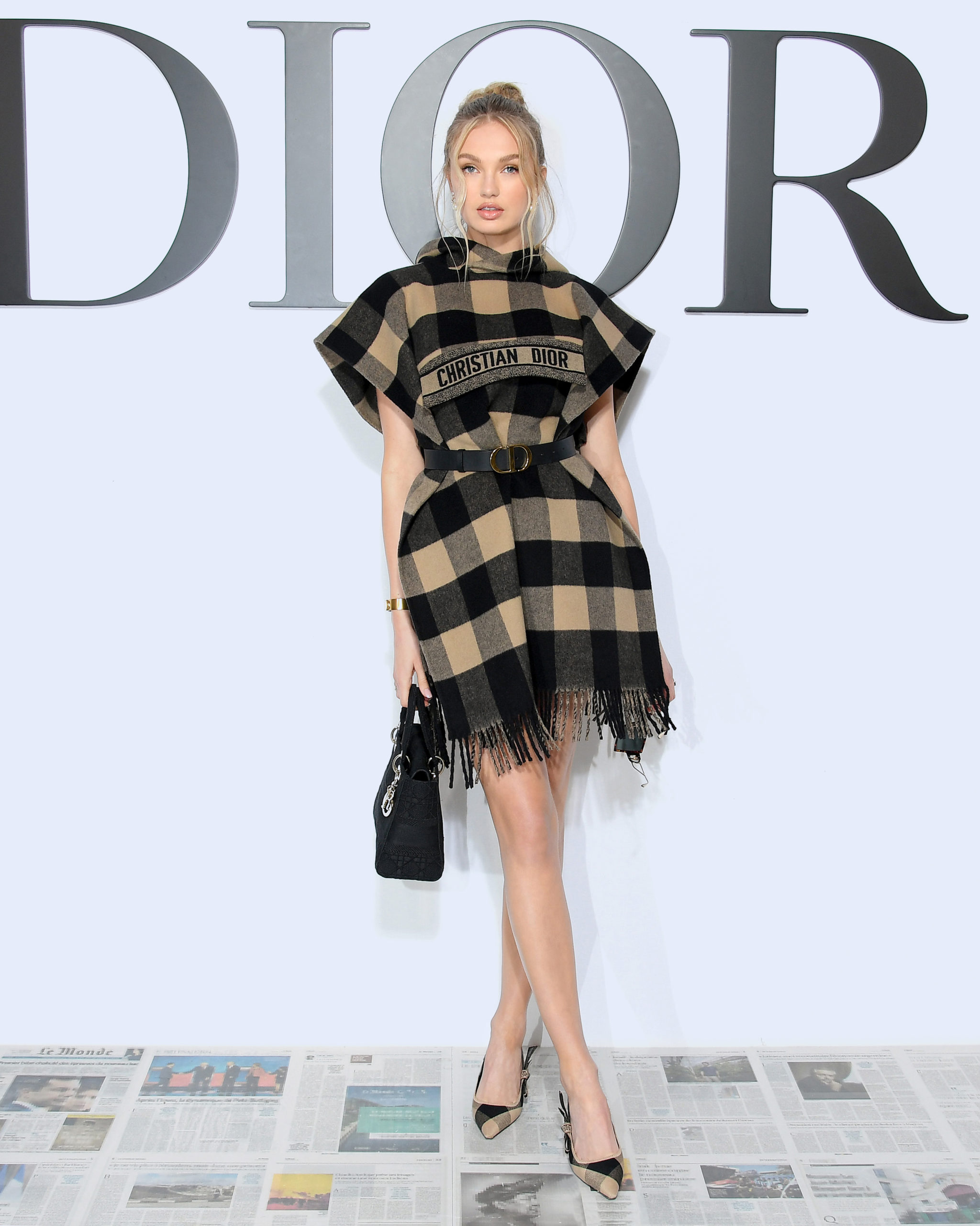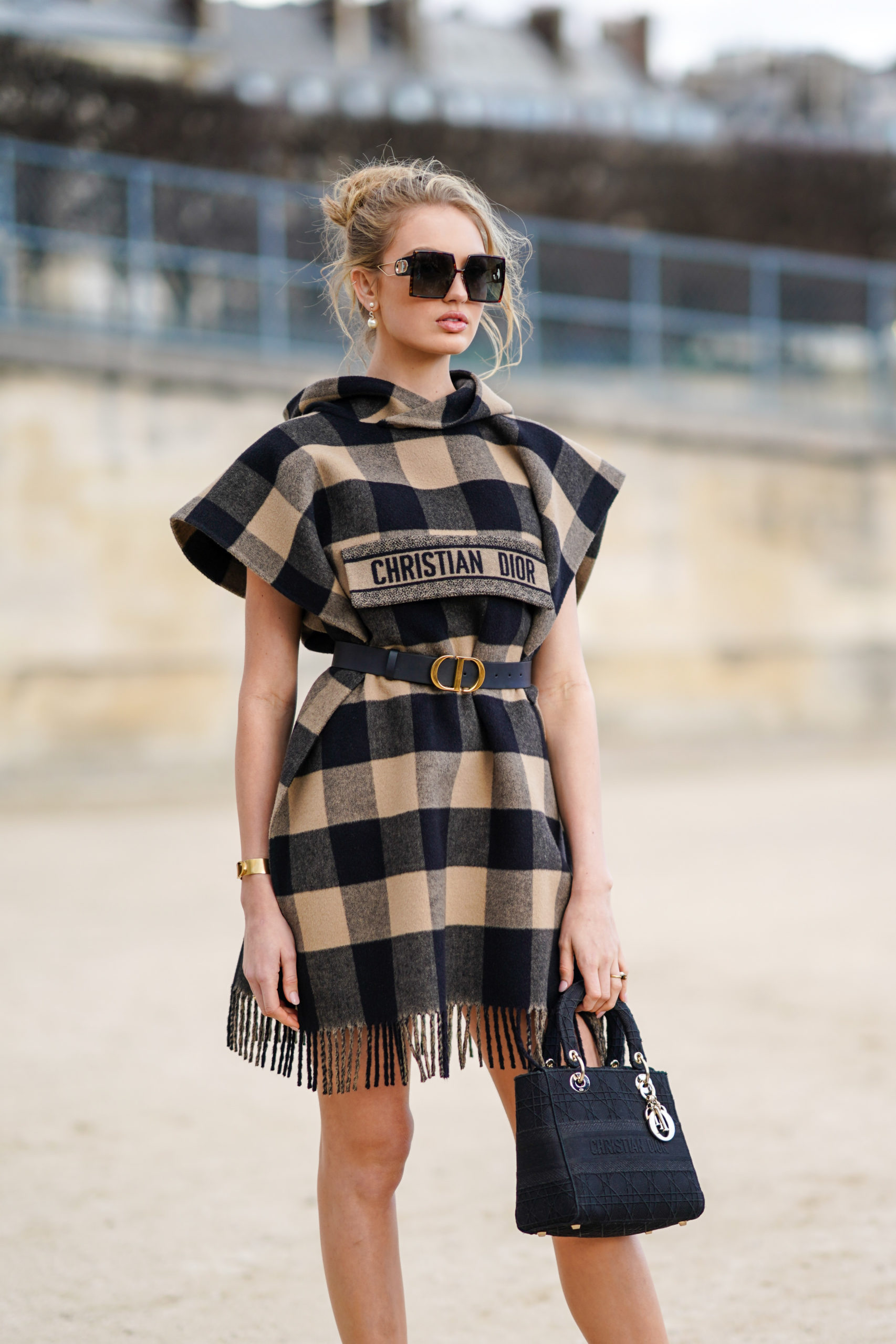 - PARIS, FRANCE – FEBRUARY 25: Romee Strijd wears sunglasses, a poncho/plaid dress with printed checked pattern and fringes, a Lady Dior bag, pearl earrings, outside Dior, during Paris Fashion Week – Womenswear Fall/Winter 2020/2021, on February 25, 2020 in Paris, France. (Photo by Edward Berthelot/Getty Images)