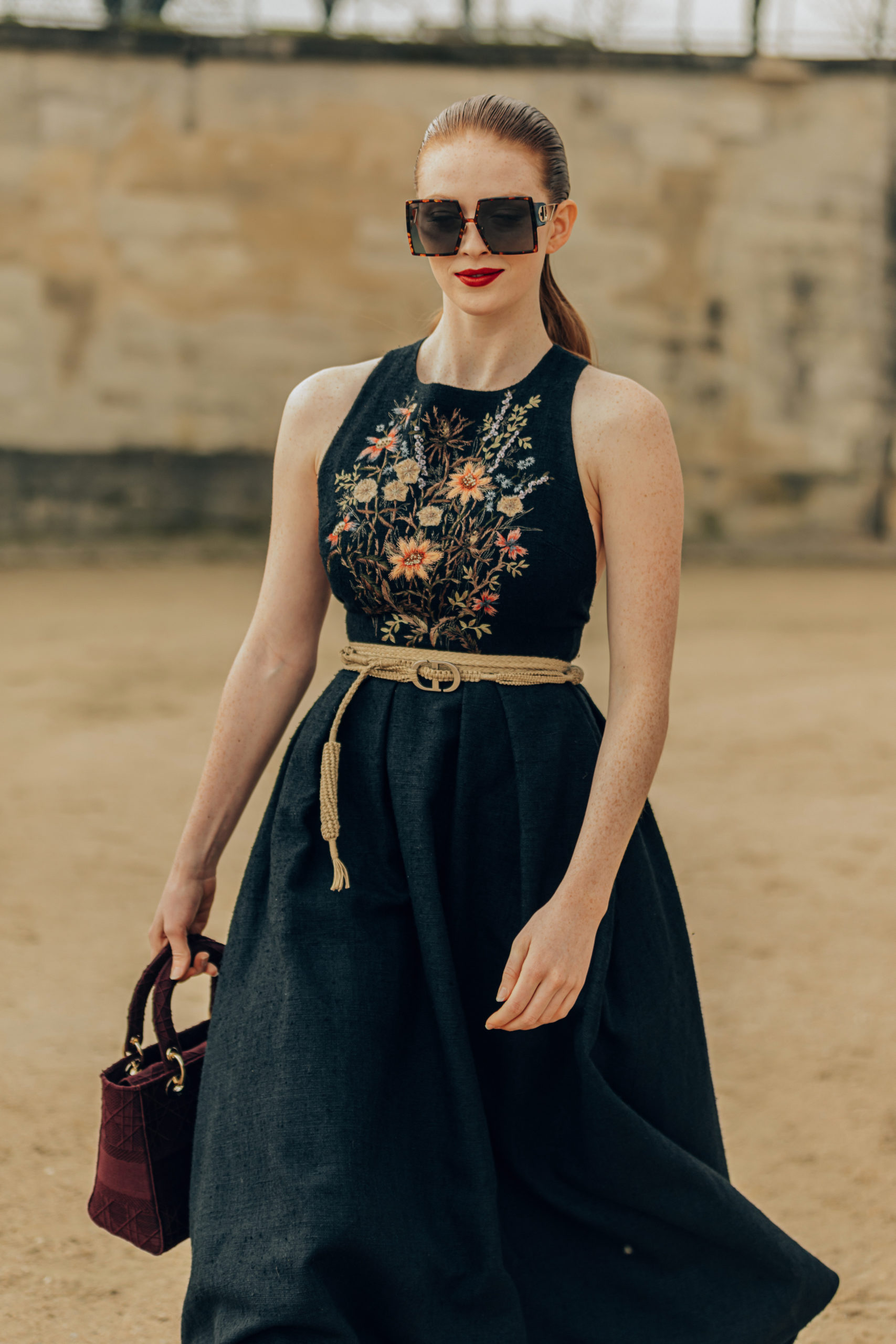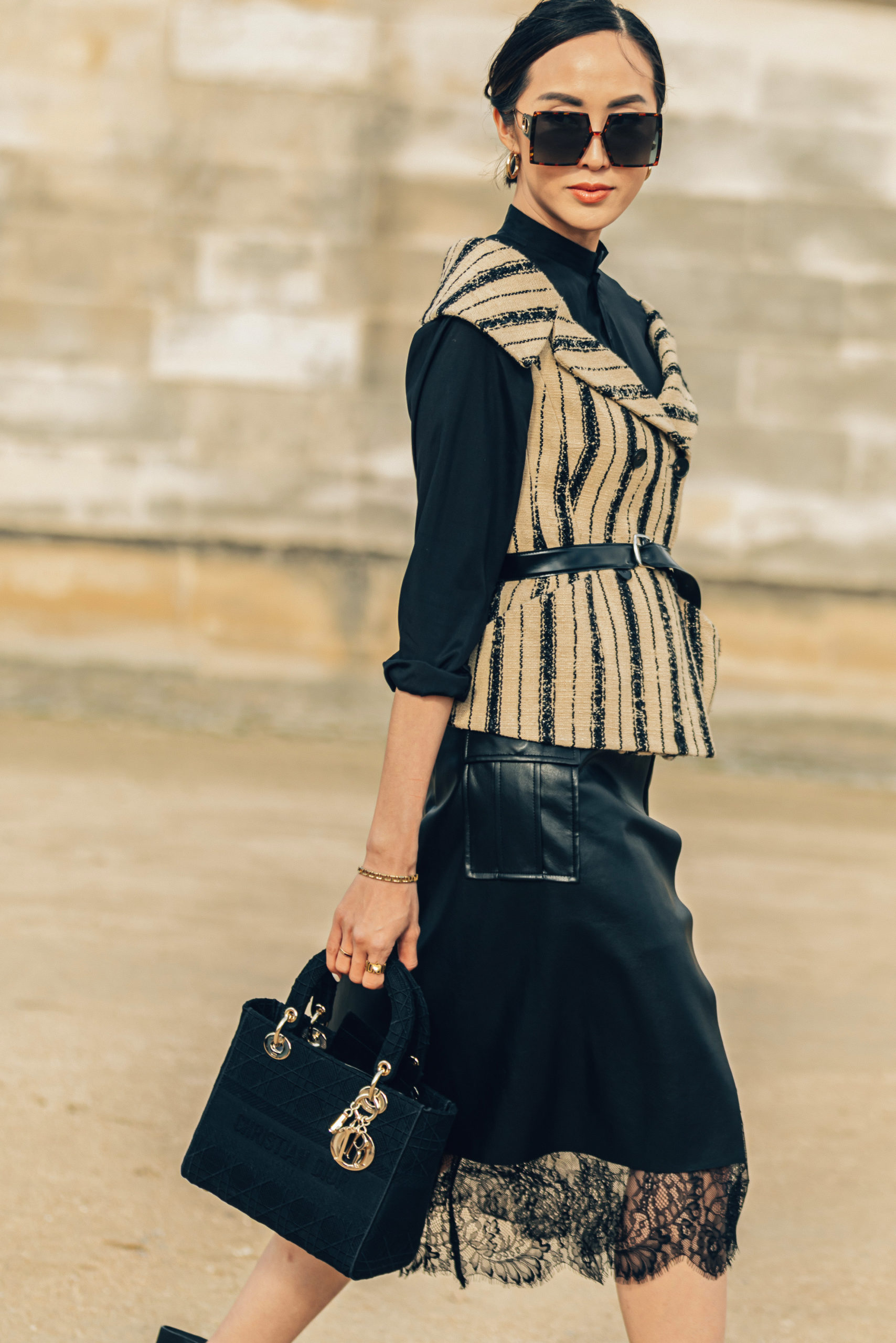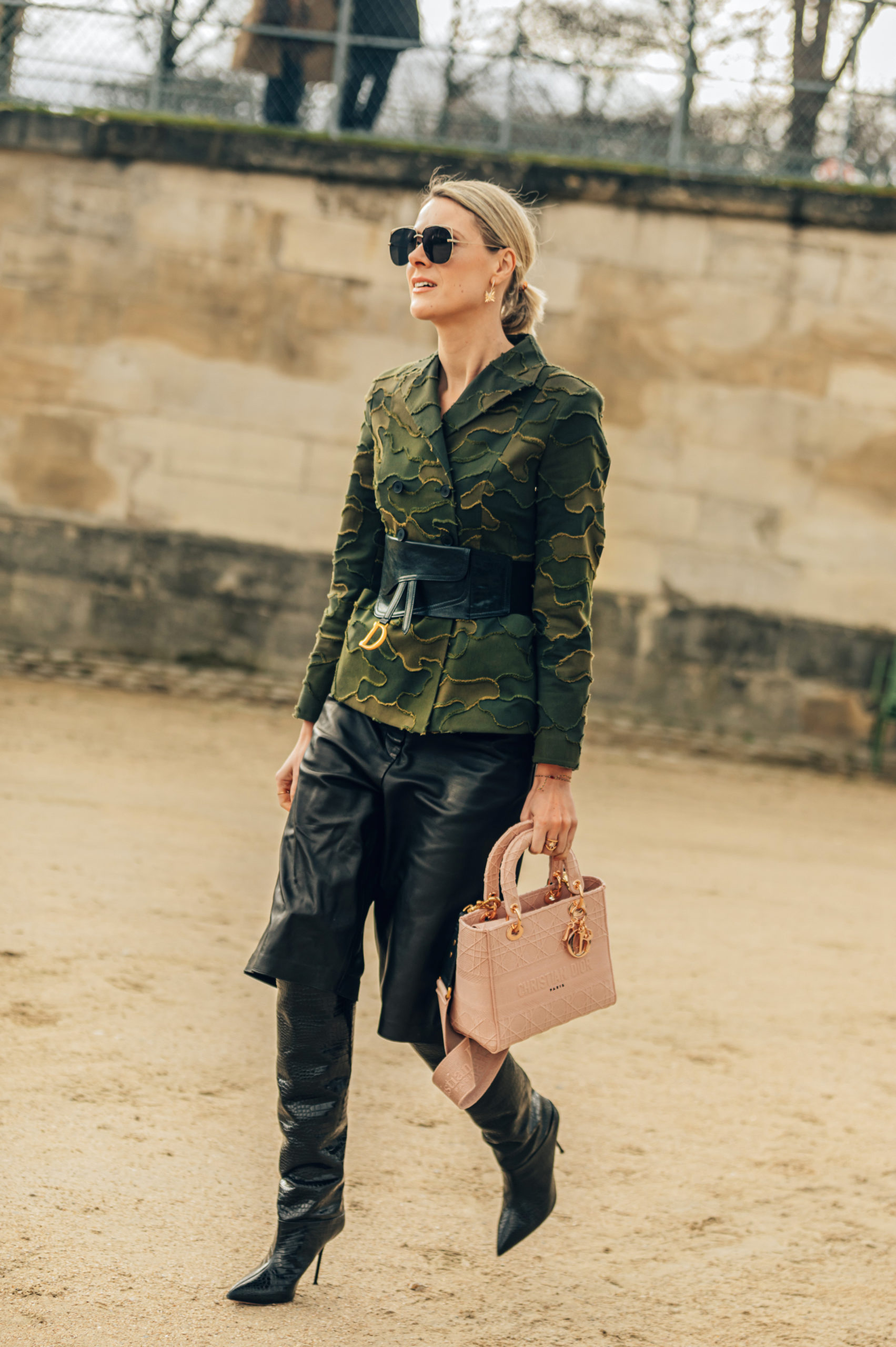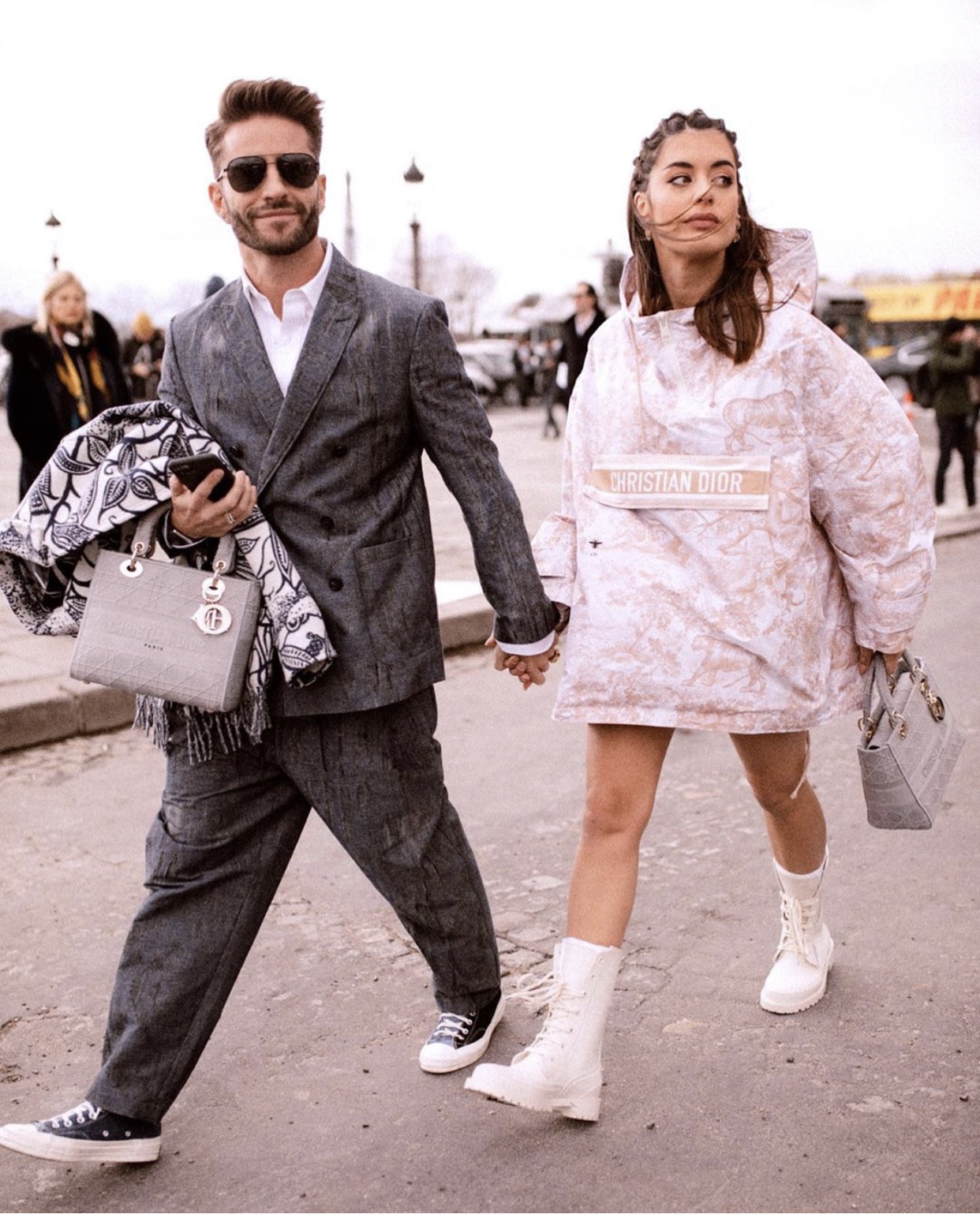 - PARIS, FRANCE – FEBRUARY 25: Romee Strijd wears sunglasses, a poncho/plaid dress with printed checked pattern and fringes, a Lady Dior bag, pearl earrings, outside Dior, during Paris Fashion Week – Womenswear Fall/Winter 2020/2021, on February 25, 2020 in Paris, France. (Photo by Edward Berthelot/Getty Images)