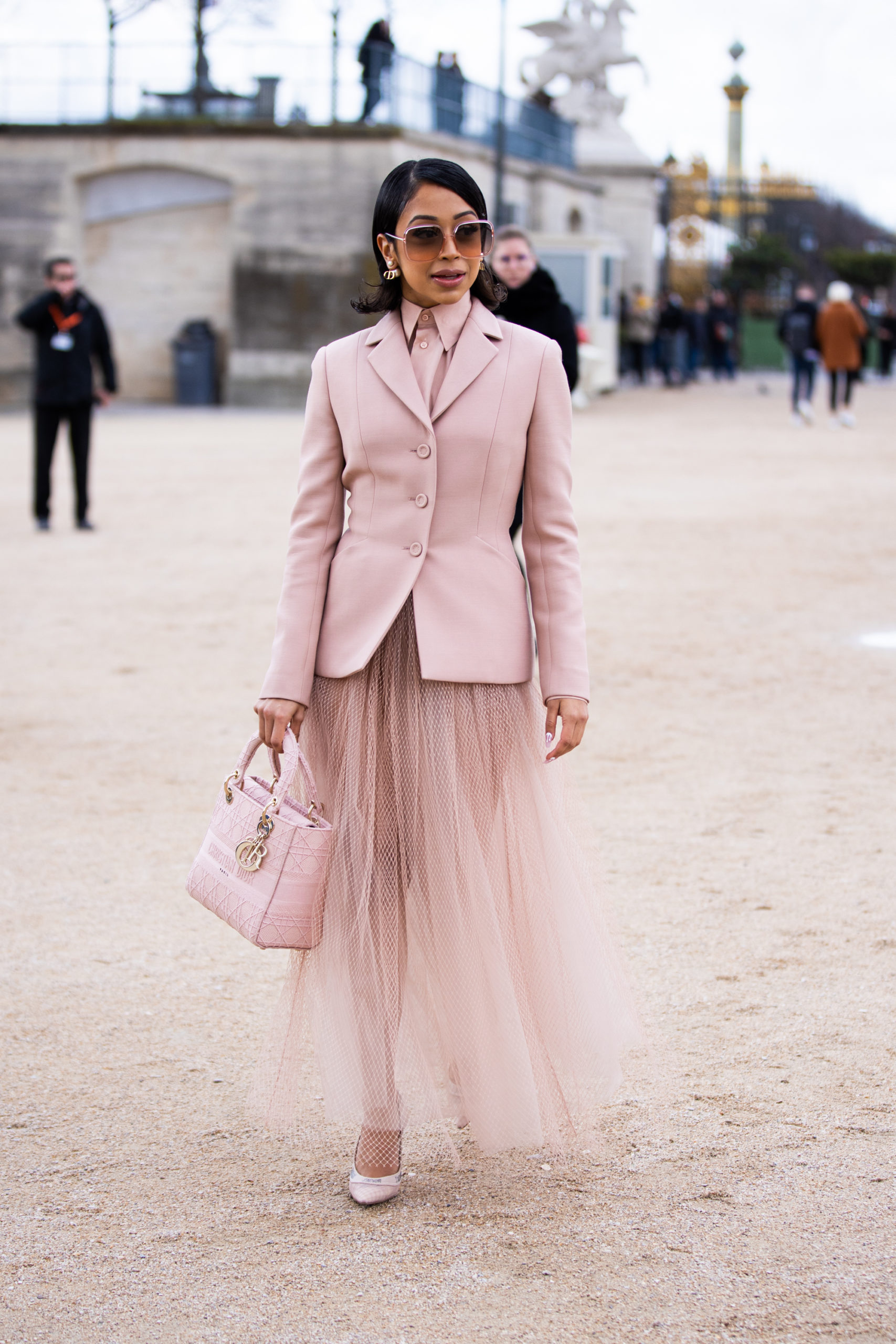 - PARIS, FRANCE – FEBRUARY 25: Liza Koshy, wearing a pink blazer, pink shirt, pink tulle maxi skirt, Dior bag and Dior heels, is seen outside Dior, during Paris Fashion Week – Womenswear Fall/Winter 2020/2021 : Day Two on February 25, 2020 in Paris, France. (Photo by Claudio Lavenia/Getty Images)