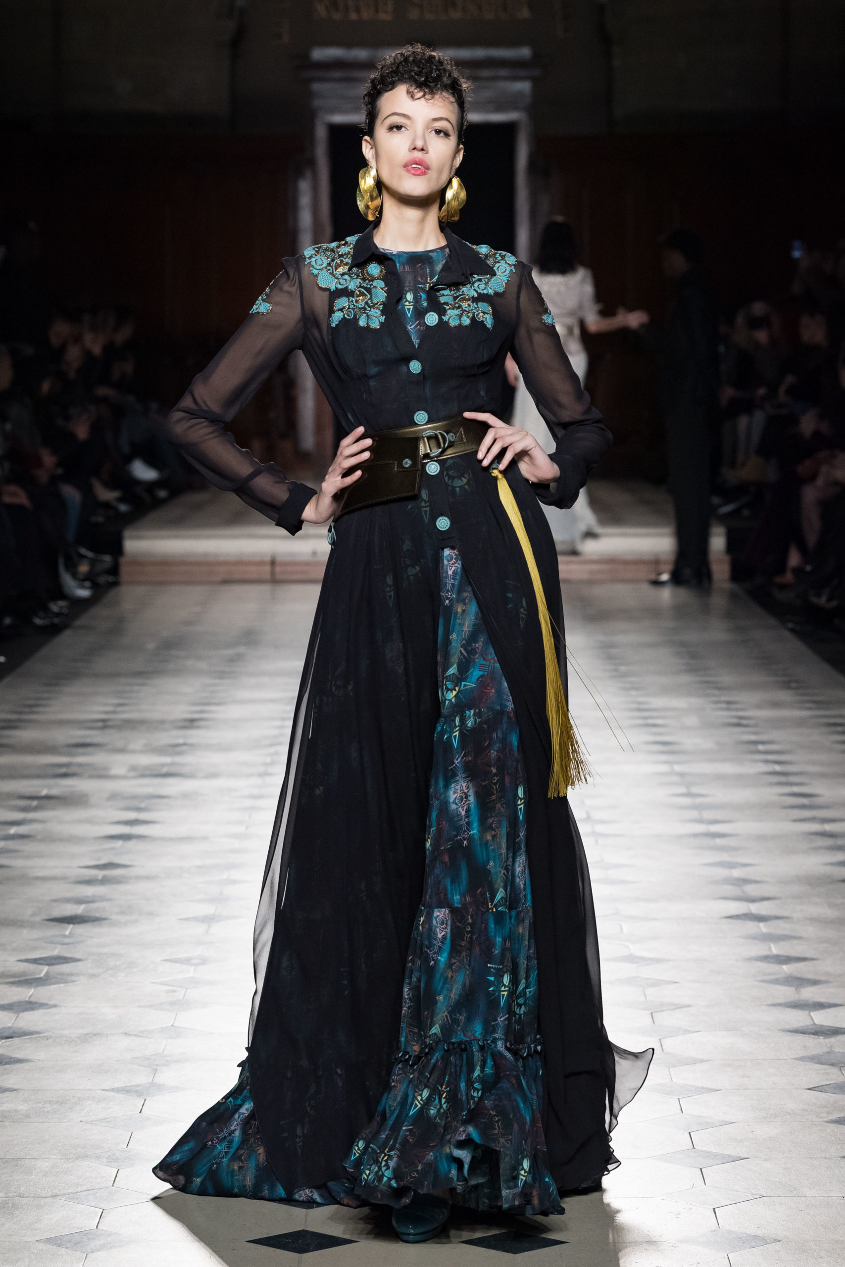 Qu’elles découvrent les civilisations précolombiennes d’Amérique du Sud, les tribus des peuples sans écriture d’Afrique ou les arts berbères et touaregs du Sahara, elles ne renoncent à rien et ne renient ni la société d’où elles viennent, ni les mondes qu’elles découvrent. Loin des valeurs masculines qui ont débouché sur la prédation, via la colonisation ou l’évangélisation, leurs conquêtes prônent, parfois au prix de leur vie, la découverte mutuelle, l’acceptation de la différence, l’entraide. Outre l’expédition qu’elles ont planifiée, organisée, financée, elles cherchent le sens caché du monde, au delà des apparences, des sexes et des frontières. Alliant le flegme à l’enthousiasme et la compassion, elles s’accommodent de tout, collectionnent les outils, les poteries, les bijoux se laissent transformer par la nature et se fondent dans le paysage sans rien perdre de leur panache. Maîtrisant la coupe, le couturier français construit des silhouettes qui en imposent autour de vêtements moins corsetés qu’à son habitude, parés de broderies-talismans ou de gris-gris comme recueillis au fil des rencontres et des découvertes, l’allure se structure souvent au moyen de ceintures à multiples lanières, comprenant sacs ou cartouchières qui symbolisent, passementeries comprises, l’indispensable équipement de ces conquérantes de nouveaux territoires. Loin de toute identification précise à une seule origine géographique ou ethnique, ces femmes mixent l’élégance de leur culture d’origine avec les fantastiques découvertes de celles qu’elles ont traversé à une interprétation personnelle toujours éloignée de n’importe quel communautarisme ou prosélytisme.