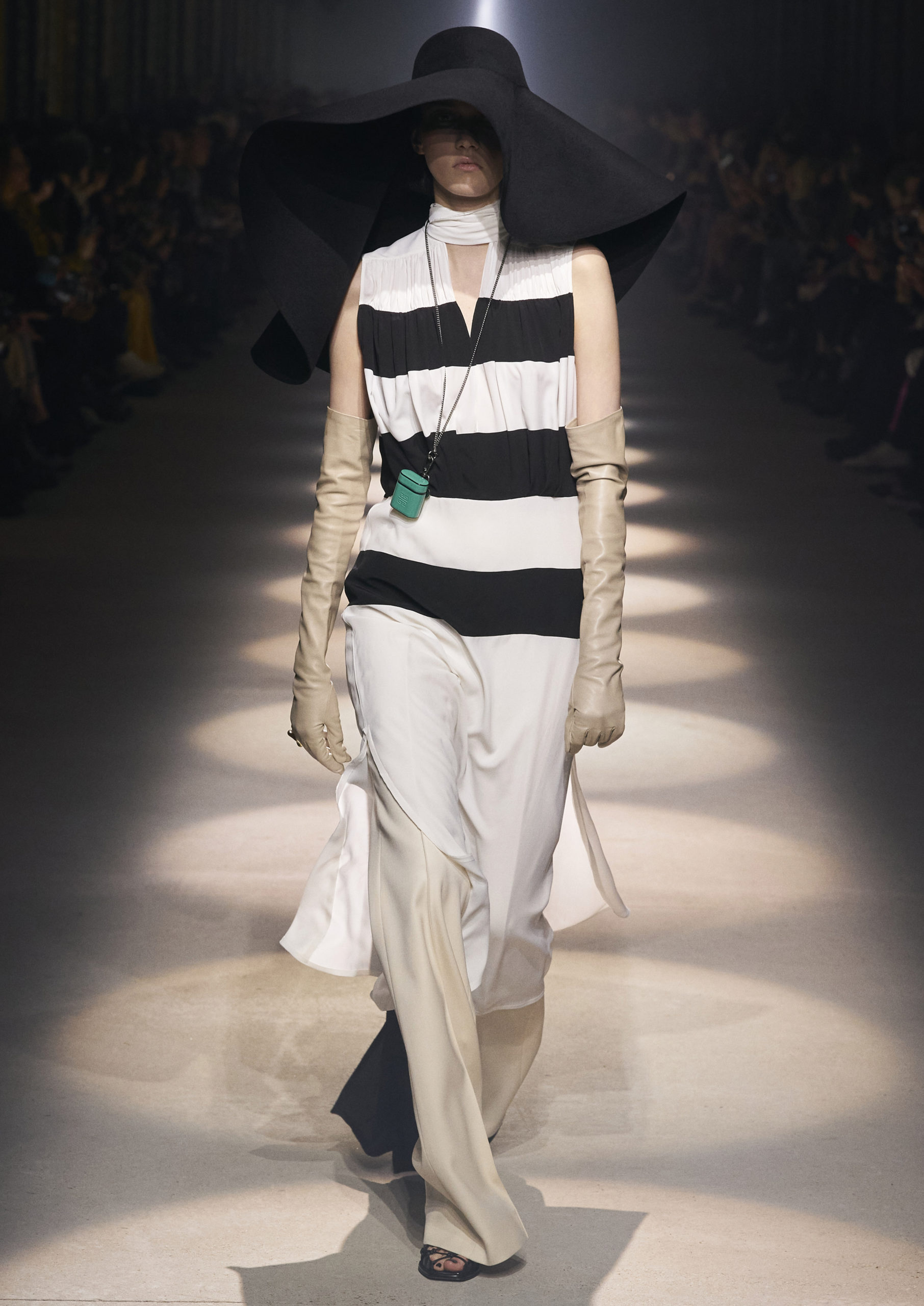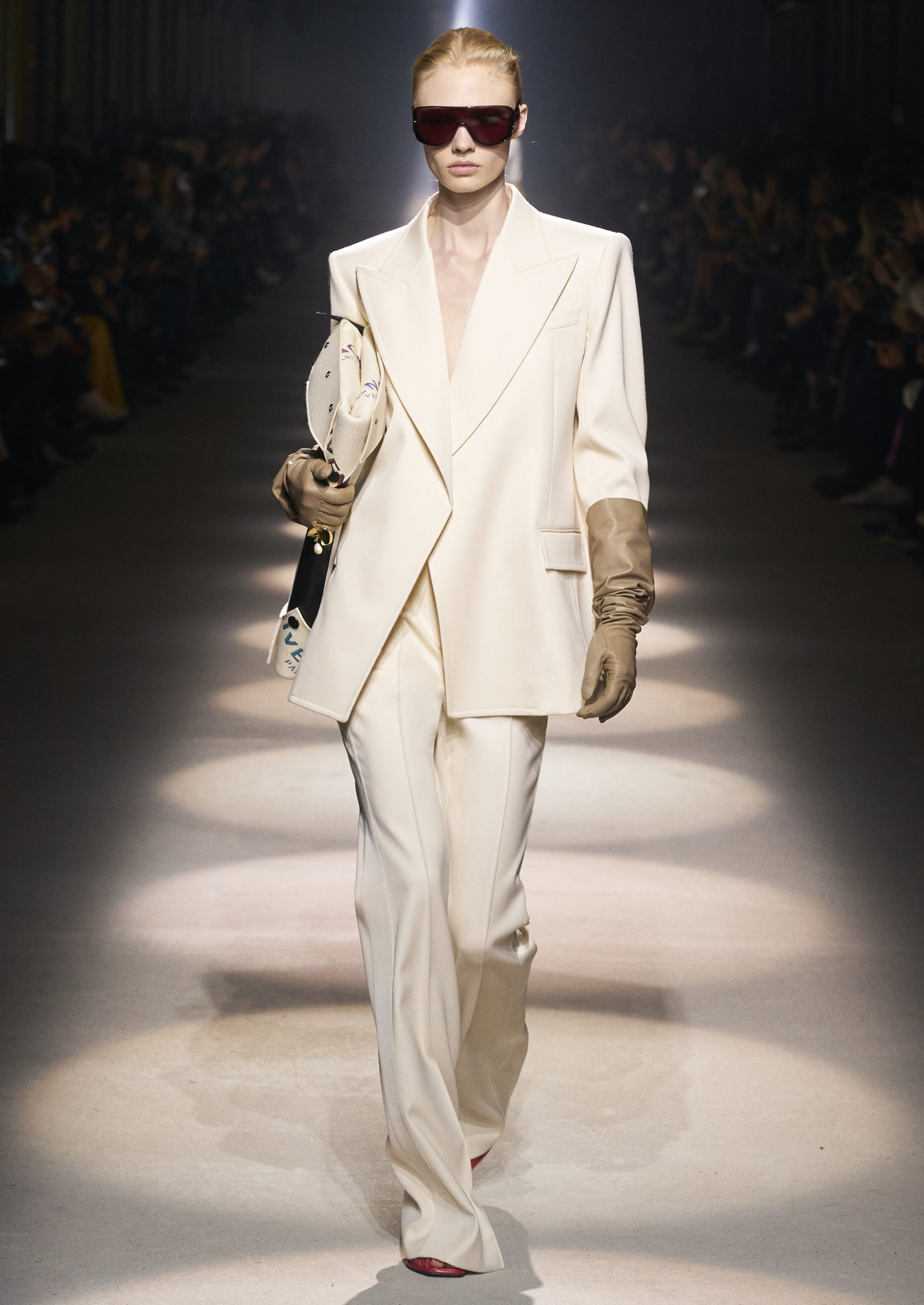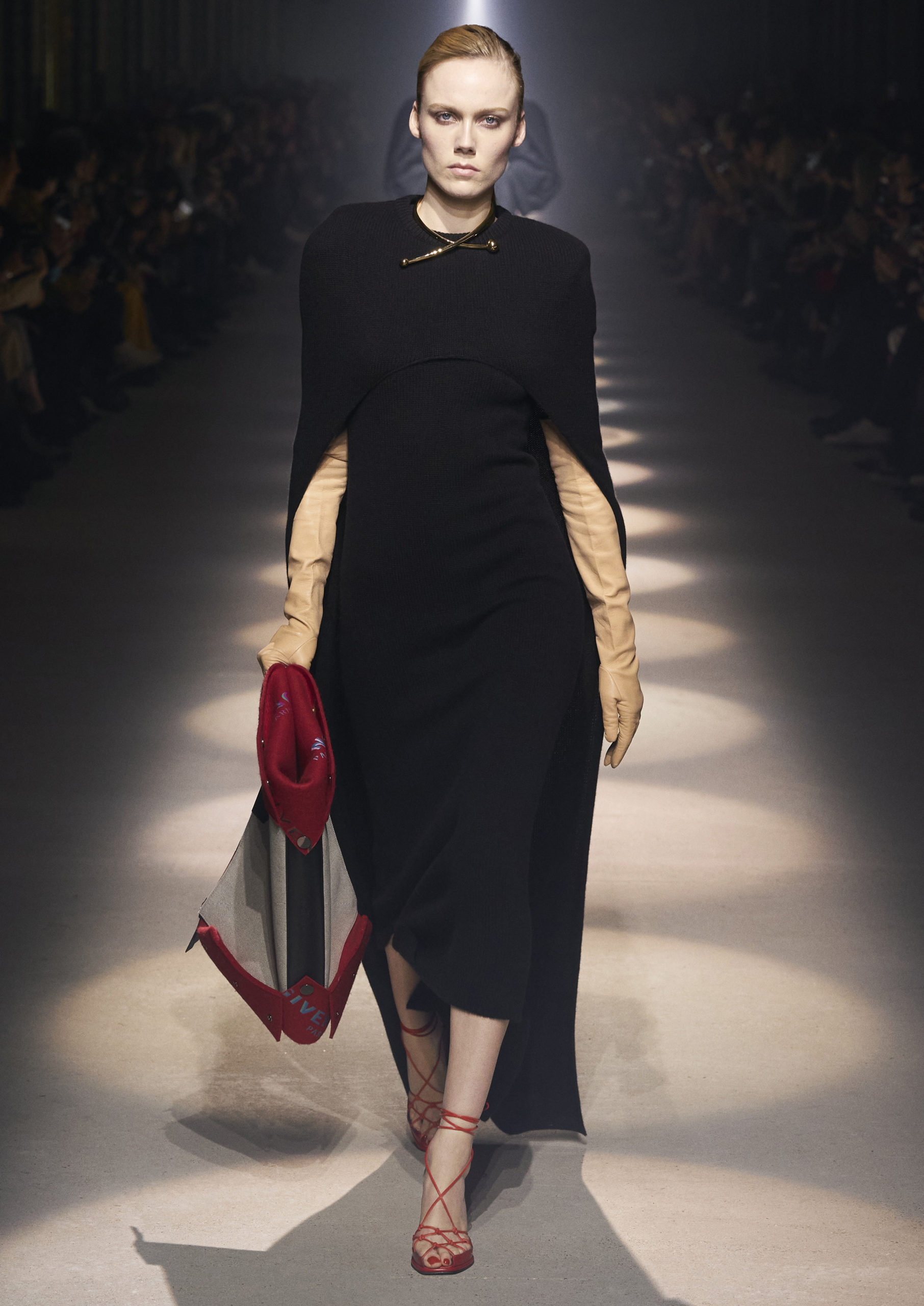 The Autumn Winter 2020 accessories collection sees a slim wedge or sandal laced up the ankle, and the Haute Couture ‘ombrelle’ hat return in soft felt. Articulated mobile pendants and pearls hang as body jewels. Designed by Clare Waight Keller, the GV3 returns in glossy spazzolato leather or tri-colour suede, and the Antigona Soft bagappears in its signature colors, wrapped in archive print silk foulards or inflated as a zipped and pleated pouch.
