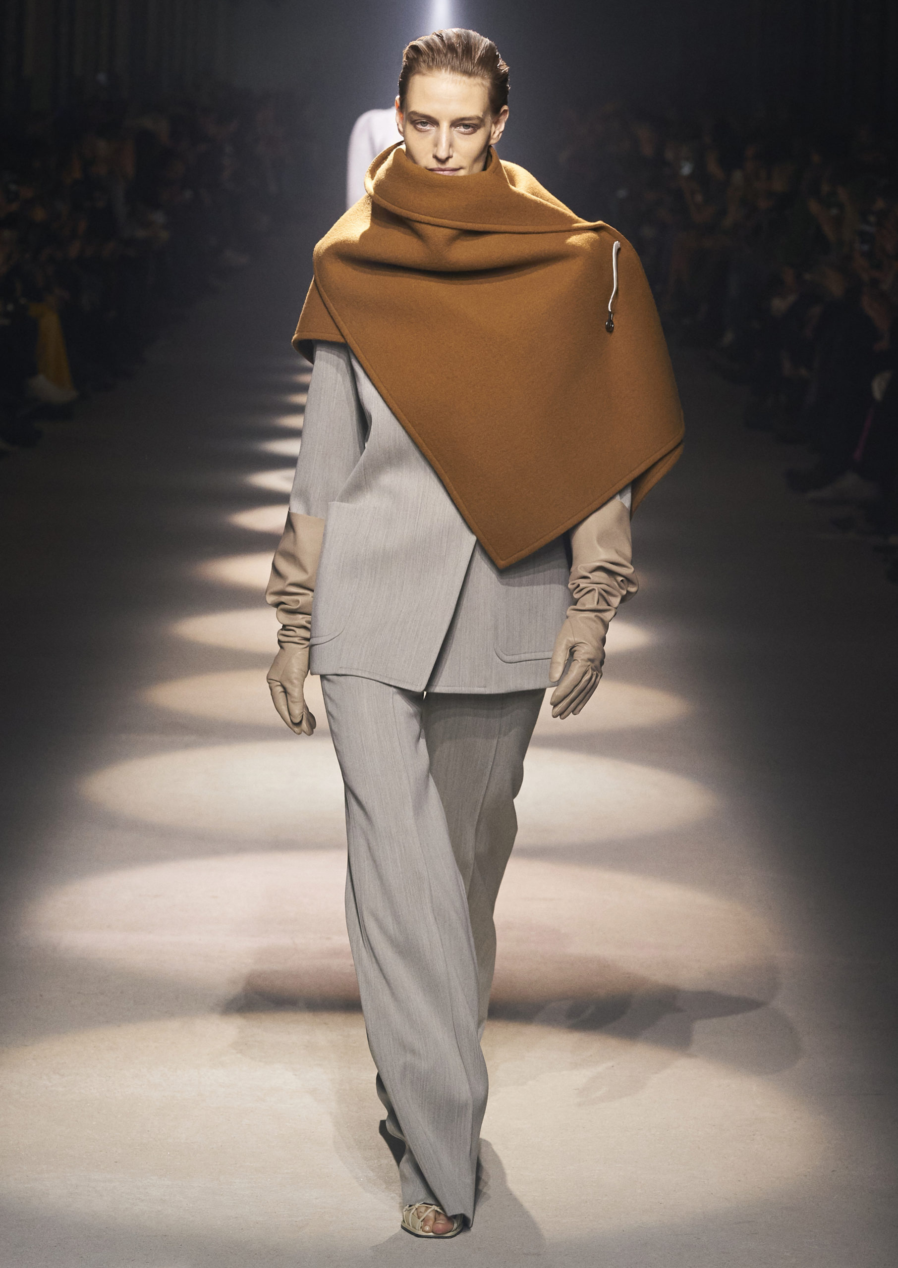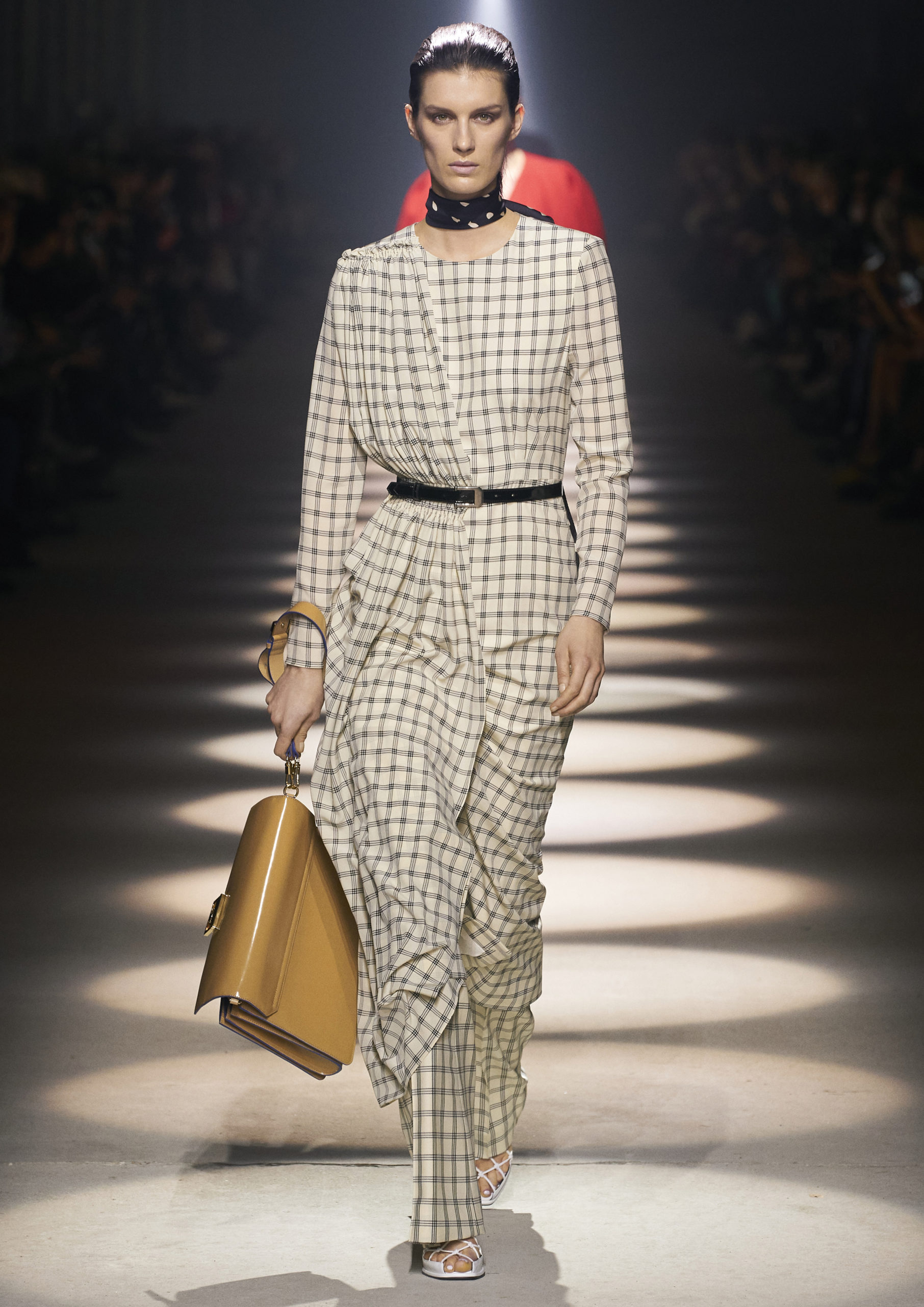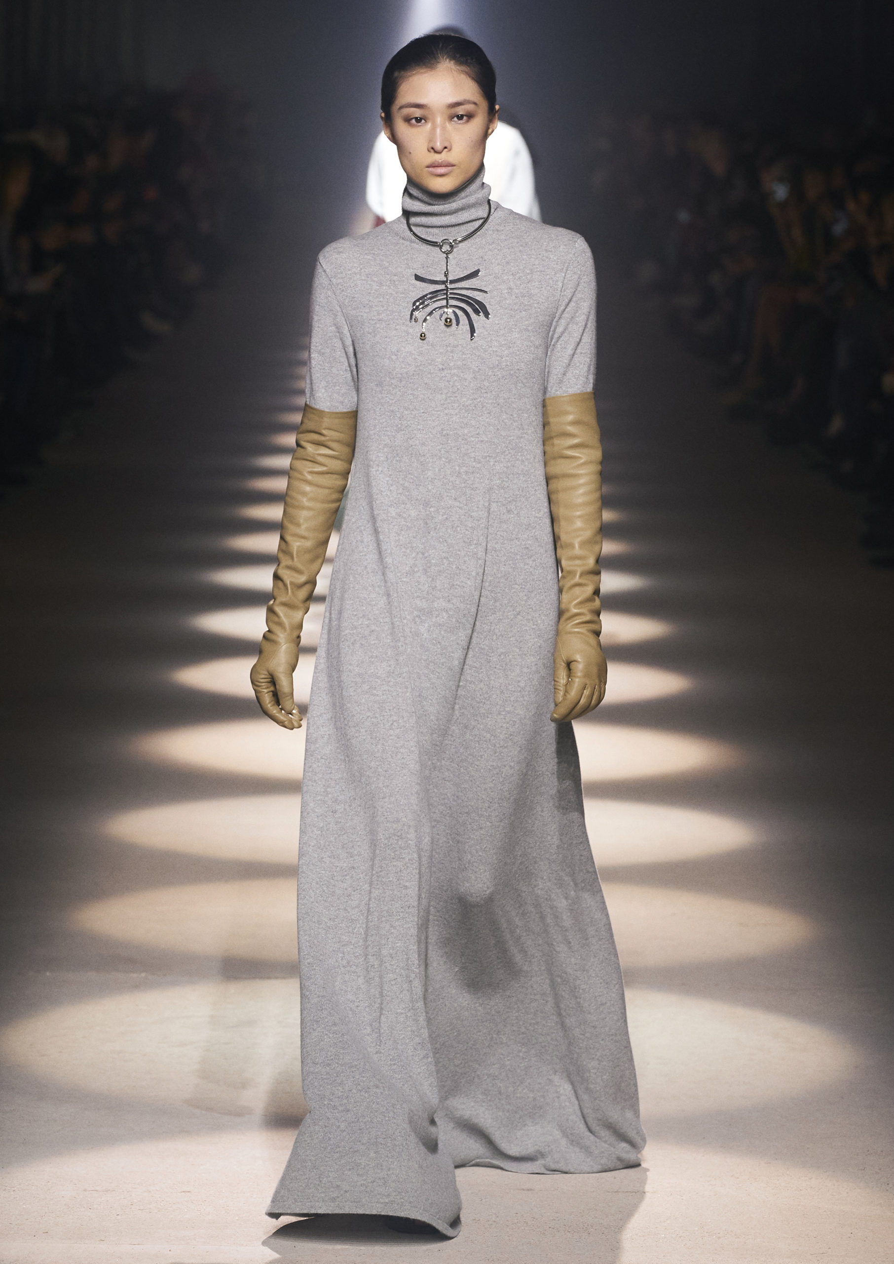 The Autumn Winter 2020 accessories collection sees a slim wedge or sandal laced up the ankle, and the Haute Couture ‘ombrelle’ hat return in soft felt. Articulated mobile pendants and pearls hang as body jewels. Designed by Clare Waight Keller, the GV3 returns in glossy spazzolato leather or tri-colour suede, and the Antigona Soft bagappears in its signature colors, wrapped in archive print silk foulards or inflated as a zipped and pleated pouch.