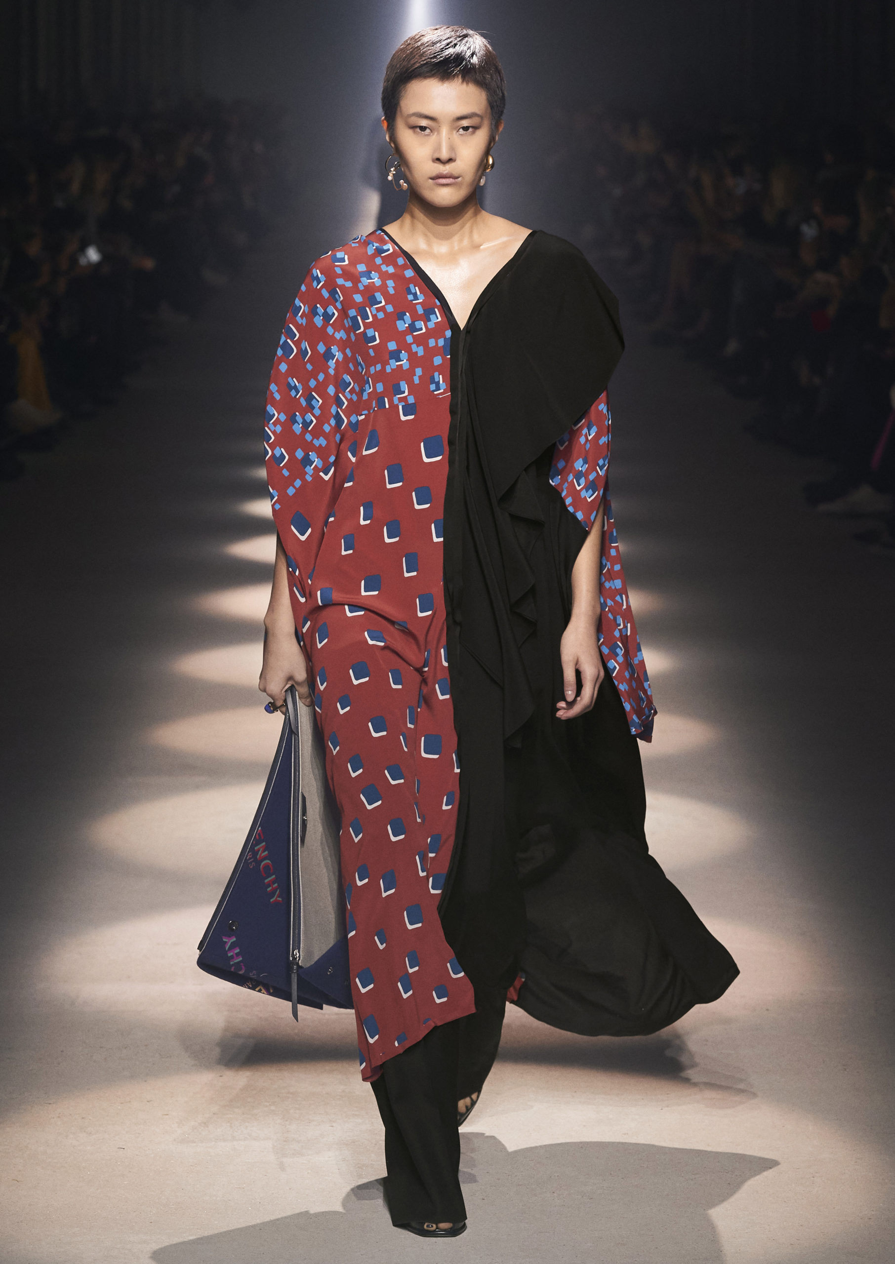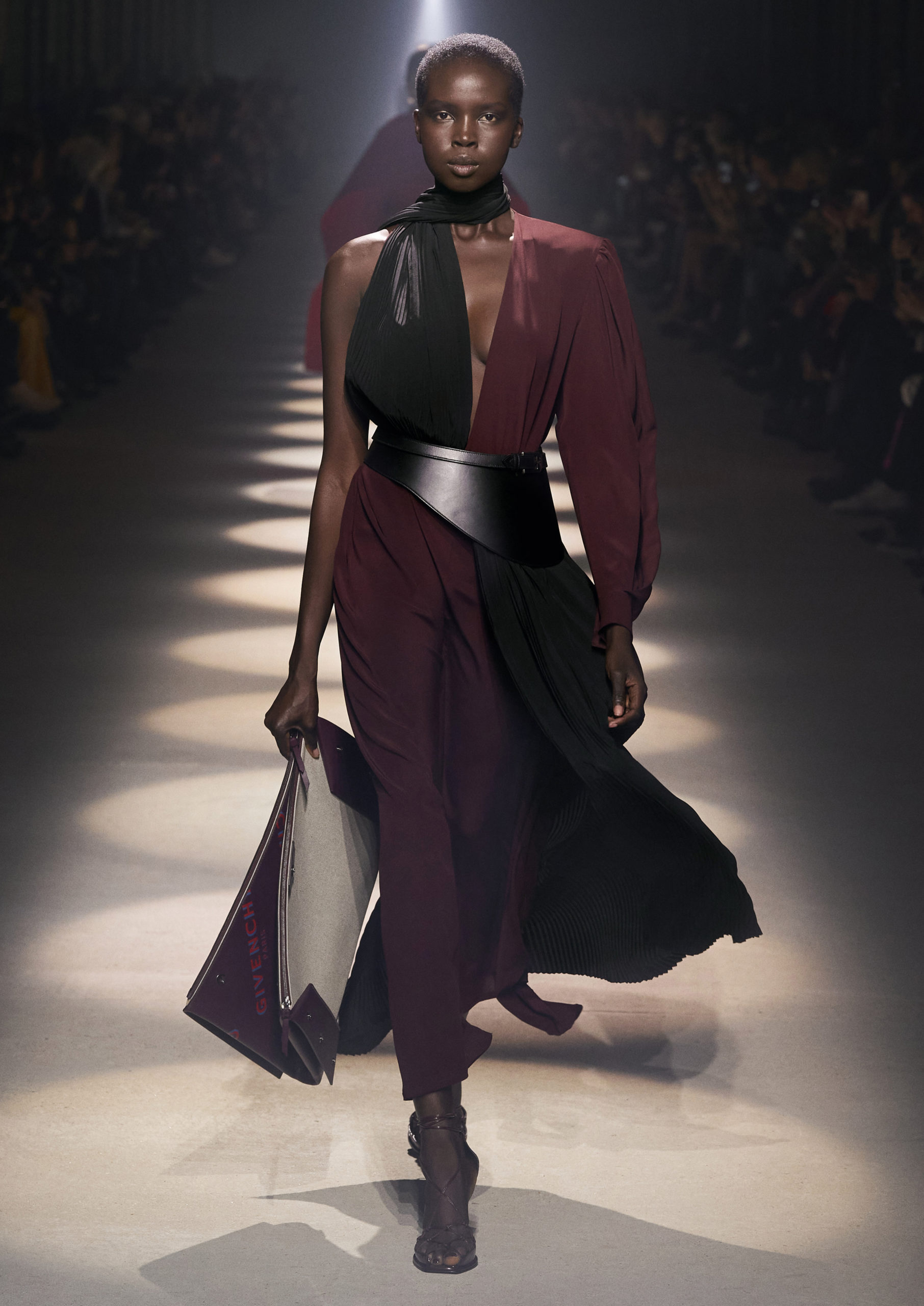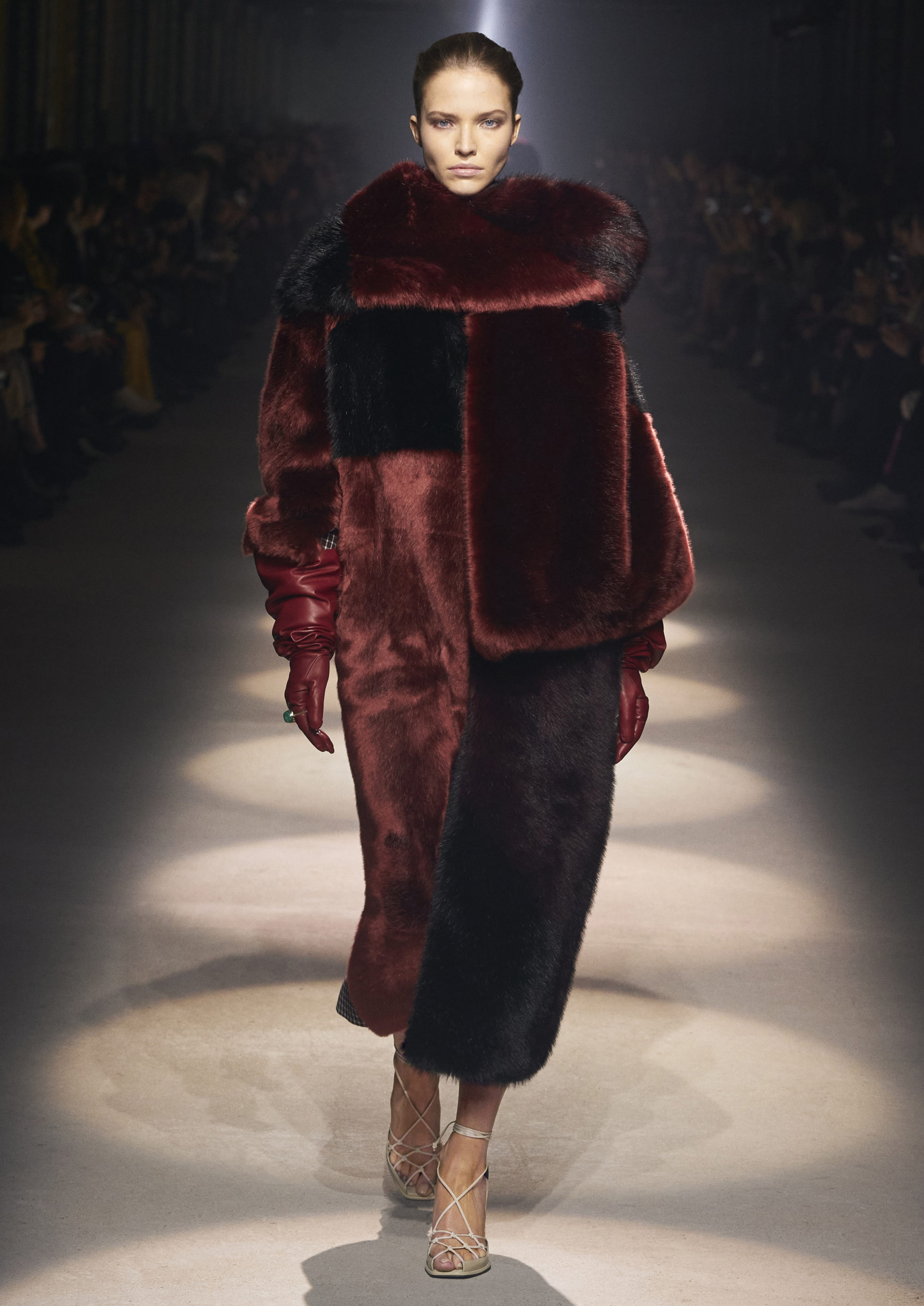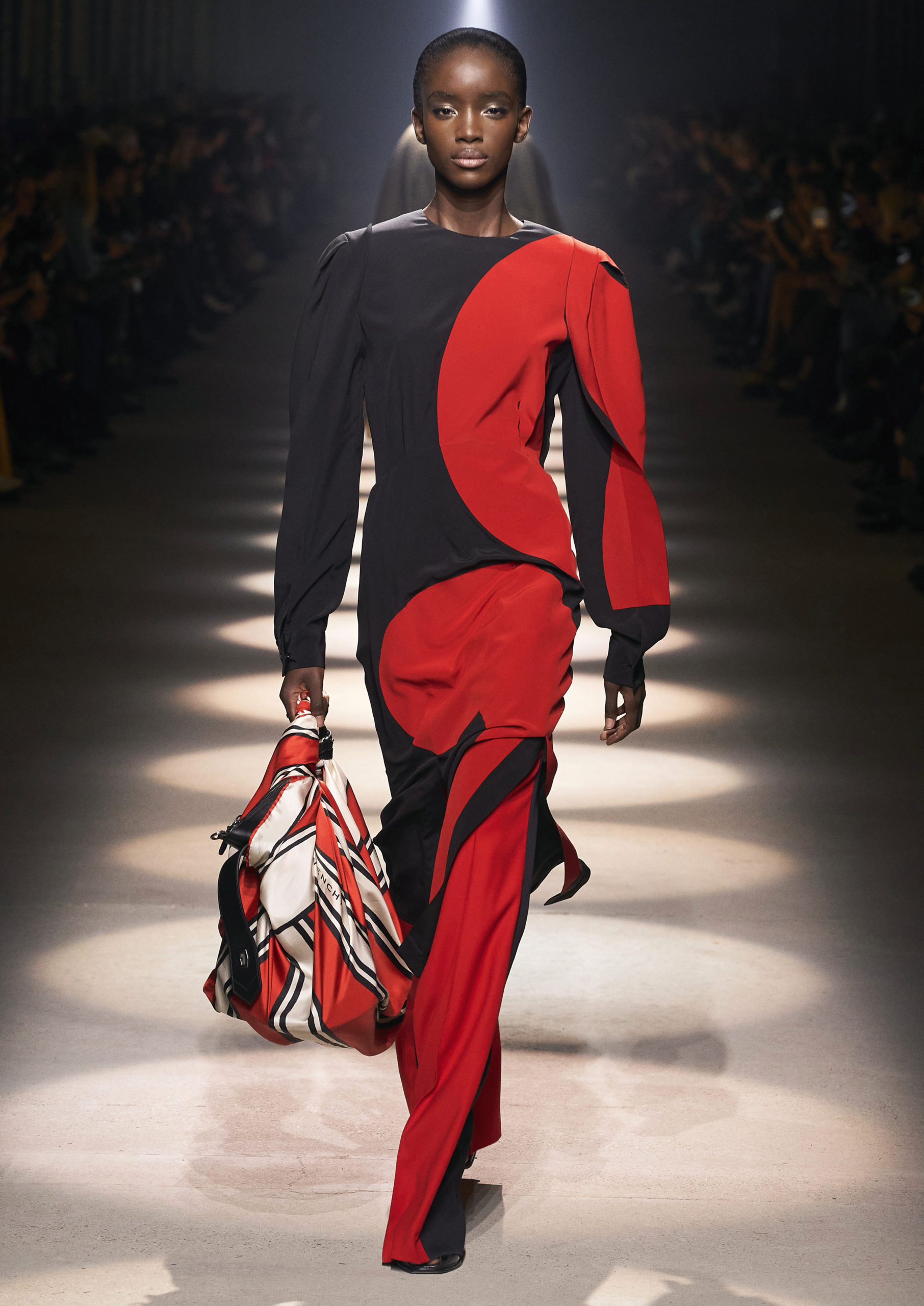 From the actress’ sultry gaze to the bodily gestures of human sculpture, lines are drawn between the gritty heyday of French cinema and musings on performance art. The collection punctuates Givenchy’s sartorial canon with a distinctly graphic story in a Mod palette blocked out in black, white and cherry red, tobacco, carnelian and cobalt.