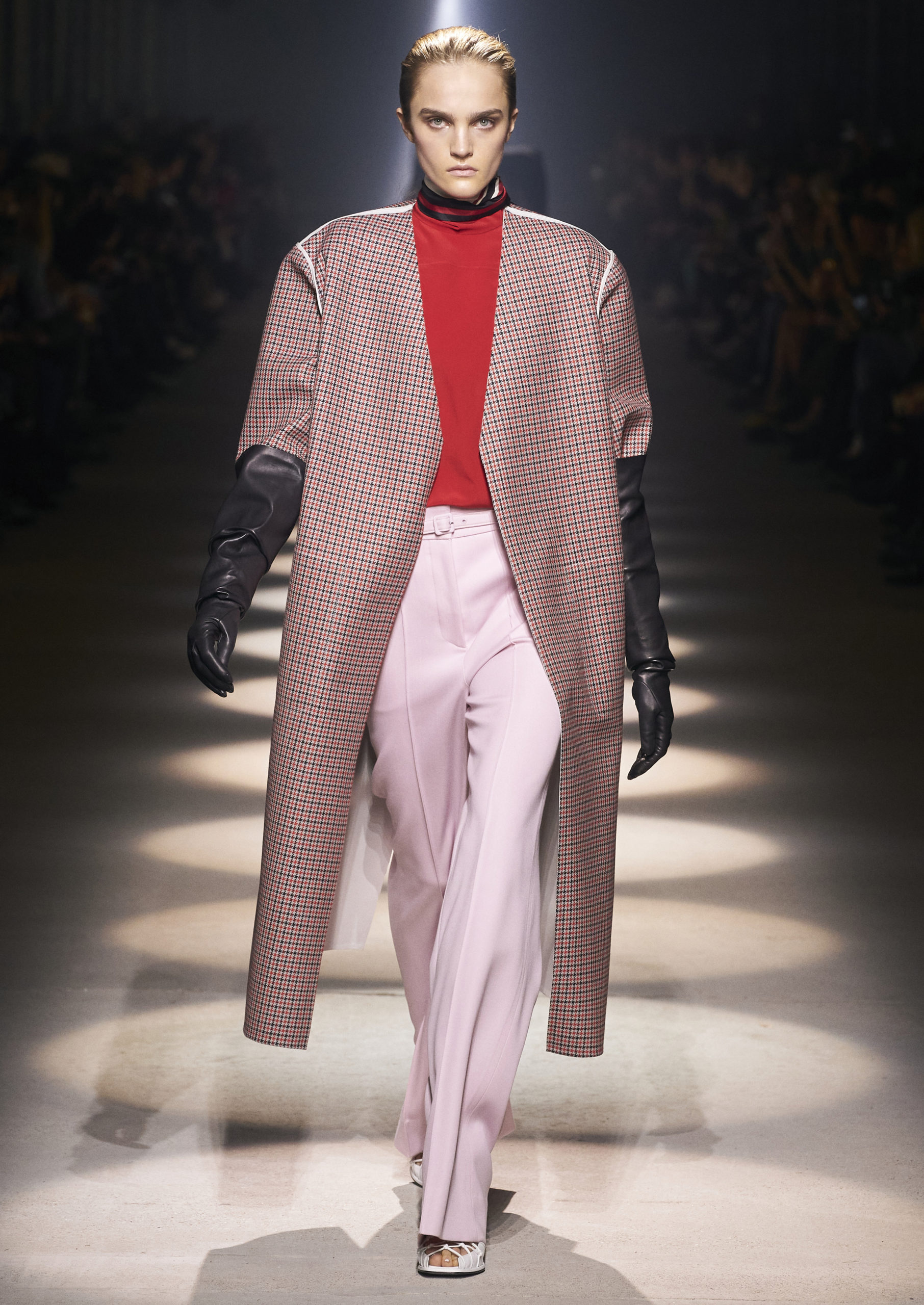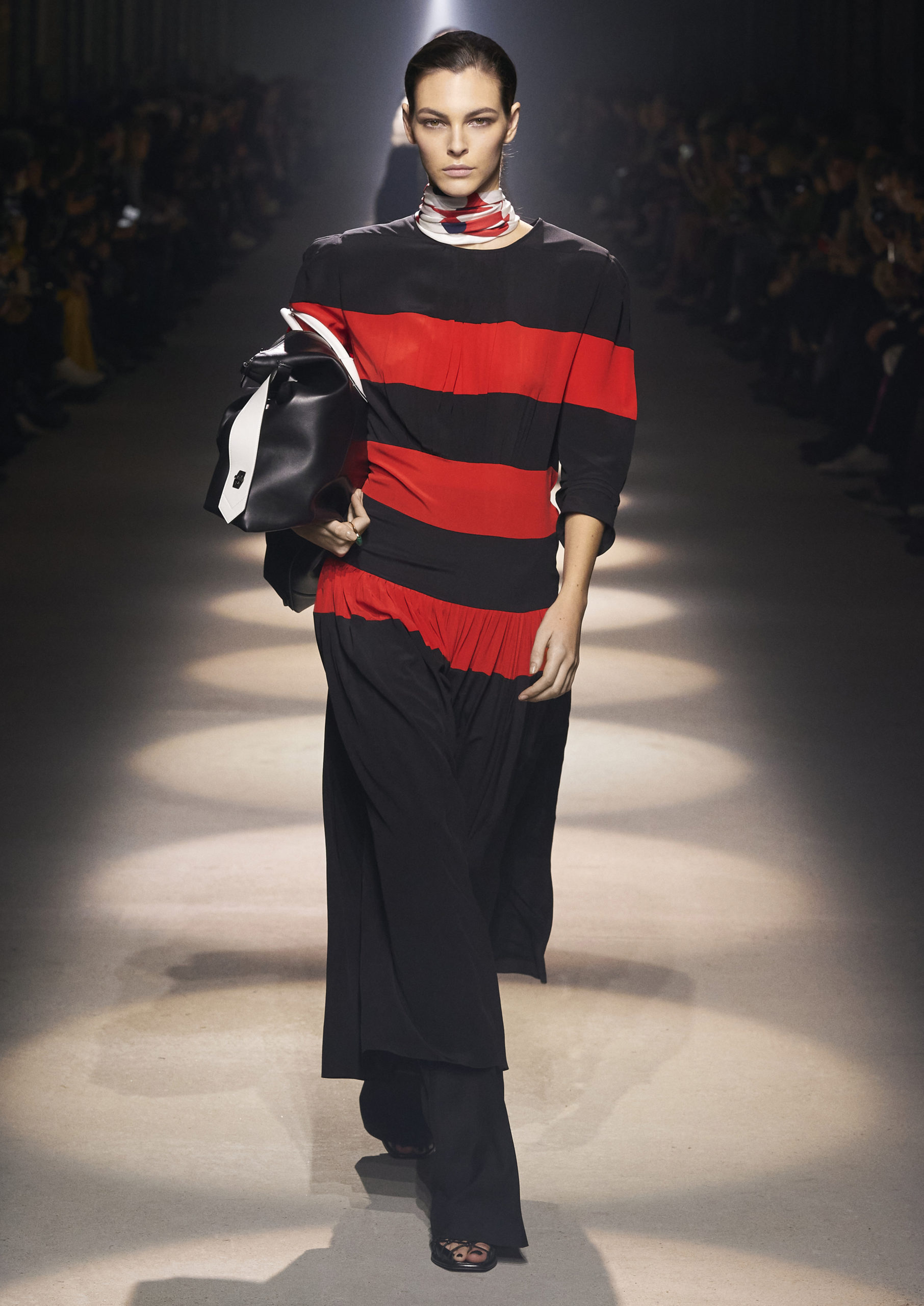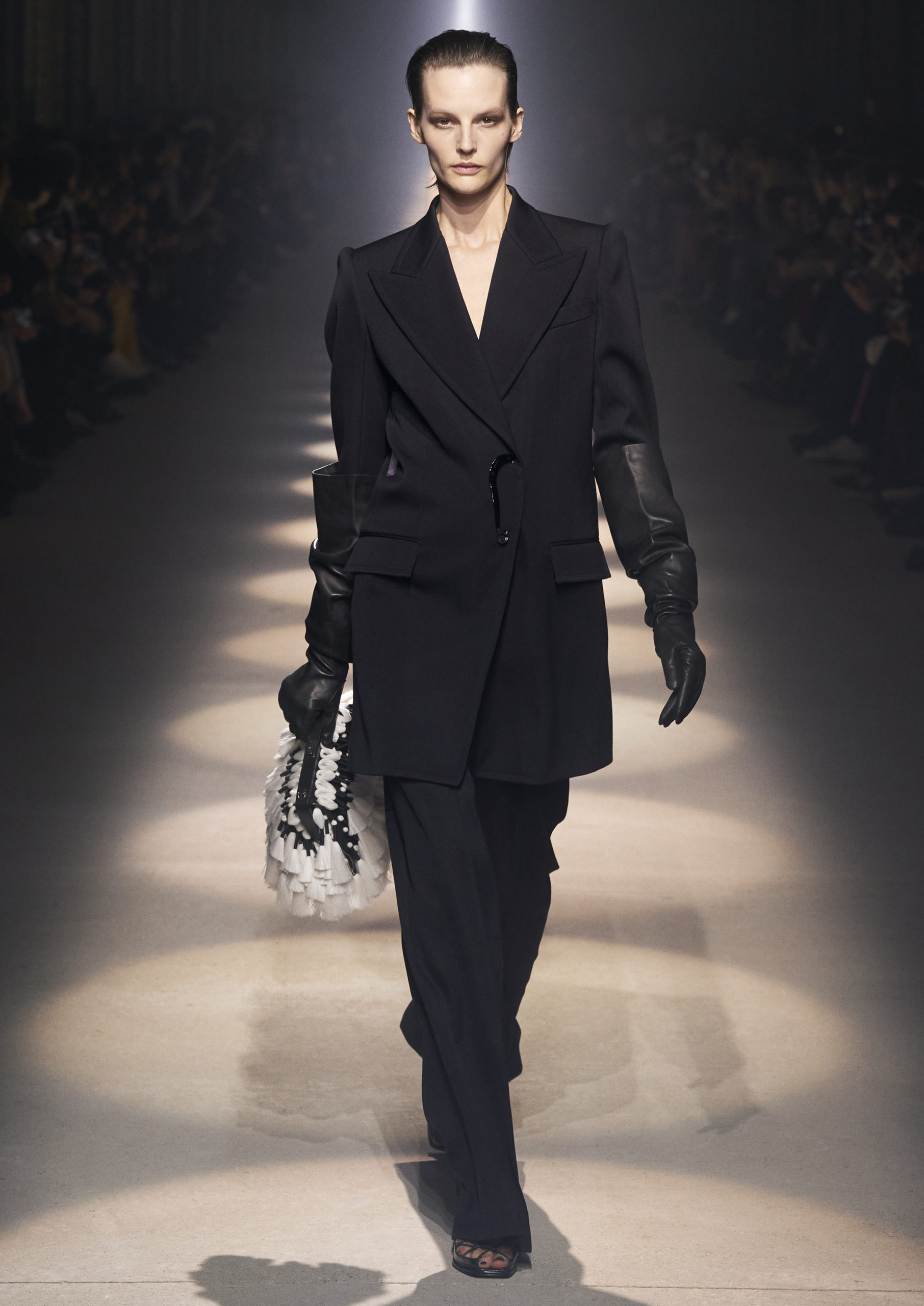 From the actress’ sultry gaze to the bodily gestures of human sculpture, lines are drawn between the gritty heyday of French cinema and musings on performance art. The collection punctuates Givenchy’s sartorial canon with a distinctly graphic story in a Mod palette blocked out in black, white and cherry red, tobacco, carnelian and cobalt.