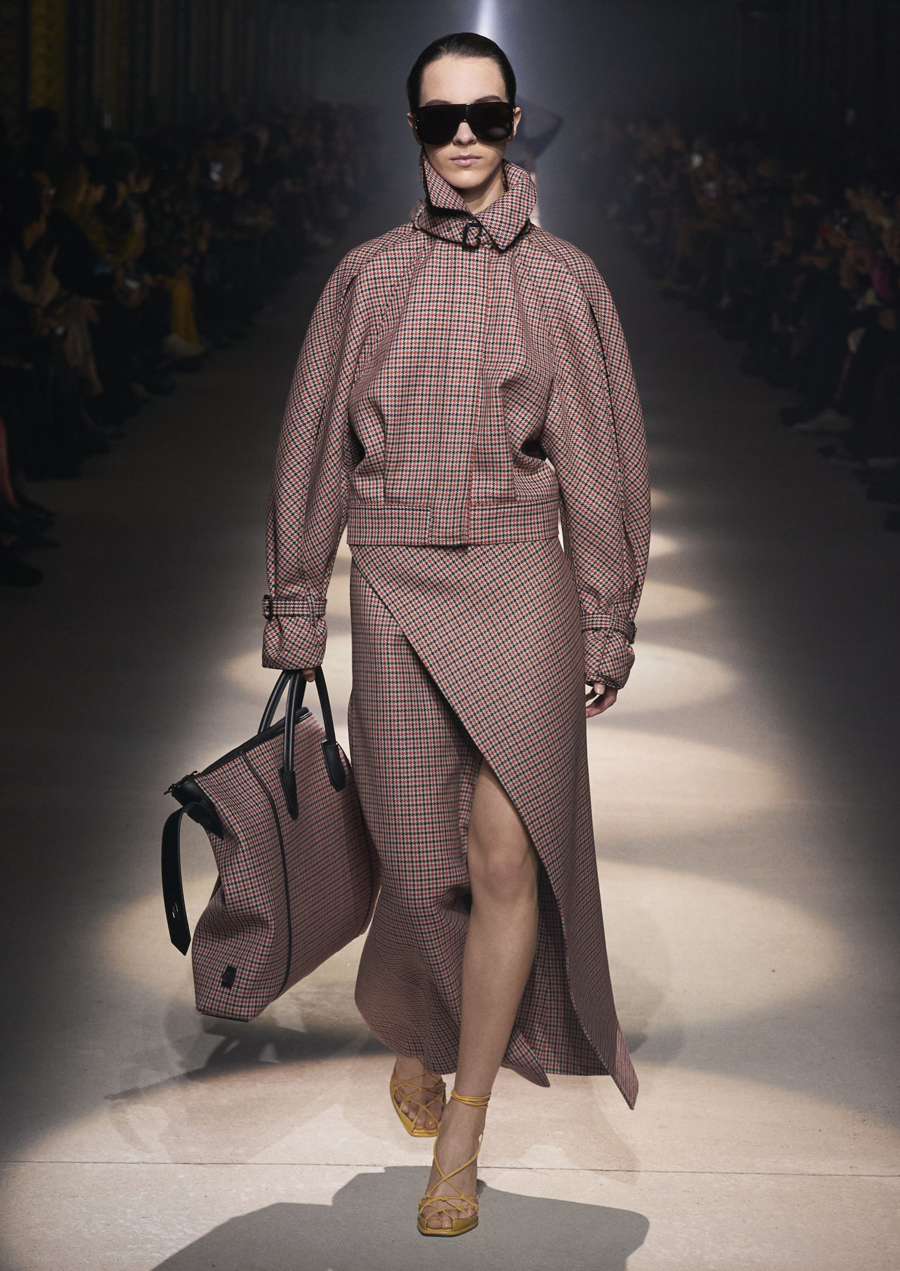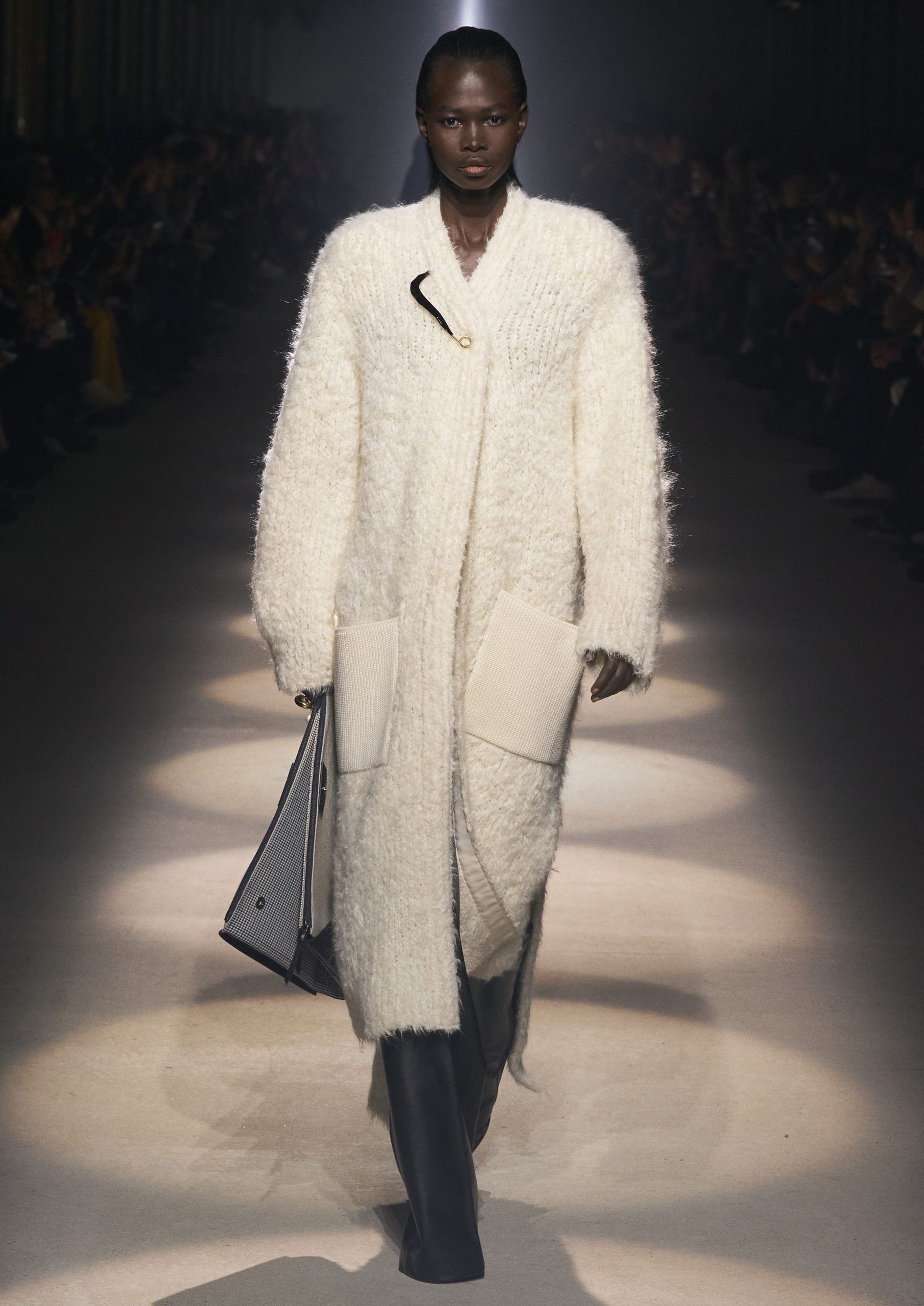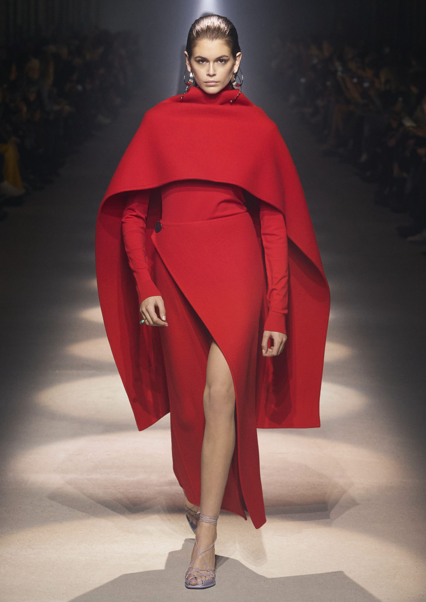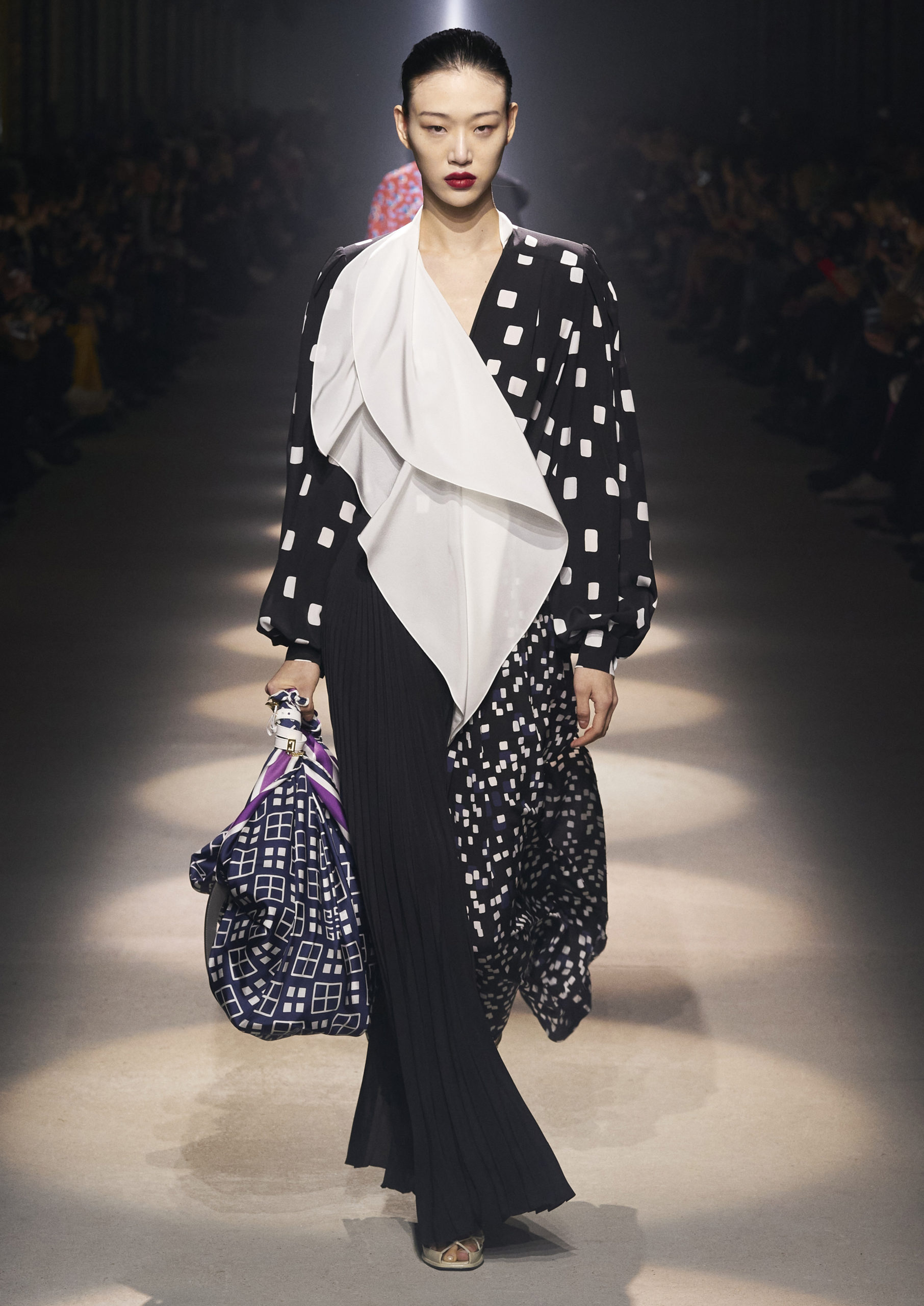 From the actress’ sultry gaze to the bodily gestures of human sculpture, lines are drawn between the gritty heyday of French cinema and musings on performance art. The collection punctuates Givenchy’s sartorial canon with a distinctly graphic story in a Mod palette blocked out in black, white and cherry red, tobacco, carnelian and cobalt.