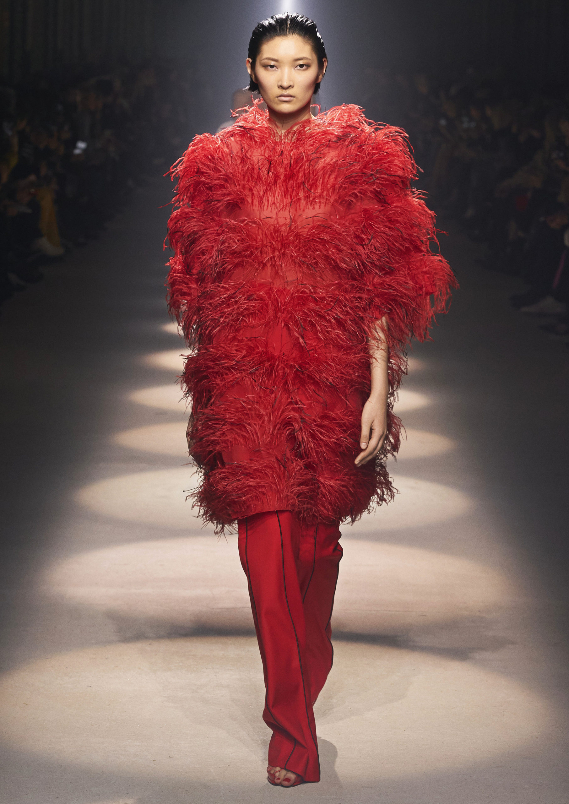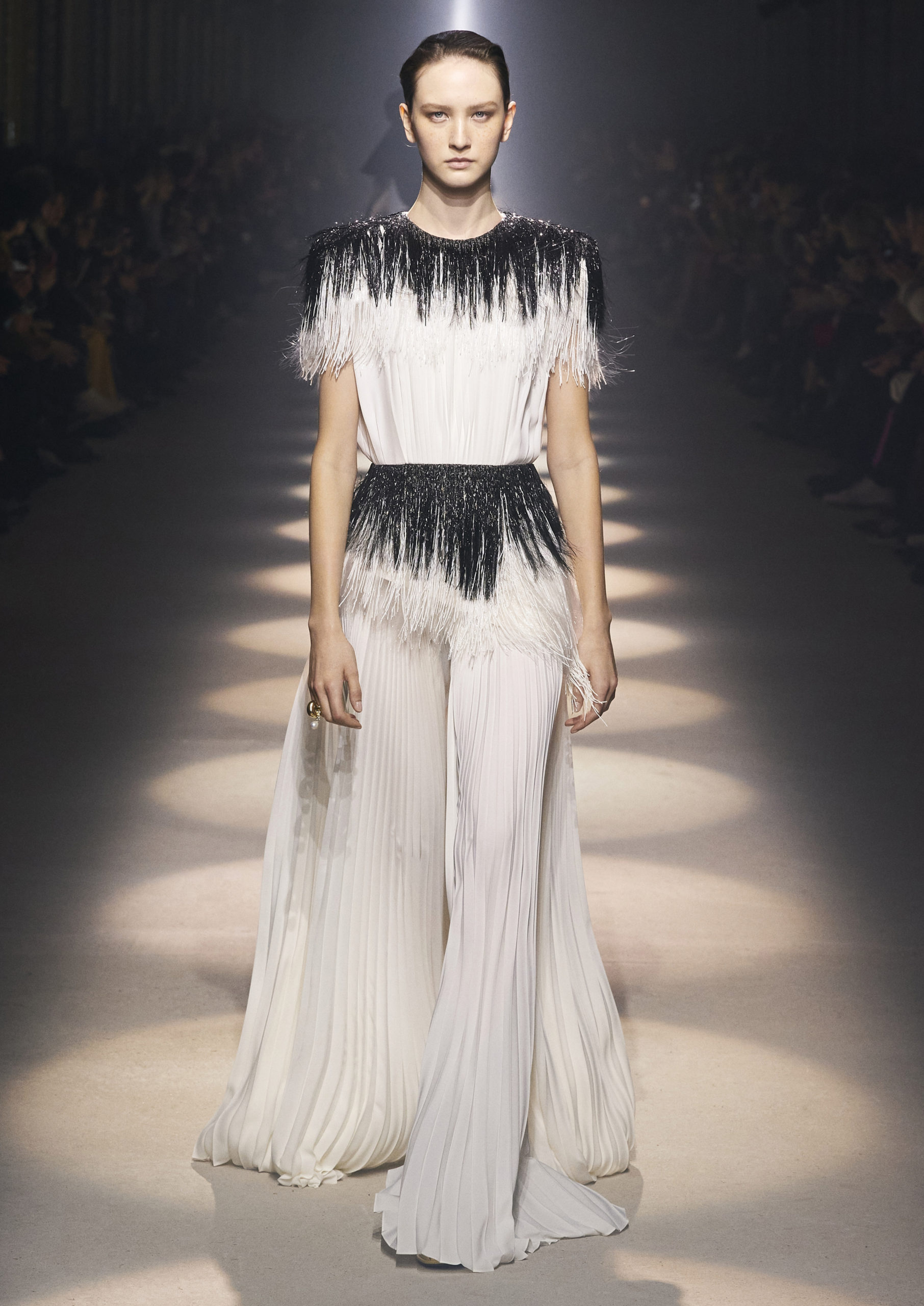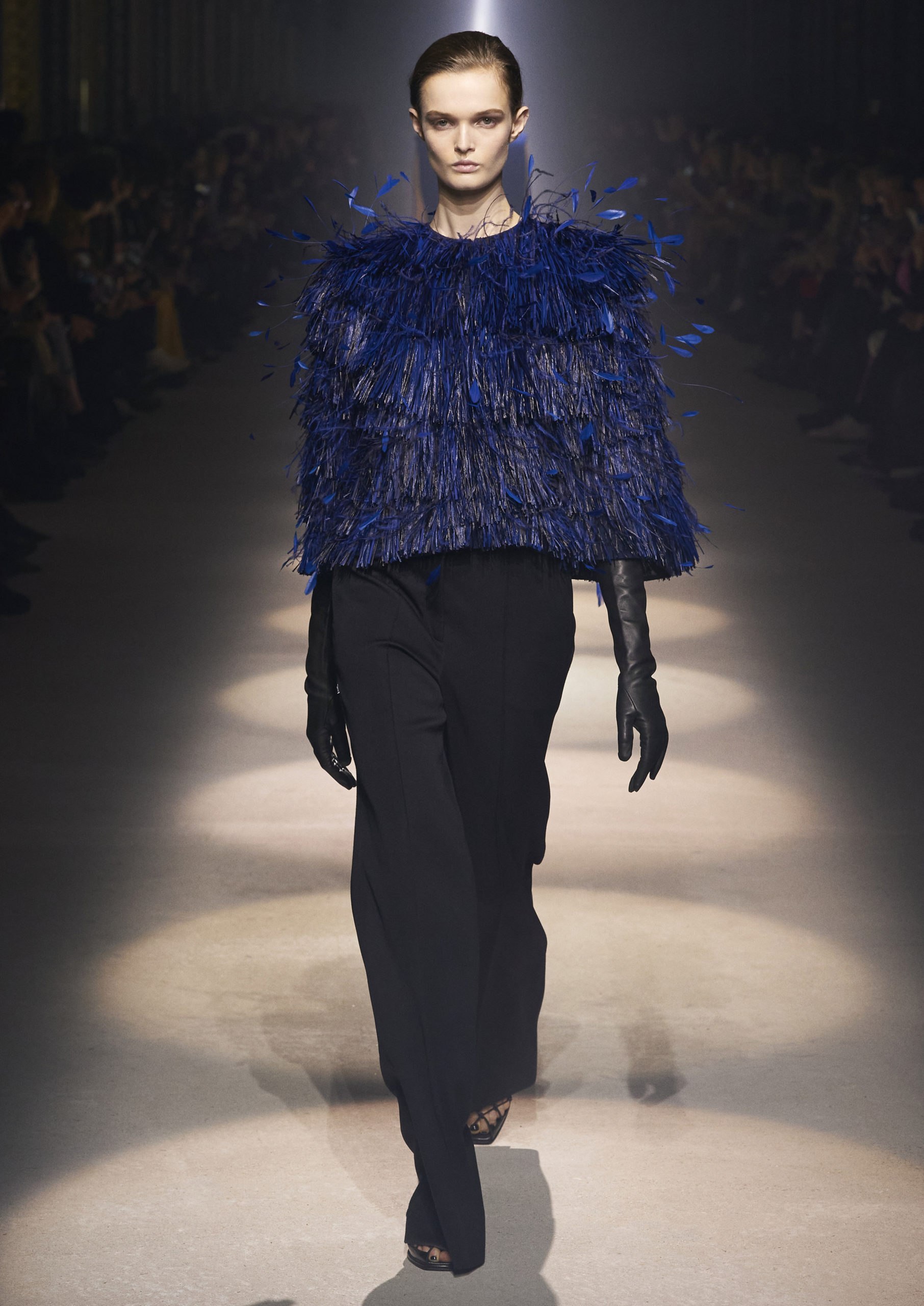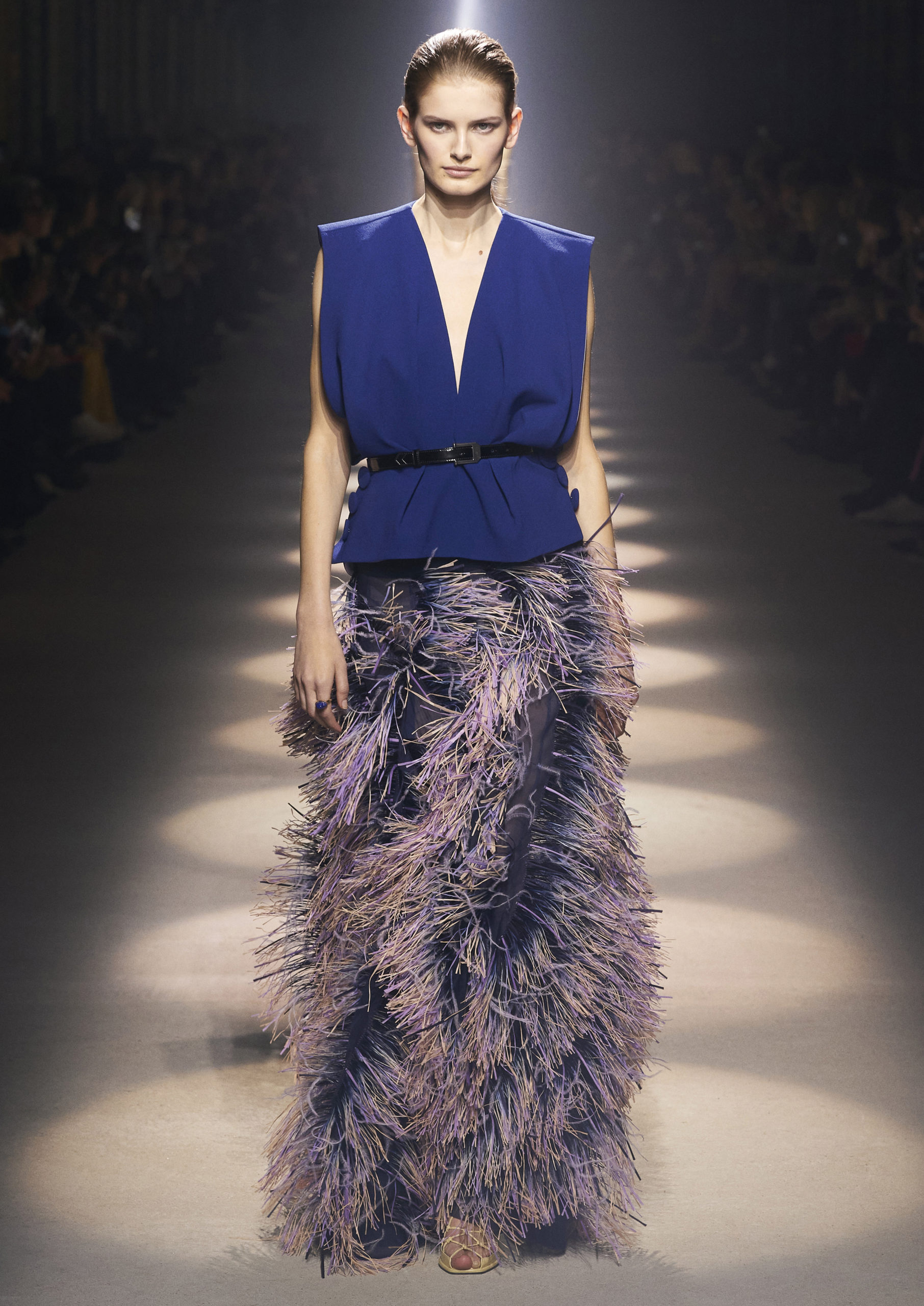Raw cut and collaged fabrics liberate masterful volumes with an untamed elegance, as shirred blouses and knife-pleated shifts are bonded with mulberry silk crêpe, and pagoda shoulder cape and coat styles are cut in fine double-faced Melton. Tailoring is languid: high-waist flares piped with contrast tones, peak lapel blazers, and a reversible duster coat lined in smooth leather. Sculpted knits and plush faux furs hug the body in shadowy folds. Riffing on the apostrophe, the stripe and the square, patterns and embroideries adorn mid-century shapes in cascading pleats and embroideries, from liquid silver sequins to showers of plumage, tinsel, tassels and bugle beading.