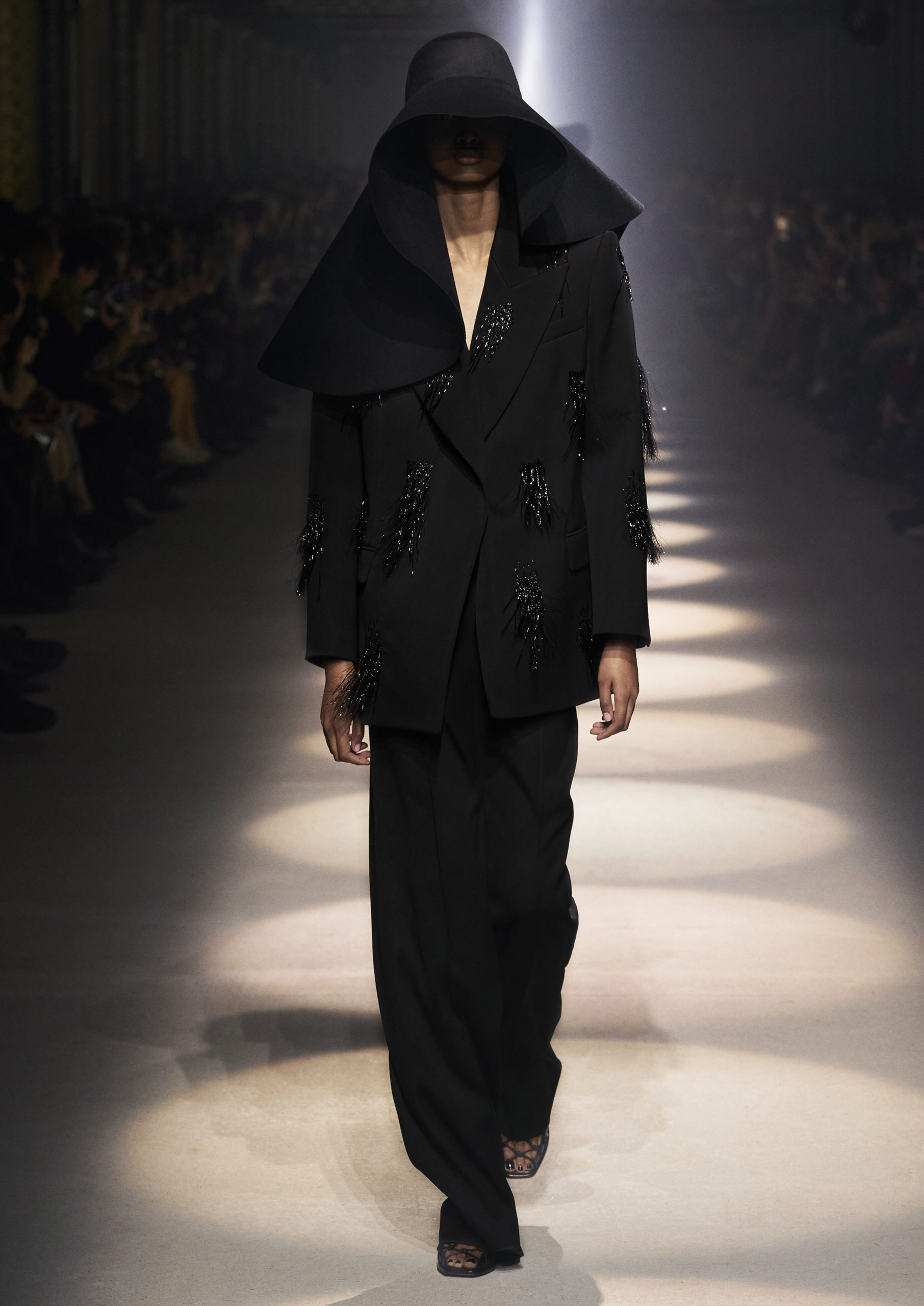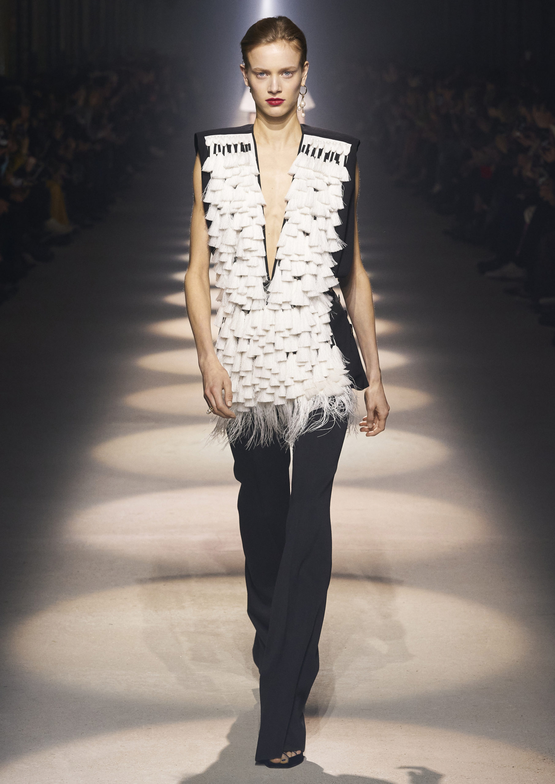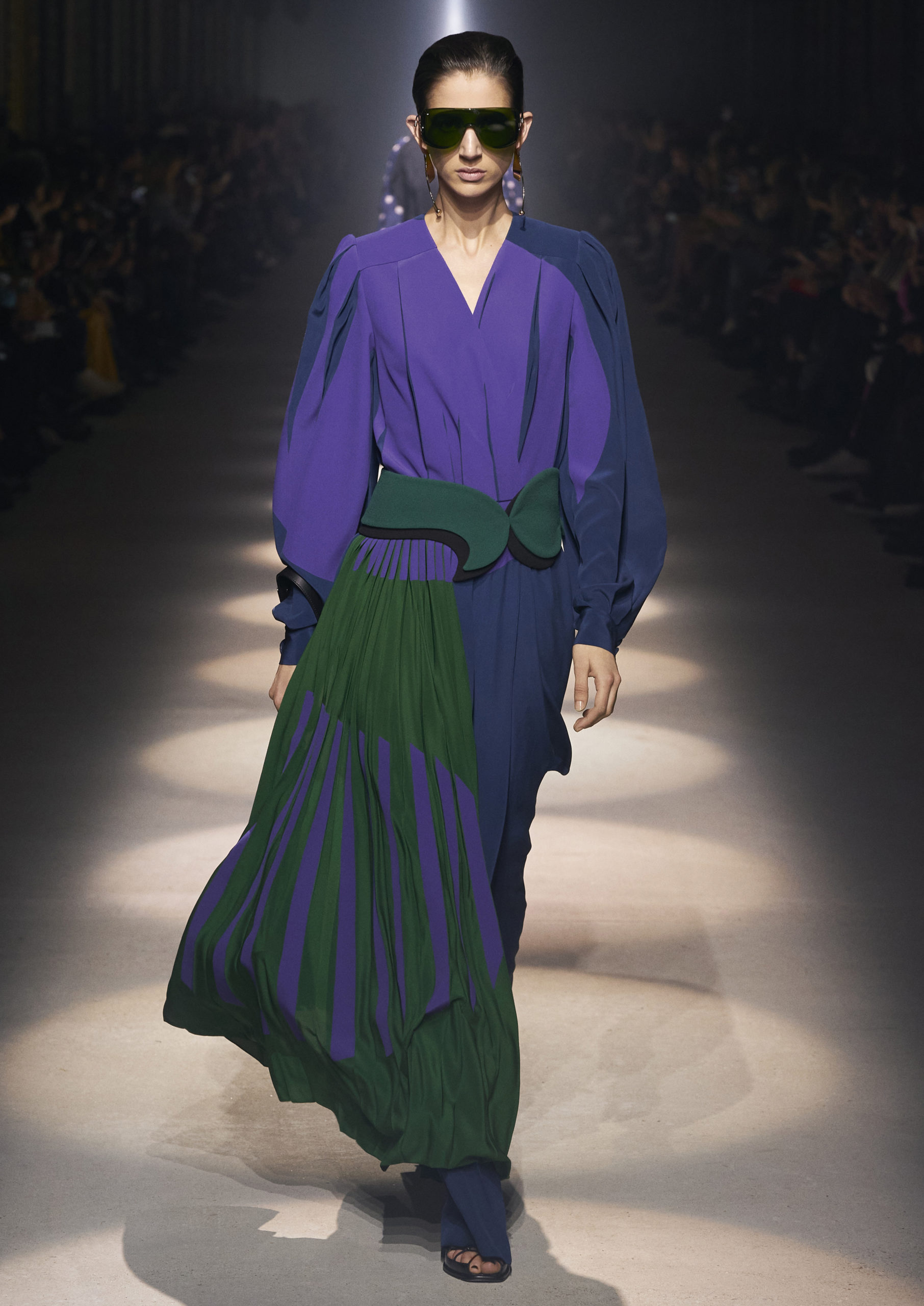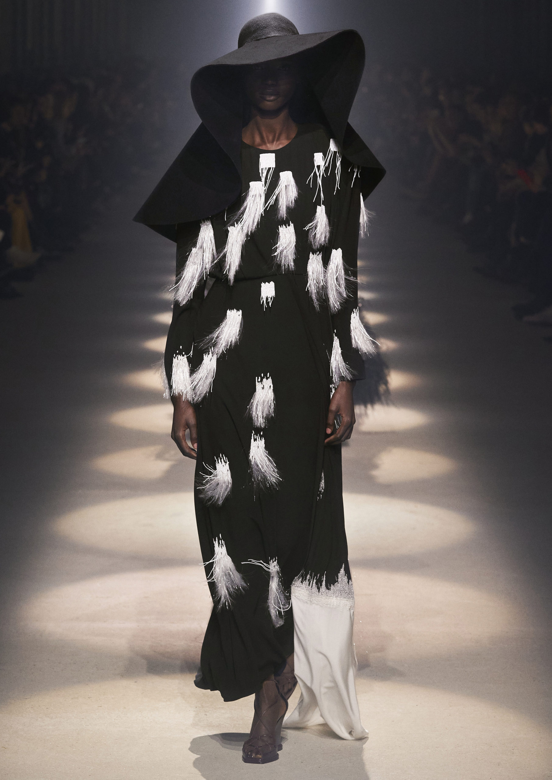 Raw cut and collaged fabrics liberate masterful volumes with an untamed elegance, as shirred blouses and knife-pleated shifts are bonded with mulberry silk crêpe, and pagoda shoulder cape and coat styles are cut in fine double-faced Melton. Tailoring is languid: high-waist flares piped with contrast tones, peak lapel blazers, and a reversible duster coat lined in smooth leather. Sculpted knits and plush faux furs hug the body in shadowy folds. Riffing on the apostrophe, the stripe and the square, patterns and embroideries adorn mid-century shapes in cascading pleats and embroideries, from liquid silver sequins to showers of plumage, tinsel, tassels and bugle beading.