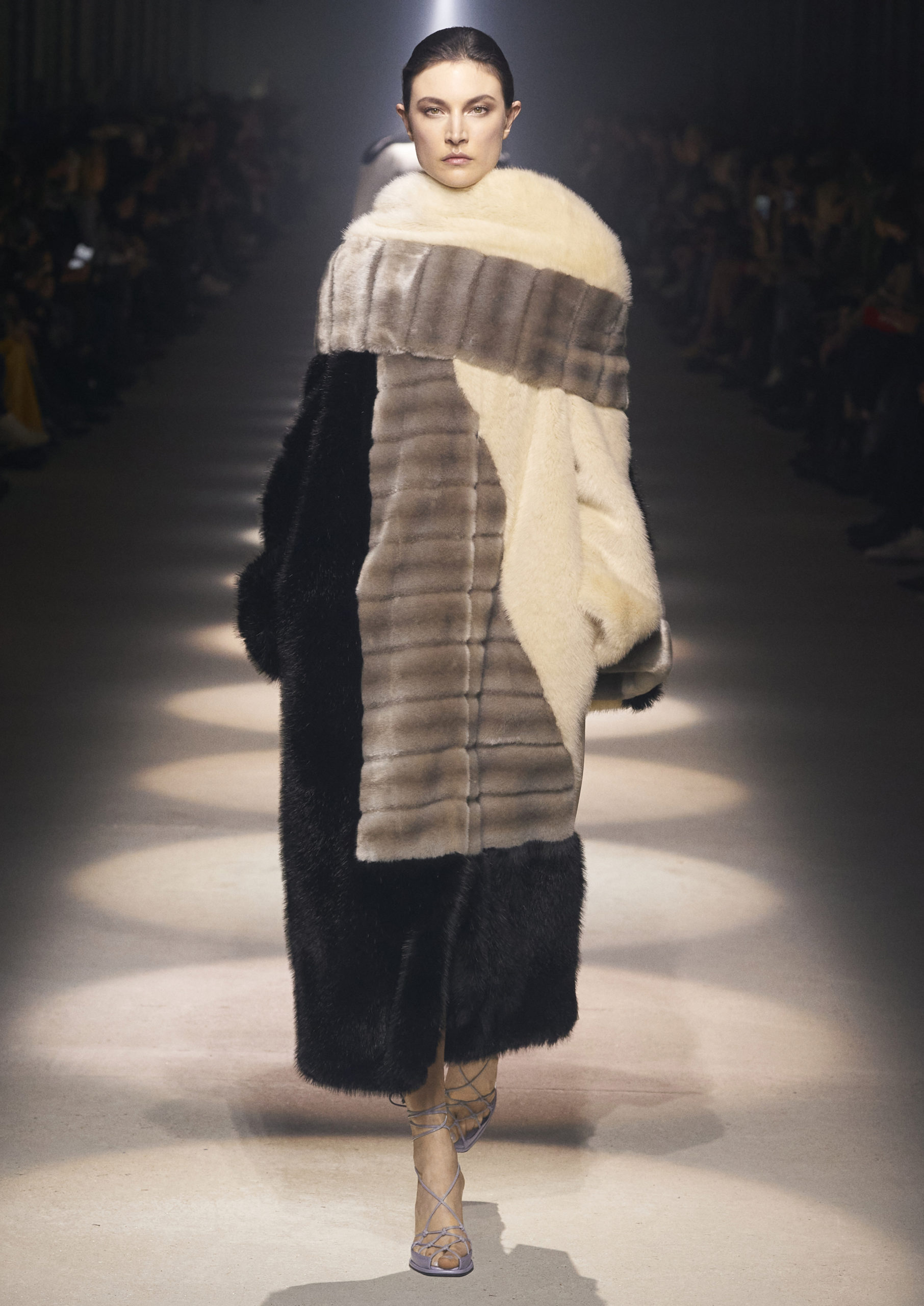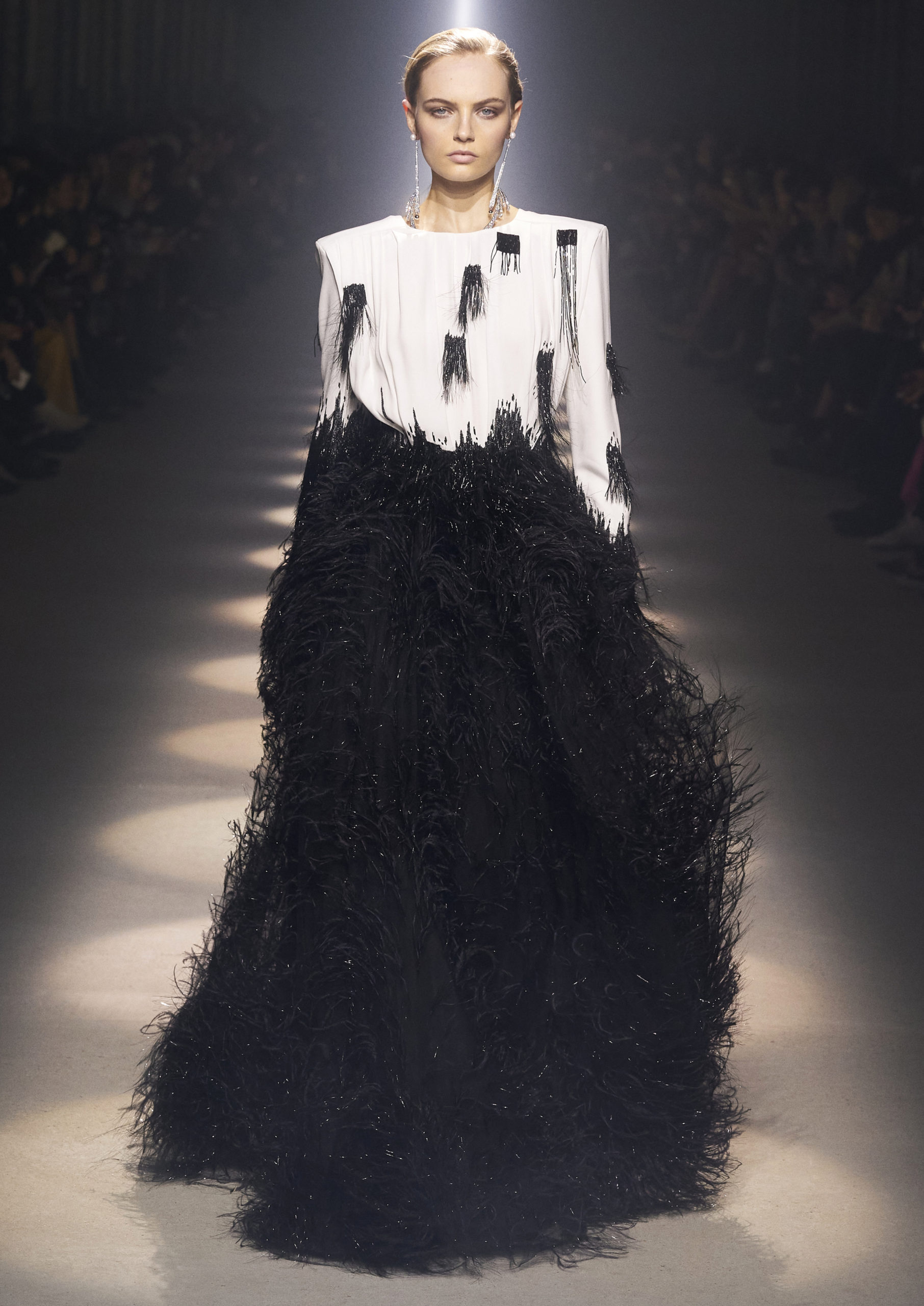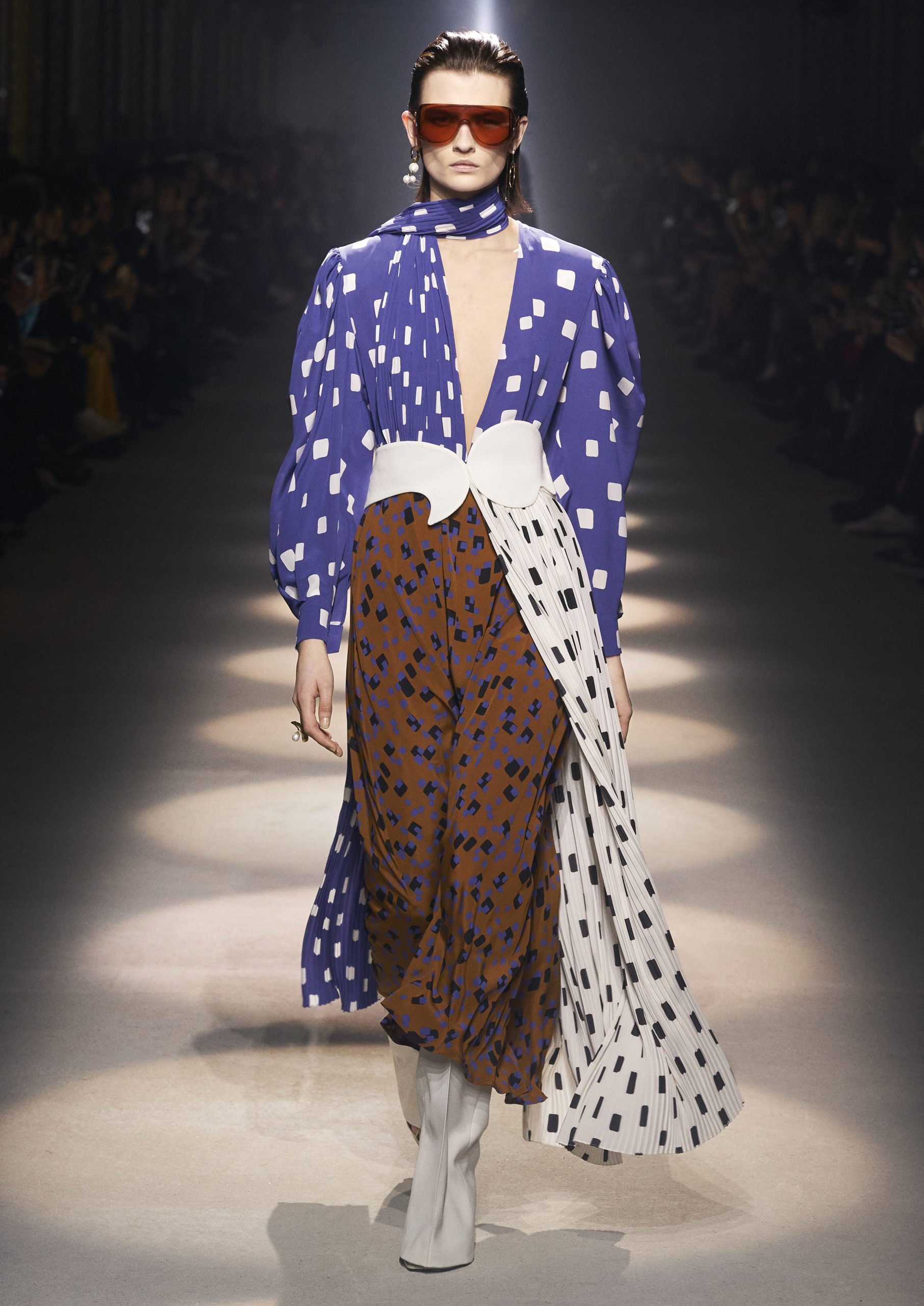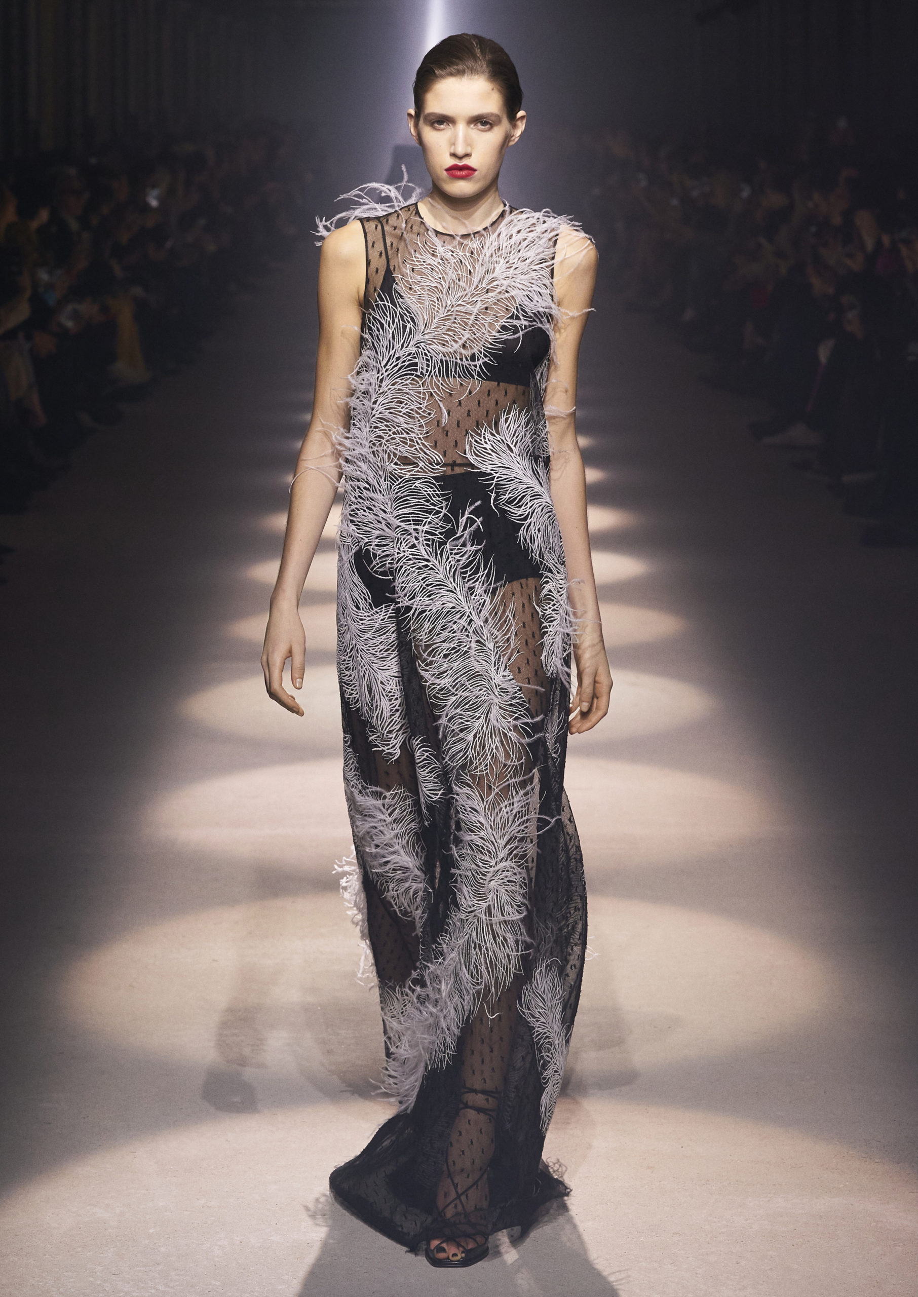 Raw cut and collaged fabrics liberate masterful volumes with an untamed elegance, as shirred blouses and knife-pleated shifts are bonded with mulberry silk crêpe, and pagoda shoulder cape and coat styles are cut in fine double-faced Melton. Tailoring is languid: high-waist flares piped with contrast tones, peak lapel blazers, and a reversible duster coat lined in smooth leather. Sculpted knits and plush faux furs hug the body in shadowy folds. Riffing on the apostrophe, the stripe and the square, patterns and embroideries adorn mid-century shapes in cascading pleats and embroideries, from liquid silver sequins to showers of plumage, tinsel, tassels and bugle beading.