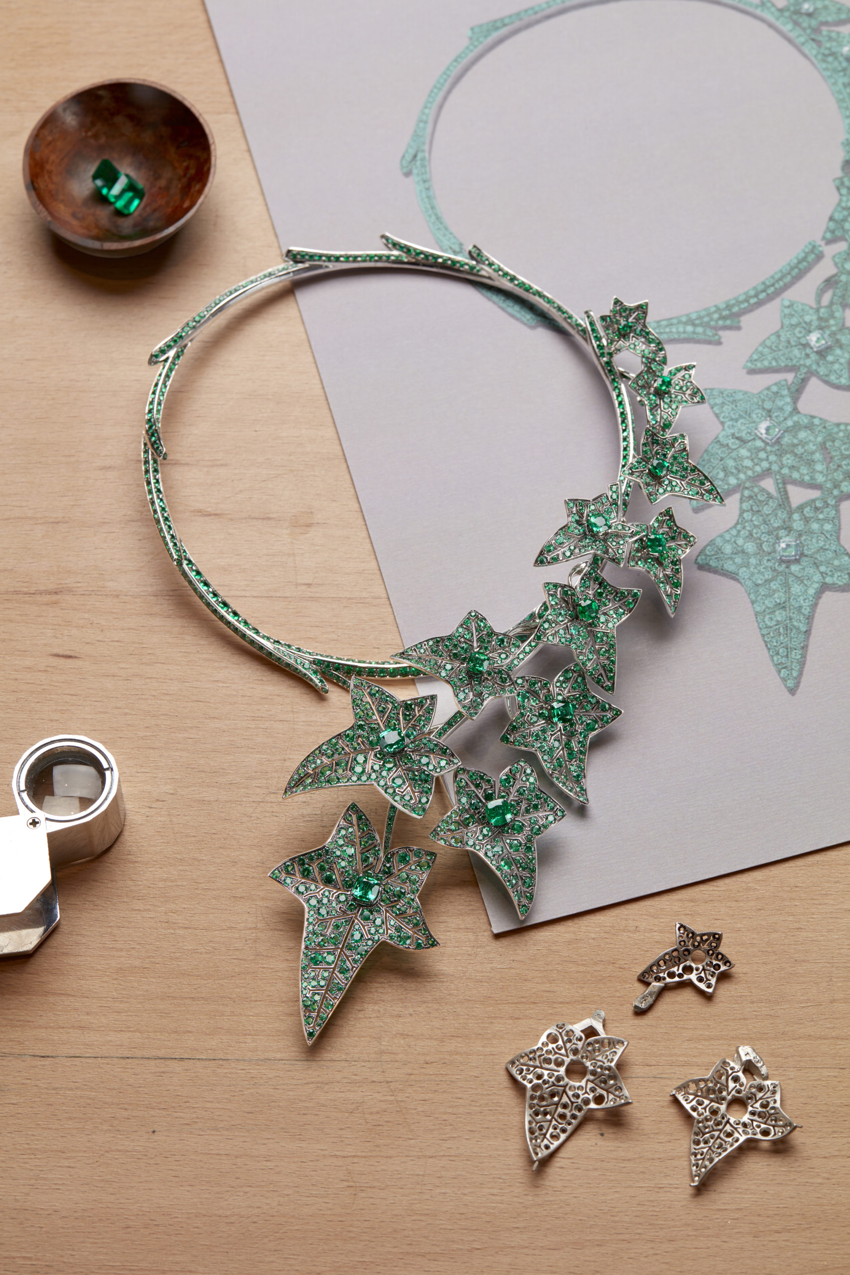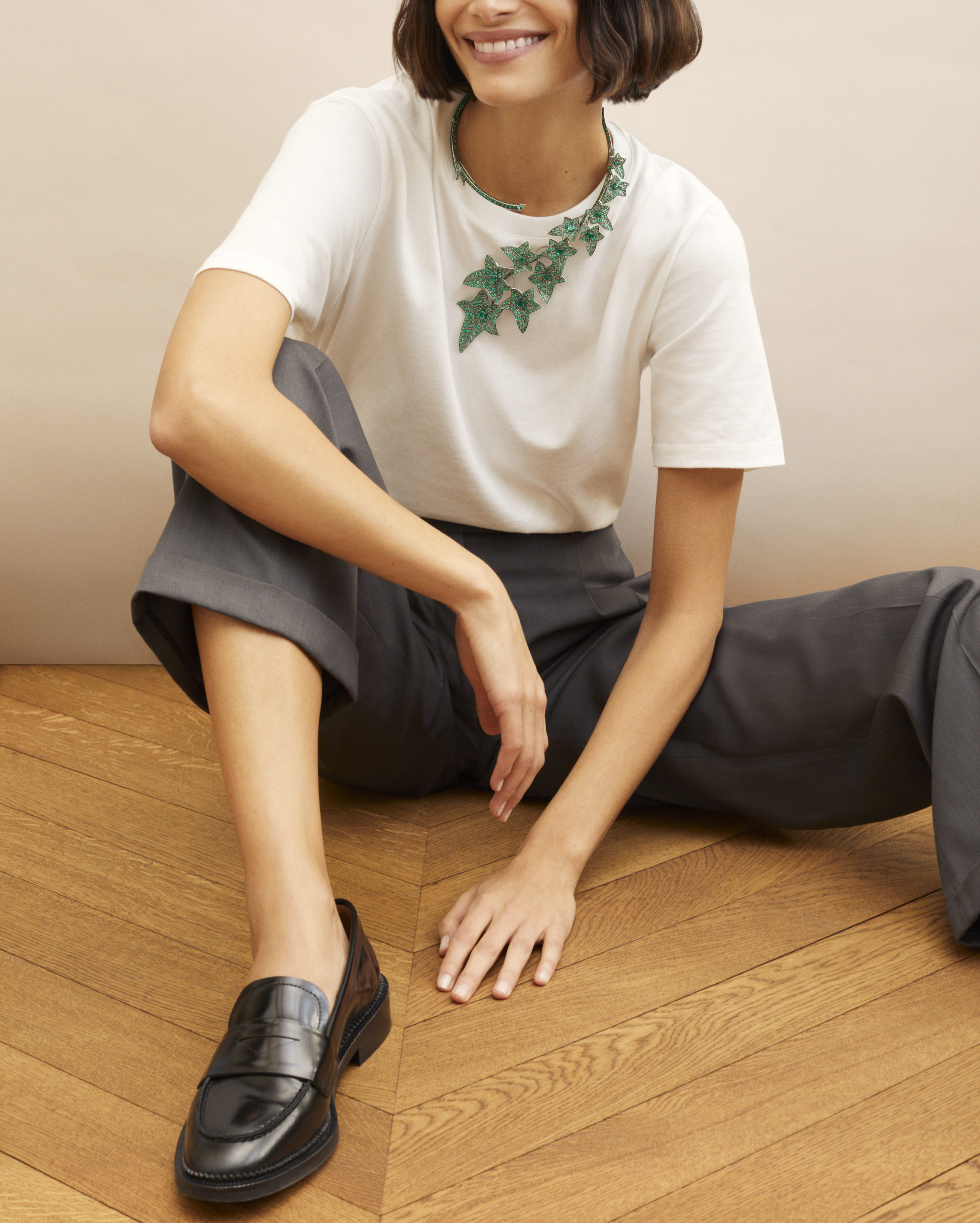 Une magistrale démonstration de la virtuosité des ateliers de la Maison est offerte par le collier Lierre de Paris dont les feuilles mouvantes sont serties d’émeraudes. Réinterprétation d’un collier en or blanc extrait de la collection Nature Triomphante, cette variation verdoyante offre un éventail complet des arts joailliers les plus sophistiqués. L’ondulation, la disposition, le volume, le mouvement des feuilles animées par un trembleur, tout en perpétuant l’esprit d’innovation qui a toujours caractérisé Boucheron, affirme également le goût du réalisme poussé à son paroxysme, cher à Claire Choisne.