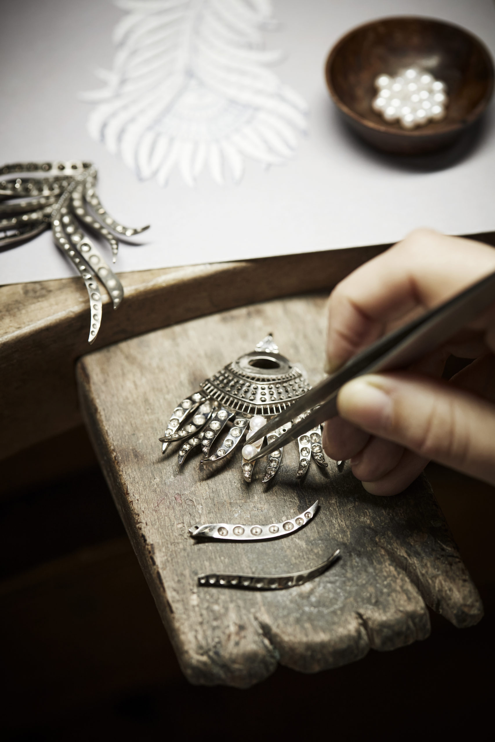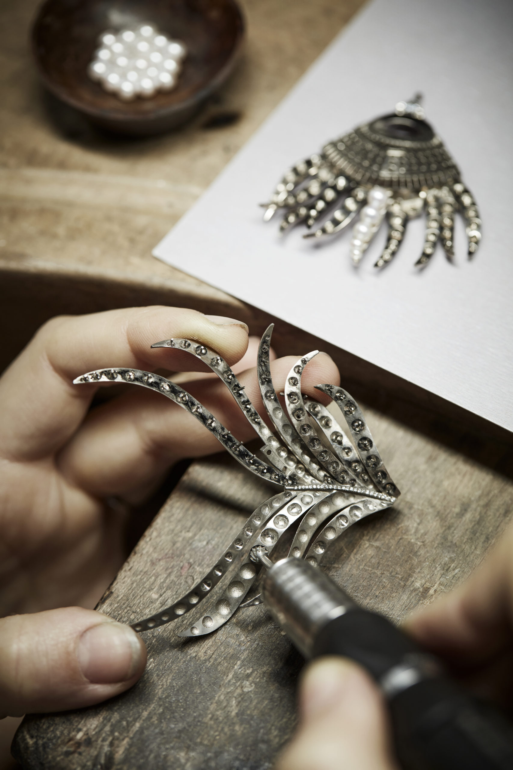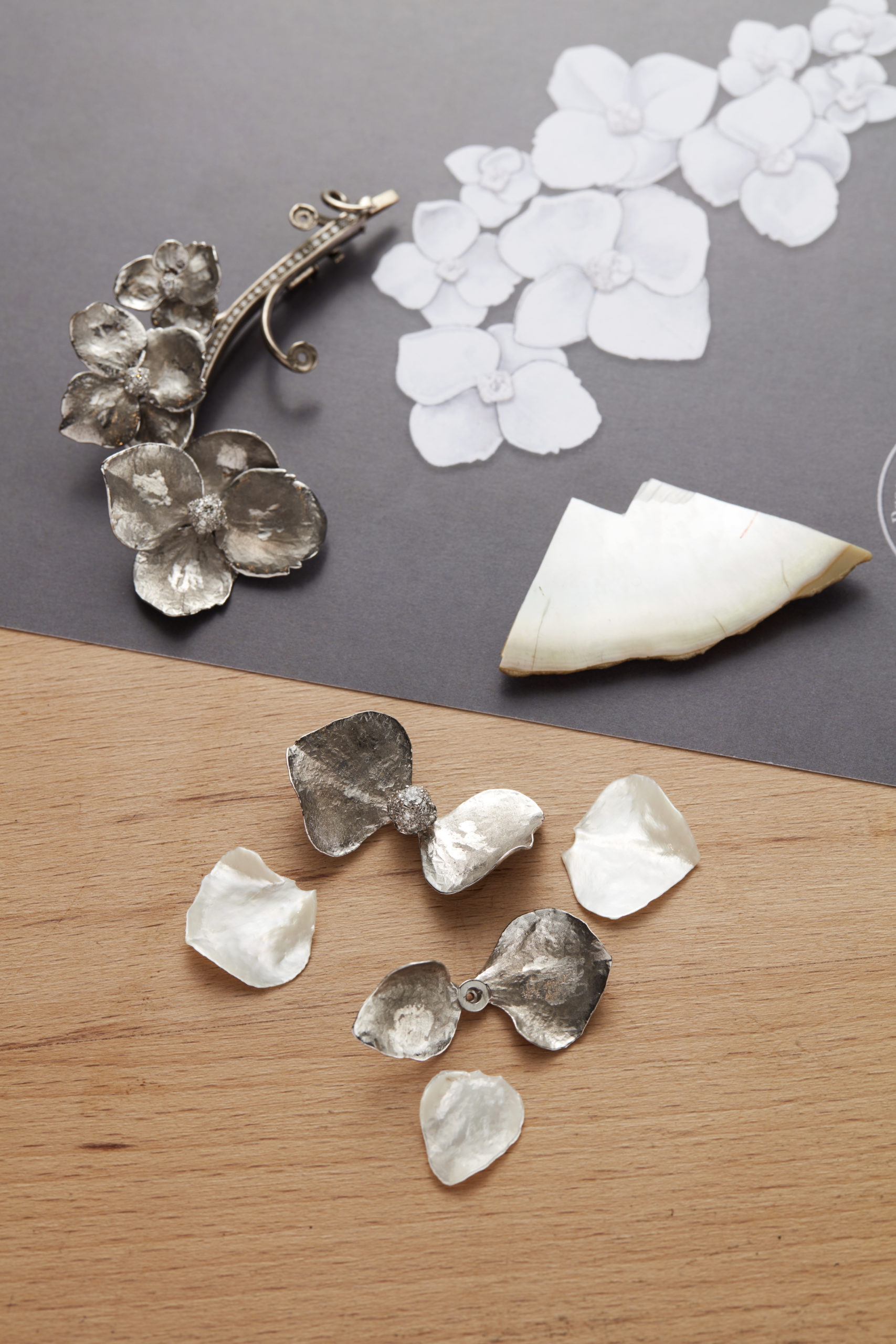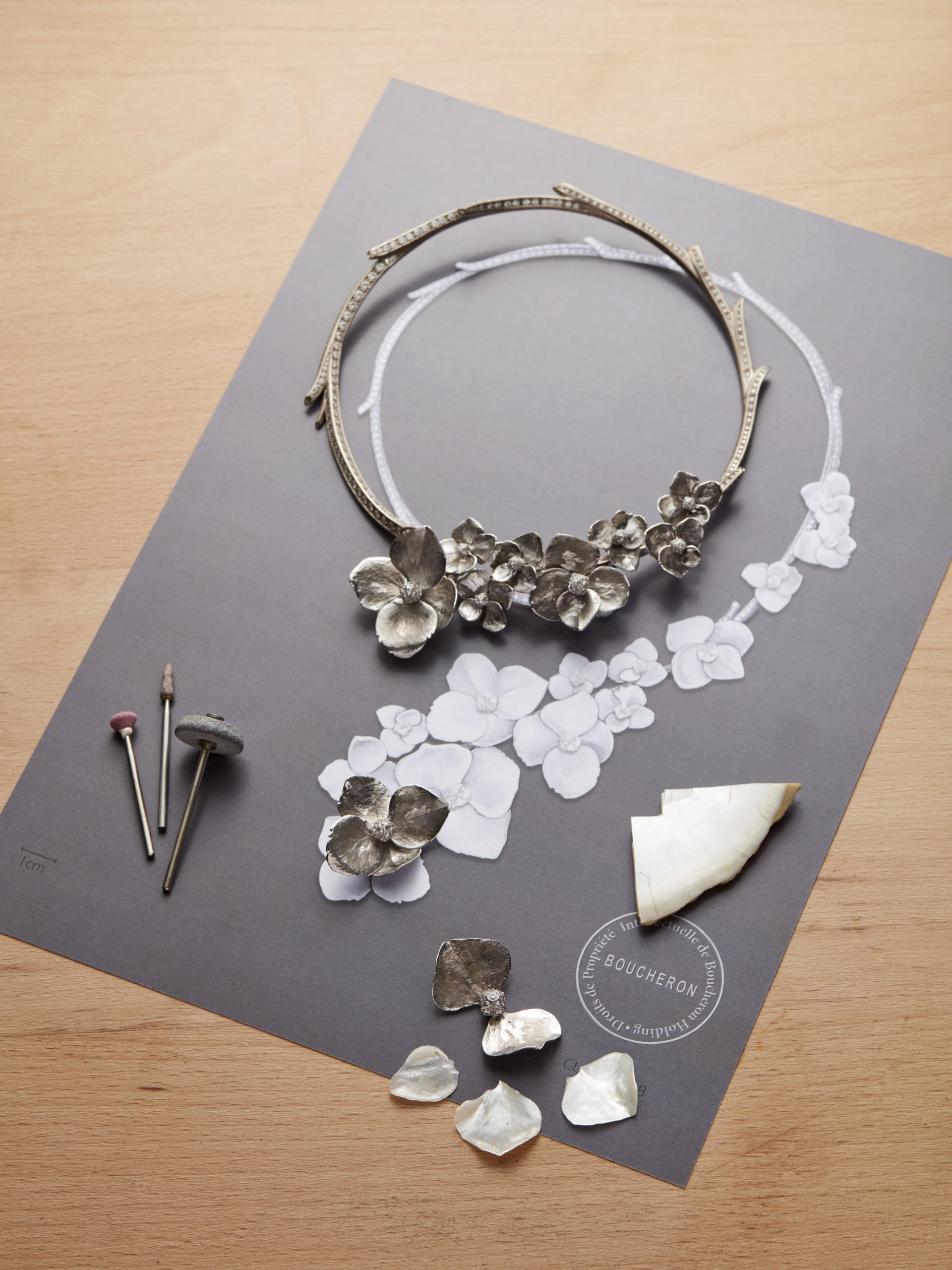 La sensibilité de Claire Choisne rayonne également sur le collier Nuage de Fleurs qui offre au regard un bouquet d’hortensia. « C’est la première fleur que m’a offert ma fille, confie la directrice des Créations. J’aime cette fleur parce qu’elle me semble parée de simplicité, presque d’humilité ». Chaque pétale d’hortensia a été scanné afin de graver le sentiment de la nature éphémère dans le relief immortel de la nacre.