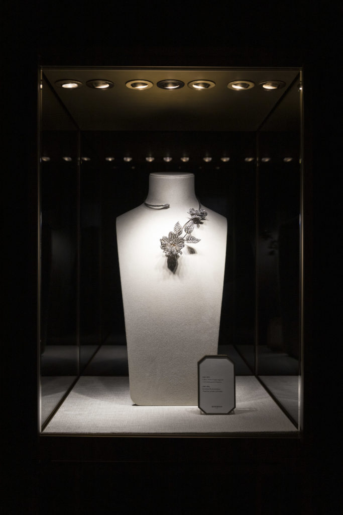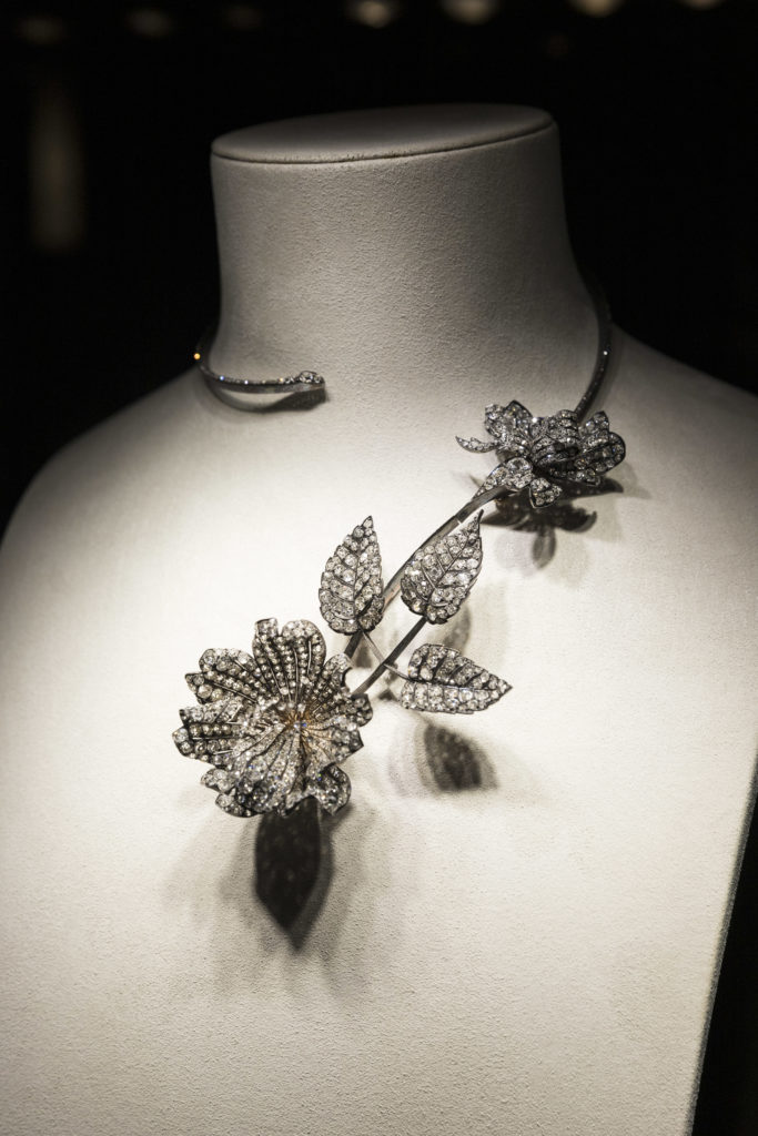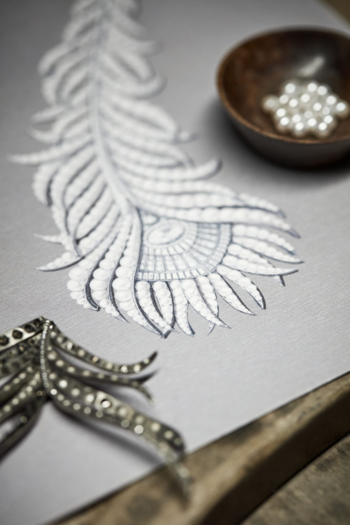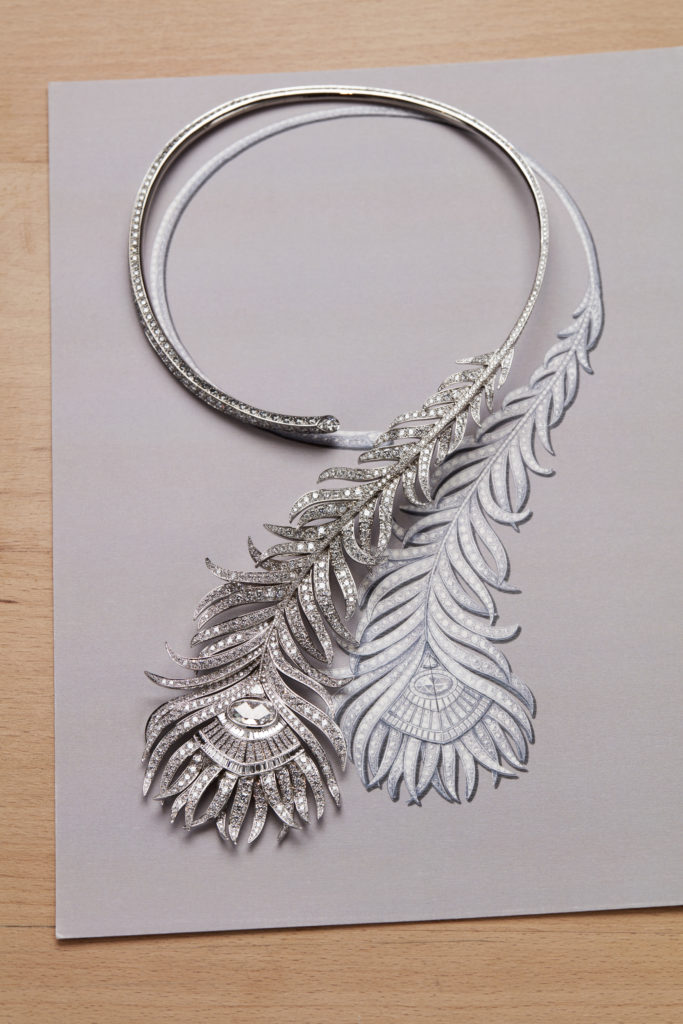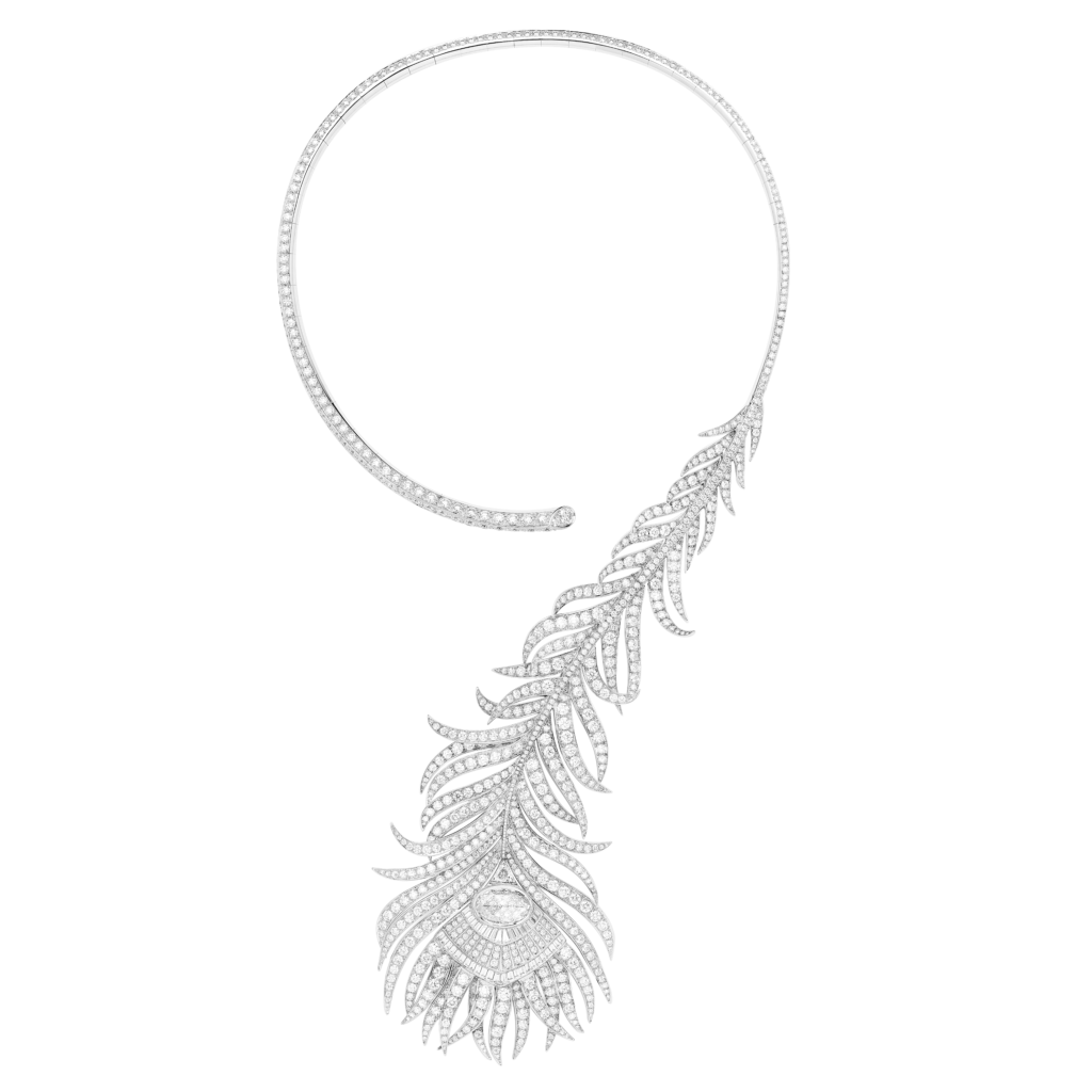 L’étude du motif naturel, la vérité des formes, l’exigence de souplesse rejaillissent sur un collier Plume de Paon constellé de diamants taille rose, triangle, brillant et baguette. La Directrice des Créations a souhaité que les sertis, les mises à jour et le travail du métal précieux en usage à la fin du XIXème siècle soient reproduits le plus fidèlement possible. Les volumes, très généreux, sont affirmés. « J’aime le volume XL de ce collier que je considère comme la mère de cette collection et qui donnera le diapason aux dimensions des créations futures » s’enthousiasme Claire Choisne.