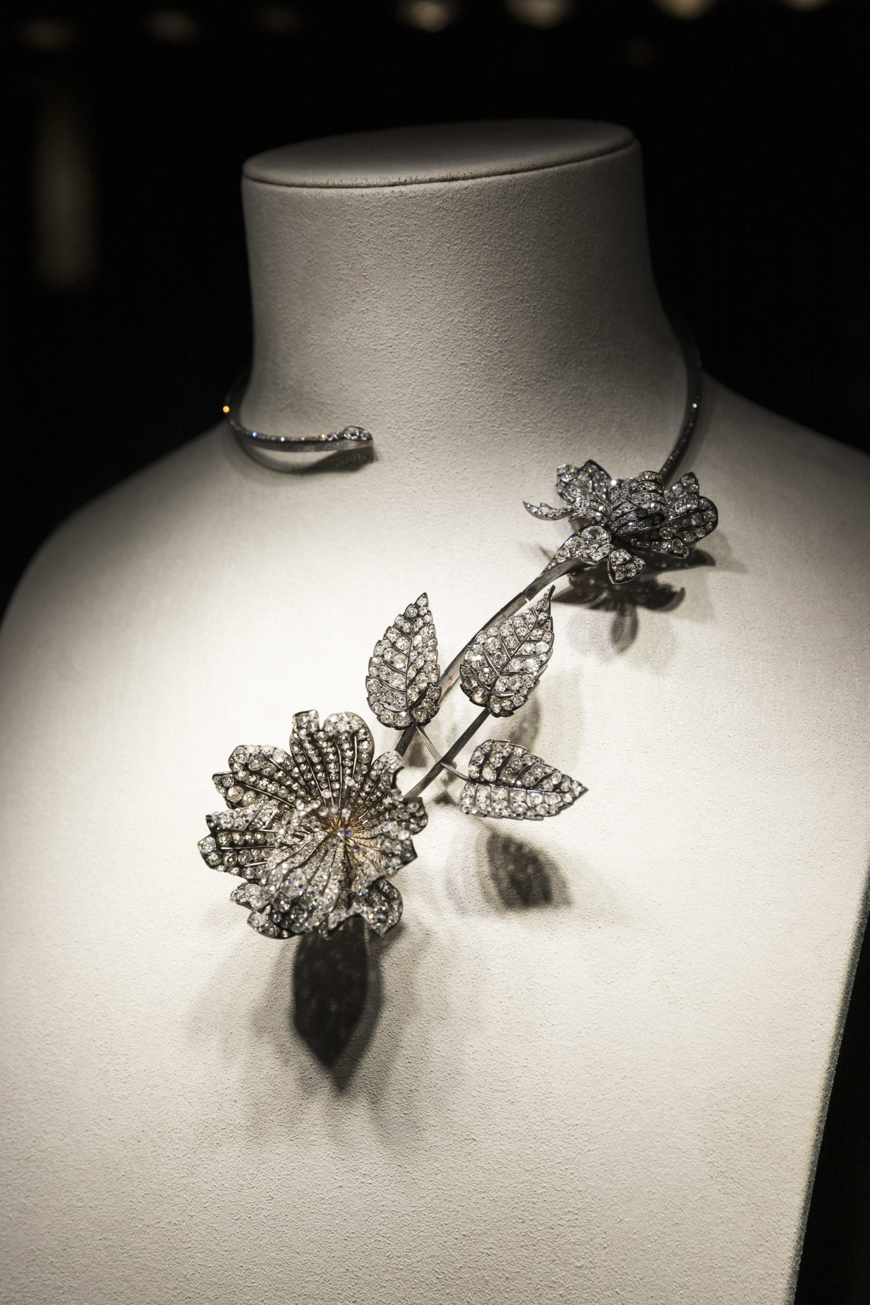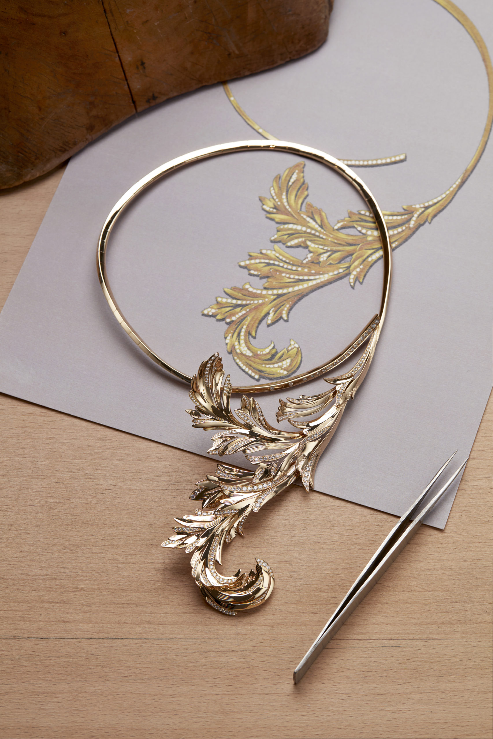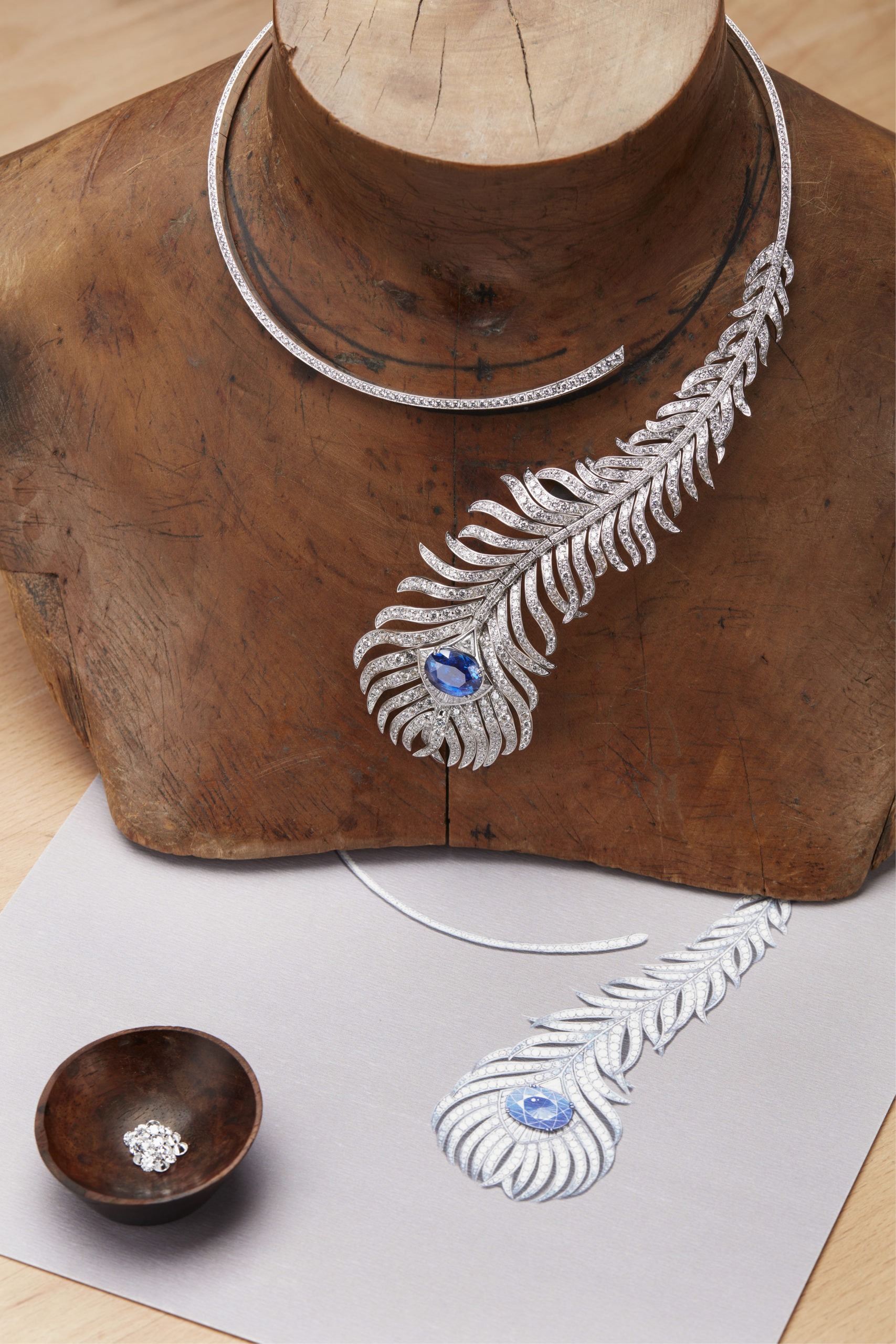 L’étude du motif naturel, la vérité des formes, l’exigence de souplesse rejaillissent sur un collier Plume de Paon constellé de diamants taille rose, triangle, brillant et baguette. La Directrice des Créations a souhaité que les sertis, les mises à jour et le travail du métal précieux en usage à la fin du XIXème siècle soient reproduits le plus fidèlement possible. Les volumes, très généreux, sont affirmés. « J’aime le volume XL de ce collier que je considère comme la mère de cette collection et qui donnera le diapason aux dimensions des créations futures » s’enthousiasme Claire Choisne.