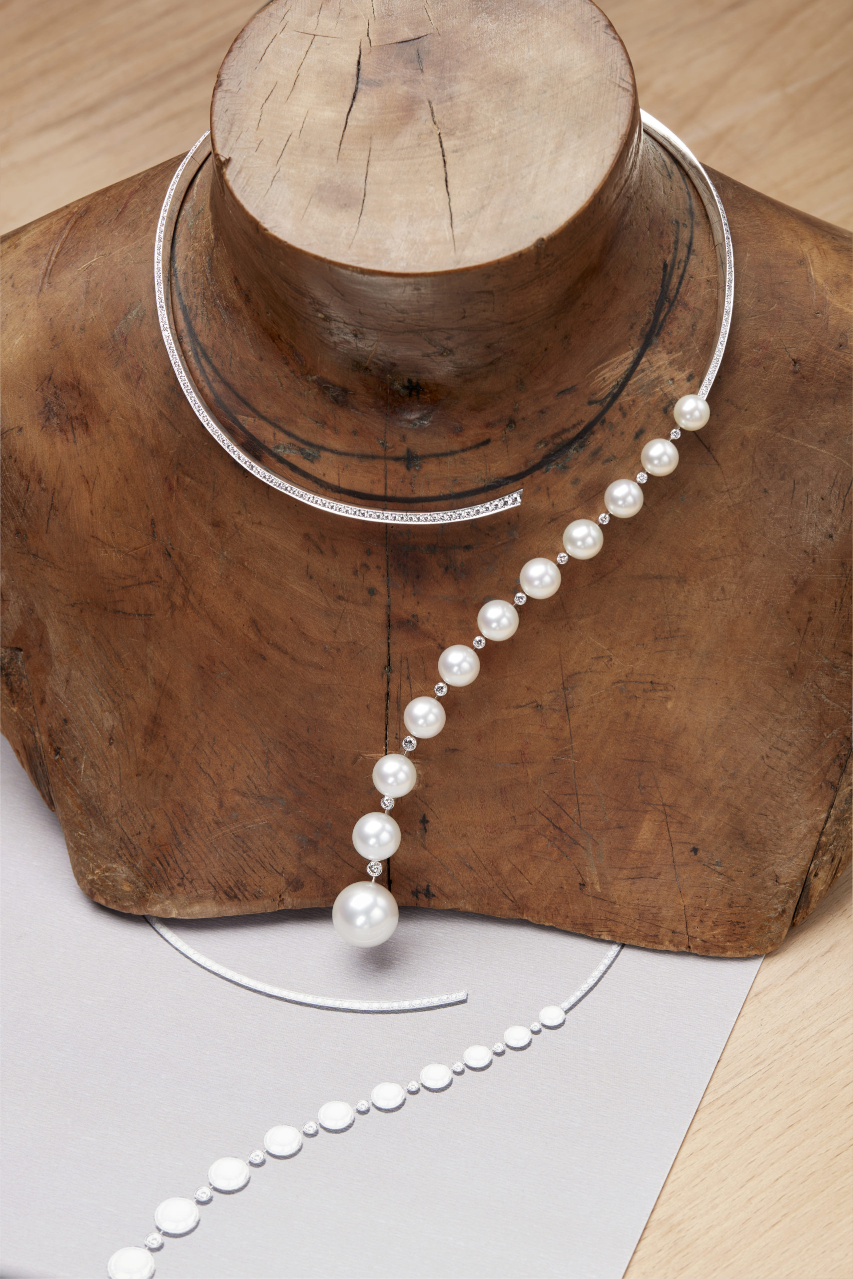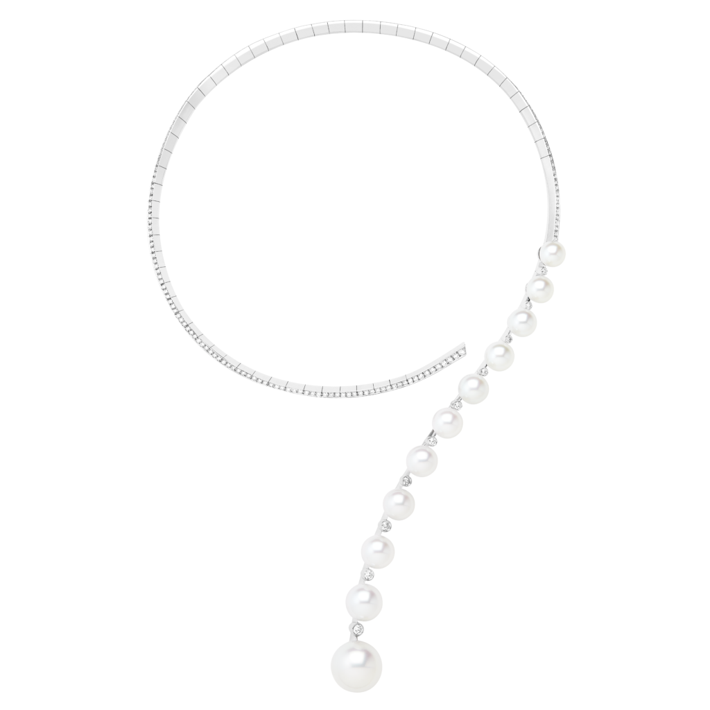 Variation totalement inédite du point d’interrogation, le collier Gouttes de Perles ponctue la pureté d’une arabesque de gourmandes perles de culture.