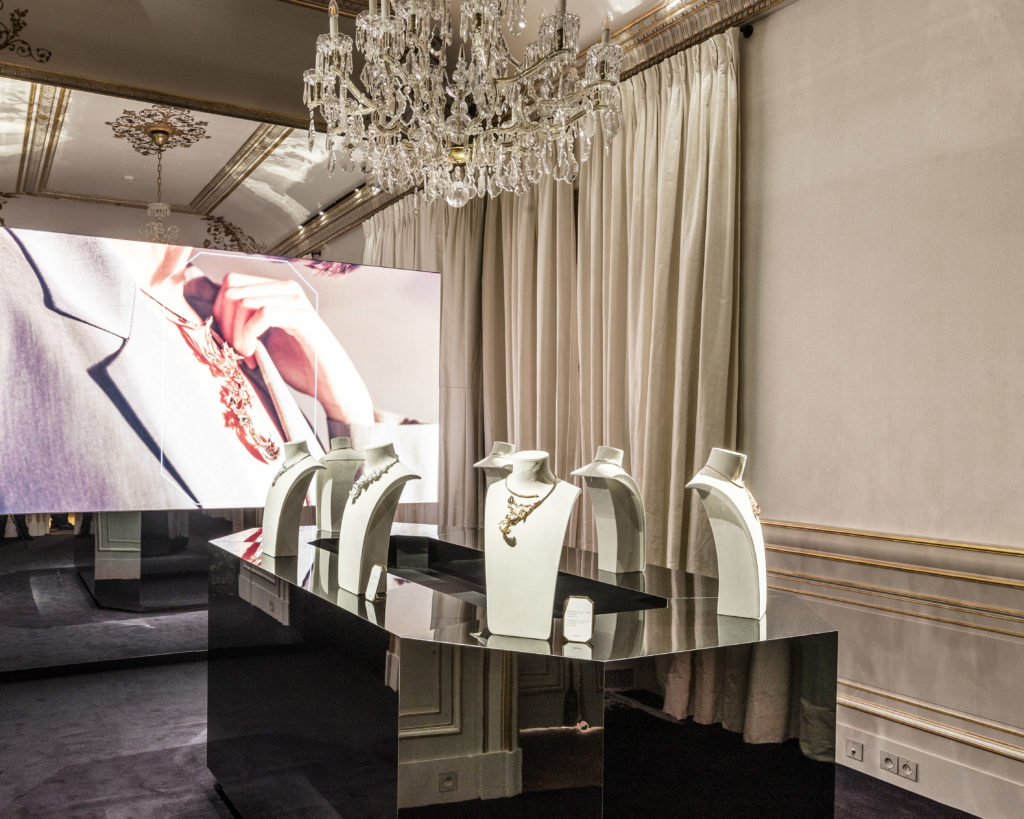 Le collier Feuilles d’Acanthe métamorphose quant à lui l’emblématique motif ornemental en capricieux treillage où s’incurvent voluptueusement des feuilles d’or jaune. Ce trait d’union entre le végétal et l’architecture s’épanouit également au cœur d’une boucle d’oreille asymétrique, unique et radicale, qui affirme l’esprit contemporain de la collection.
