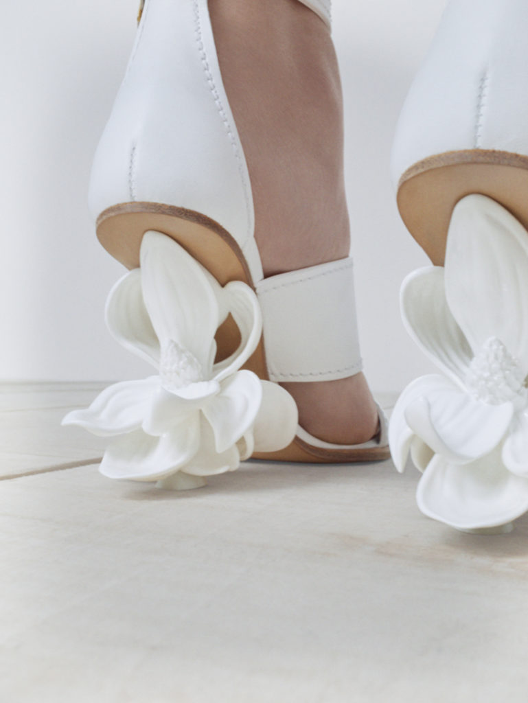Inspiré des fleurs en voie de disparition, thème récurrent dans les collections Cruise et Printemps / Été 2020, le talon en forme de magnolia a été dessiné, scanné et imprimé en résine 3D pour un effet naturaliste.