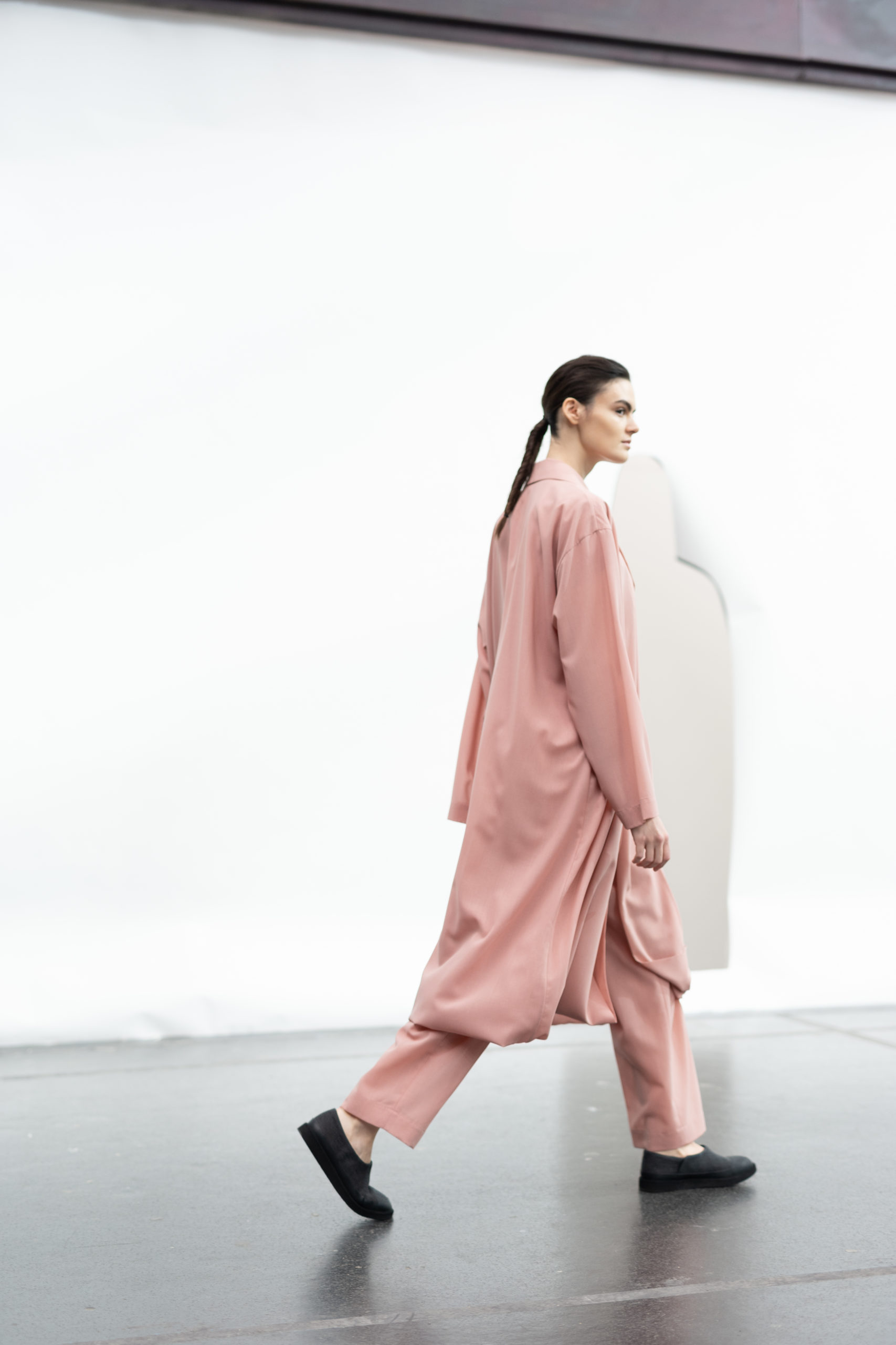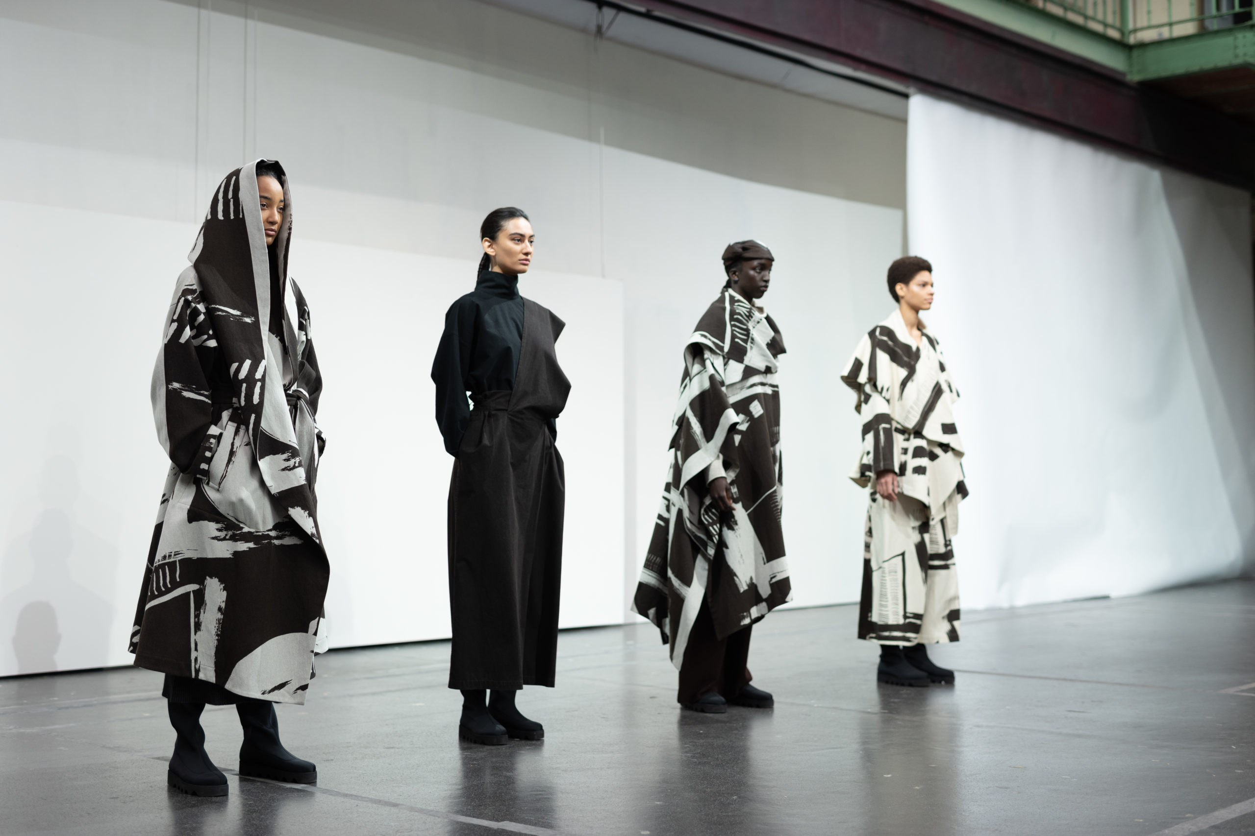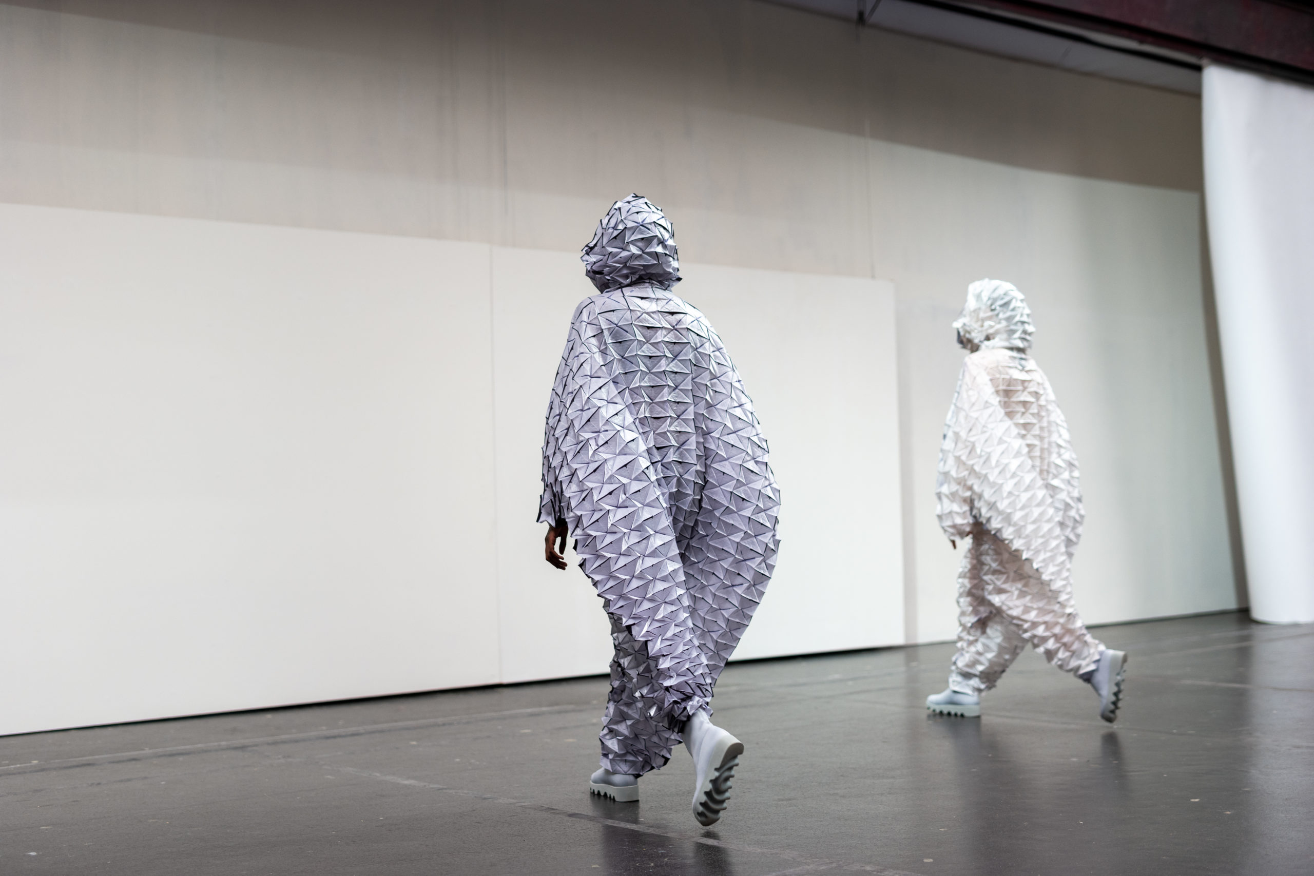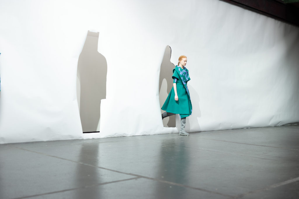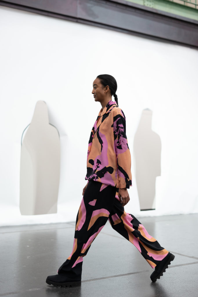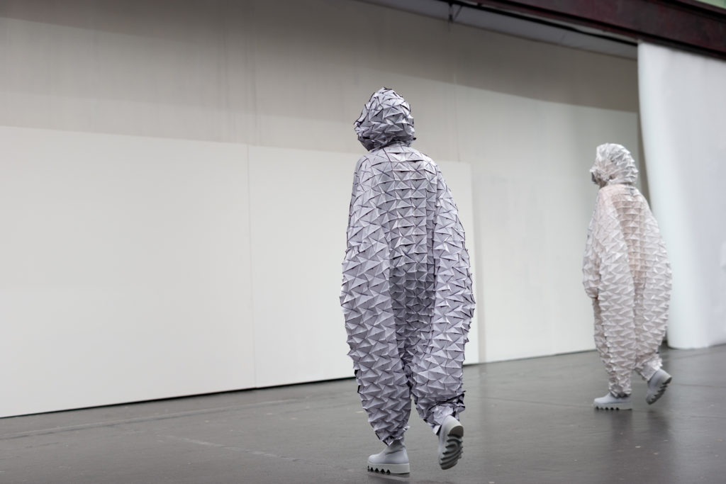 L’imprimé de cette série est inspiré par l’image de mains qui auraient pétri de la boue avant de toucher et mettre en forme le vêtement. Le mélange de laine et de papier apporte au vêtement un aspect primitif.