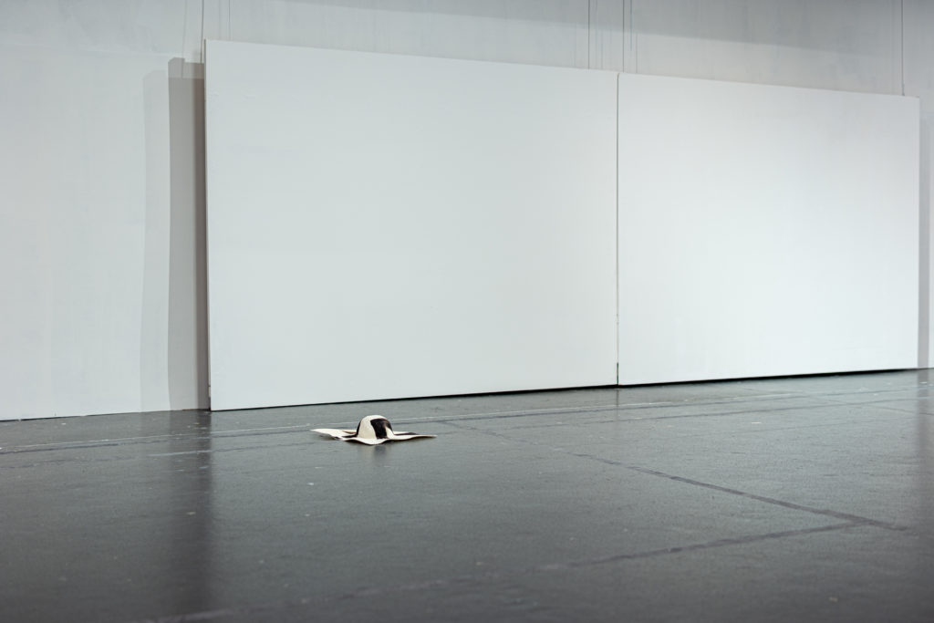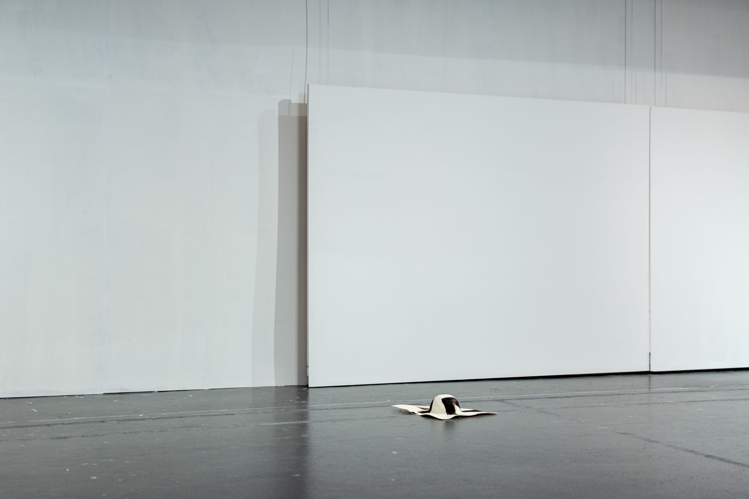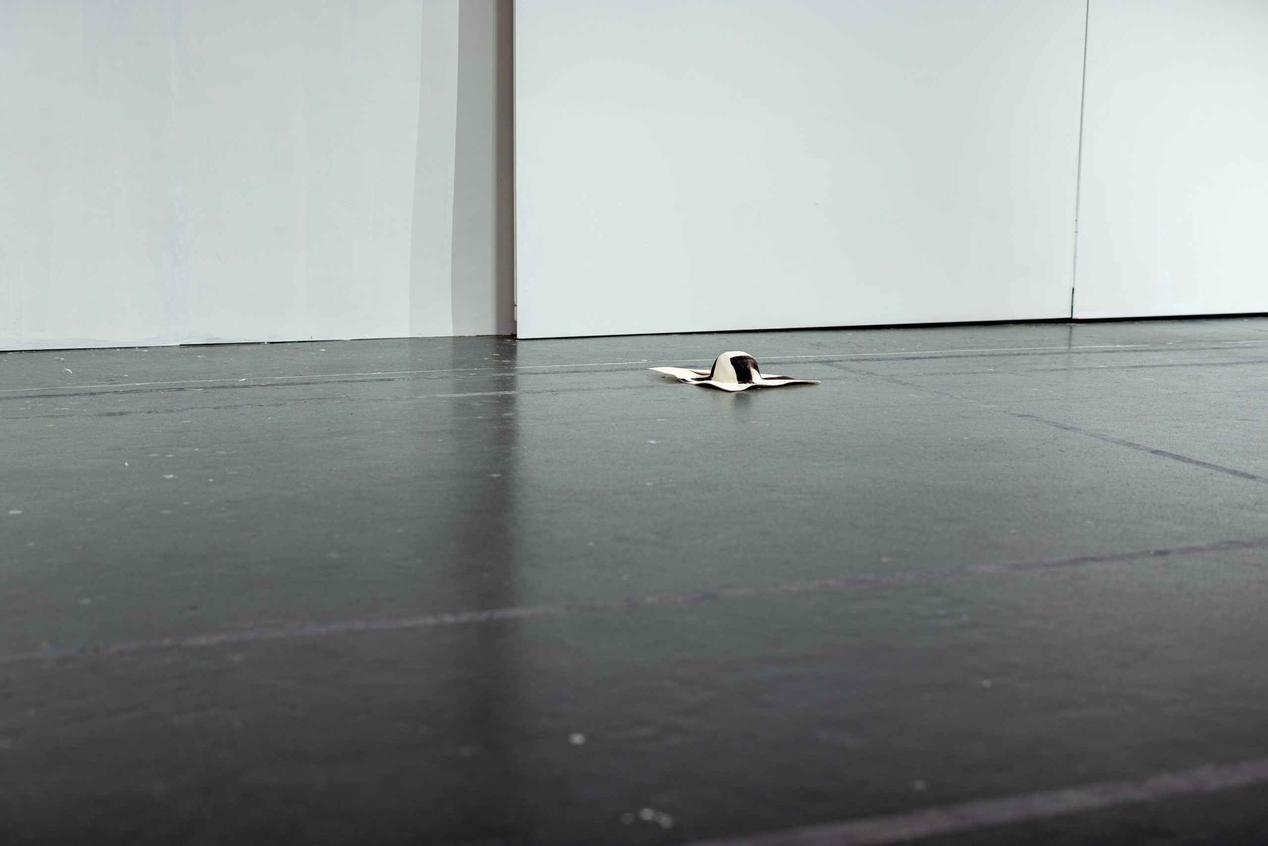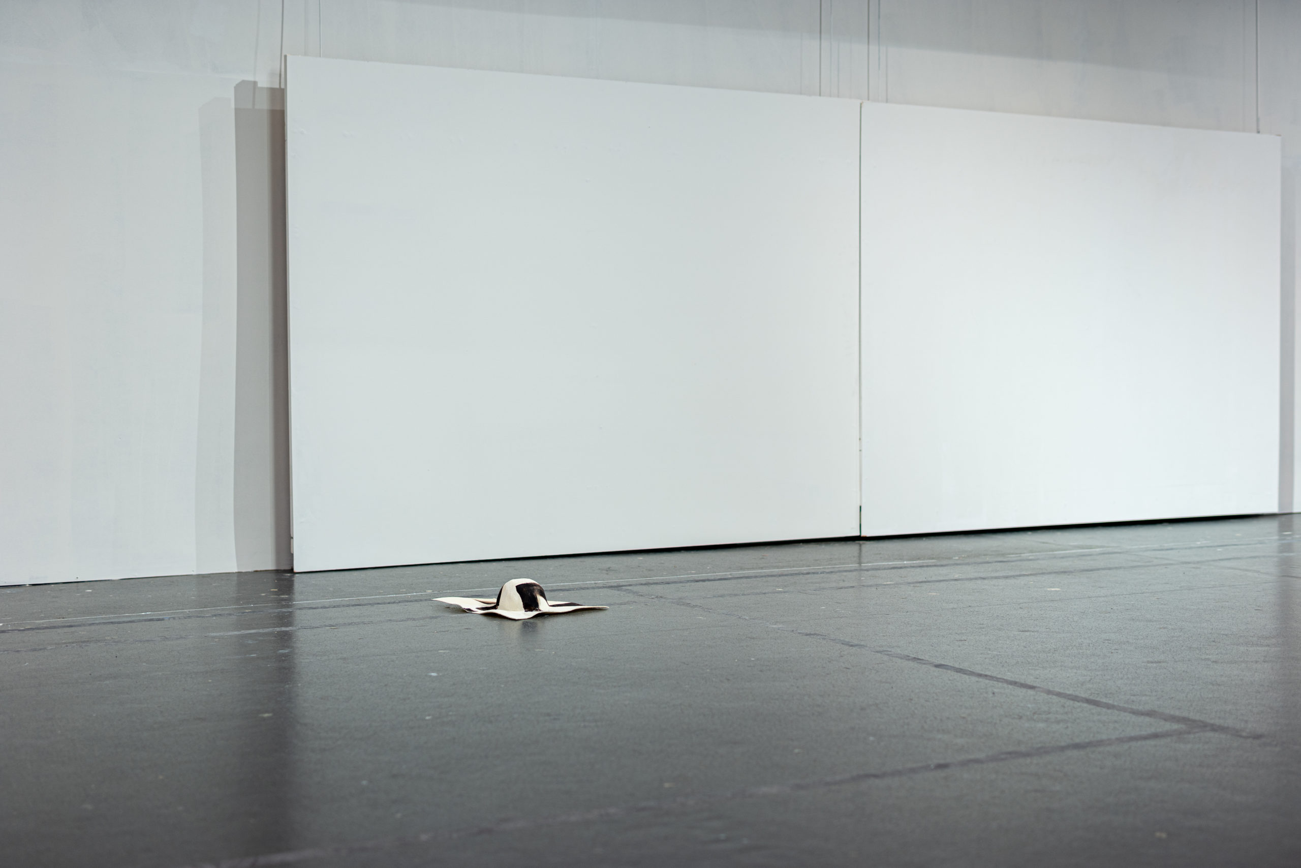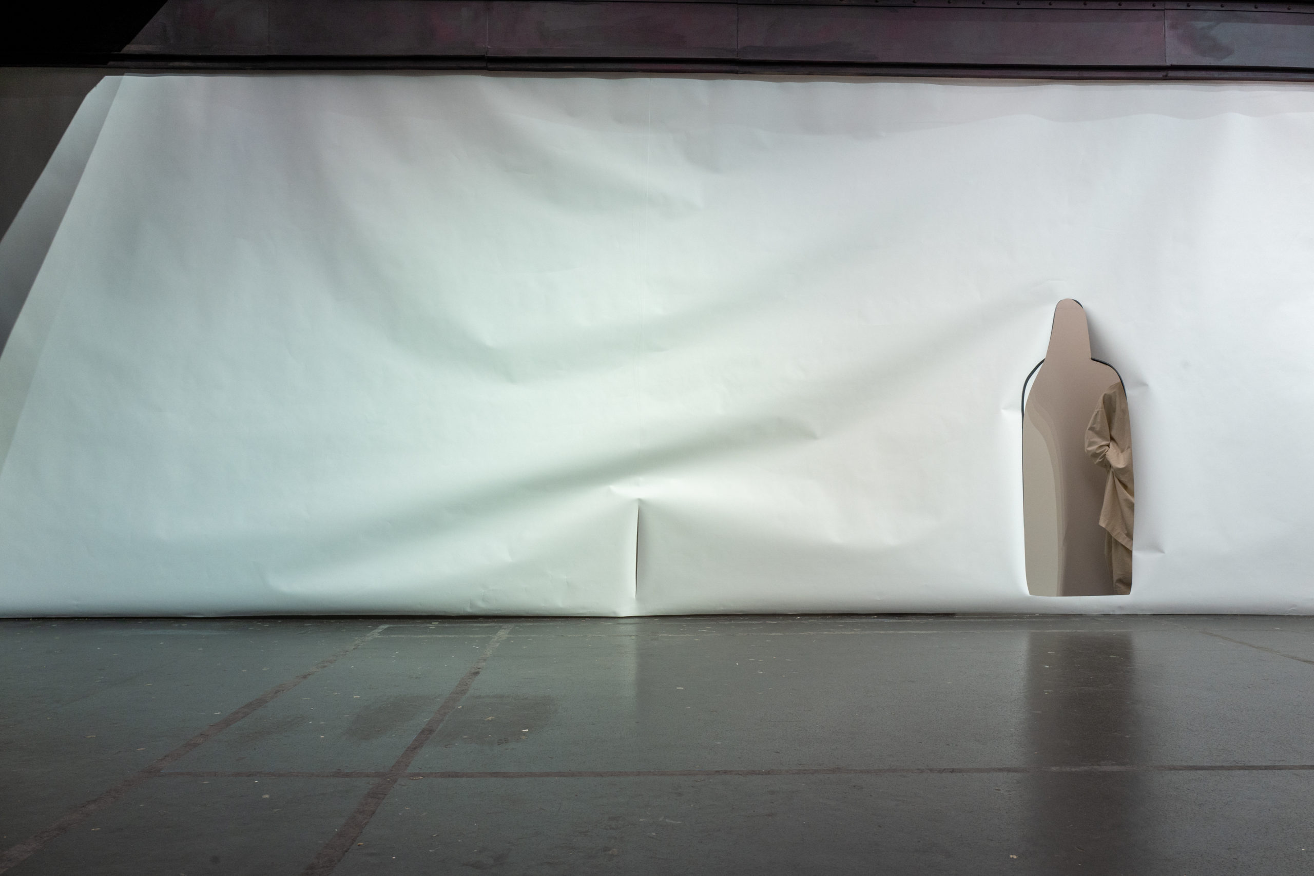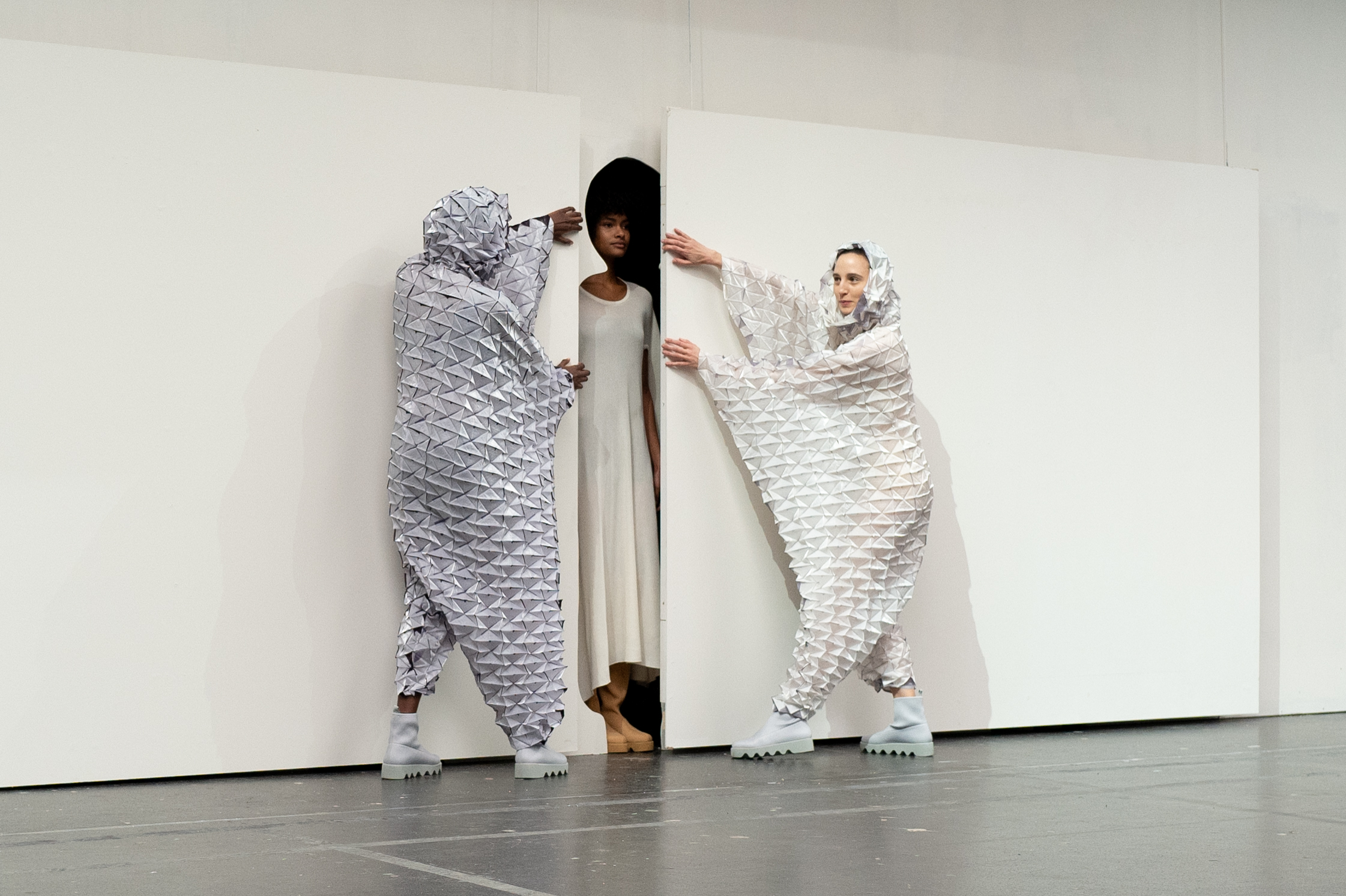 L’imprimé de cette série est inspiré par l’image de mains qui auraient pétri de la boue avant de toucher et mettre en forme le vêtement. Le mélange de laine et de papier apporte au vêtement un aspect primitif.