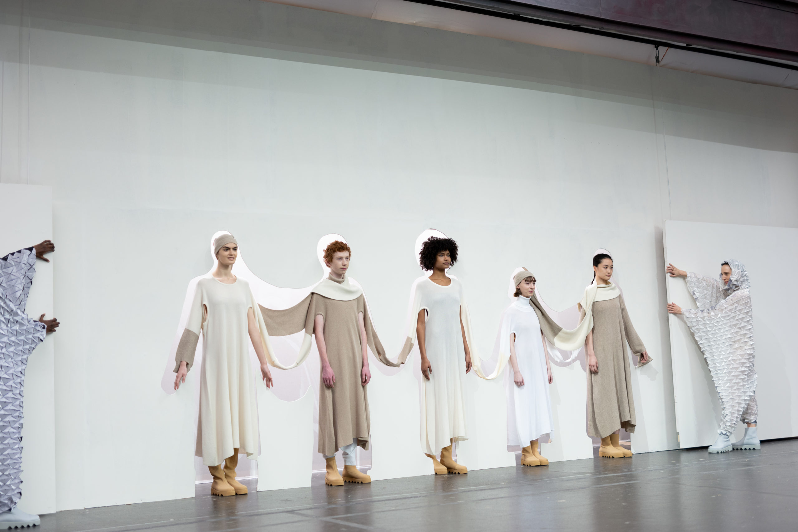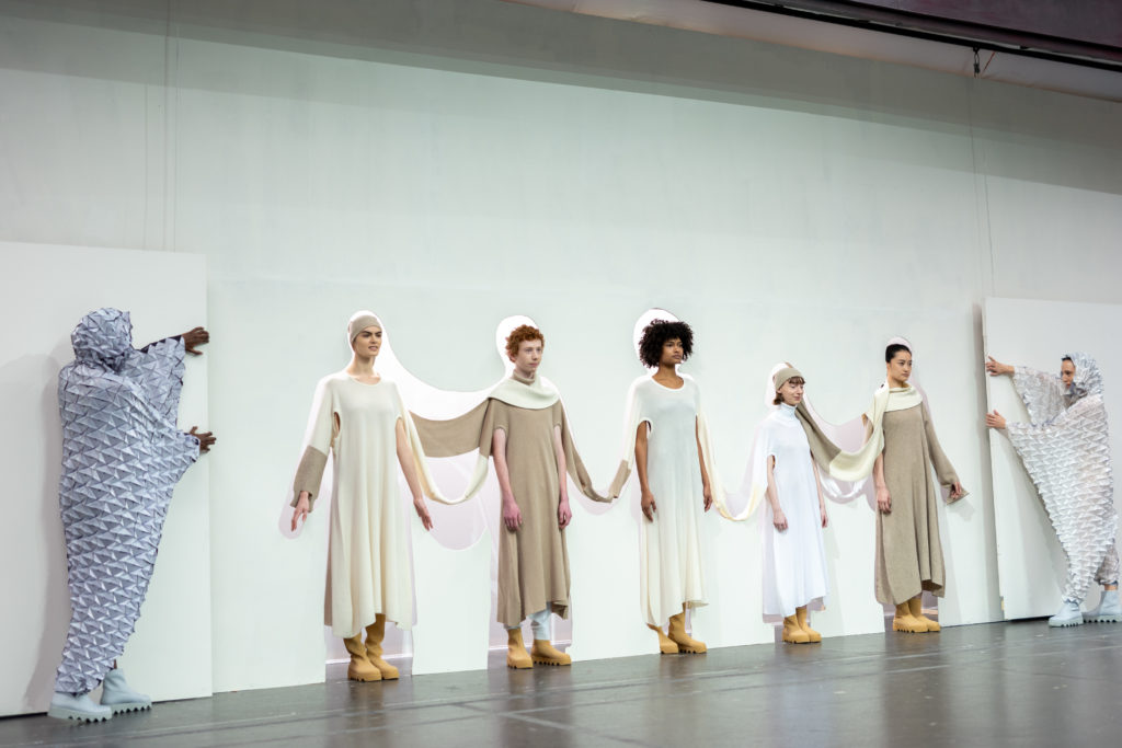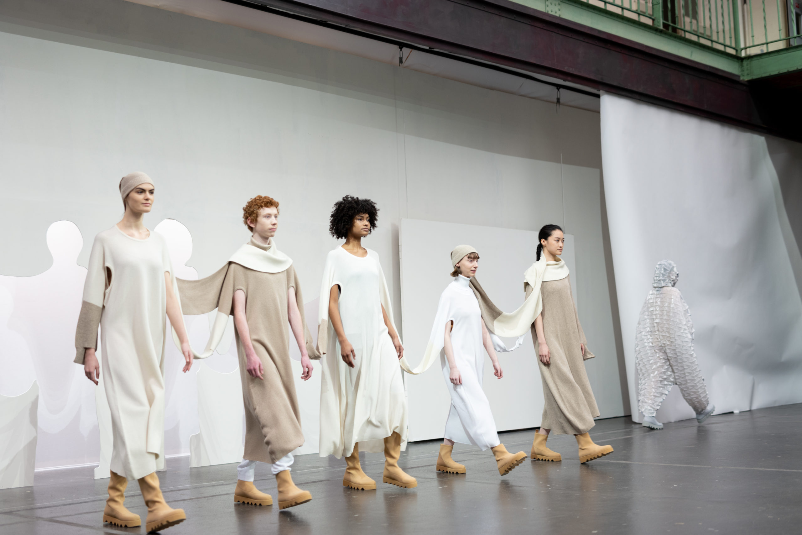 Conçue grâce à une technique de mailles sans couture, la série transmet l’idée de connecter les gens entre eux, les gens avec le monde et les gens au futur avec des vêtements fabriqués d’une seule pièce en apportant une dose d’humour. Des ouvertures supplémentaires permettent de porter ces vêtements de différentes façons.