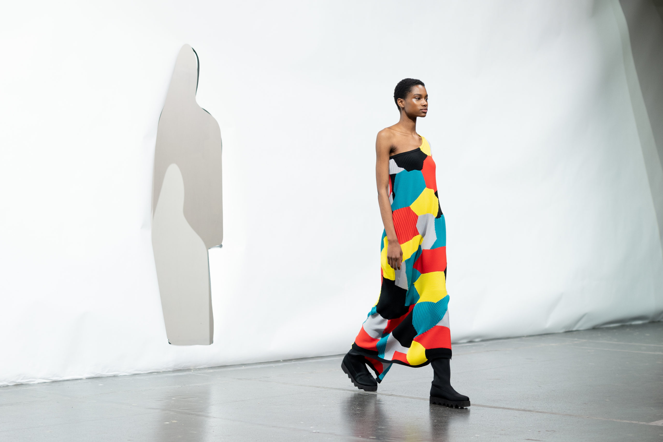 À l’image de différentes argiles colorées que l’on malaxe ensemble, cette série de mailles est conçue avec différentes textures. Le relief est rendu possible par l’utilisation de différents types de mailles pour chaque bloc de couleur, donnant une impression de patchwork; mais il s’agit en fait d’un tricotage d’une seule traite.