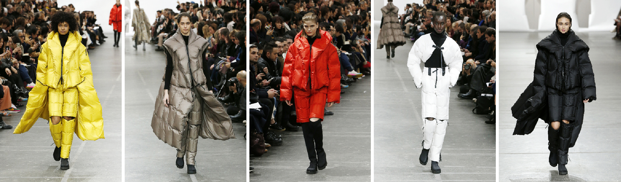 Cette série de doudounes colorées se transforme à volonté pour offrir différents styles en zippant et dézippant des pièces détachables. Ces vêtements légers et confortables tissés avec un fil de nylon extra-fin crées des silhouettes tout en volume. La variété de formes et de couleurs permet de nombreuses combinaisons.