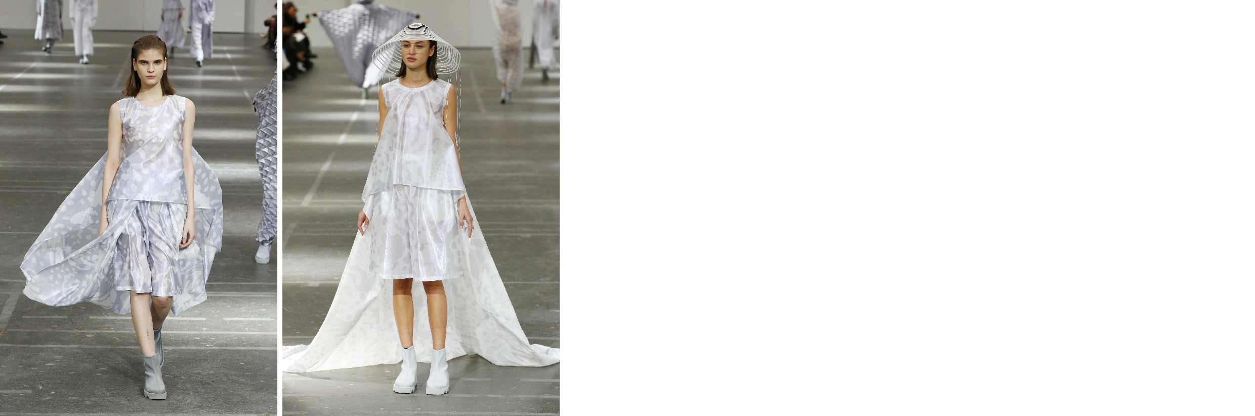Cette robe évoque la lumière délicate et scintillante d’une mystérieuse aurore boréale. L’impression sur un tissu fin et translucide représente la neige qui tombe lentement et recouvre une végétation déjà en attente d’épanouissement.