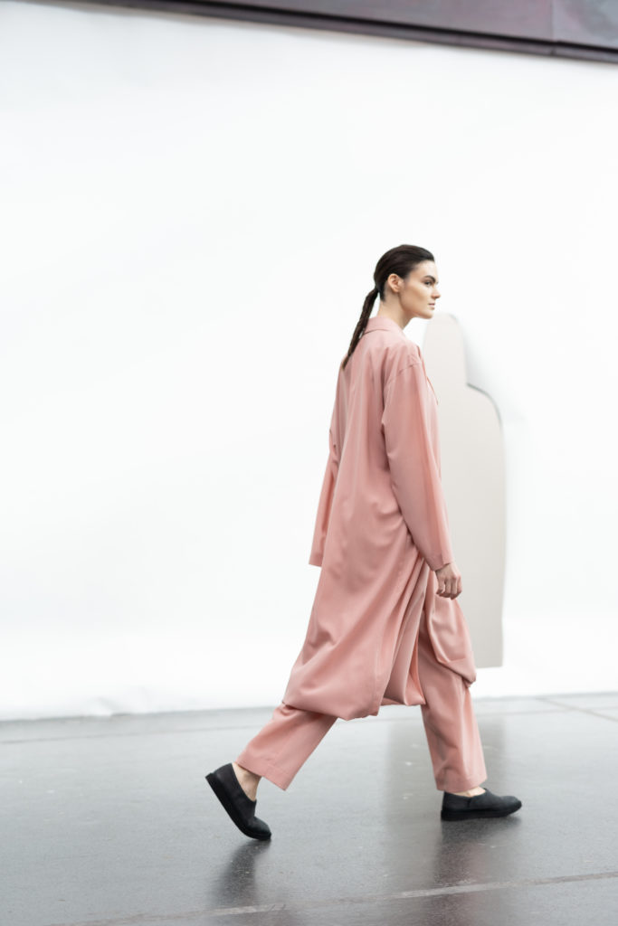 Les motifs de cette série sont créés grâce à la technique « Decalcomania »? 1 inspirée des onomatopées japonaises « goshigoshi »? 2 et « juwah » ? 3. La soie utilisée est travaillée pour lui apporter un léger éclat qui laisse transparaître avec subtilité les couleurs. La blouse et la veste assorties sont en fait un seul et même vêtement continu.