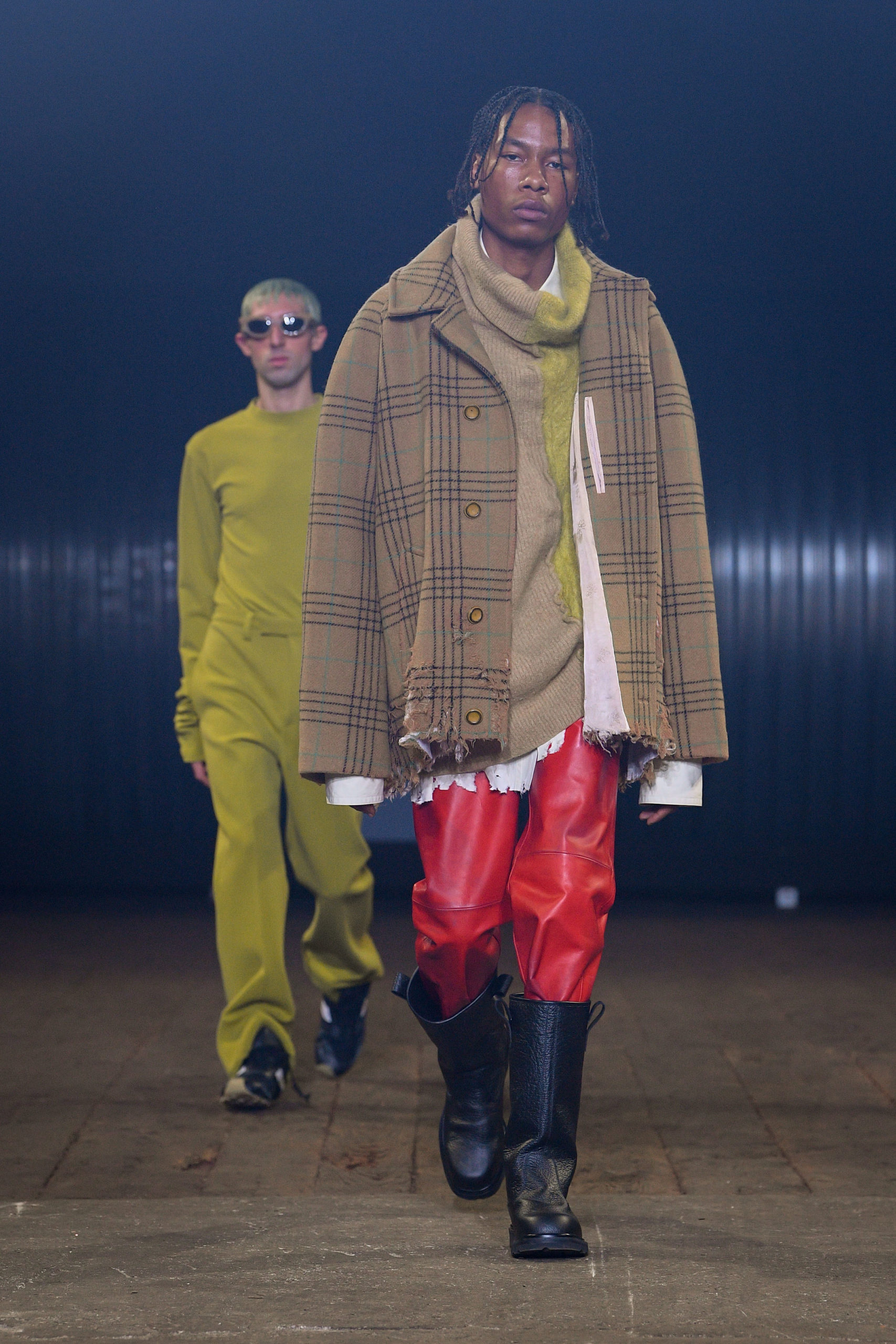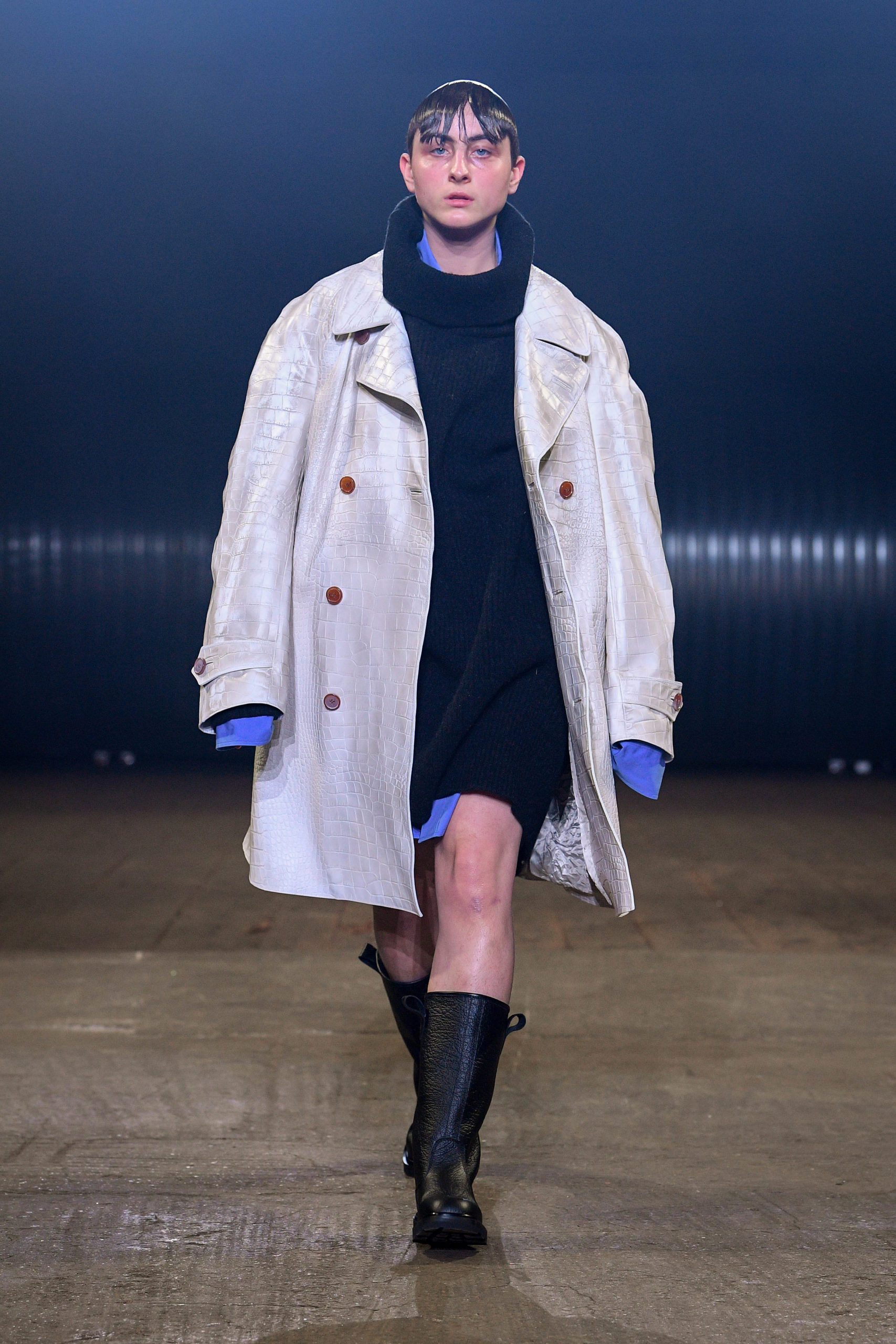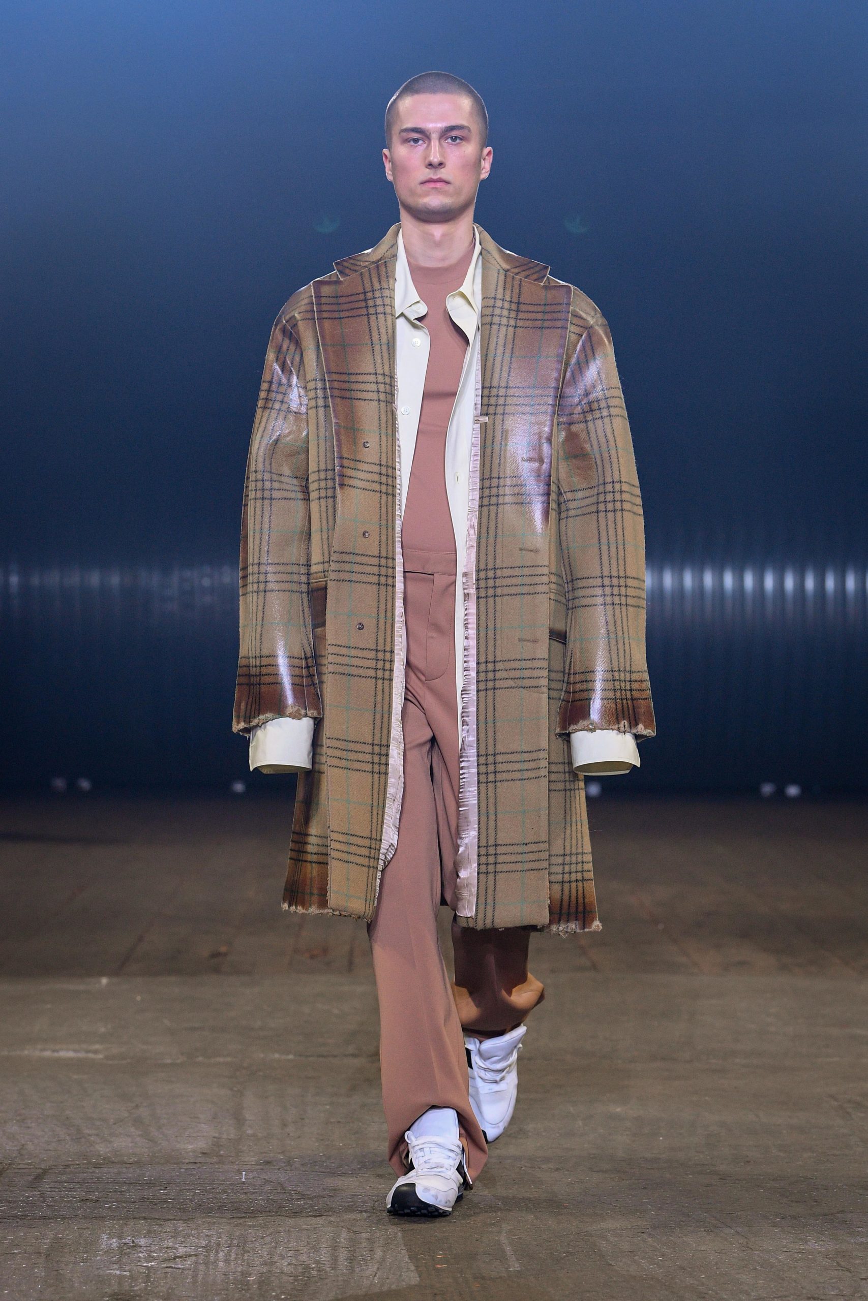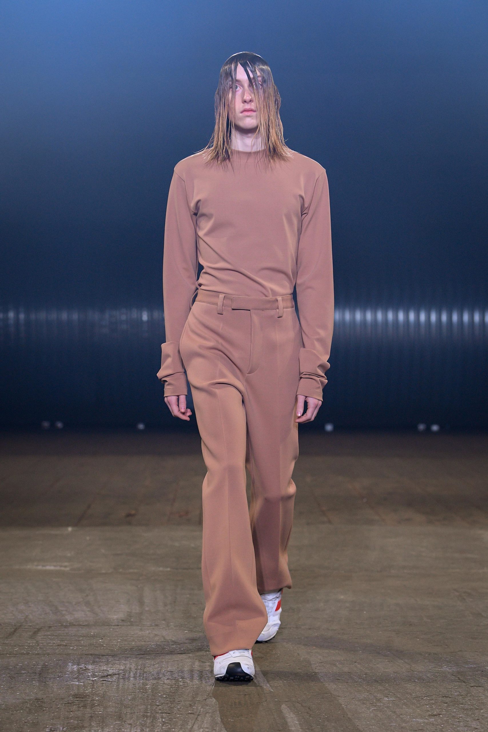 Stop, cut, rewind, paste. Bisected coats. Antithetical frocks. Juxtaposed jackets. Fragmented outerwear. Shrunken sweaters and shirts. Dilated trousers. Right and left don’t match. Front and back even less, not to mention top and bottom. Everything is too wide, or too narrow, or too long. Time has left its evident and palpable mark on everything: abrasions, cuts, fading, missing parts. Hypnotically patterned or monochromatic uniforms land underneath everything. Distorted sneakers and boots complete.