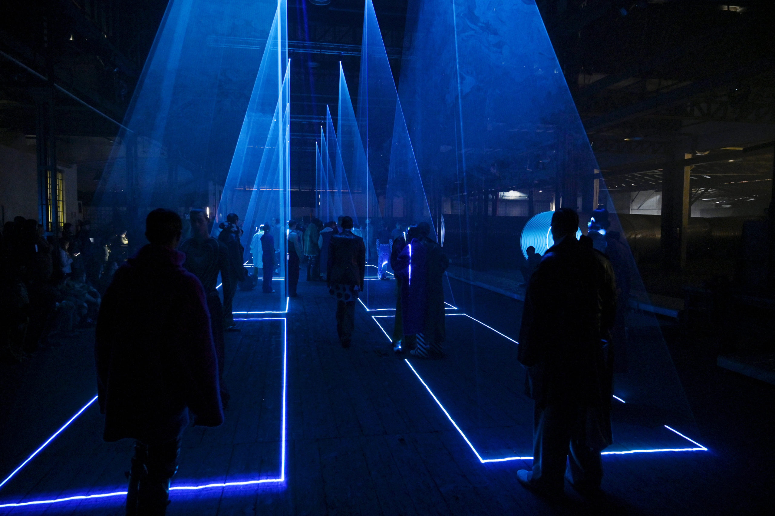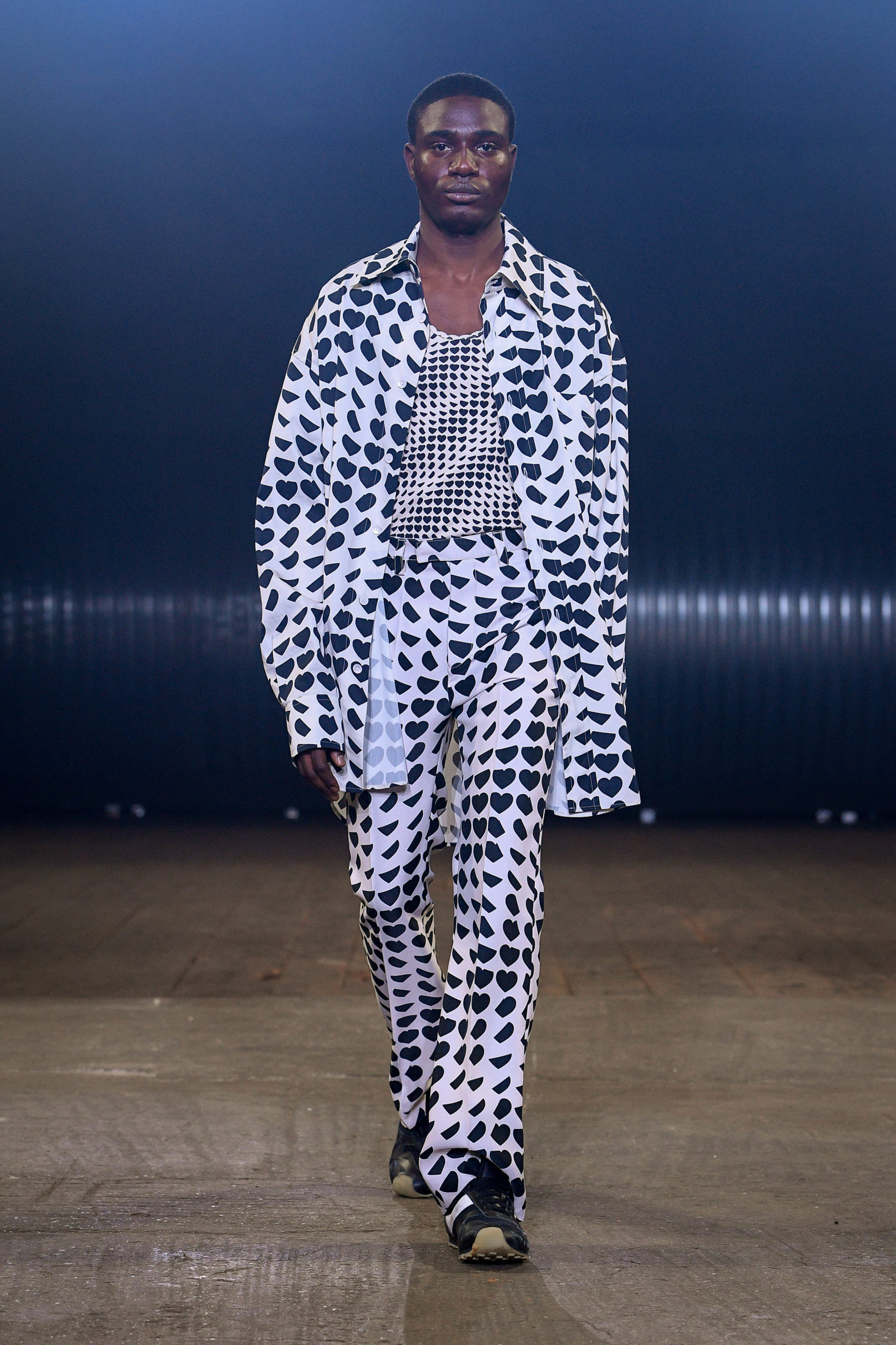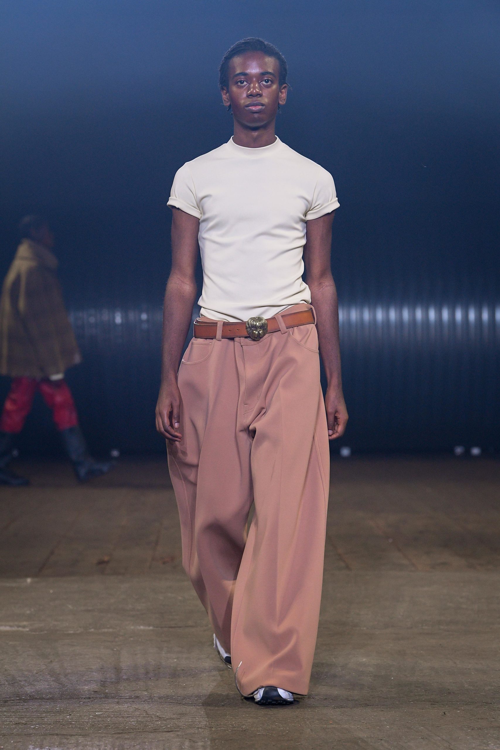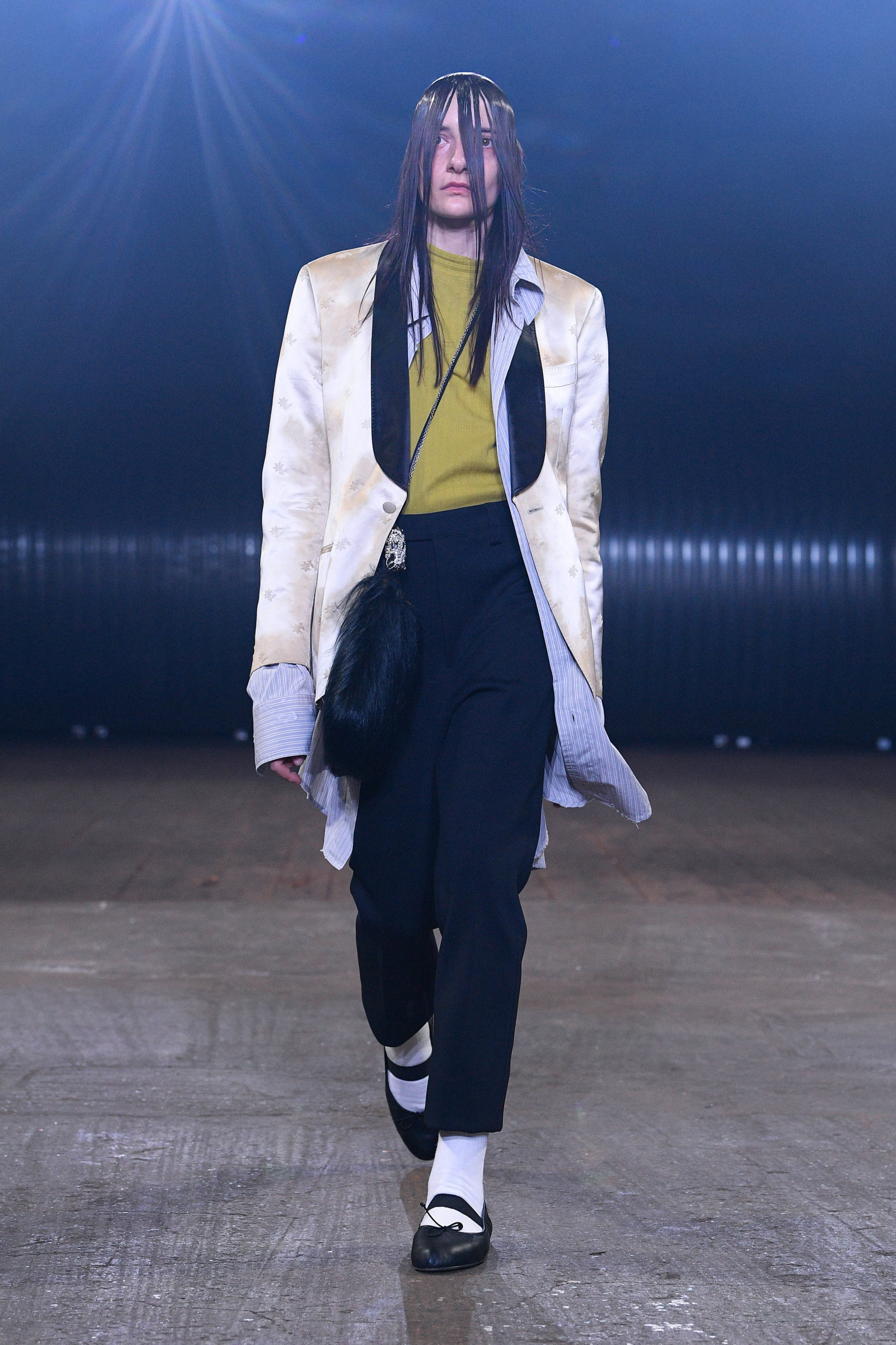 Stop, cut, rewind, paste. Bisected coats. Antithetical frocks. Juxtaposed jackets. Fragmented outerwear. Shrunken sweaters and shirts. Dilated trousers. Right and left don’t match. Front and back even less, not to mention top and bottom. Everything is too wide, or too narrow, or too long. Time has left its evident and palpable mark on everything: abrasions, cuts, fading, missing parts. Hypnotically patterned or monochromatic uniforms land underneath everything. Distorted sneakers and boots complete.